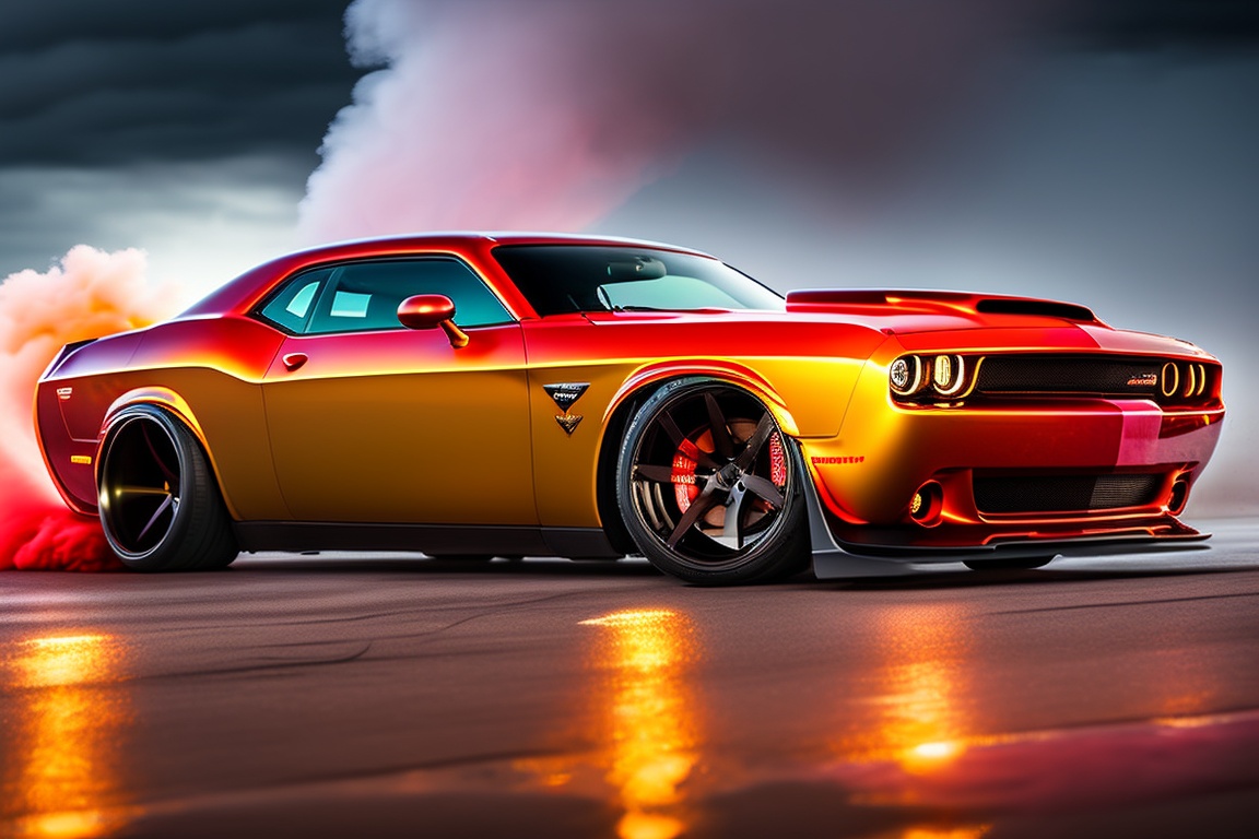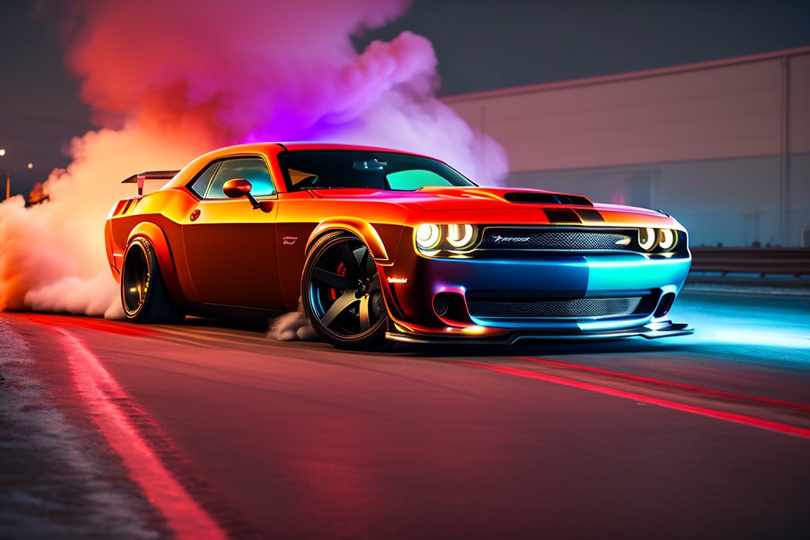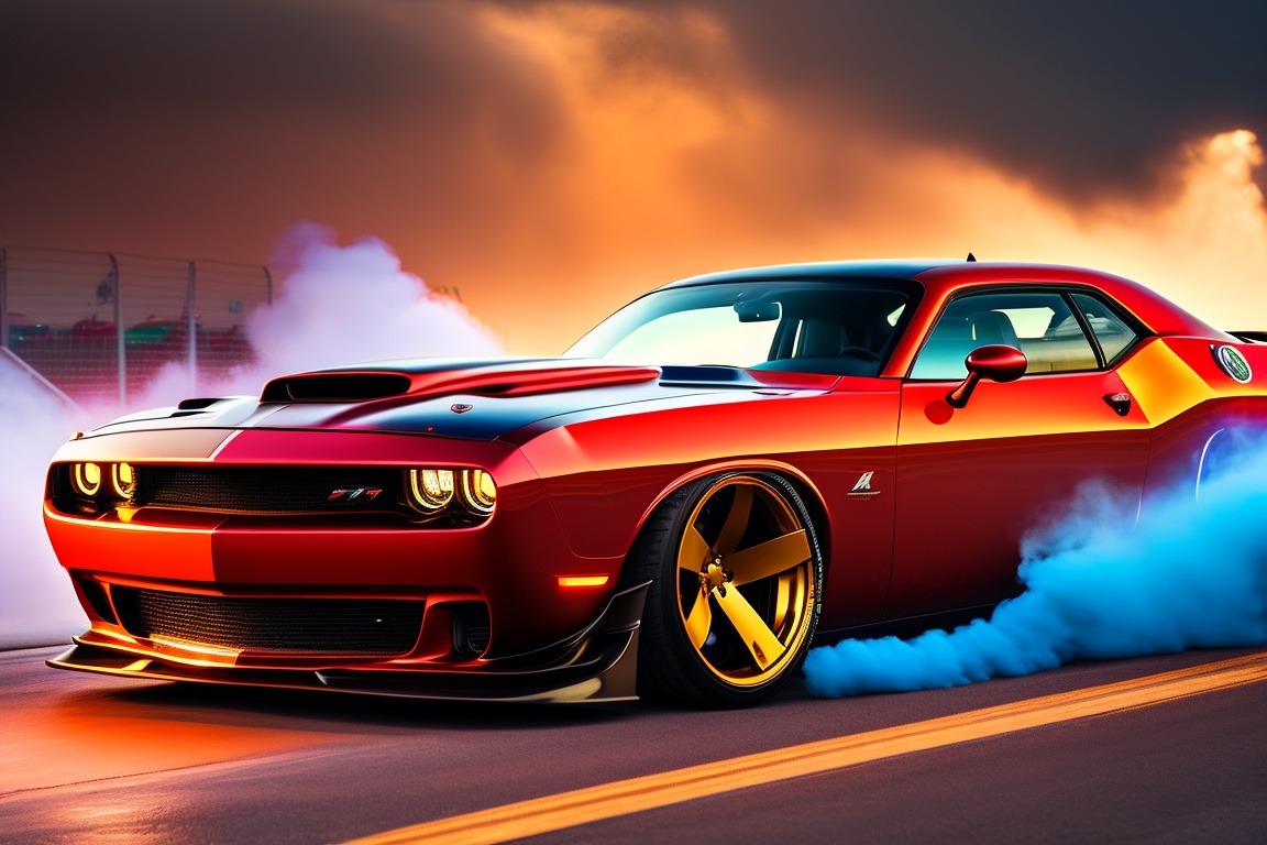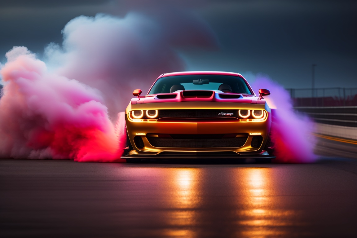 Dodge challenger hellcat red, frozen track, at night, couch, dummies, dice, front dope cinematic photo forza, corsa 5, tunned, street racing. full car, car in focus, half sideways, drifting, in smoke, smoke from under the wheels, fire from under the wheels, bottom illumination, wheel illumination, ground illumination, pink and blue glare, one car in the frame, bright juicy gold chrome