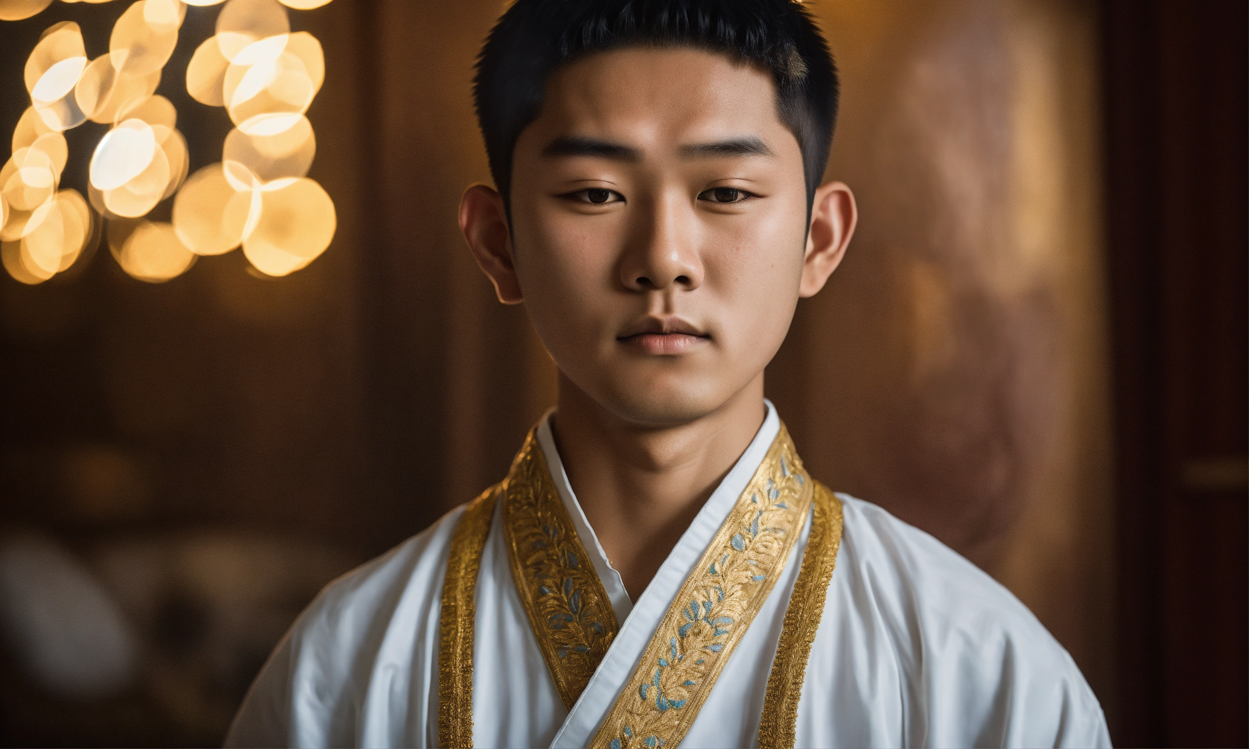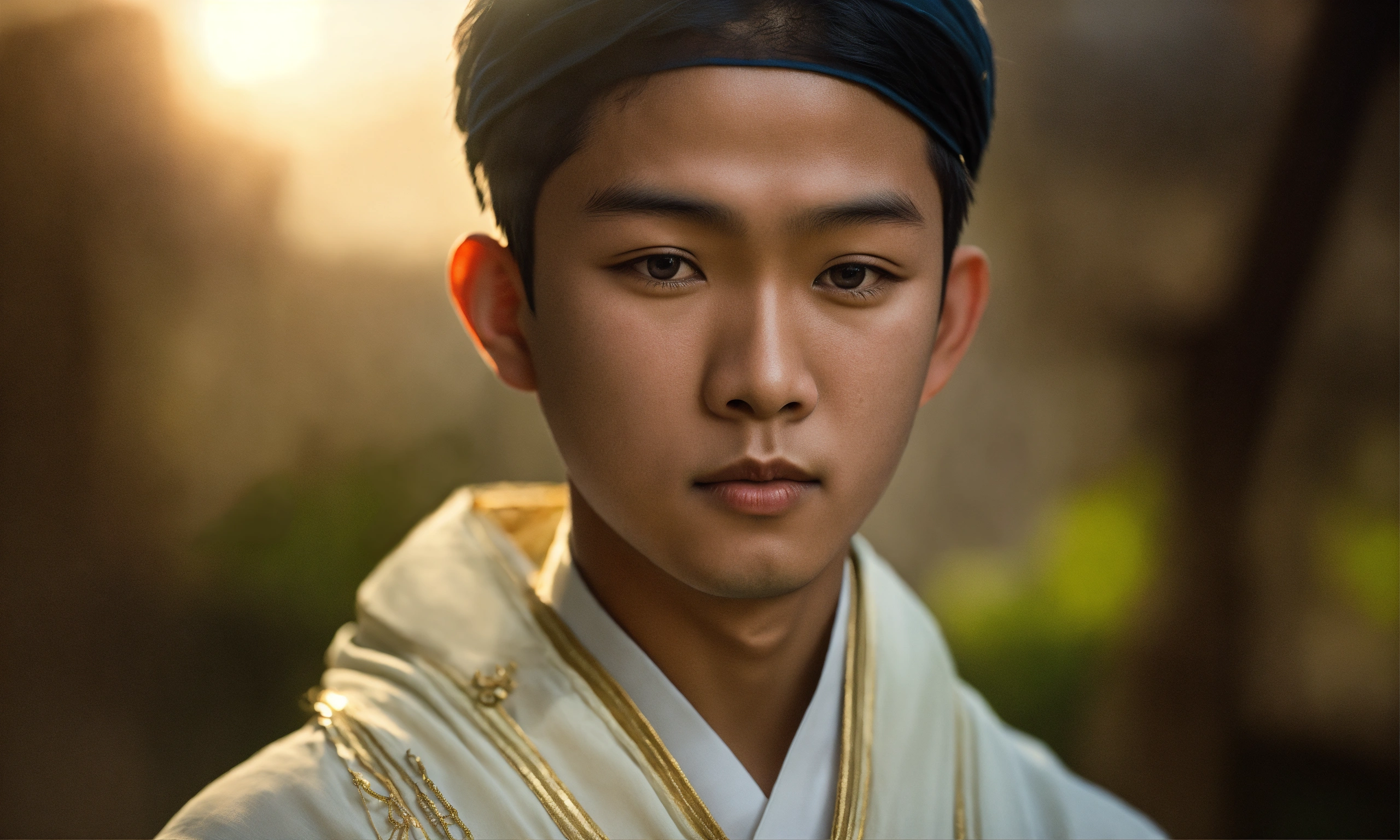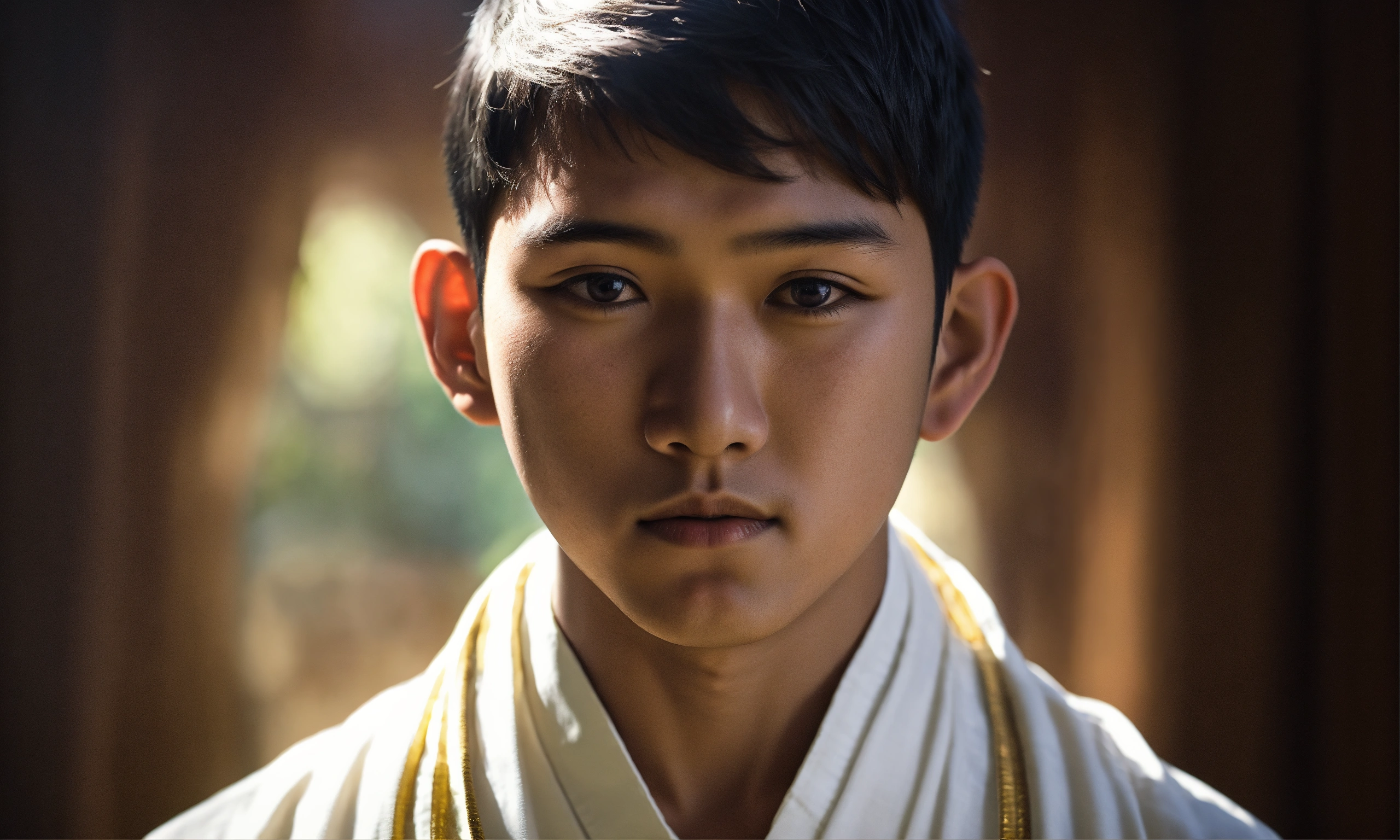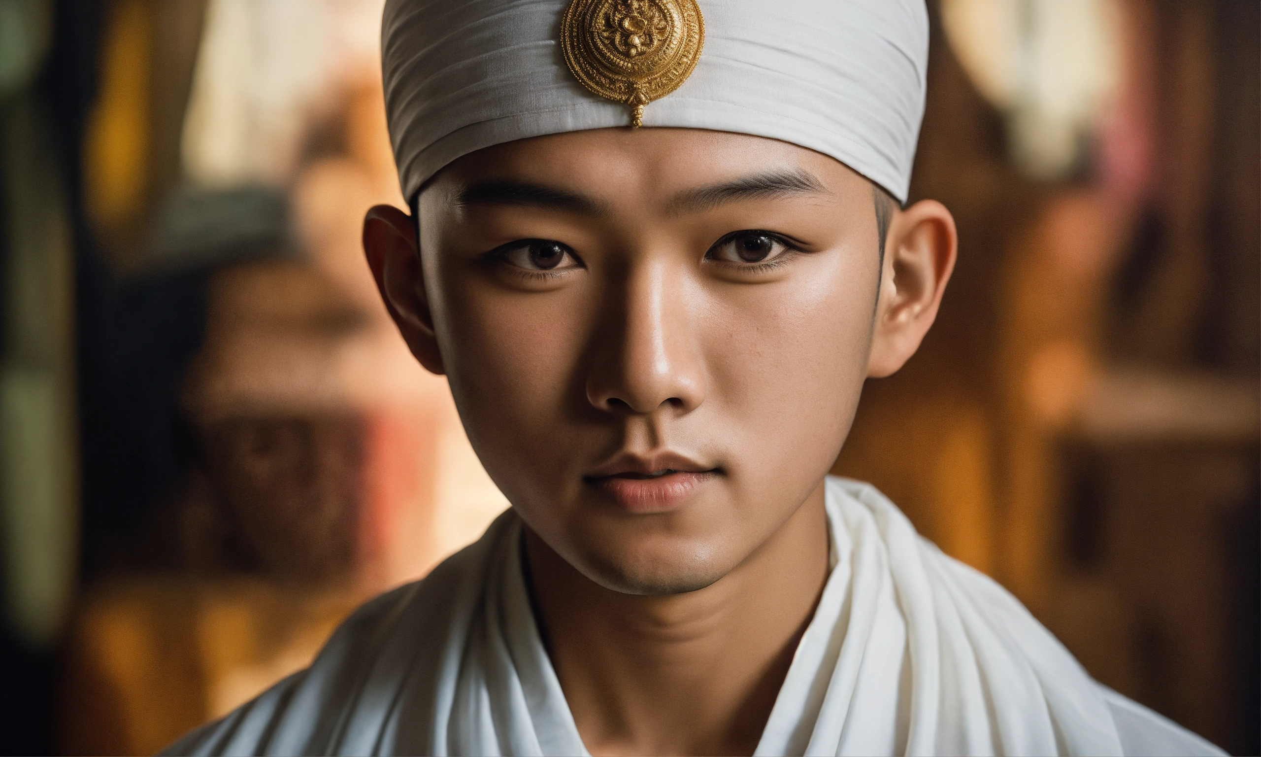 Portrait of 14-year-old asian boy wearing a white harry krishna attire, hyper-realistic, facing directly to camera, he is bald, his eyes are closed. cinematic.