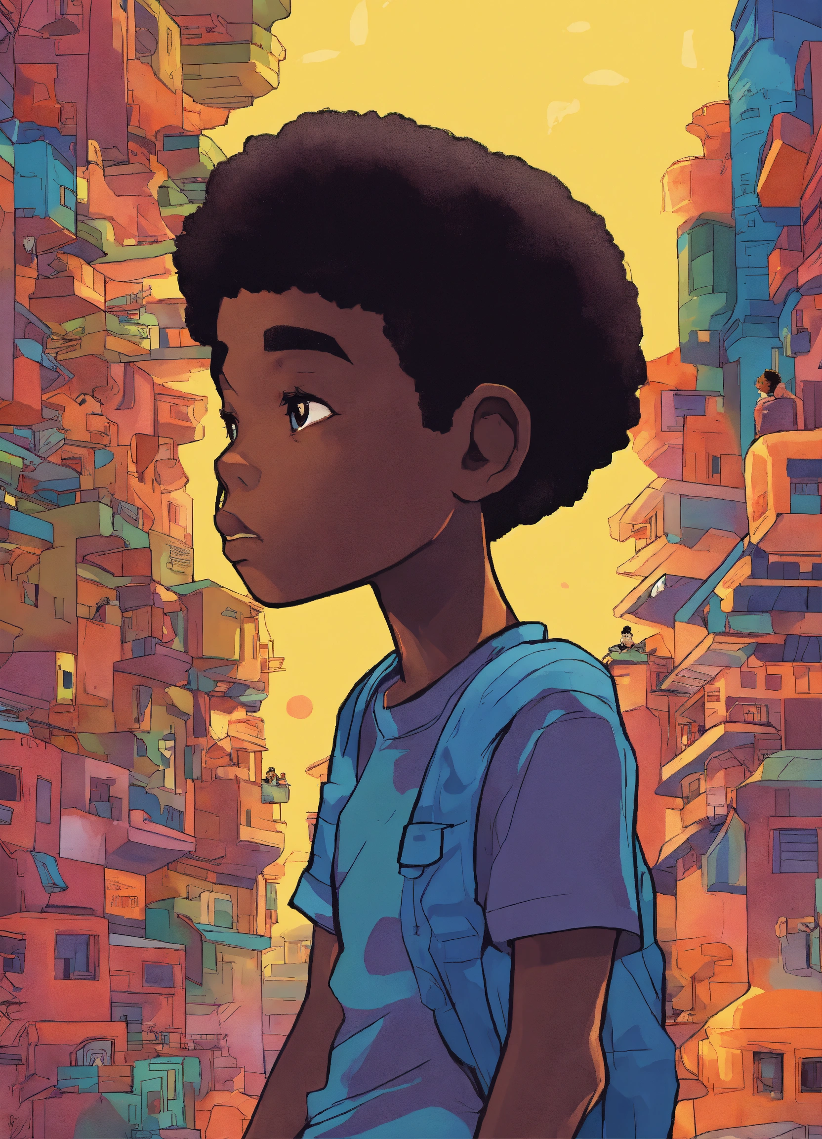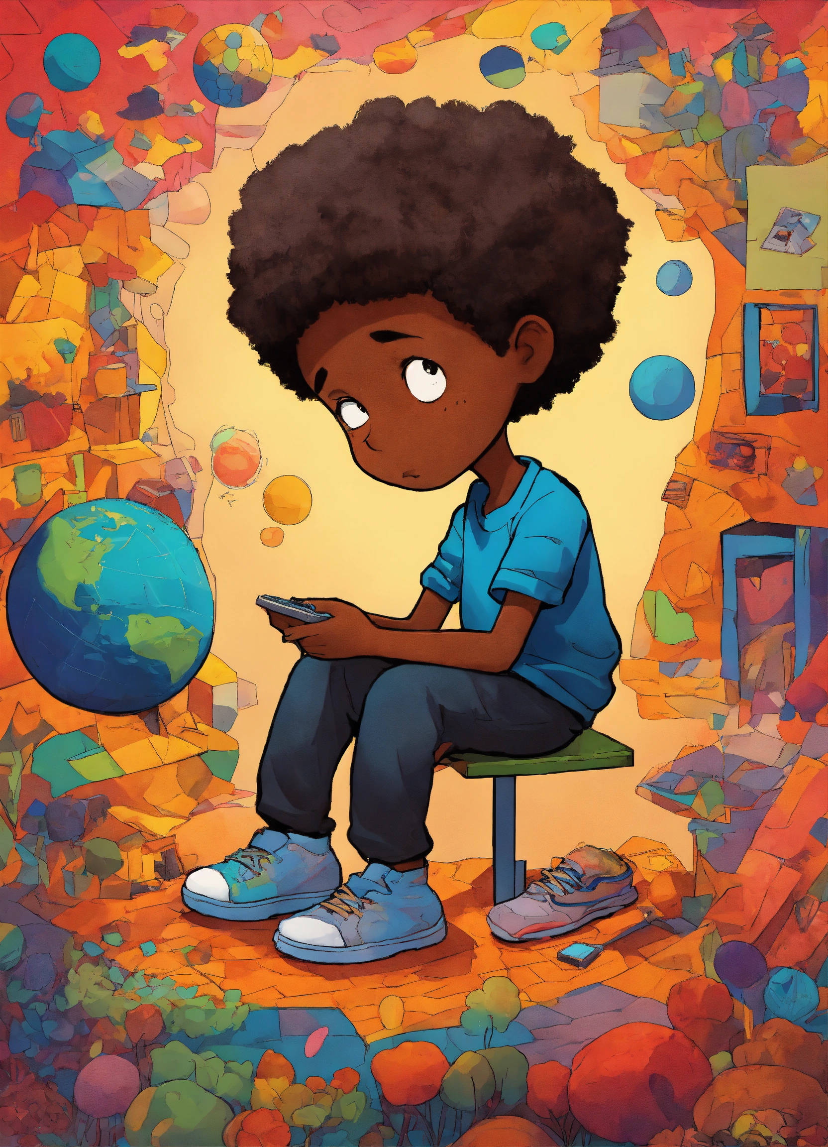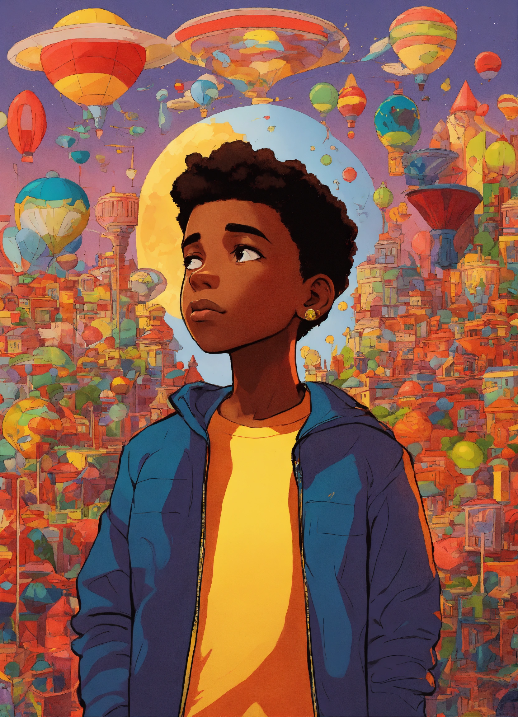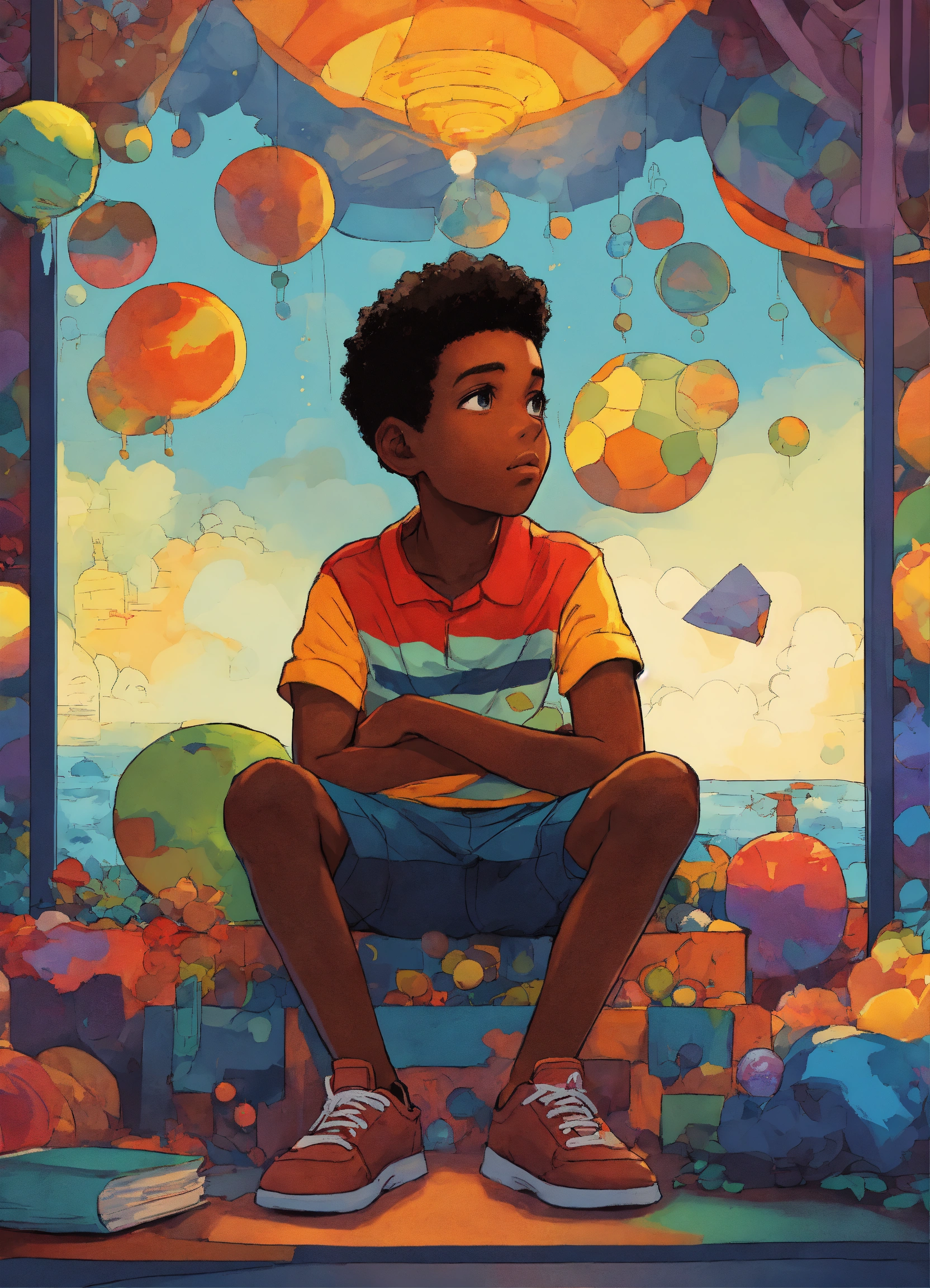 Cartoon, colorful, illustrate a black boy in deep thought, show the world around him in various colors and shapes