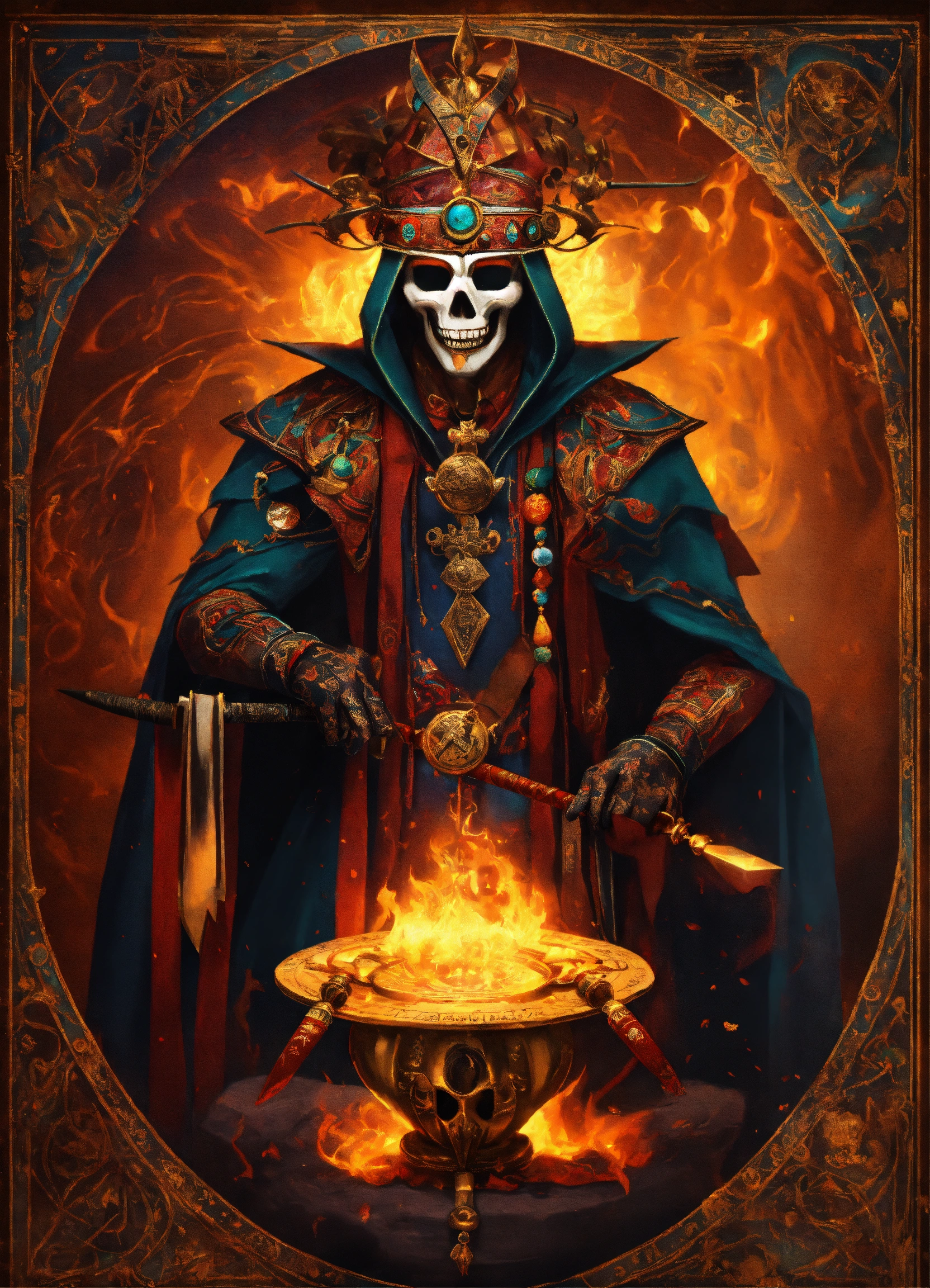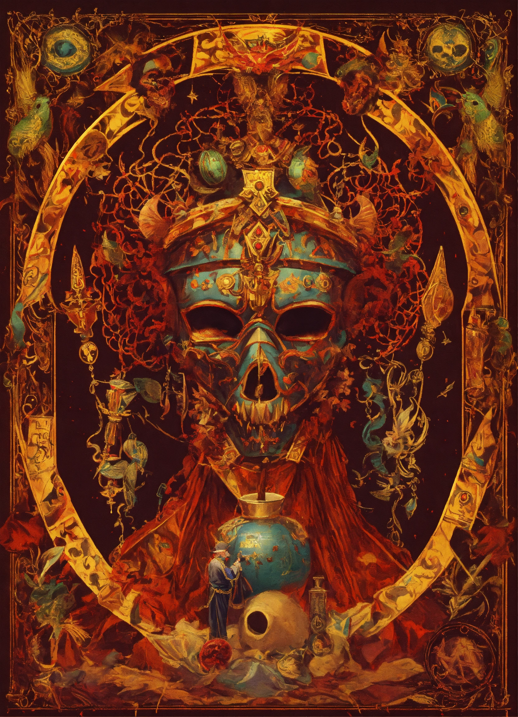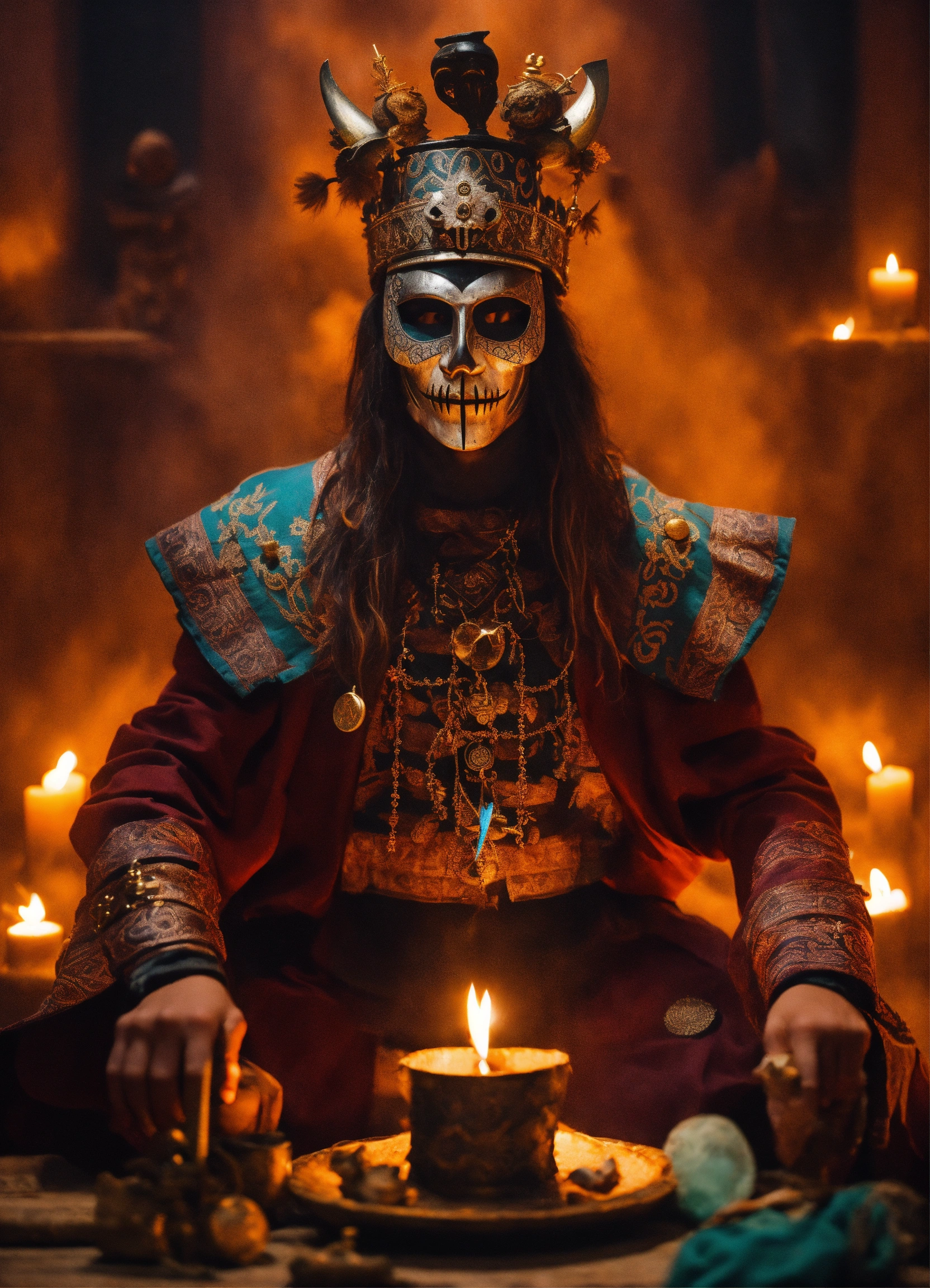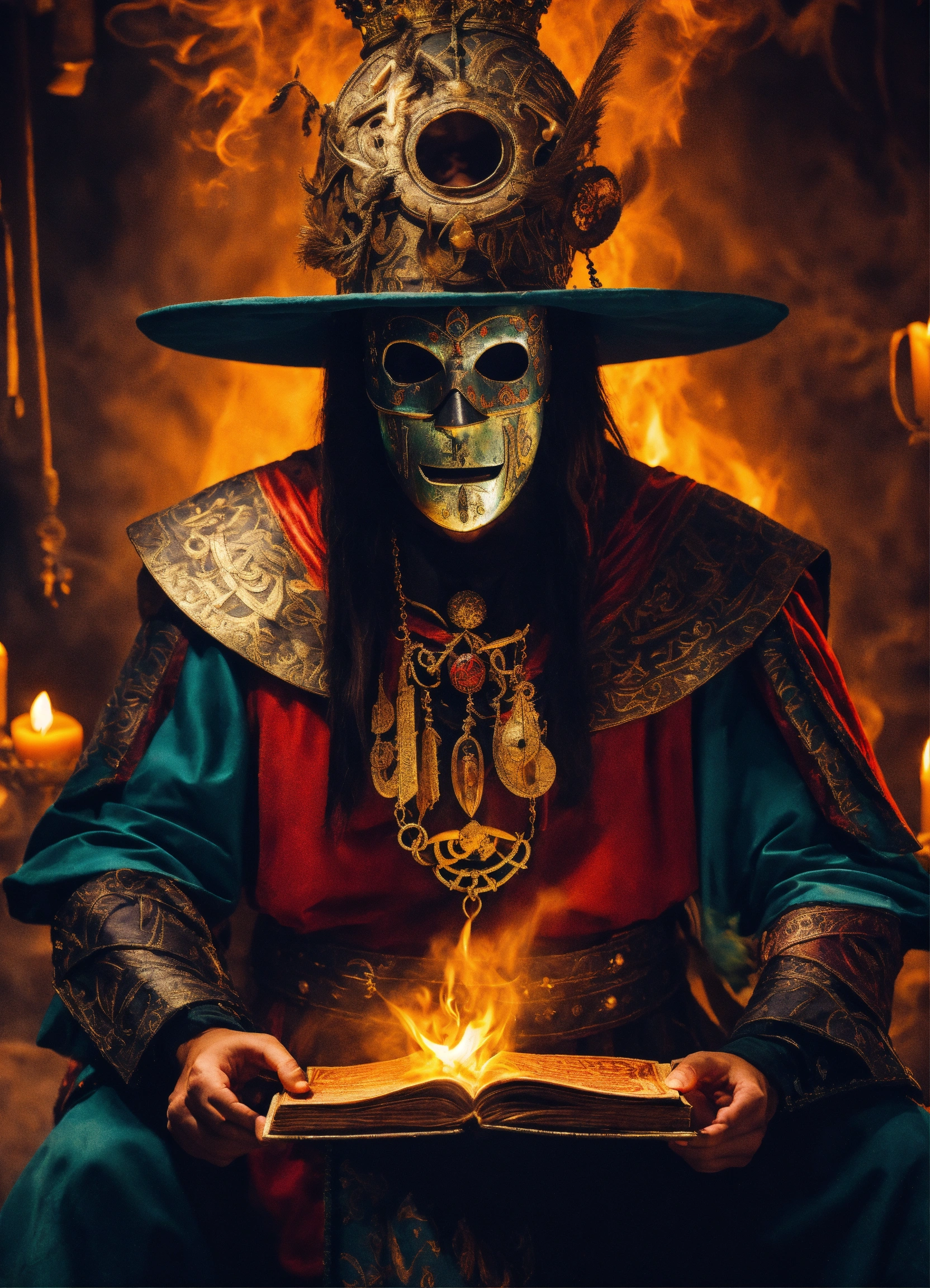 Evil magician king summoning supernatural forces from a mystical codex on the world, evil and terrifying vibes. witch doctor mask.