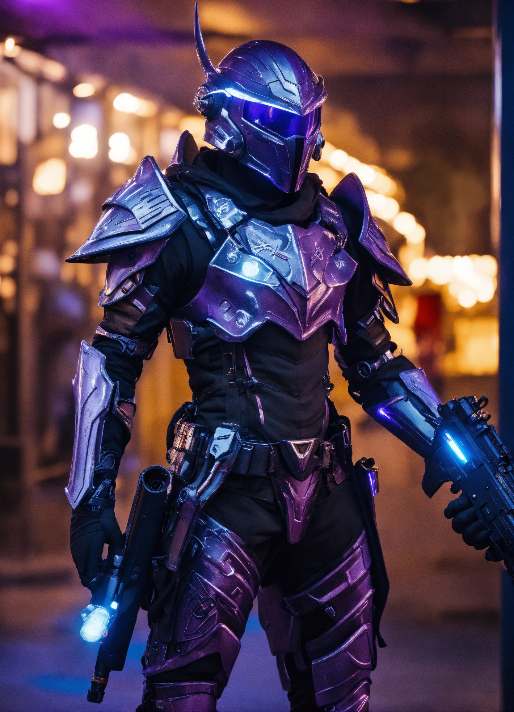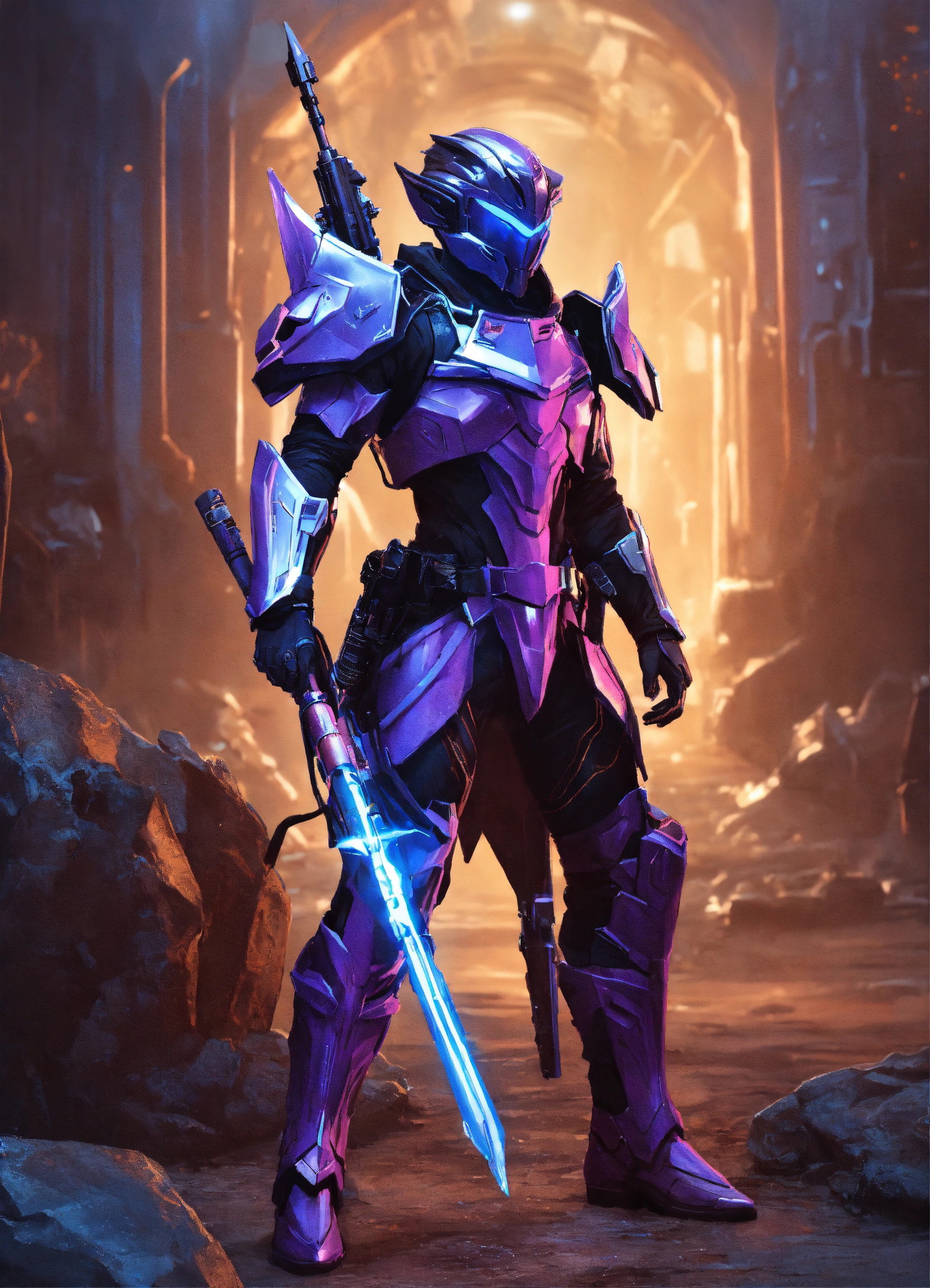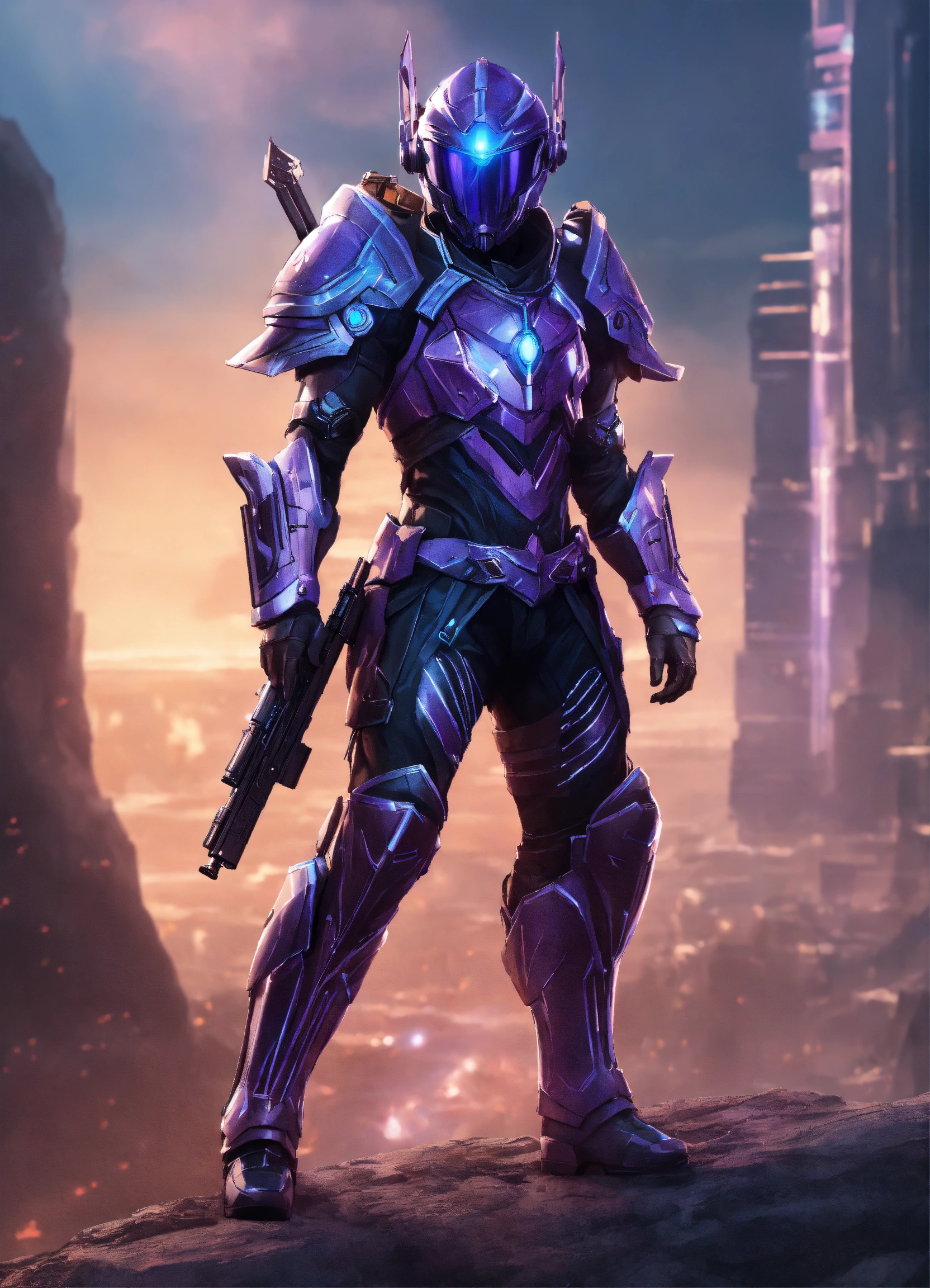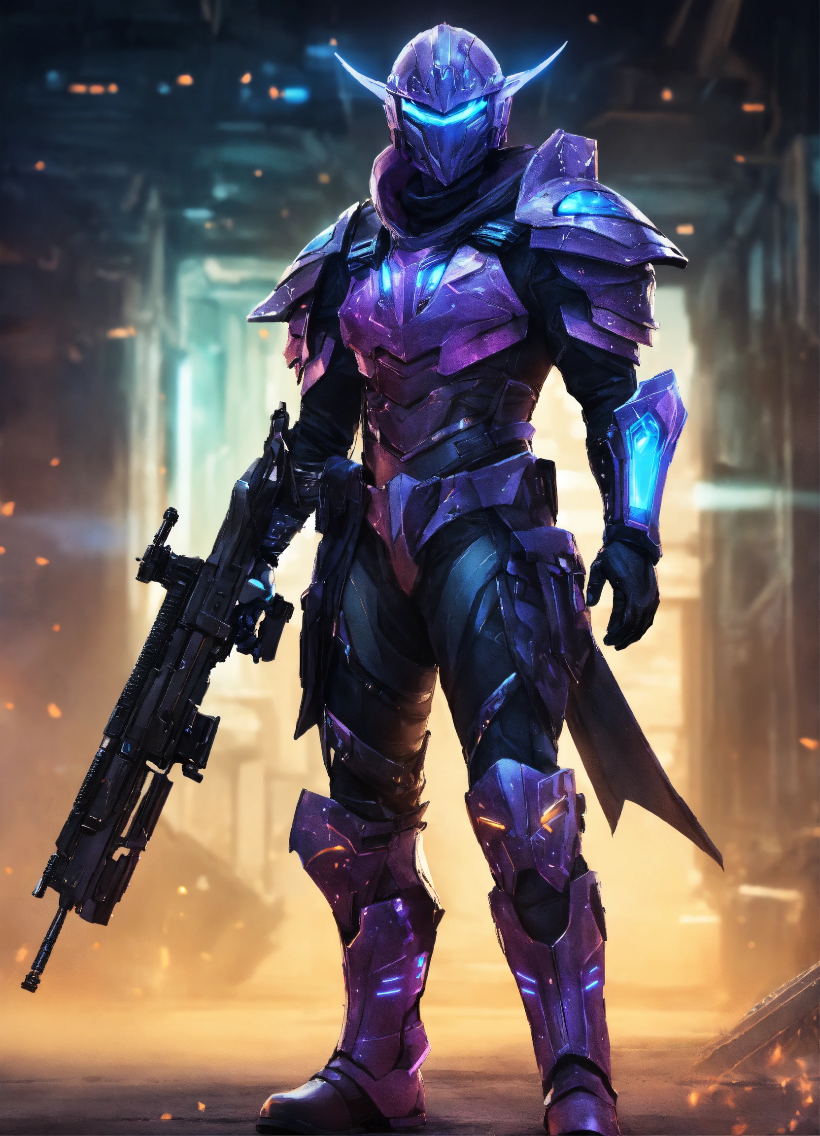 Full body of a high elf sci fi soldier wearing heavy sci fi elven armor, cybernetic black and purple and light blue armor and helmet, boots, male, holding a light machine gun with both hands, full body, hd