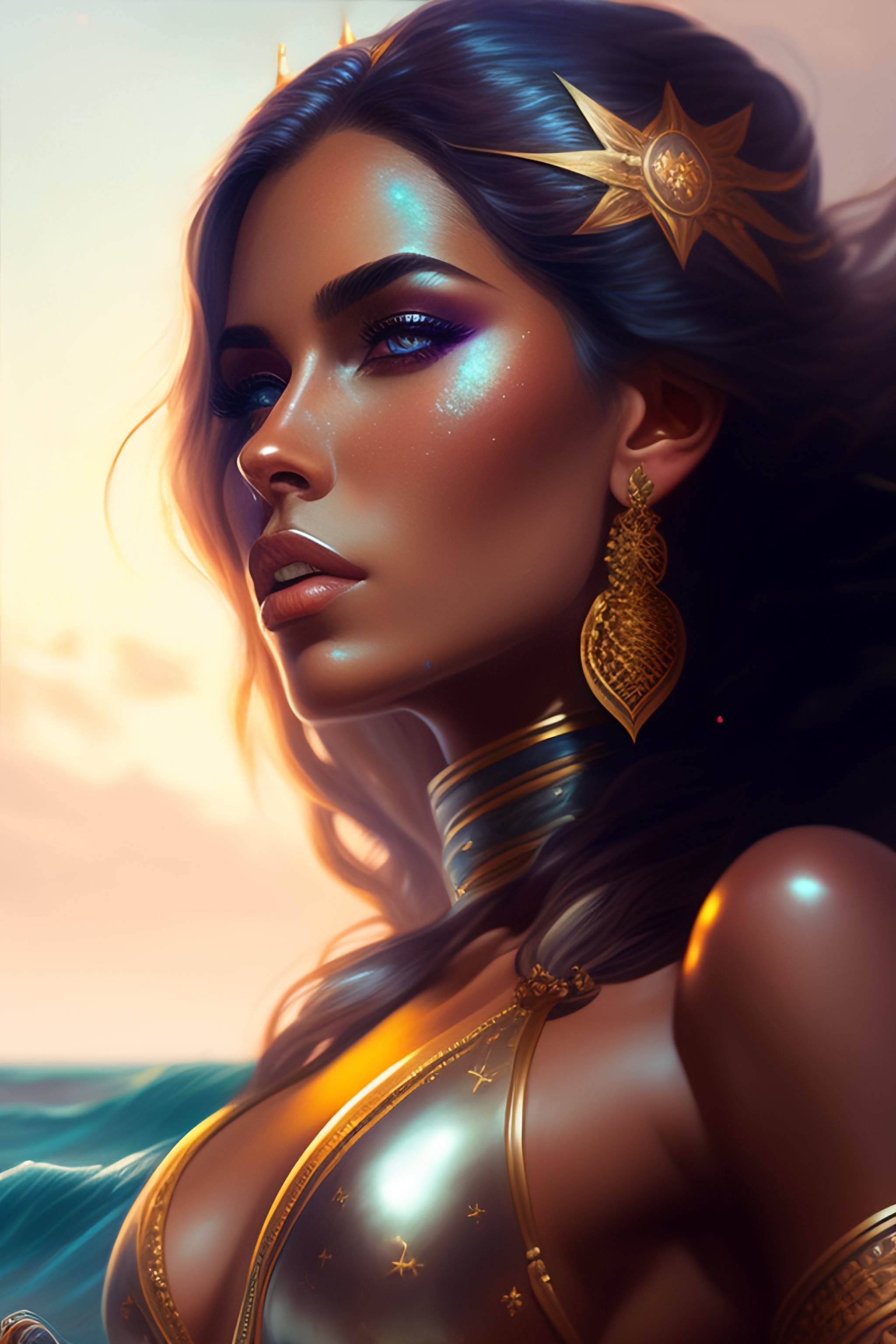 A beautiful woman warrior wearing a magical bikini posing on a boat, beautiful face, highly detailed face, fantasy art, in the style of greg rutkowski, illustration, epic, fantasy, intricate, hyper detailed, concept art, smooth, sharp focus, ray tracing, full body