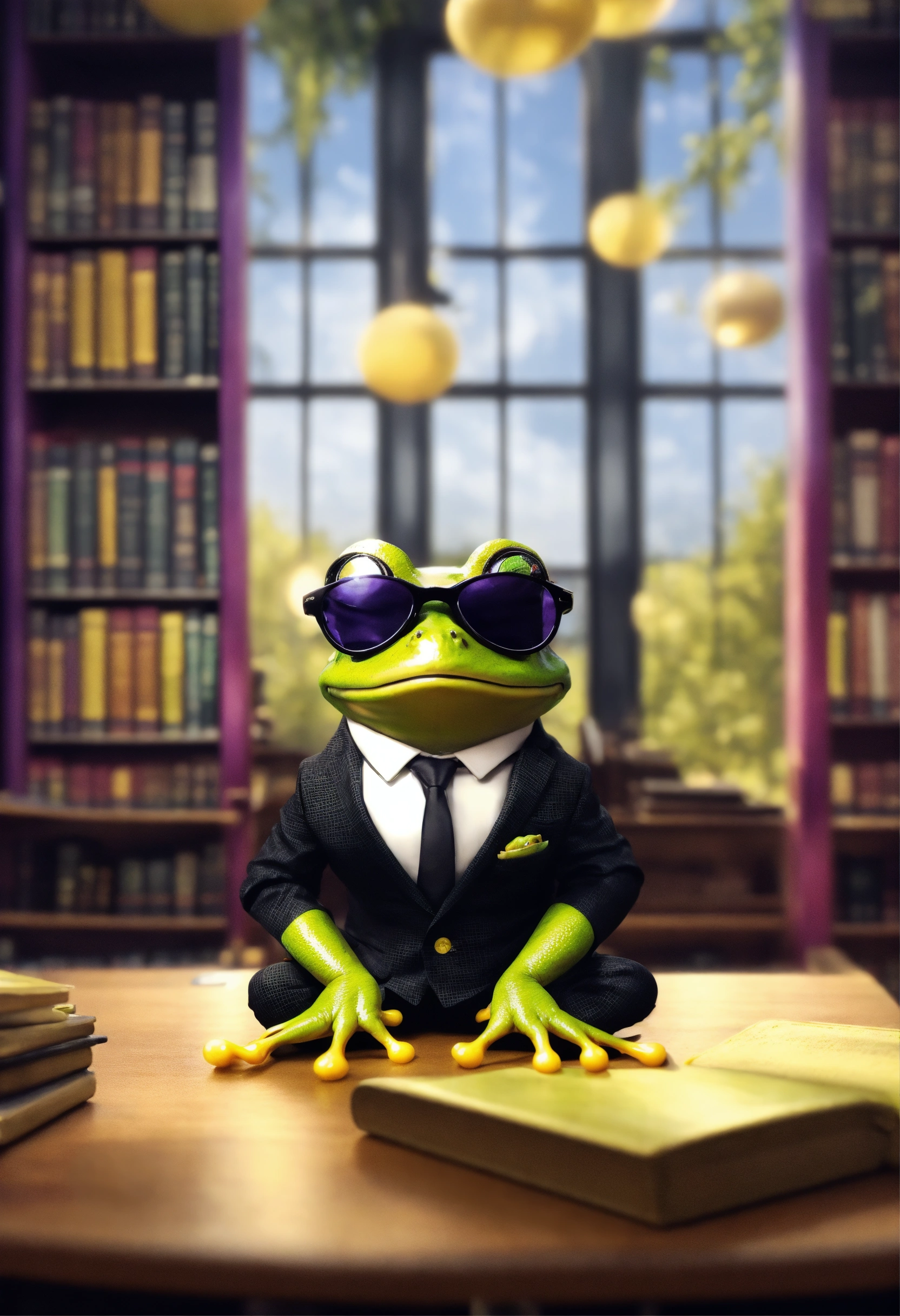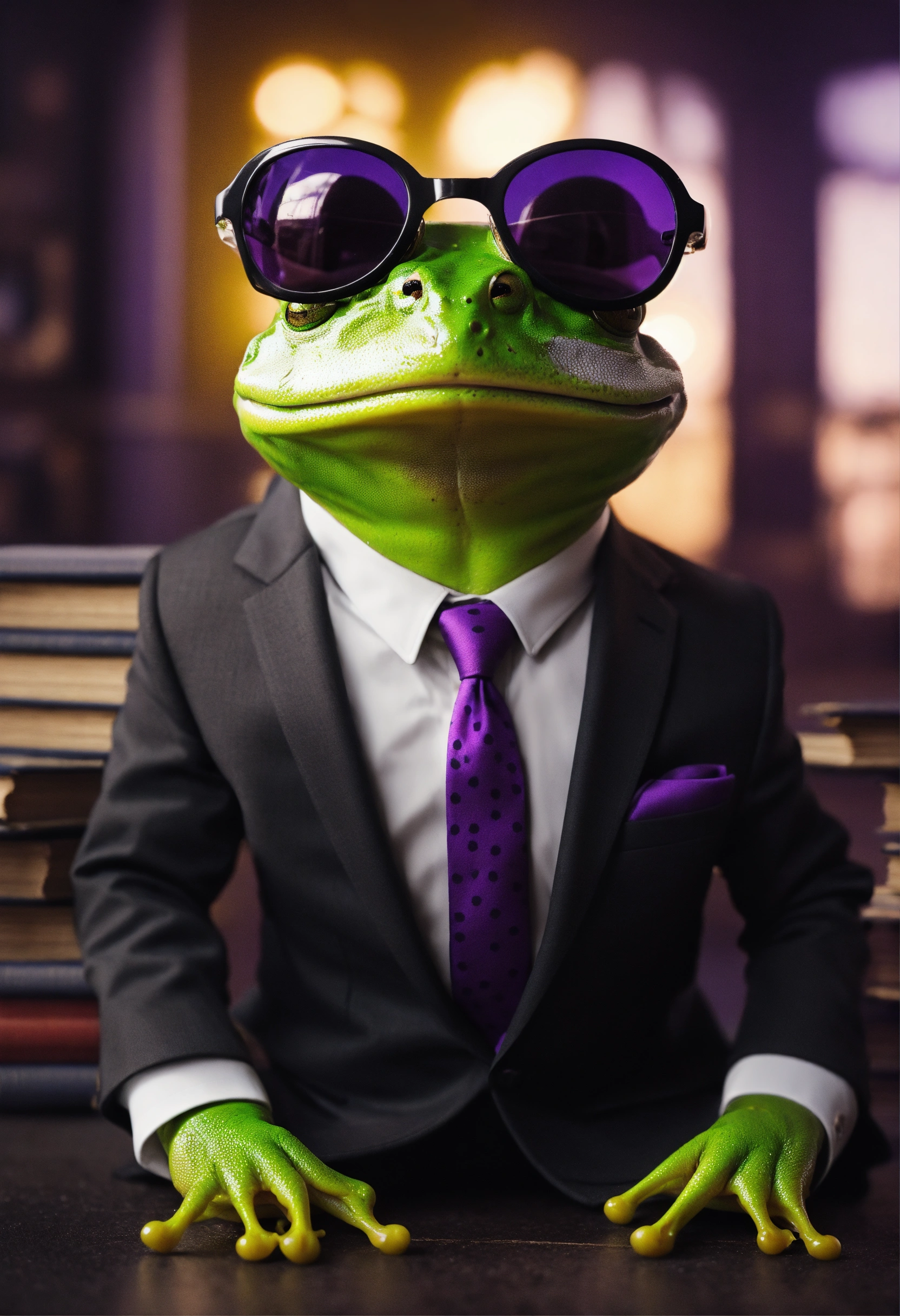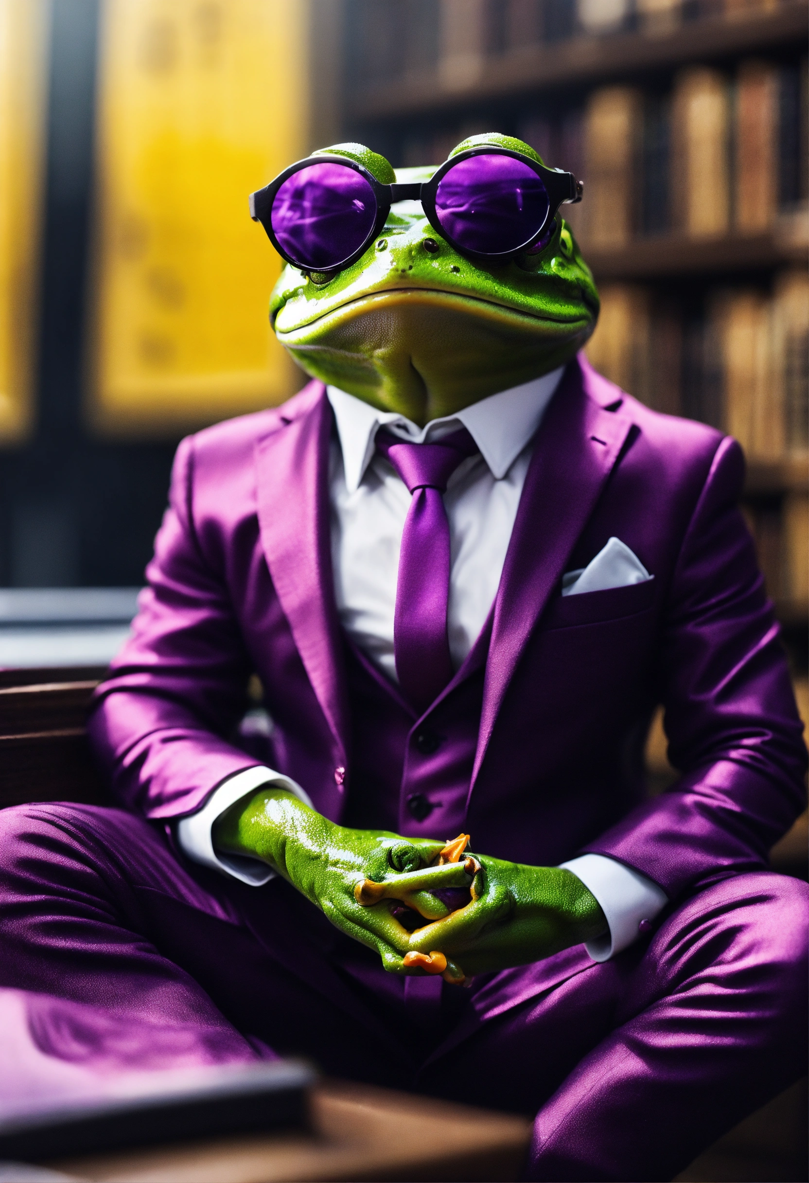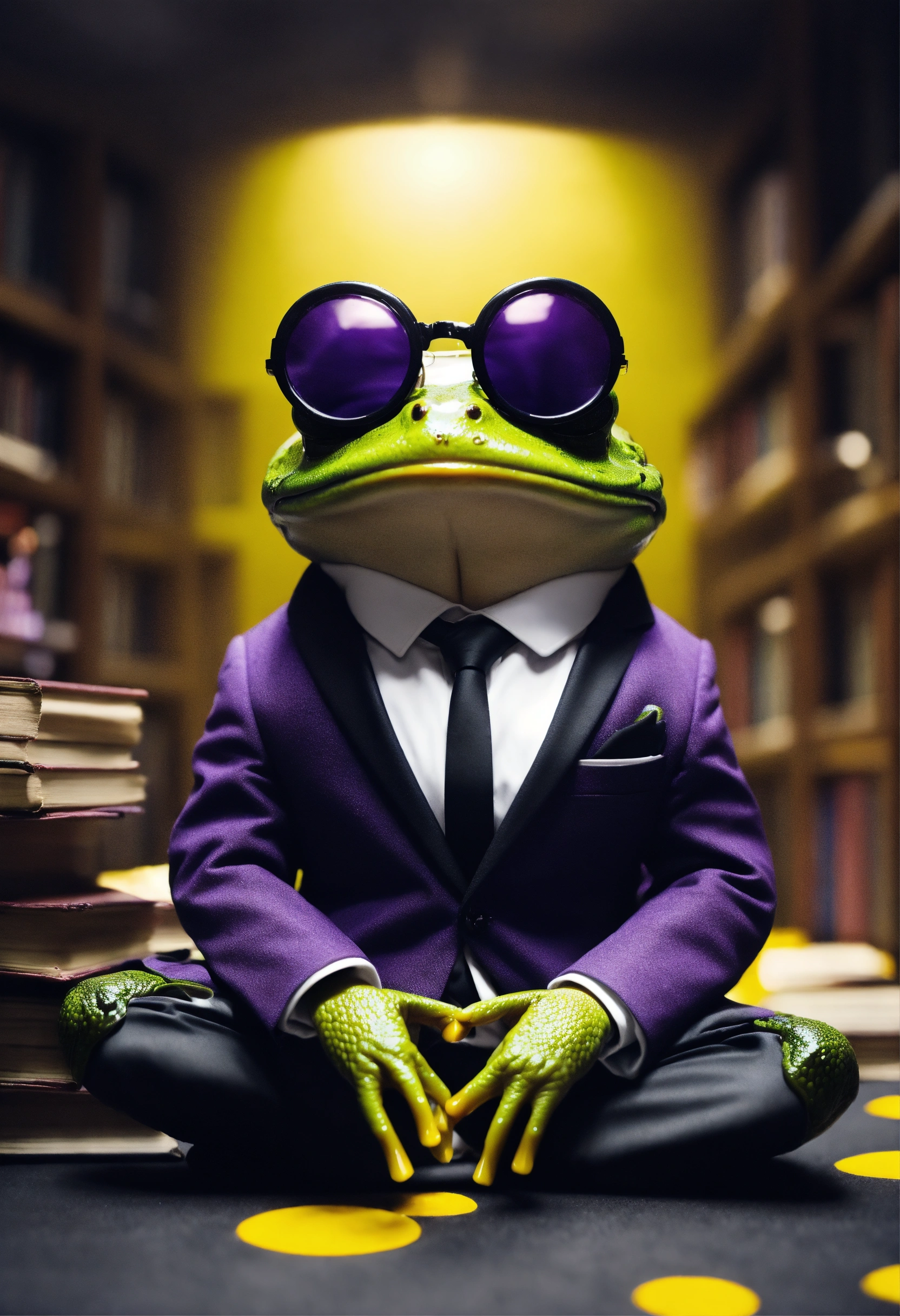 Cute frog in suit and sun glasses smiling and meditating in black and white suit at the black and white library inventing purple machine and yellow in cinematic environment