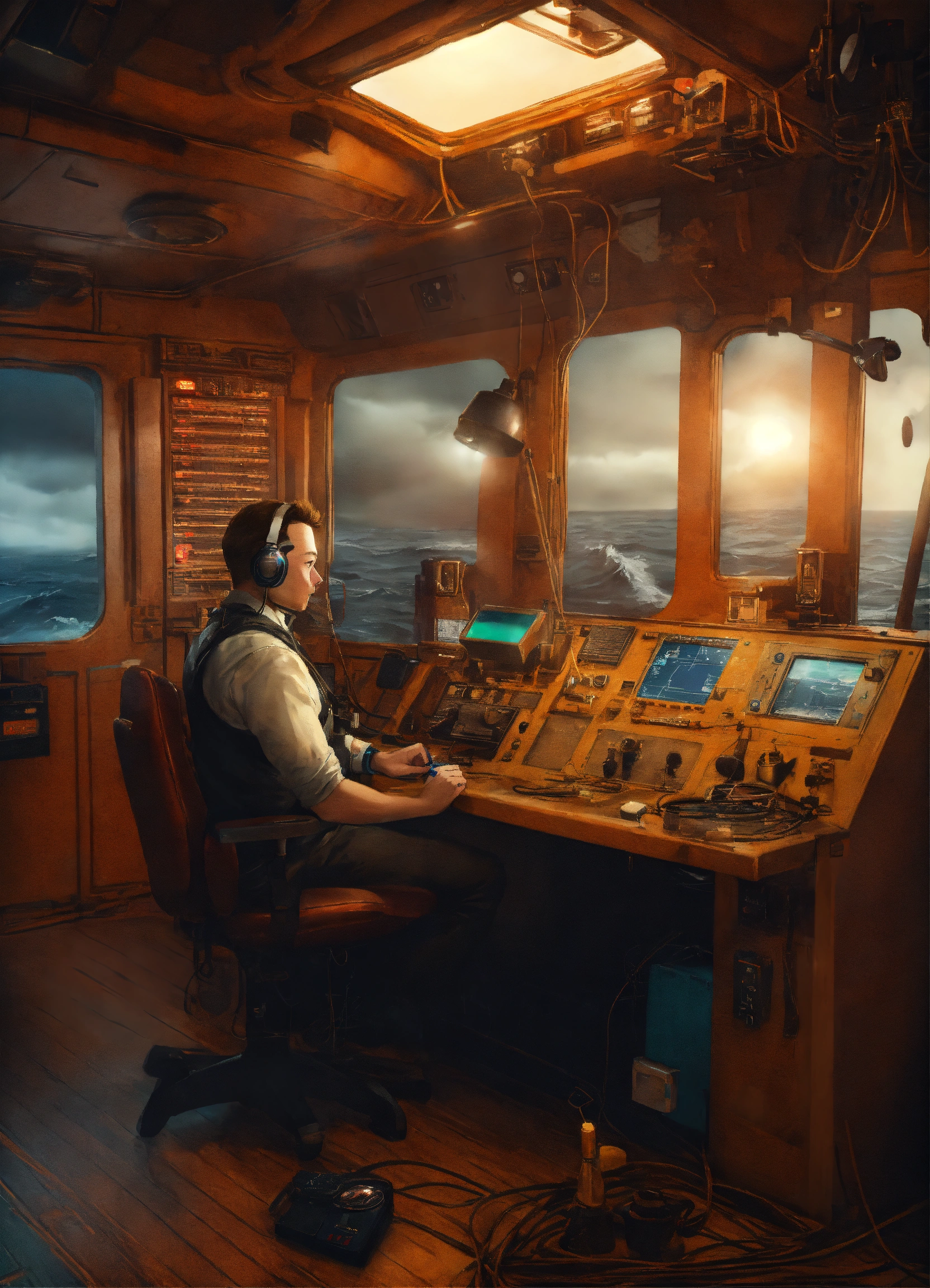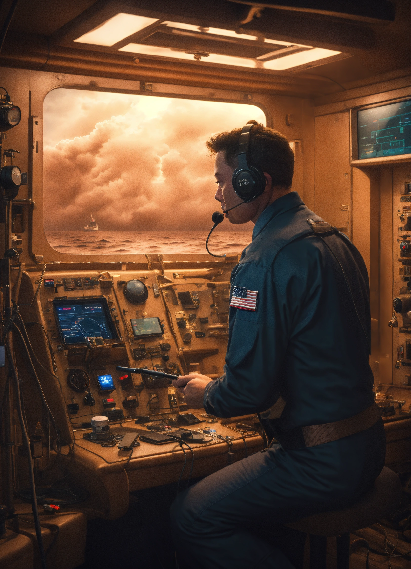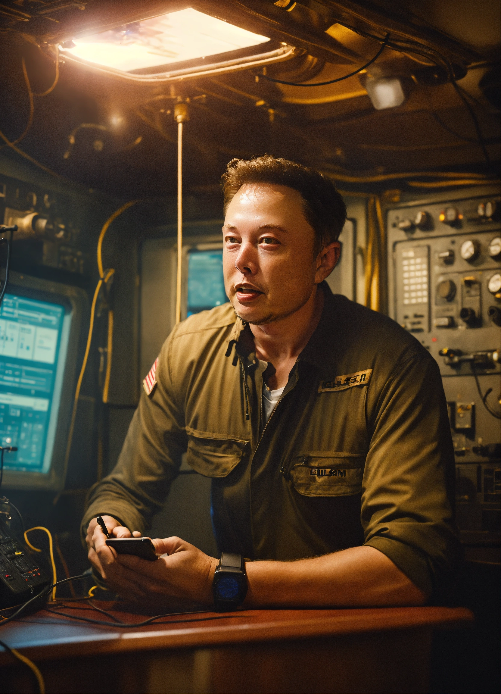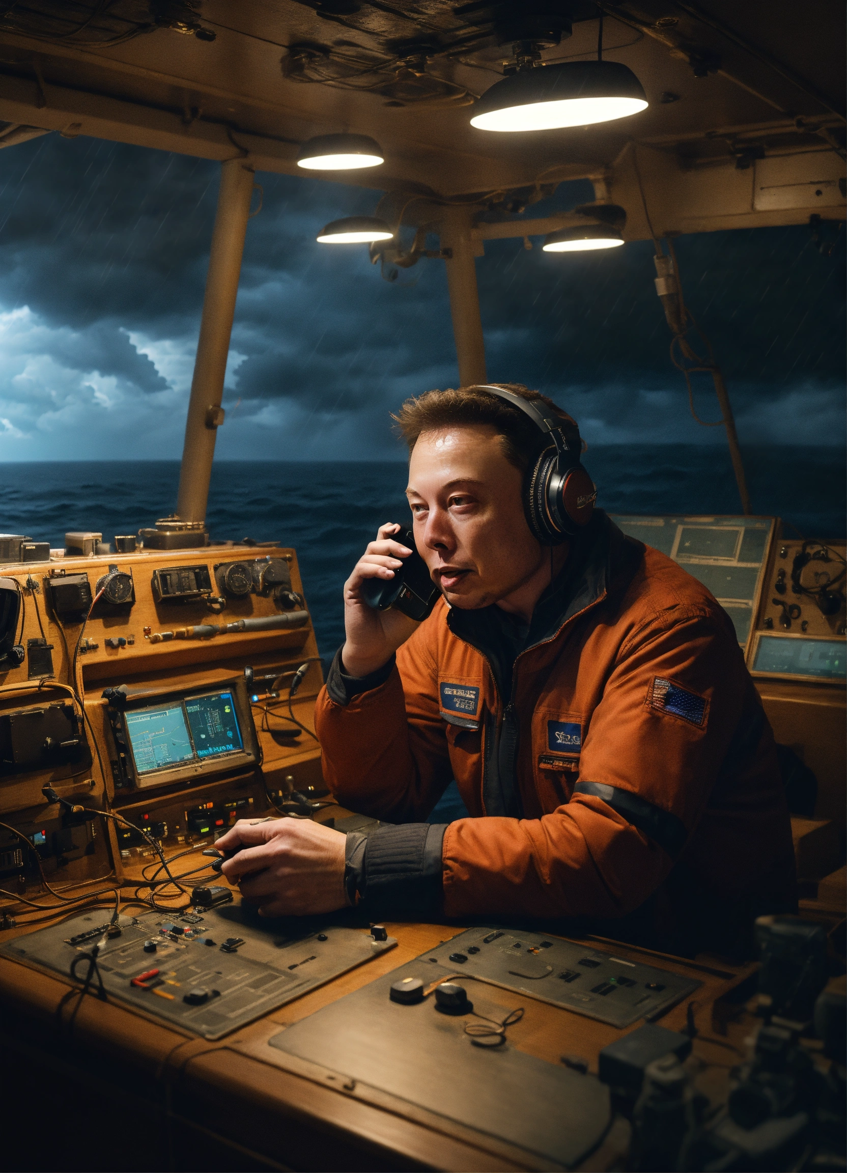 Radio room of a ship caught in a storm elon musk holds a walkie-talkie in his hands transmits a sos signal 4k high quality realism