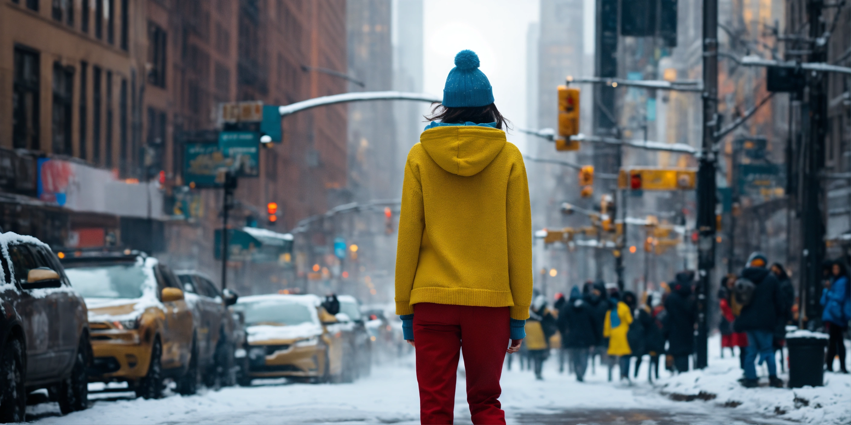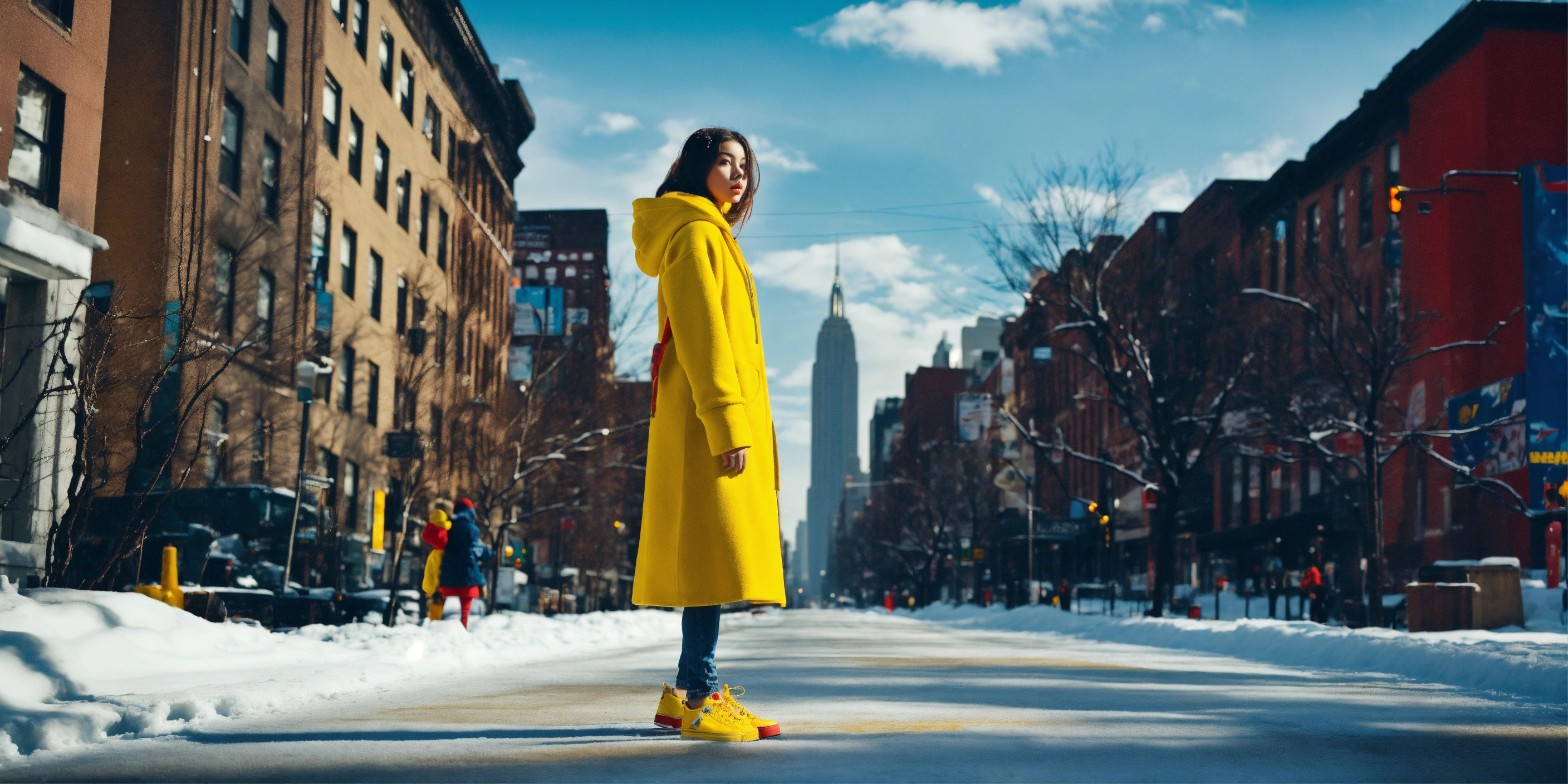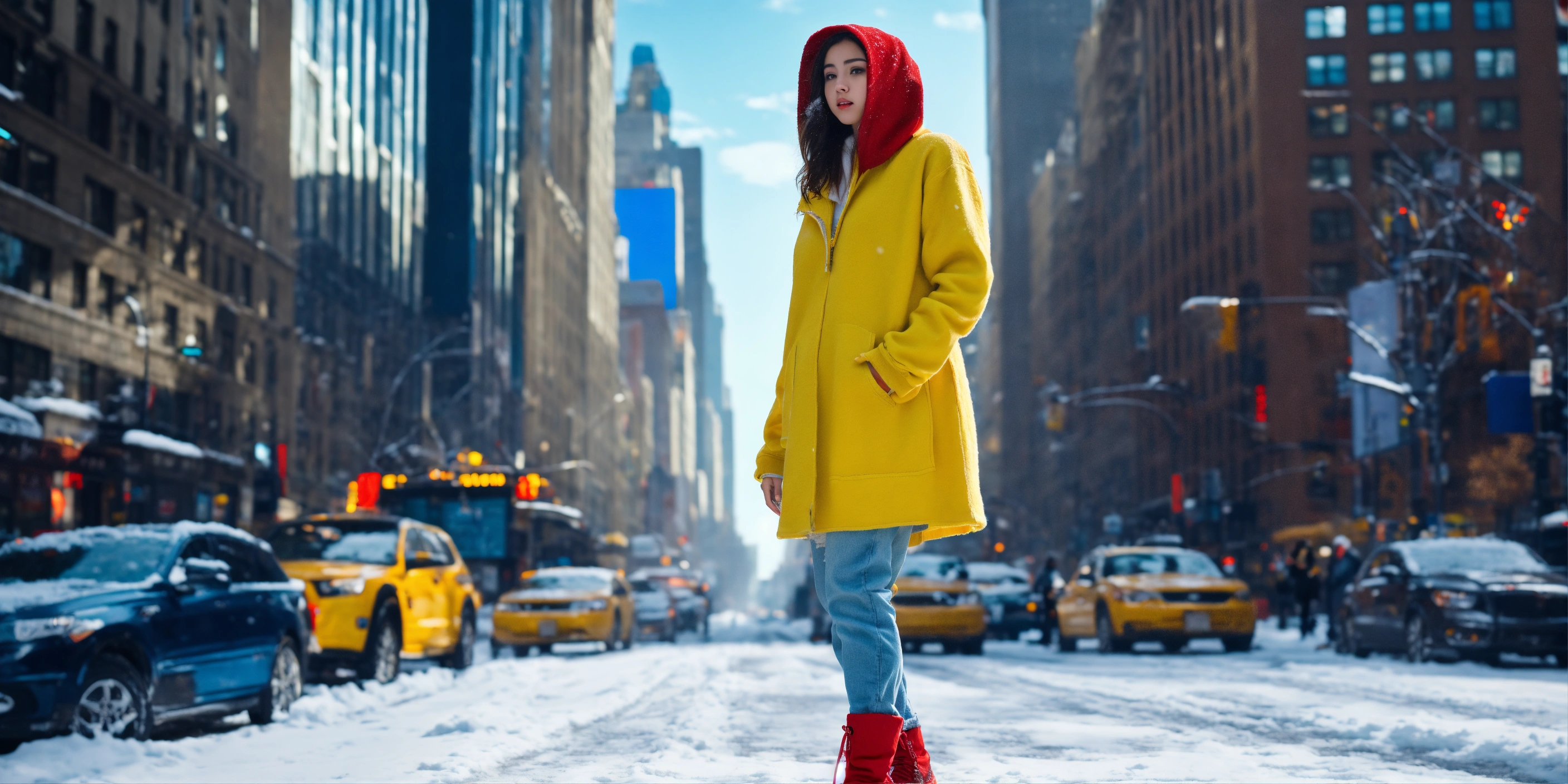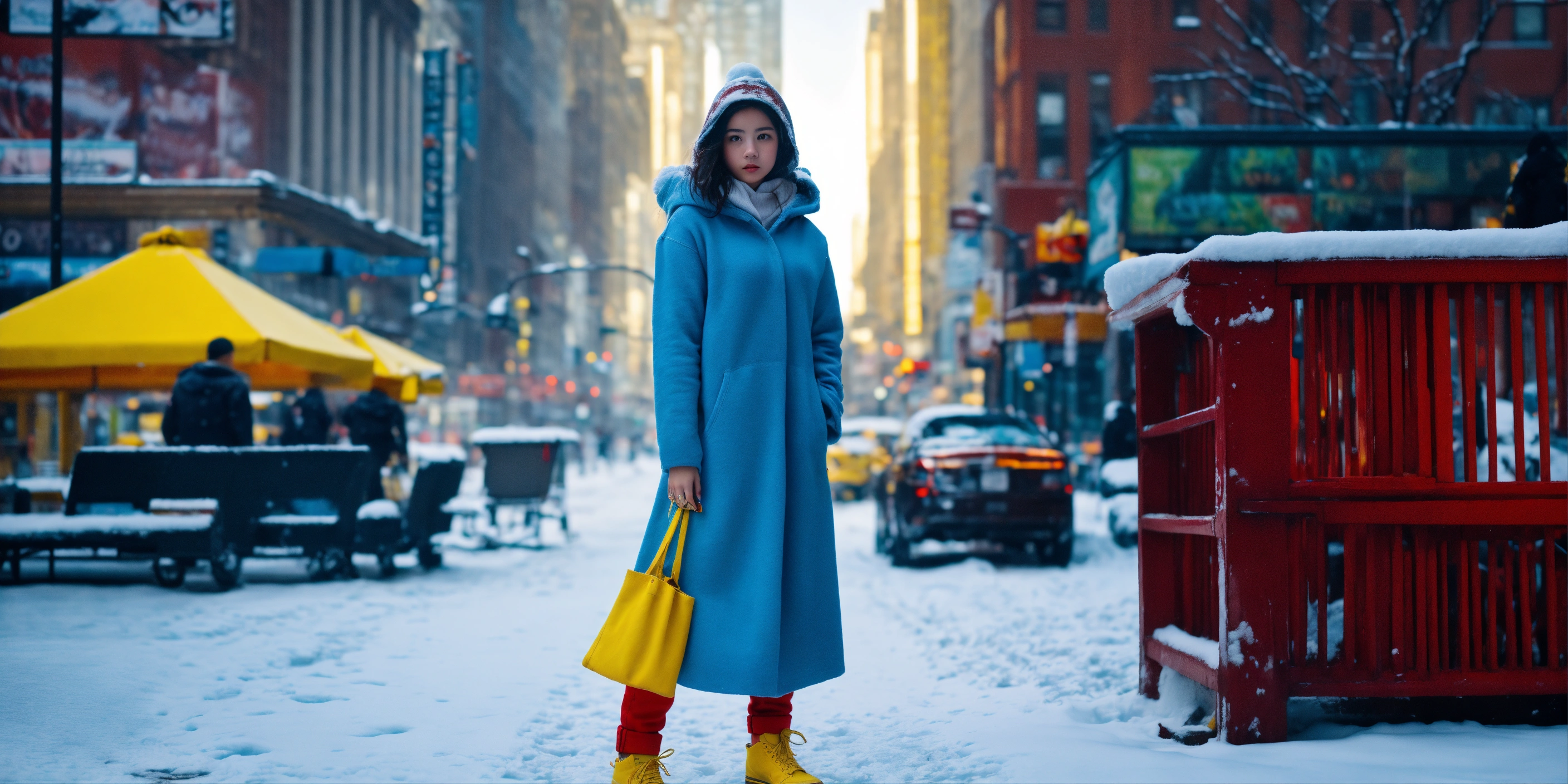 Cinematic image of a girl standing across the new york street on a snowy day, girl should wear white woolen cloth and a red pant and yellow shoes, apart from the girl everything should be white, girls face should be covered with hoodie, the shadows in the image should contain blue tint