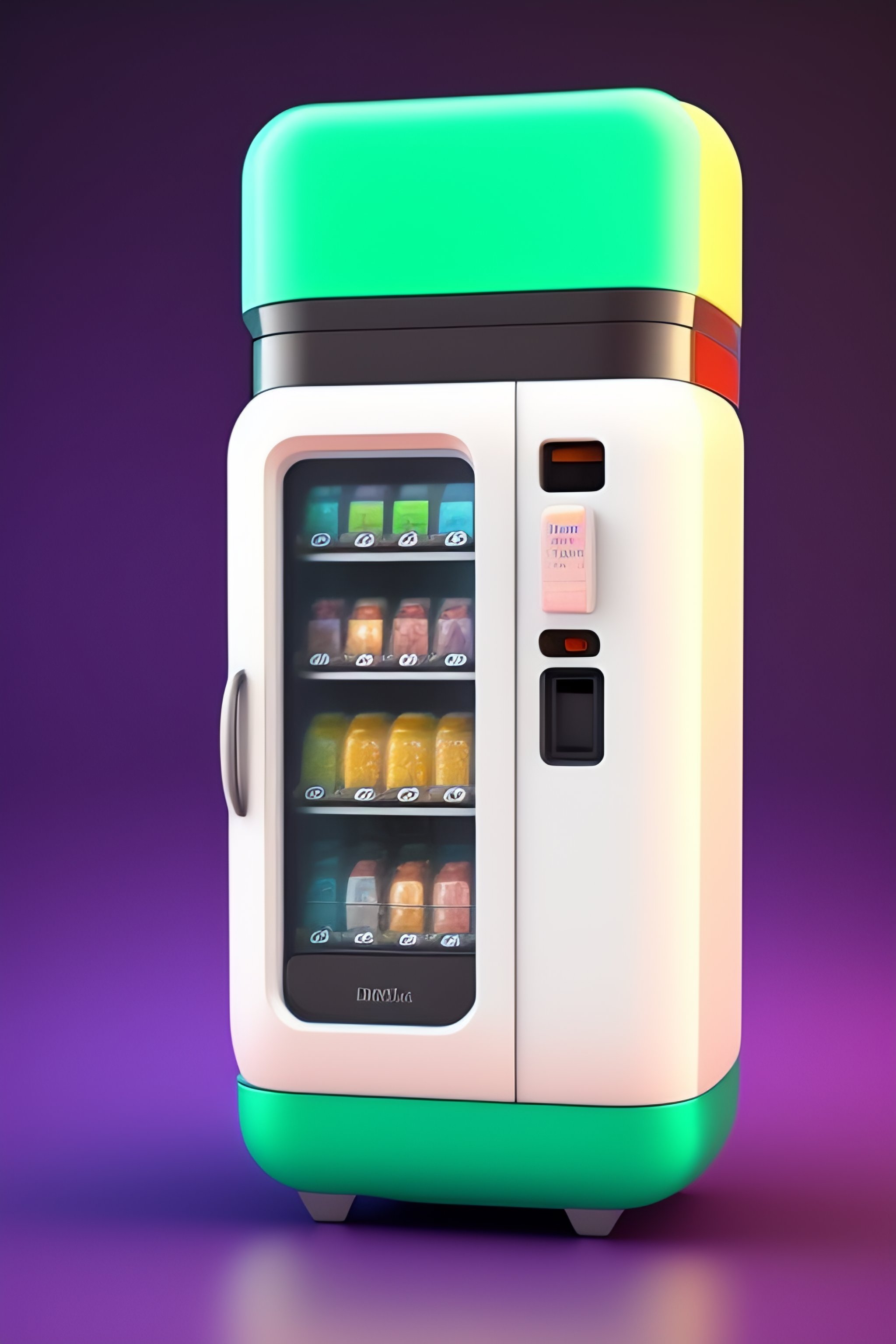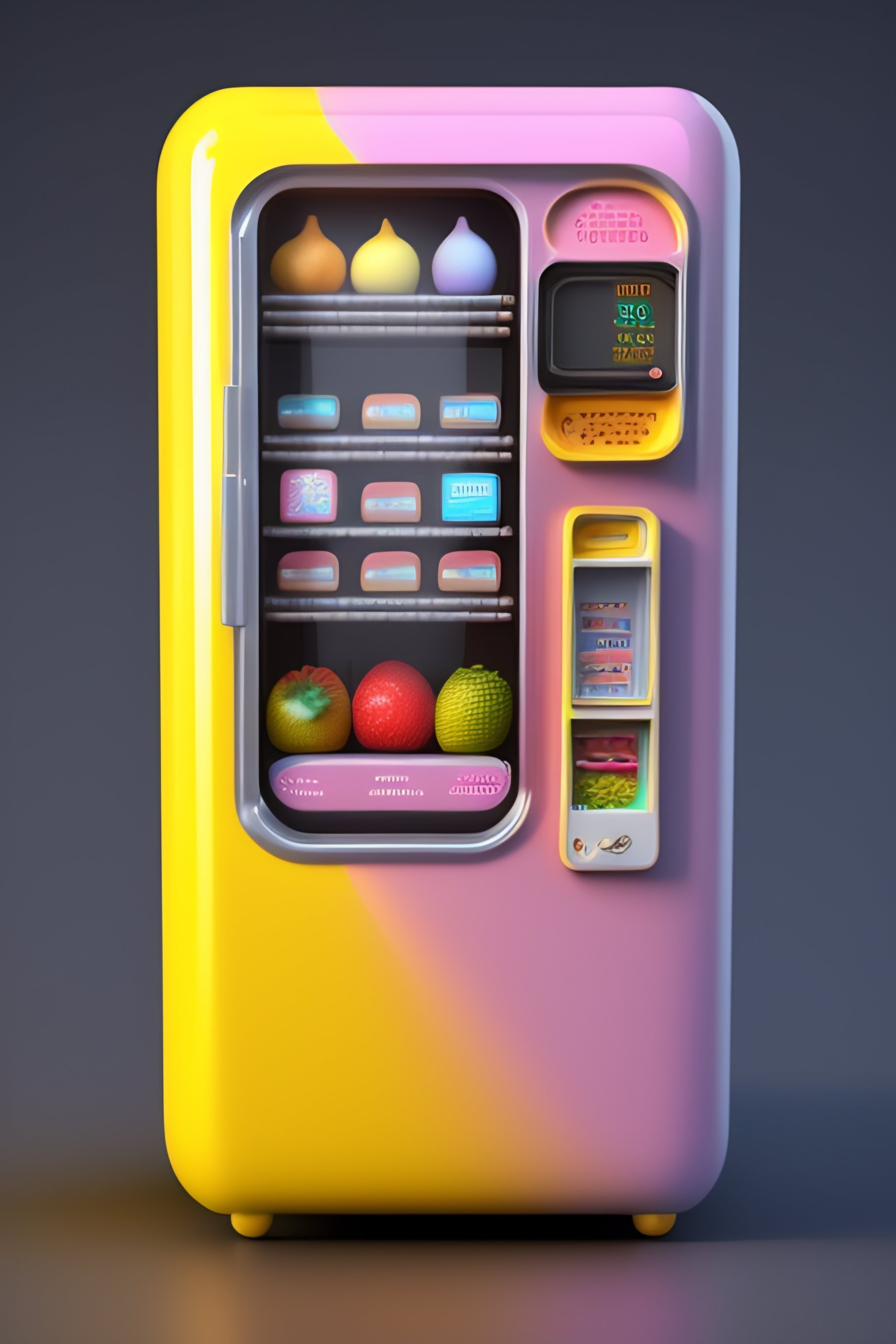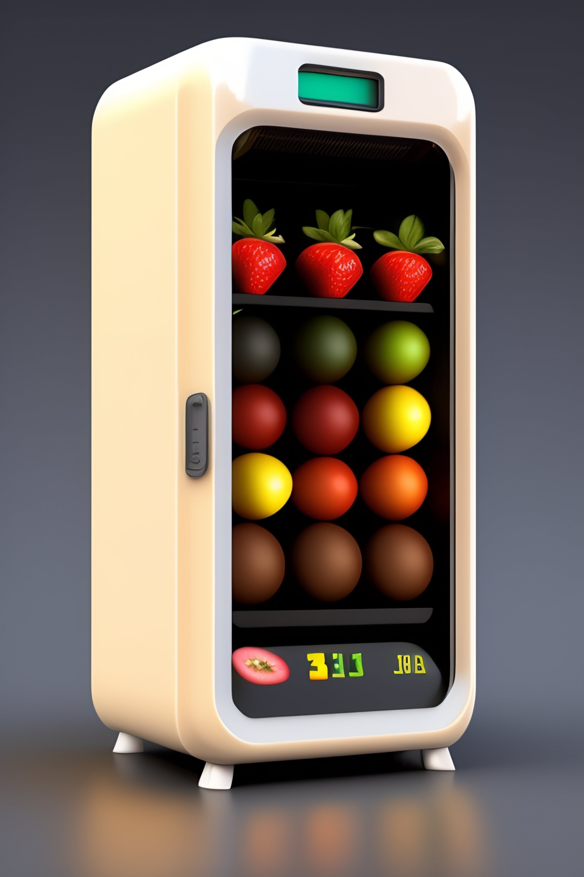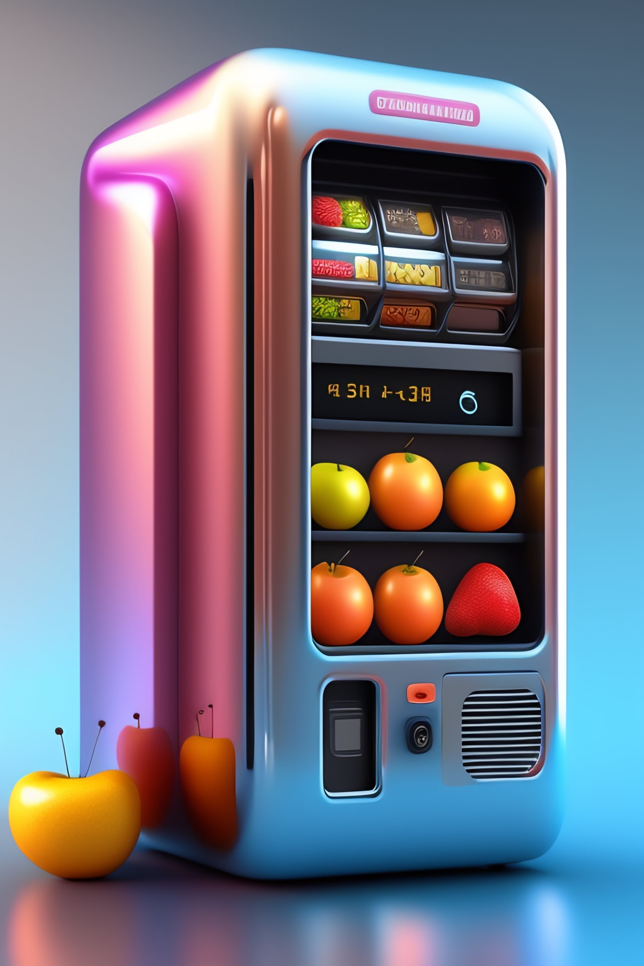 Tiny vending machine for fruits, 3d render, light pastel colors. cute extremely chibi vending machine. white background