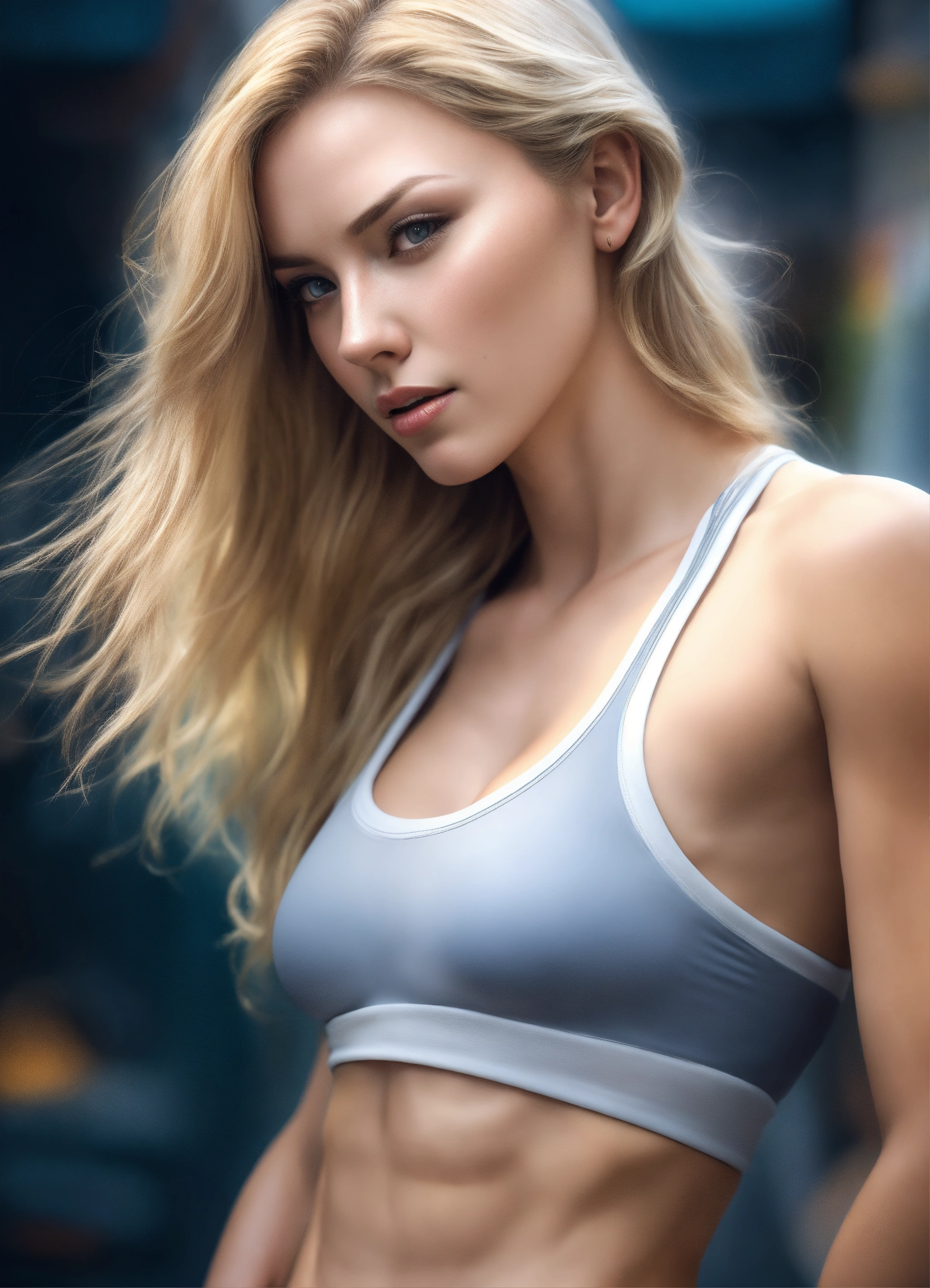 Full body potrait of beautiful faced tall woman with pale skin, blonde hair, muscular midriff in pain, illustration, hyper realistic, highly detailed, digital photography, side glamor pose, 4 k, hdr, smooth, sharp focus, high resolution, award winning photo, professional photographer, masterpiece, 8k, 3d