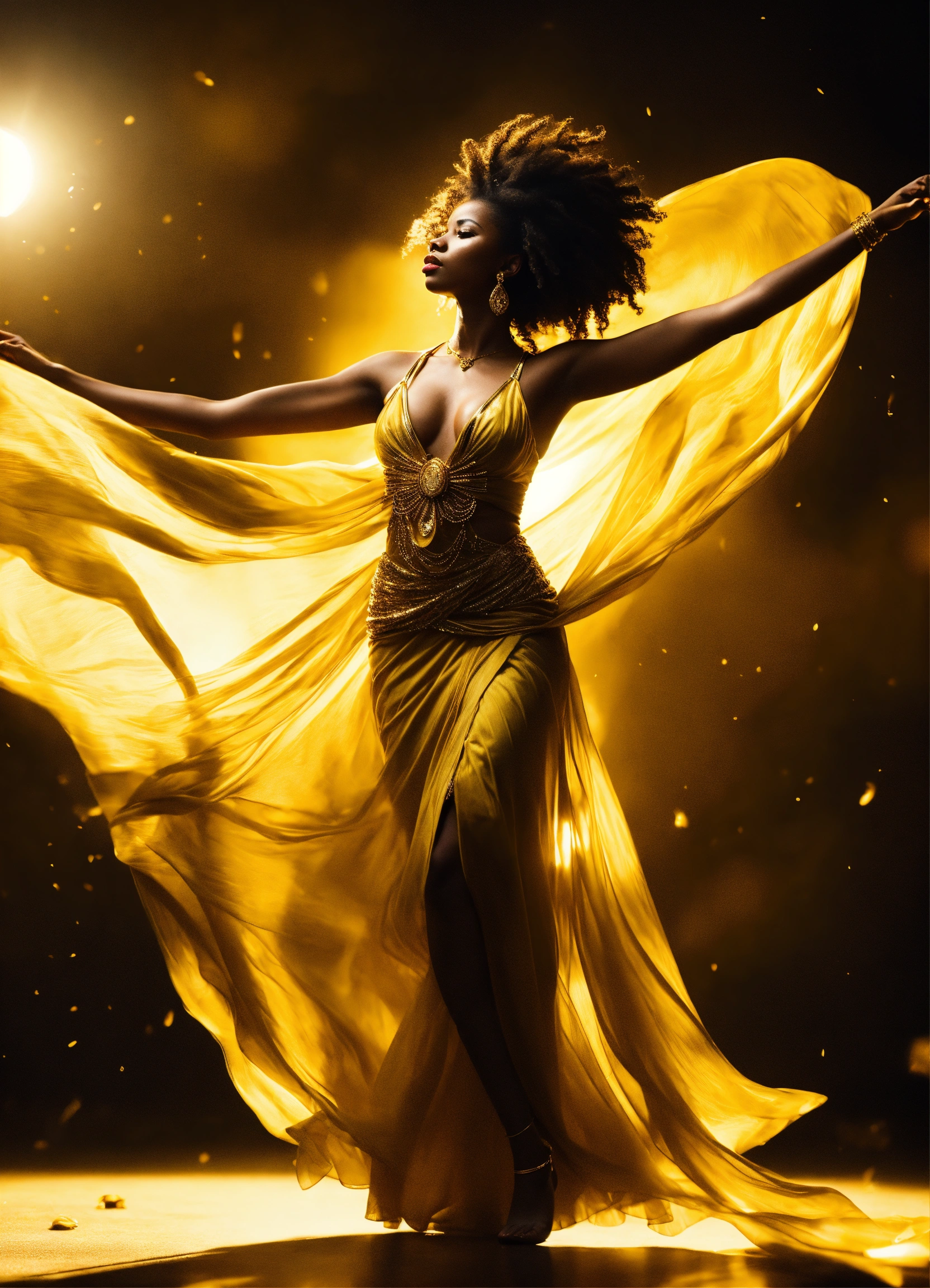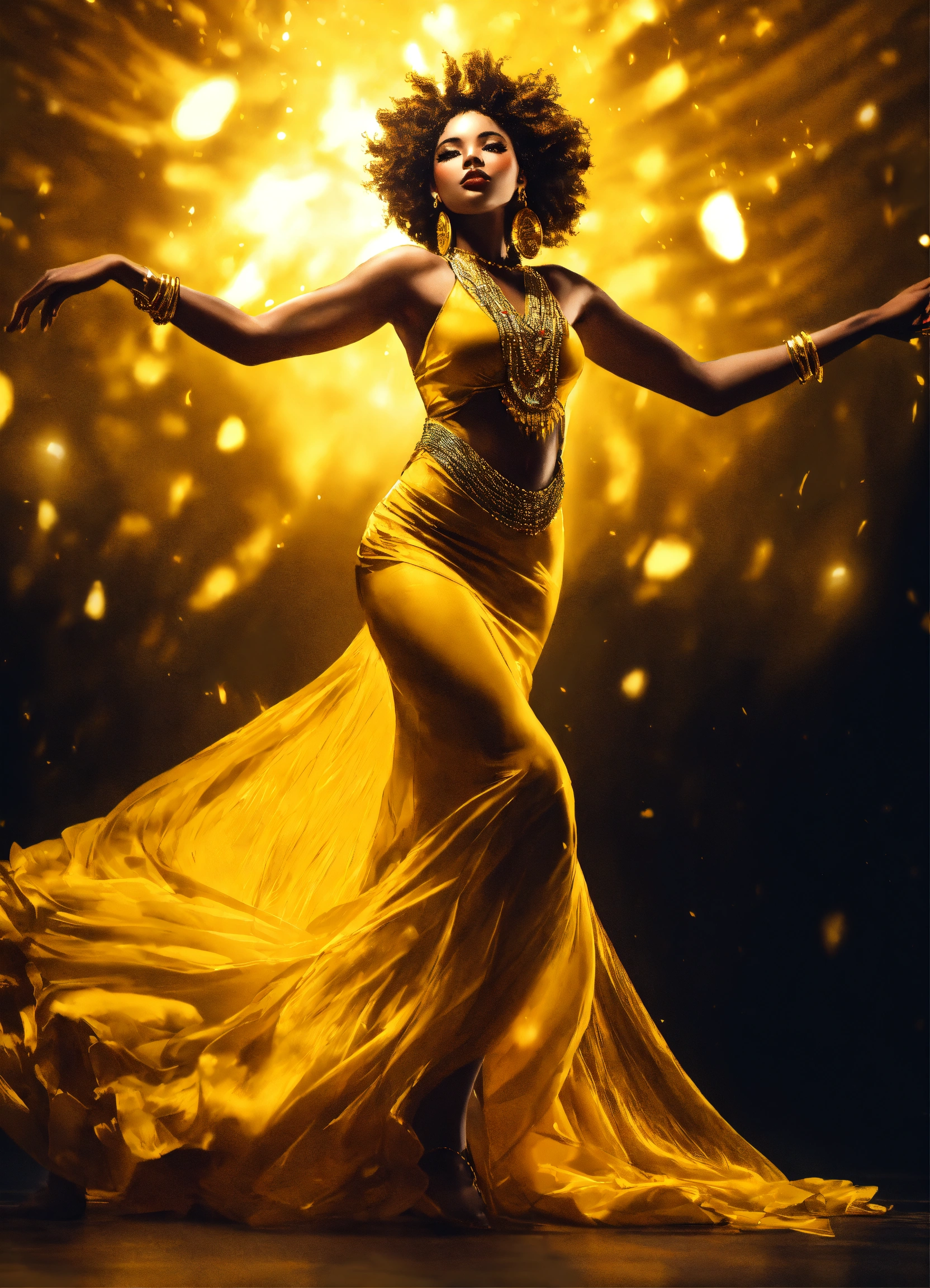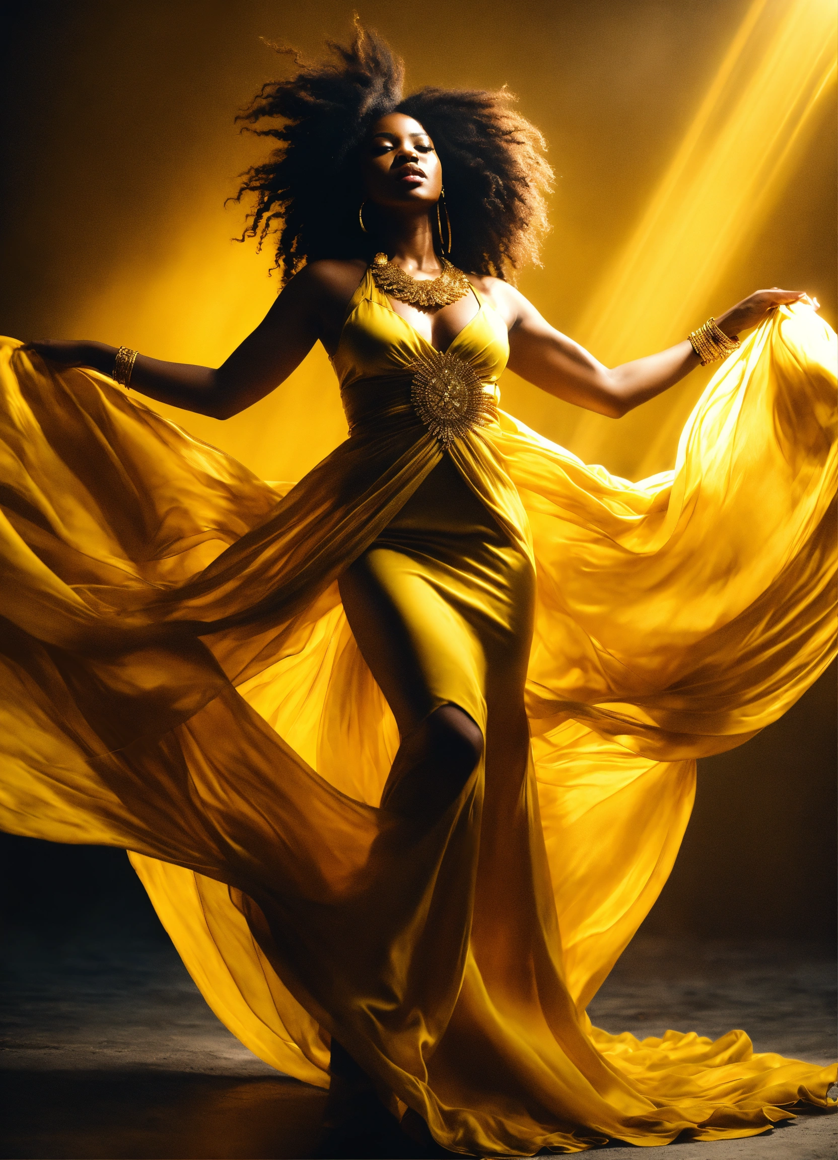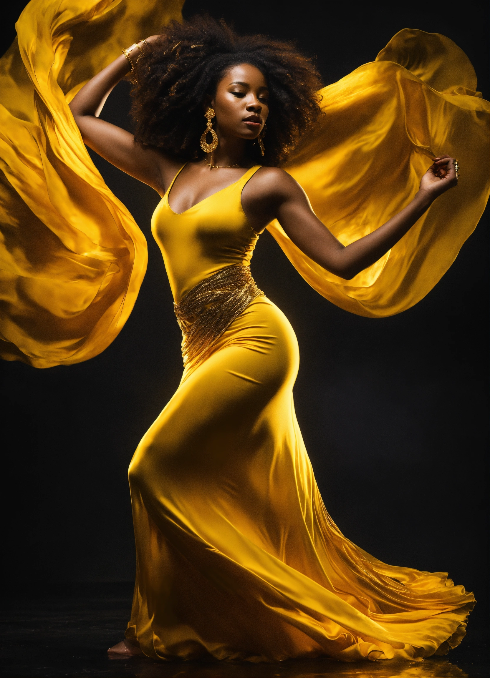 Beautiful african american goddess, dancing in flowing yellow dress, wearing gold jewlery, high contrast, cinematic lighting, digital art, high quality, 4k, full body