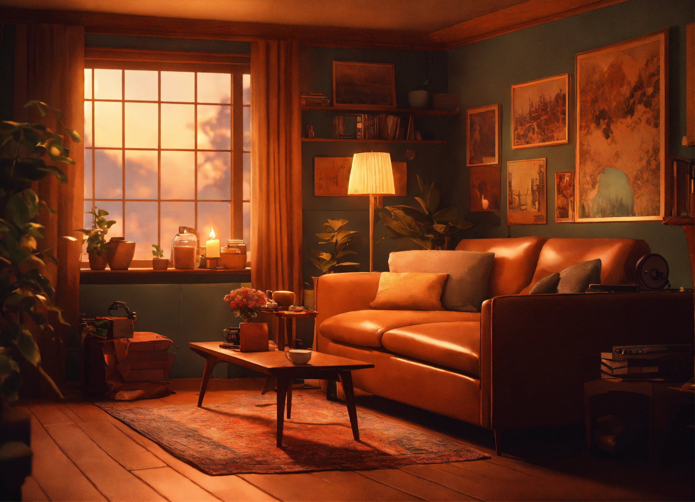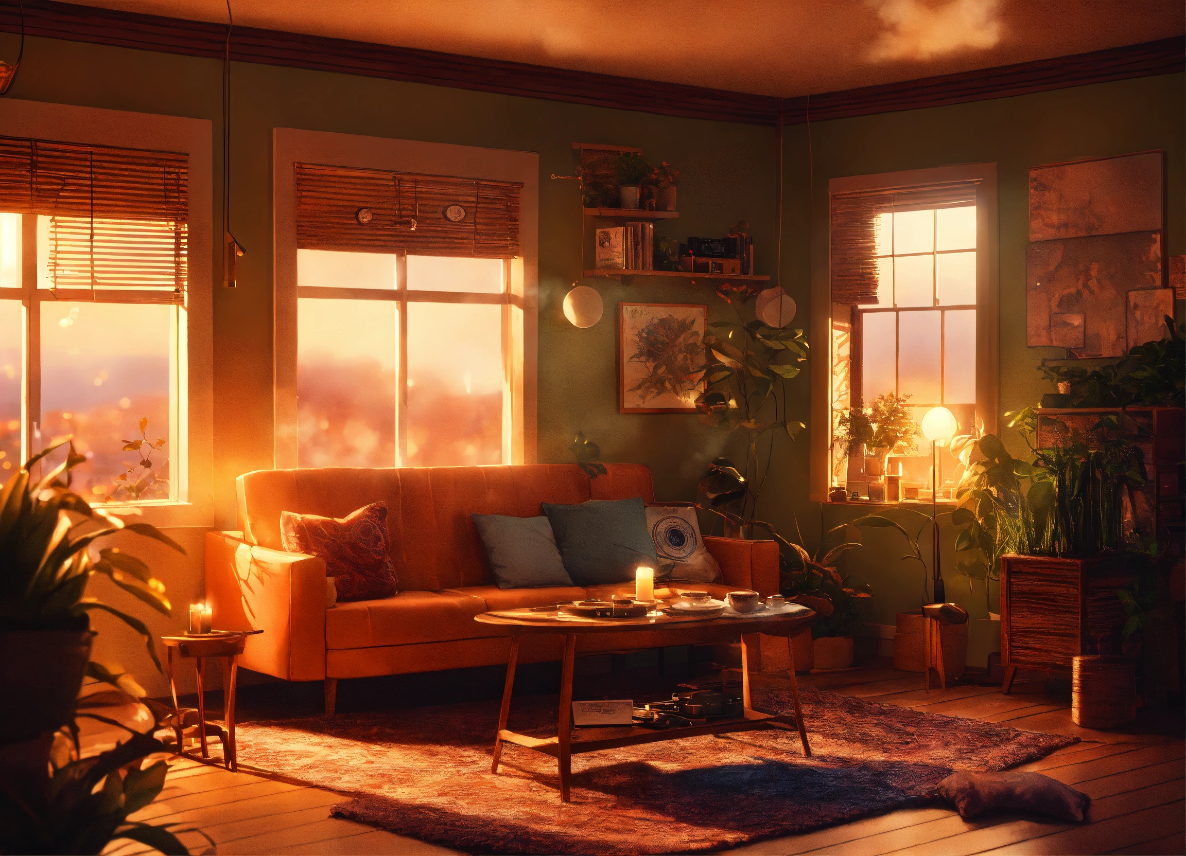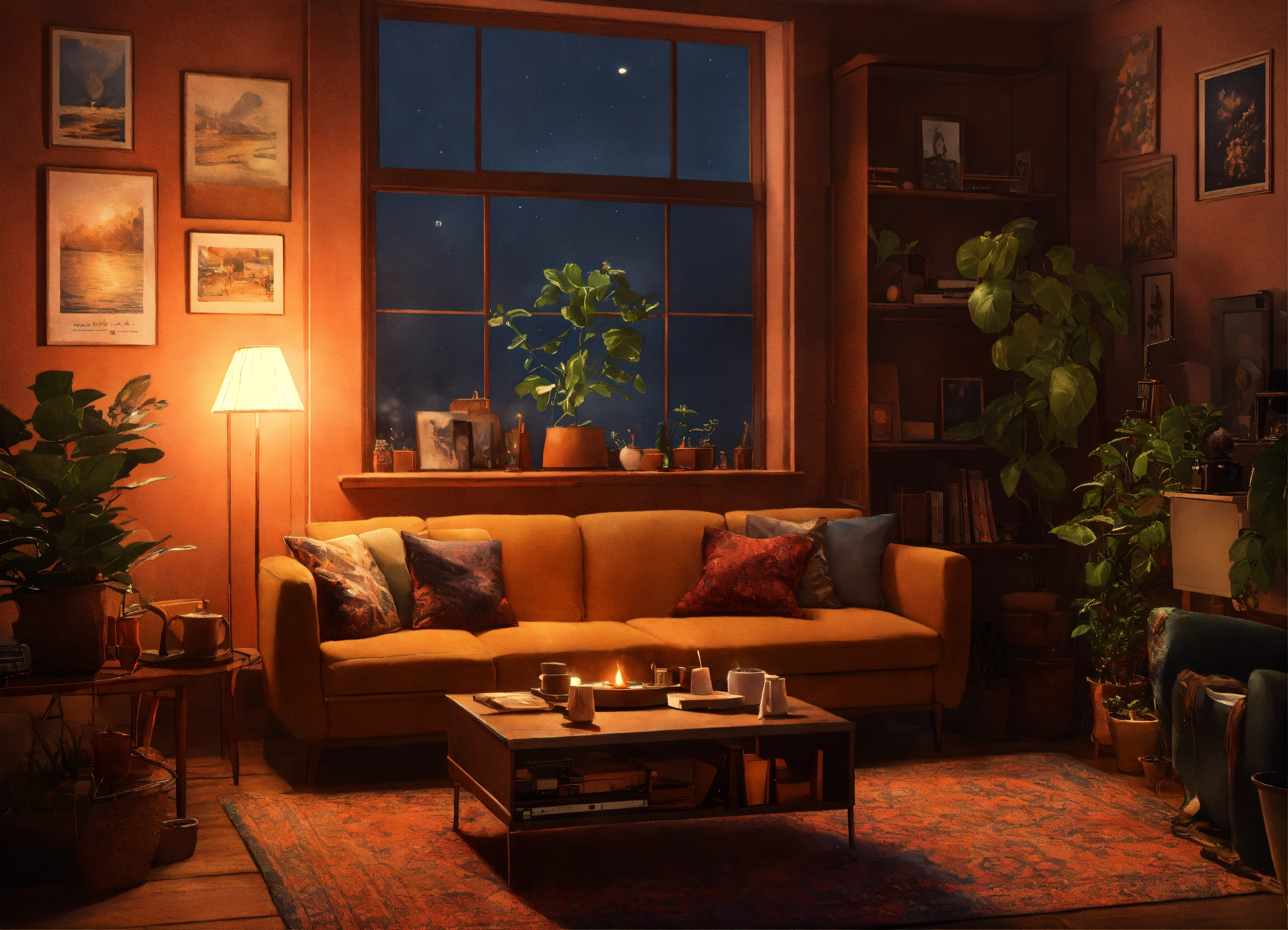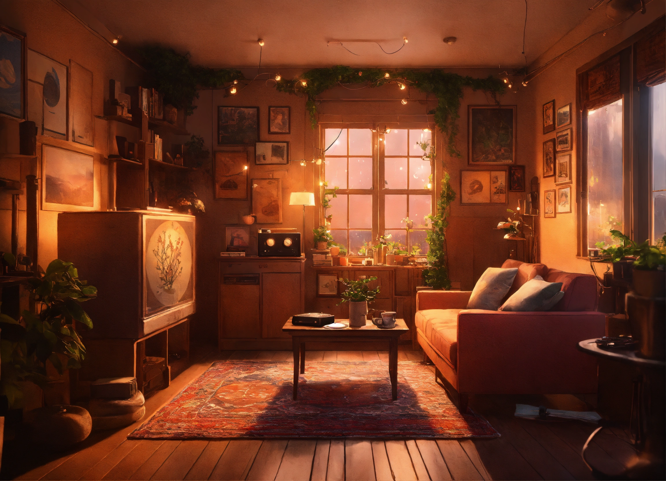 "generate a highly detailed image of a moody and incredibly cozy room that sets the perfect atmosphere for a viral lofi music video. the room should be dimly lit, with soft, warm lighting coming from string lights or candles, creating a captivating ambiance. there should be comfortable seating like plush cushions and blankets, and perhaps a window with rain gently falling outside. in the room, you can include elements like a record player, vintage posters on the walls, and a steaming cup of tea or coffee on a table. this image should capture the essence of relaxation, perfect for a lofi music video that viewers will want to share and immerse themselves in."