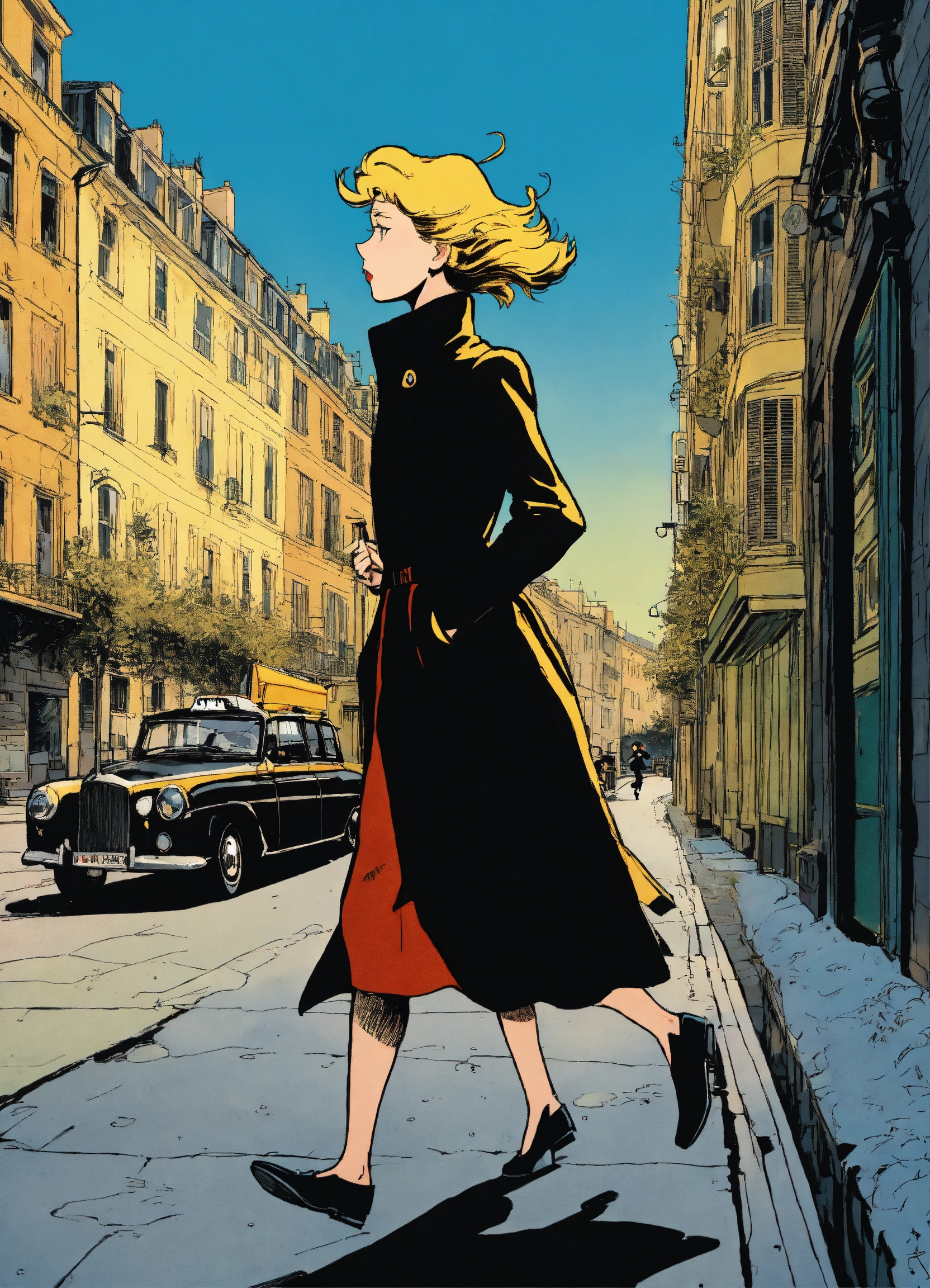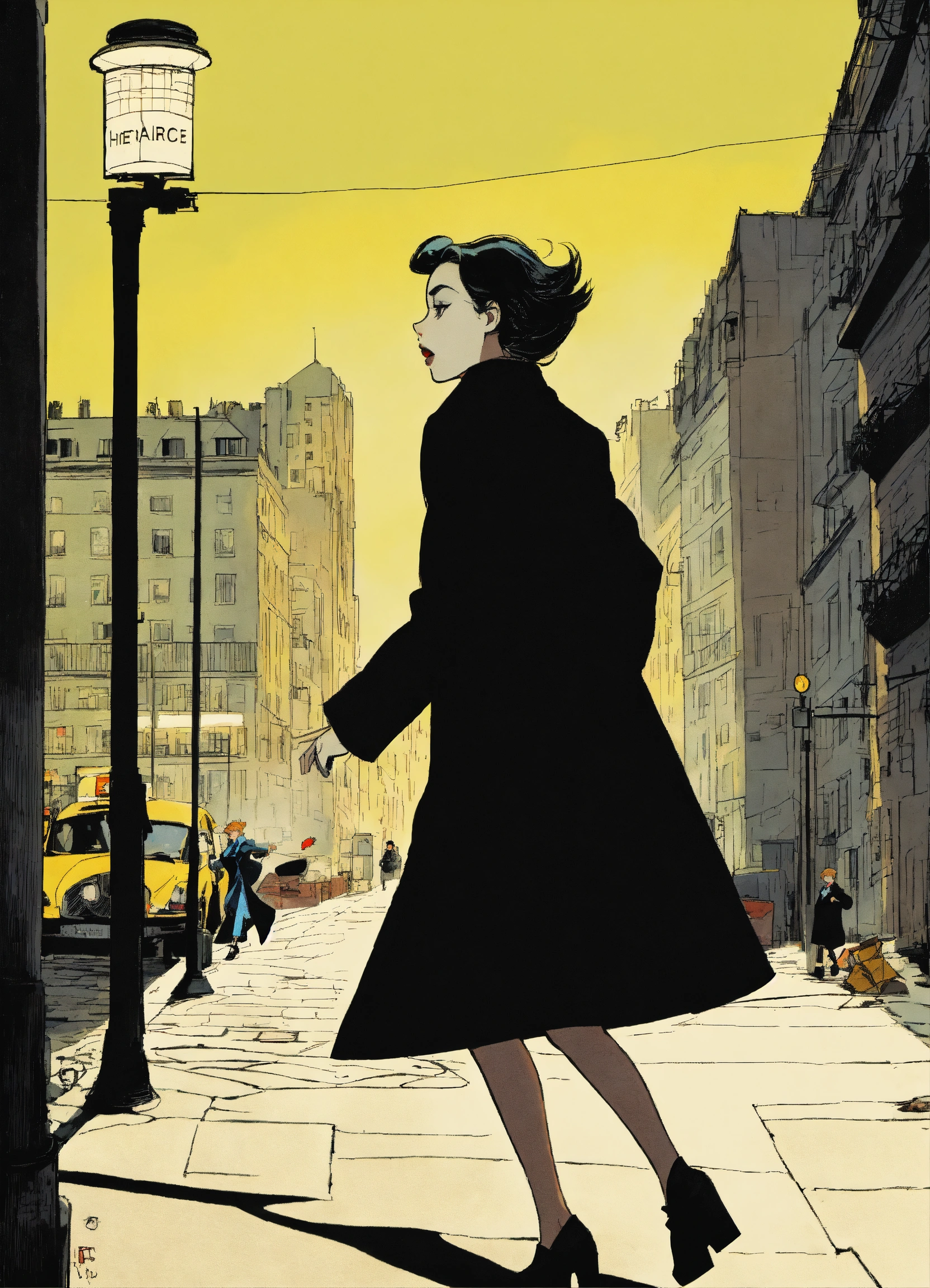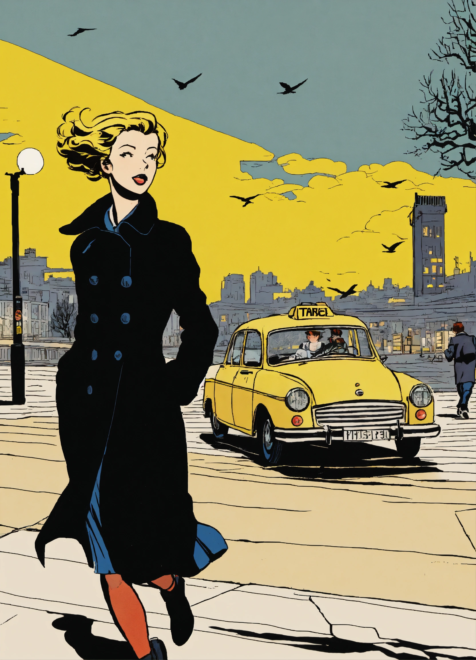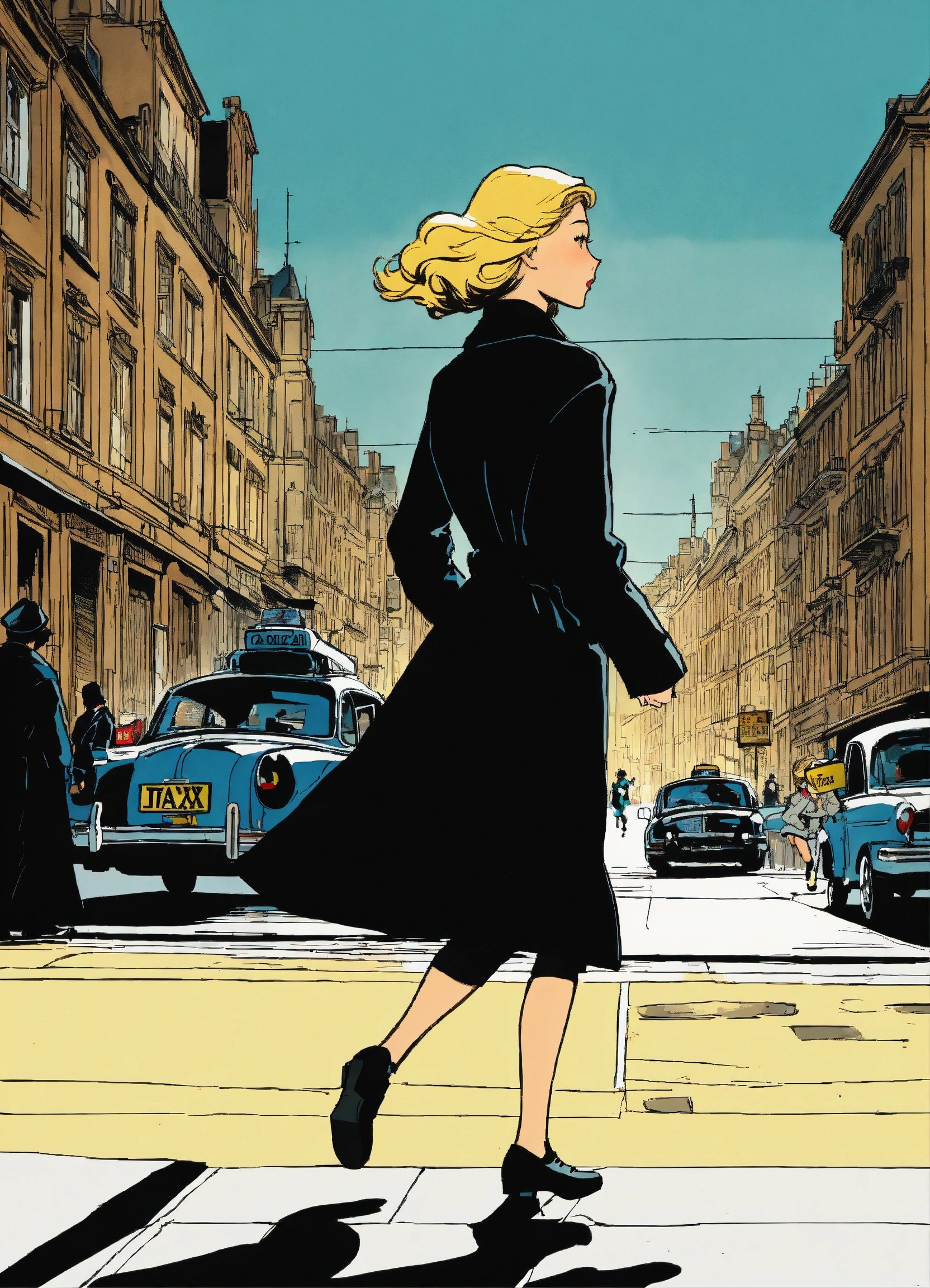 Illustration by herge depicting a girl running fast for a taxi, dressed in a black coat, urban landscape, beautiful shadows, black makeup, shiny gloss (author herge1.2)