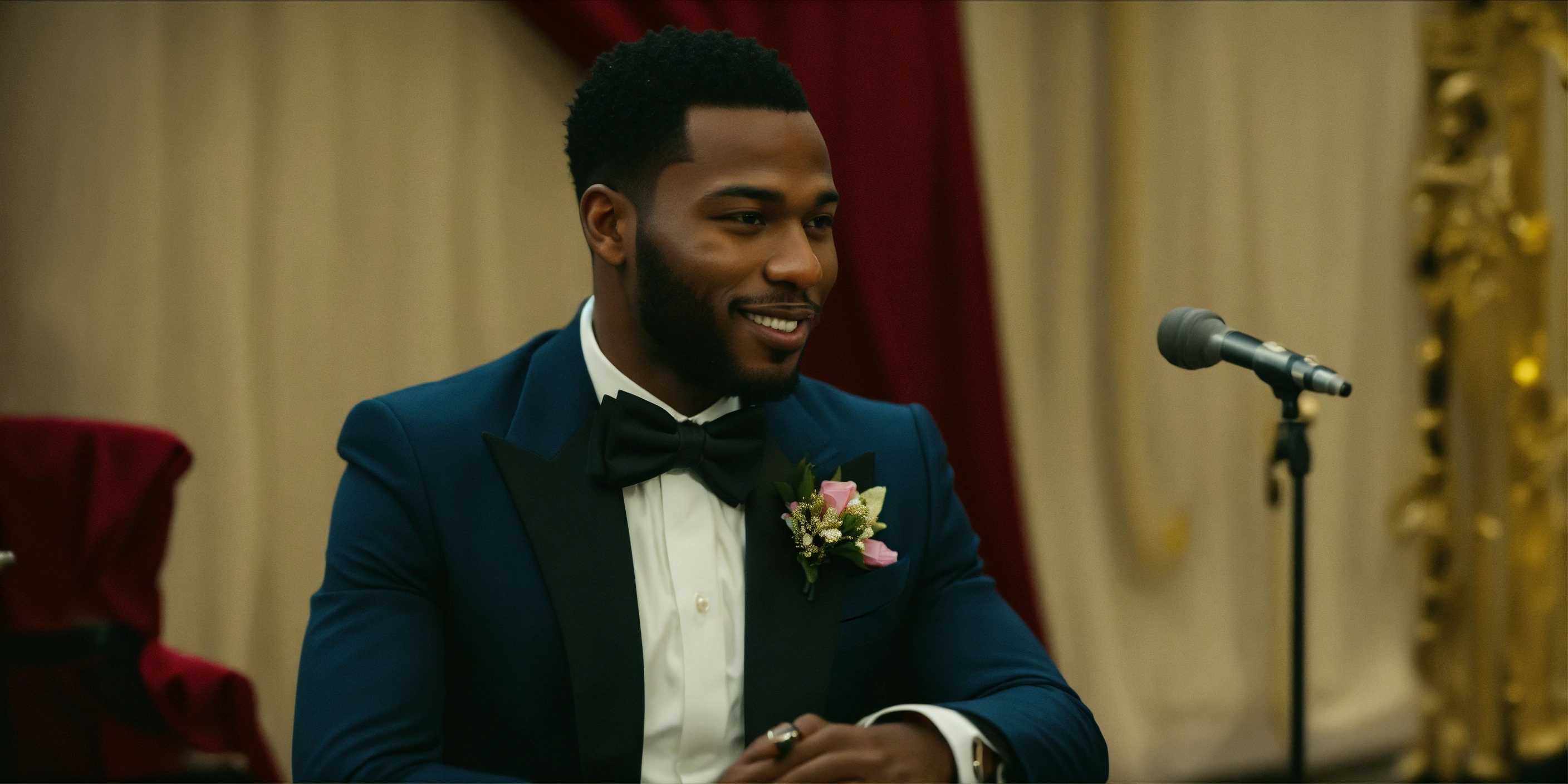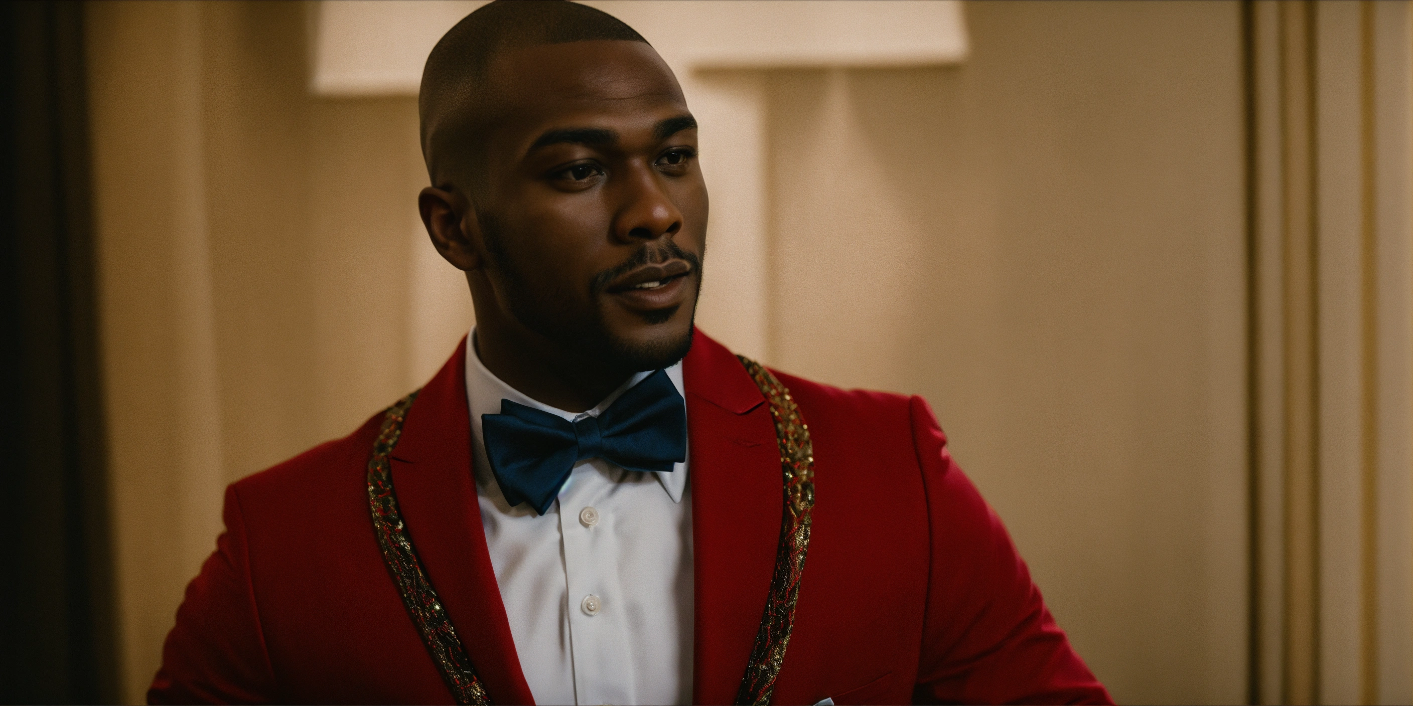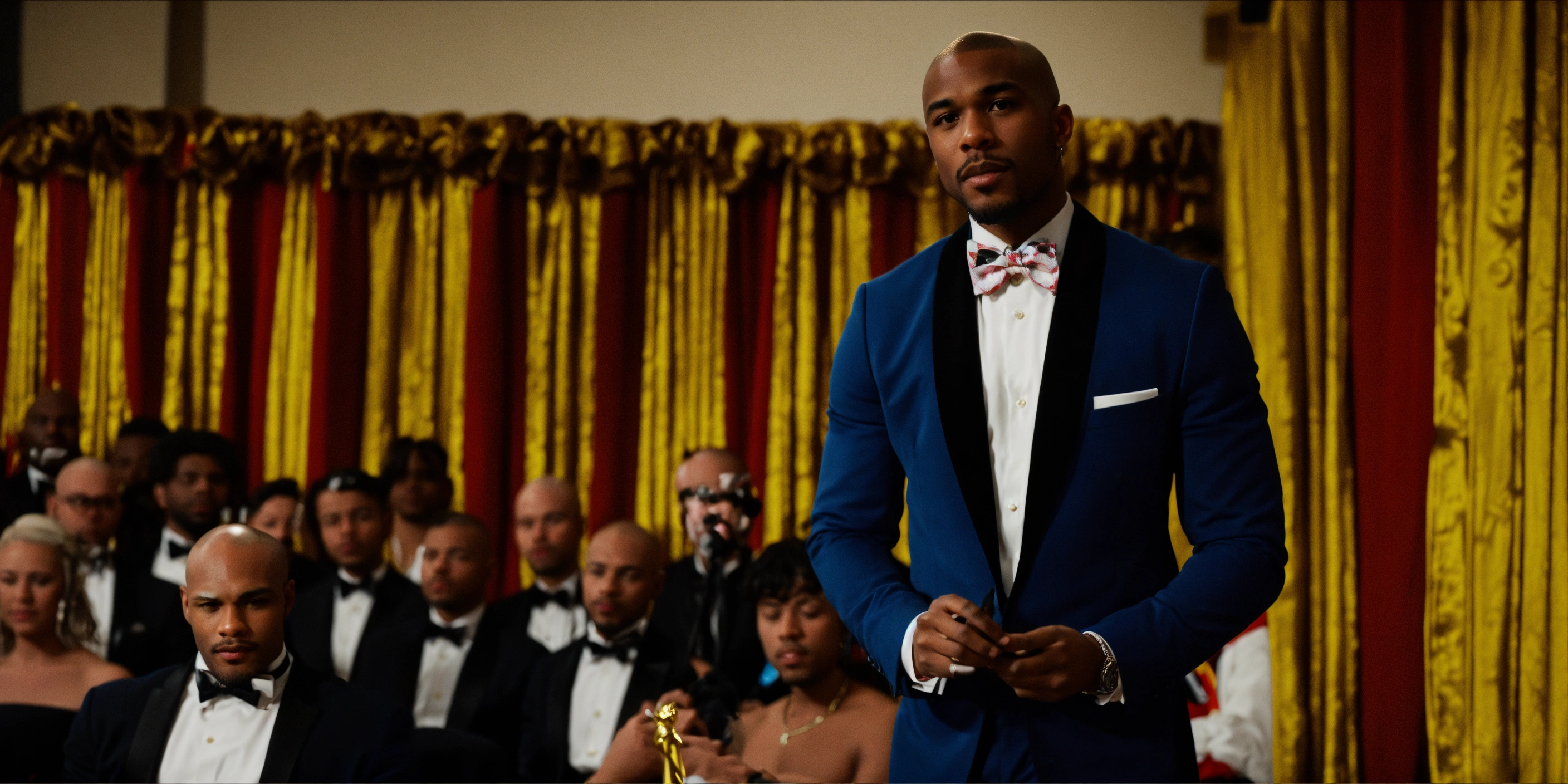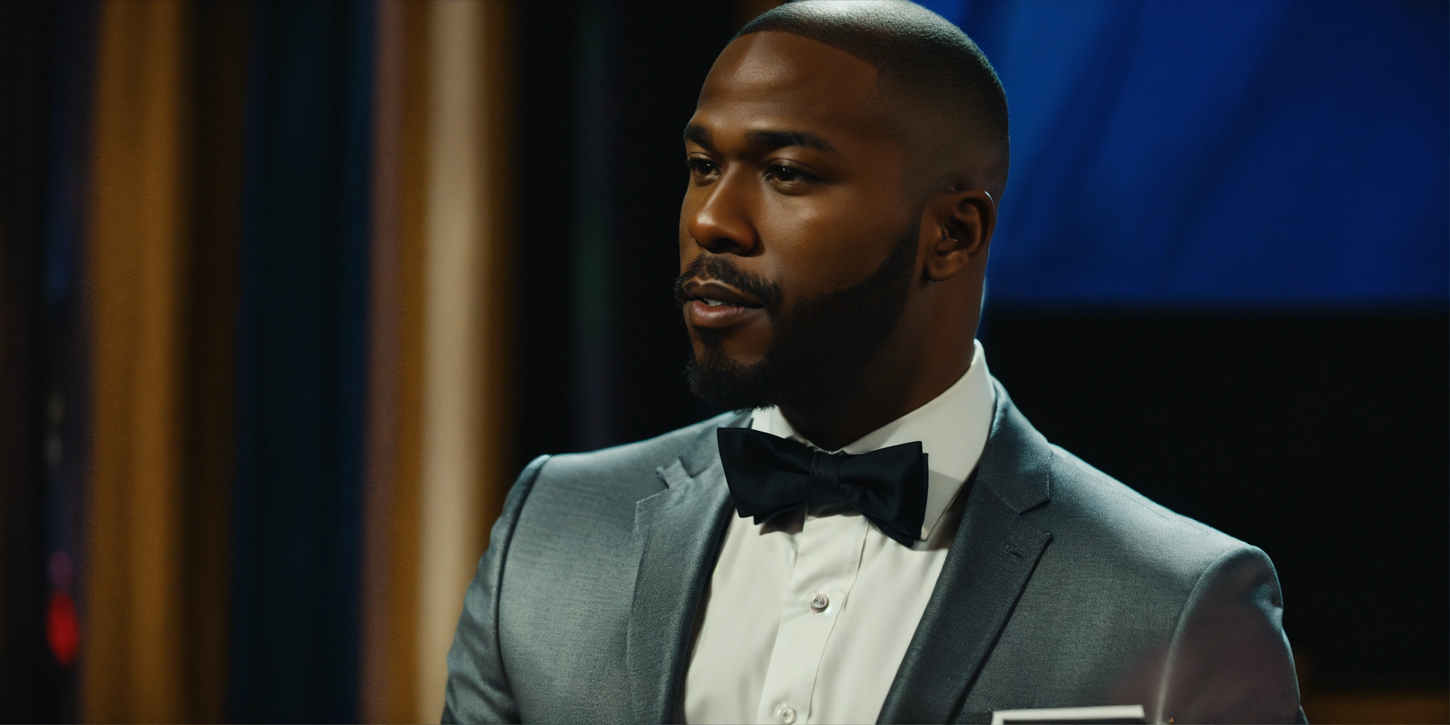 A stylish well dressed black man with a shaved head, wearing a bow tie, sits backstage and rehearses an acceptance speech for a prestigious award