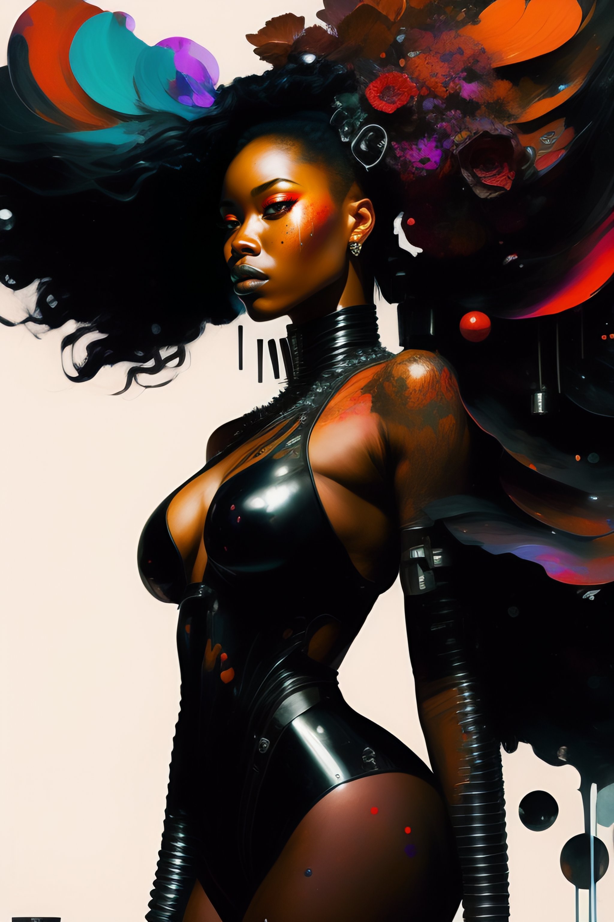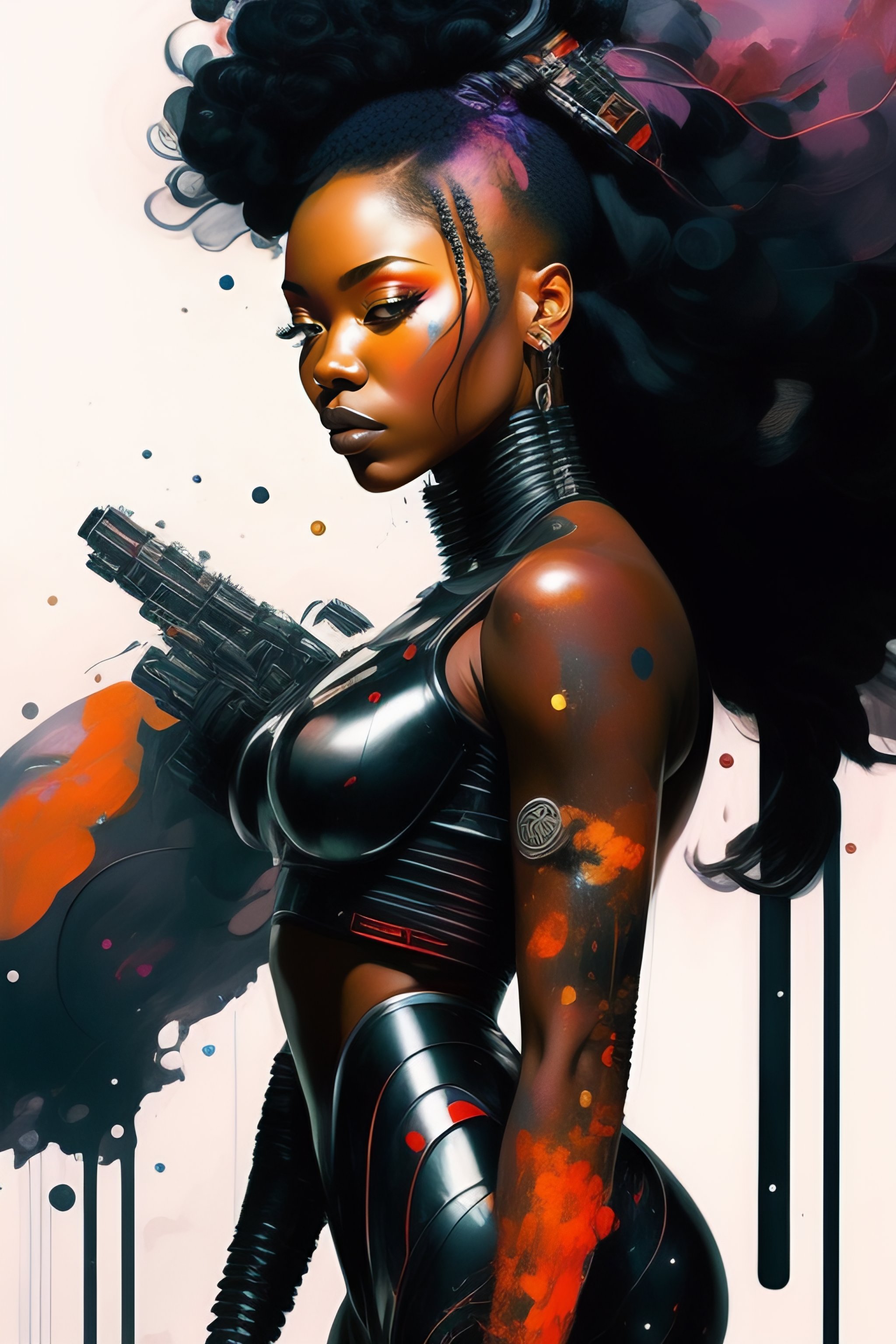 A black woman cyborg, part machine, part human, splatter, in the style of adrian ghenie, esao andrews, jenny saville, edward hopper, surrealism, dark art by james jean, takato yamamoto, inkpunk minimalism