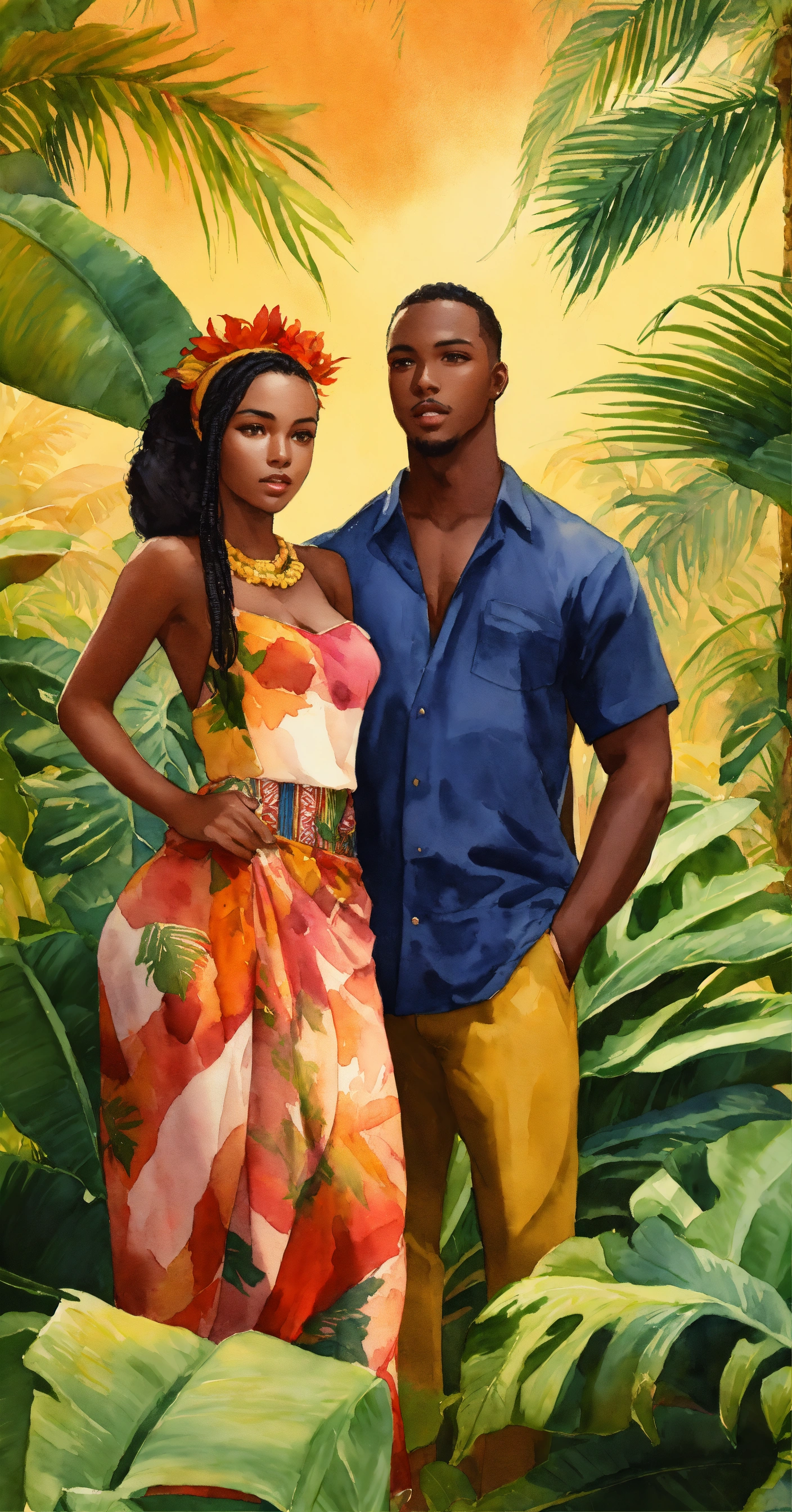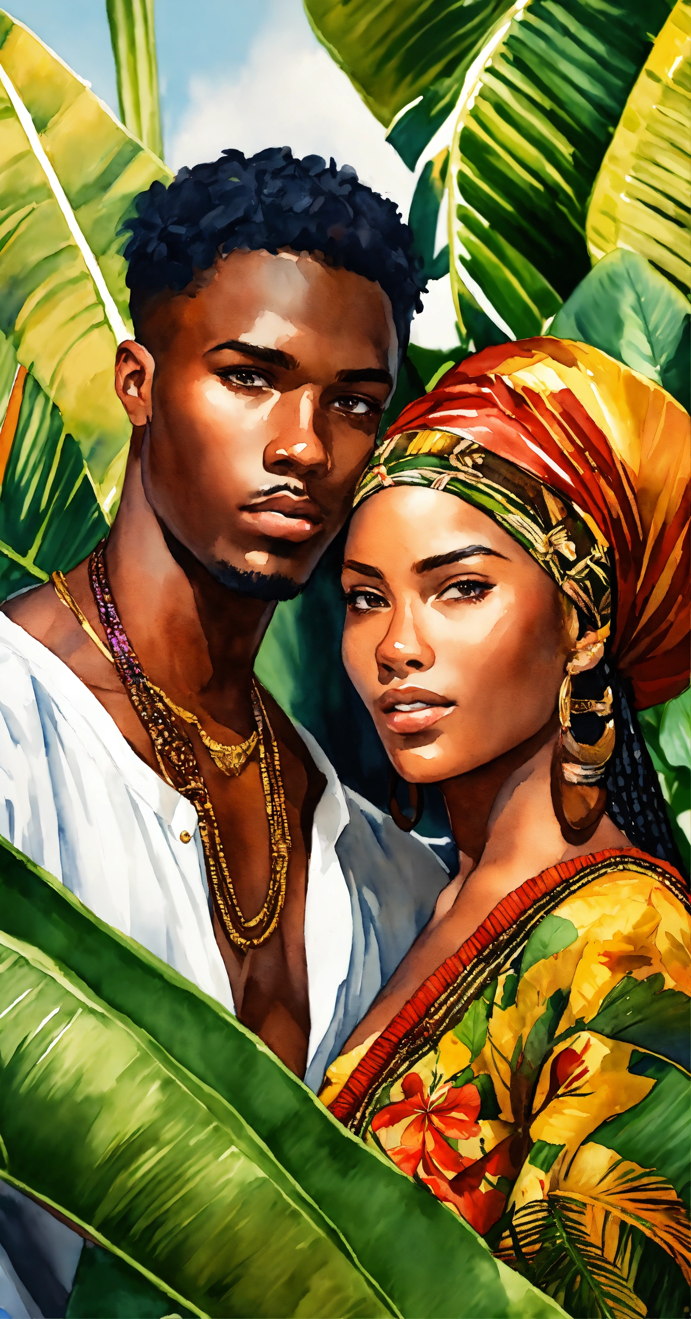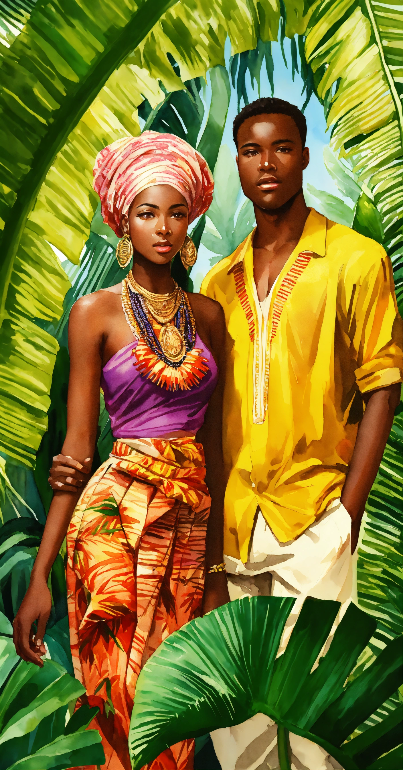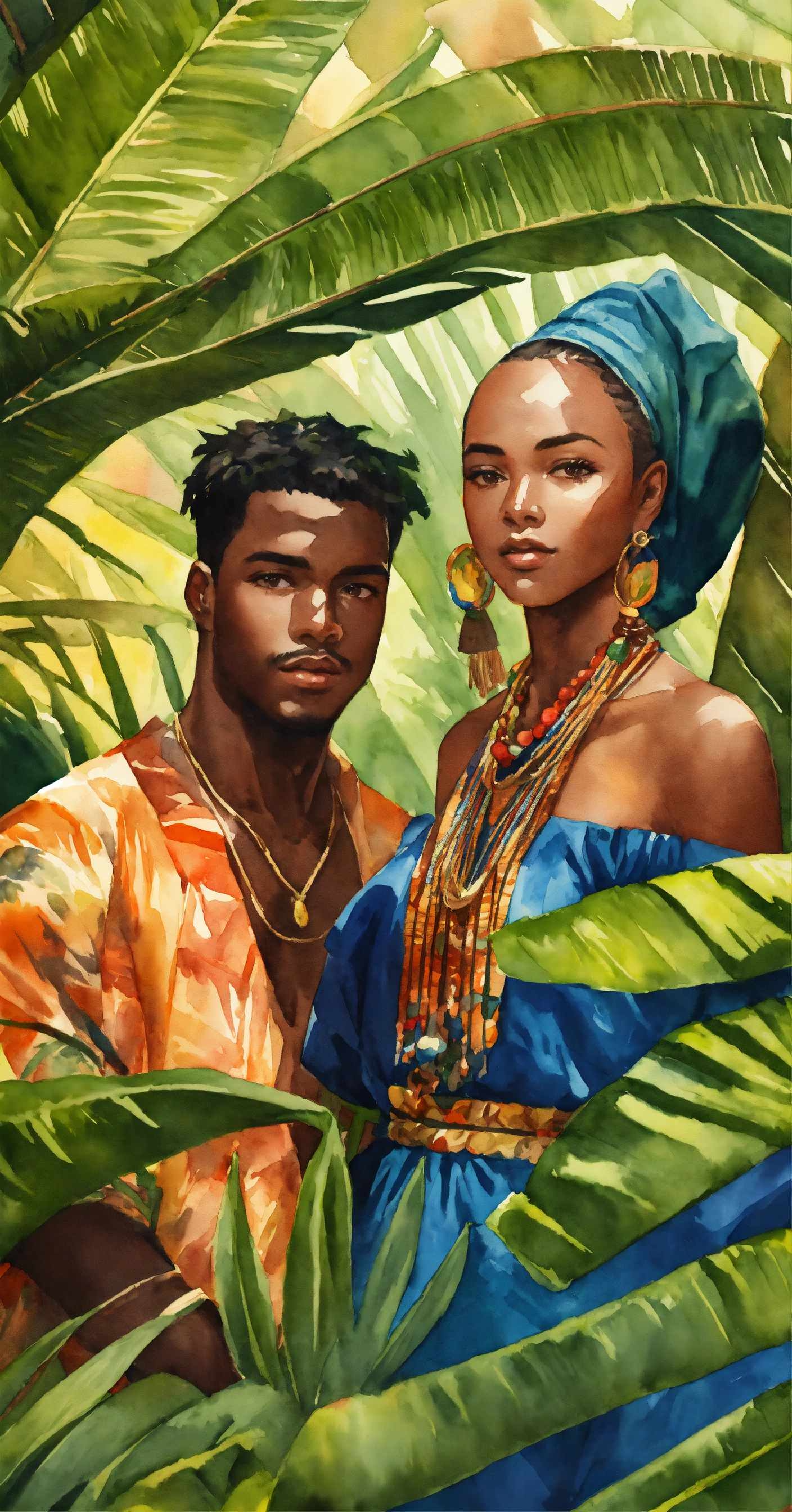Handsome young man and beautiful young woman from tropical central africa with traditional african clothing among subtropical plants and large banana leaves and palm leaves, watercolor illustration, photorealistic with warm tones and intense colors, 8k high resolution