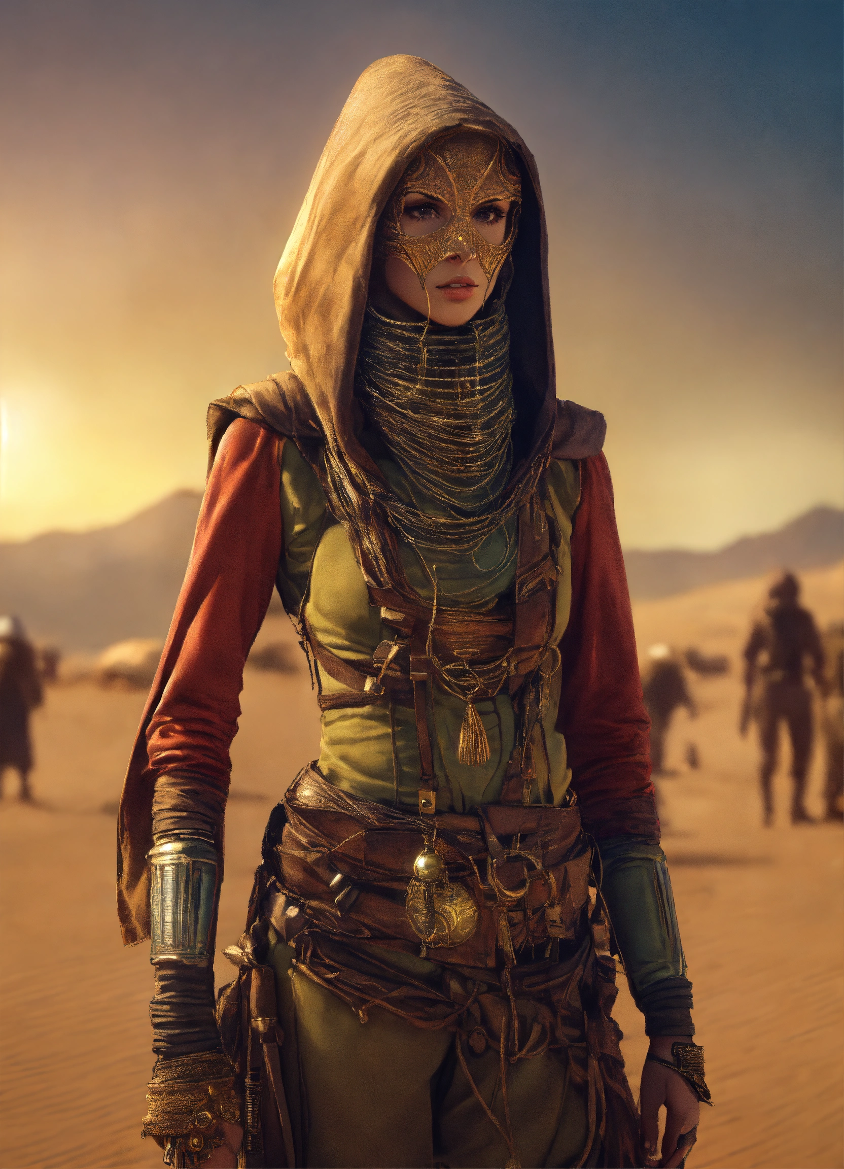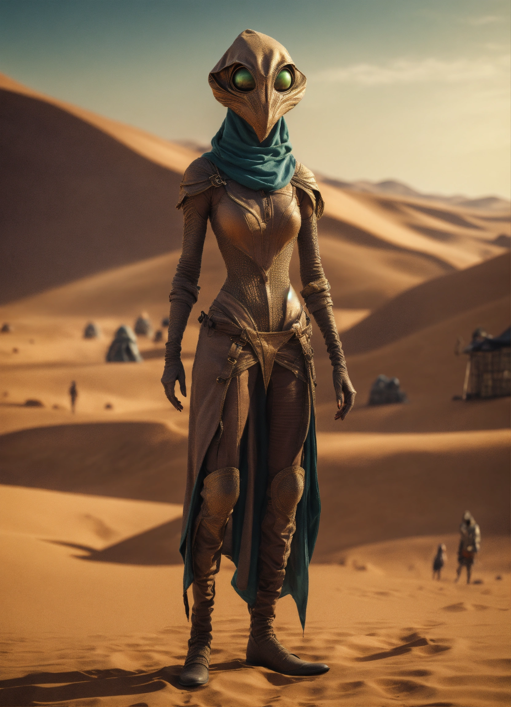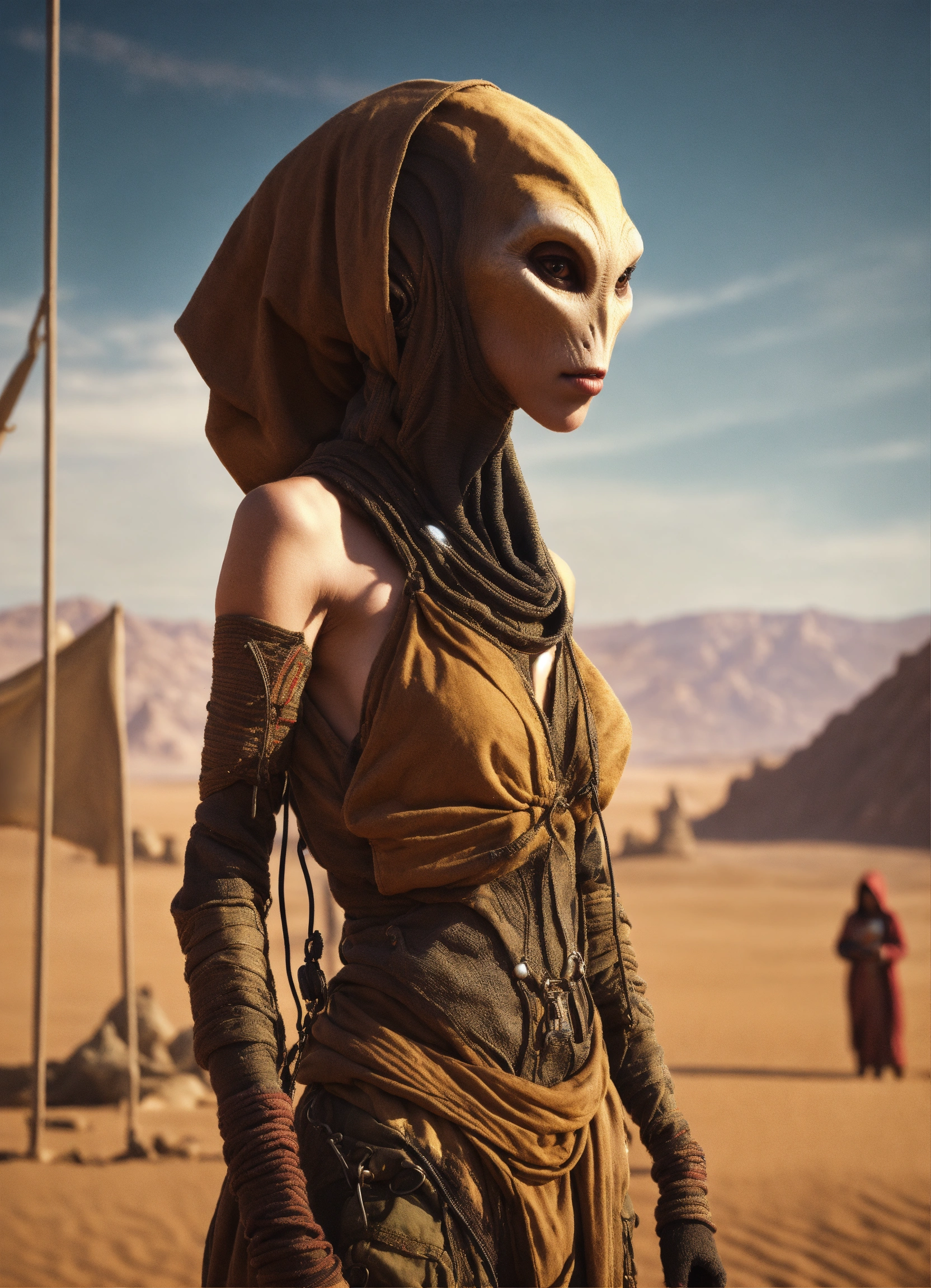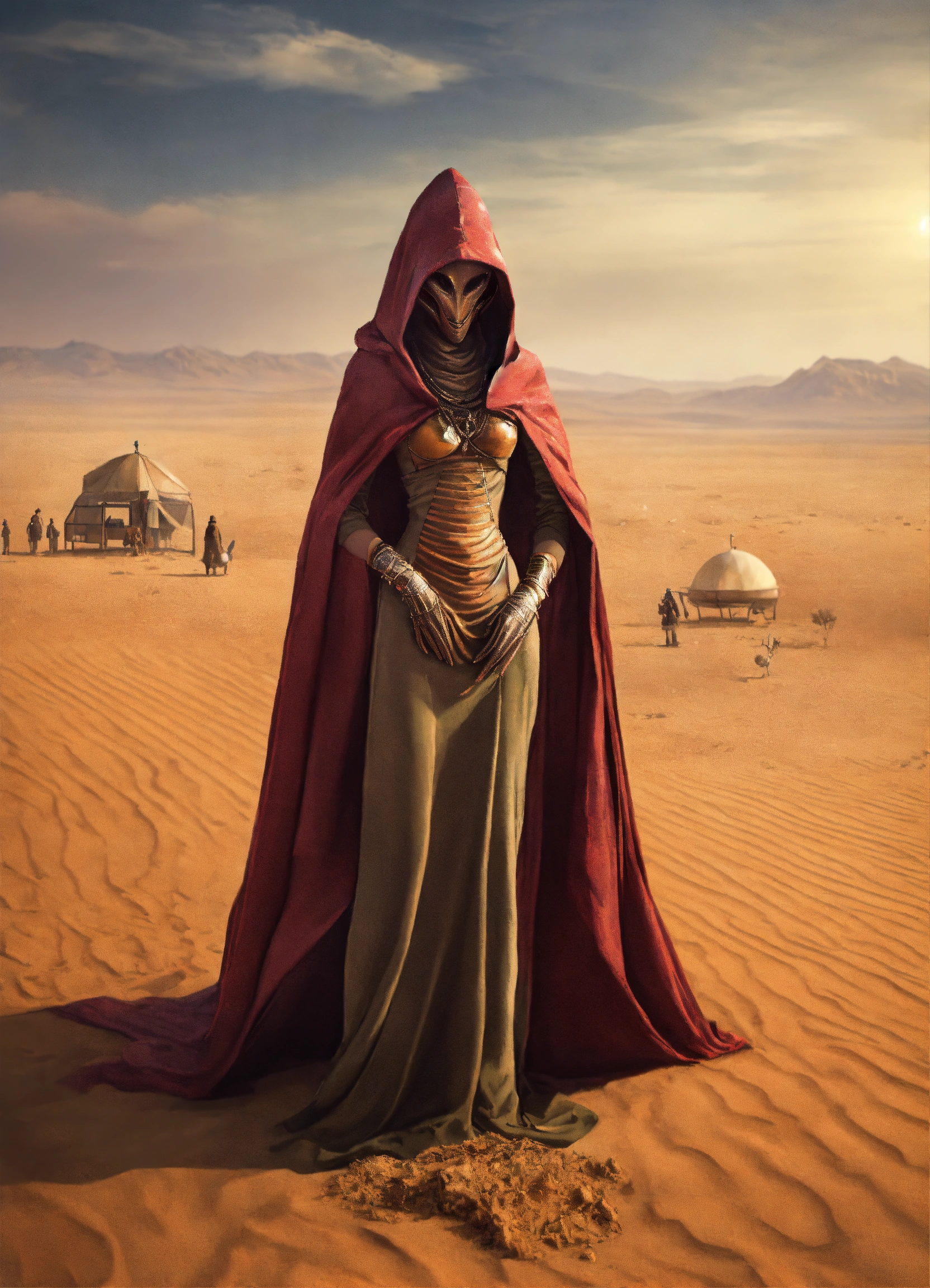 Very slim and tall female alien creature merchant on a desert un the market of a alien planet, suspicious look, hooded, hyperrealistic, selling caged alien vermin, western shot