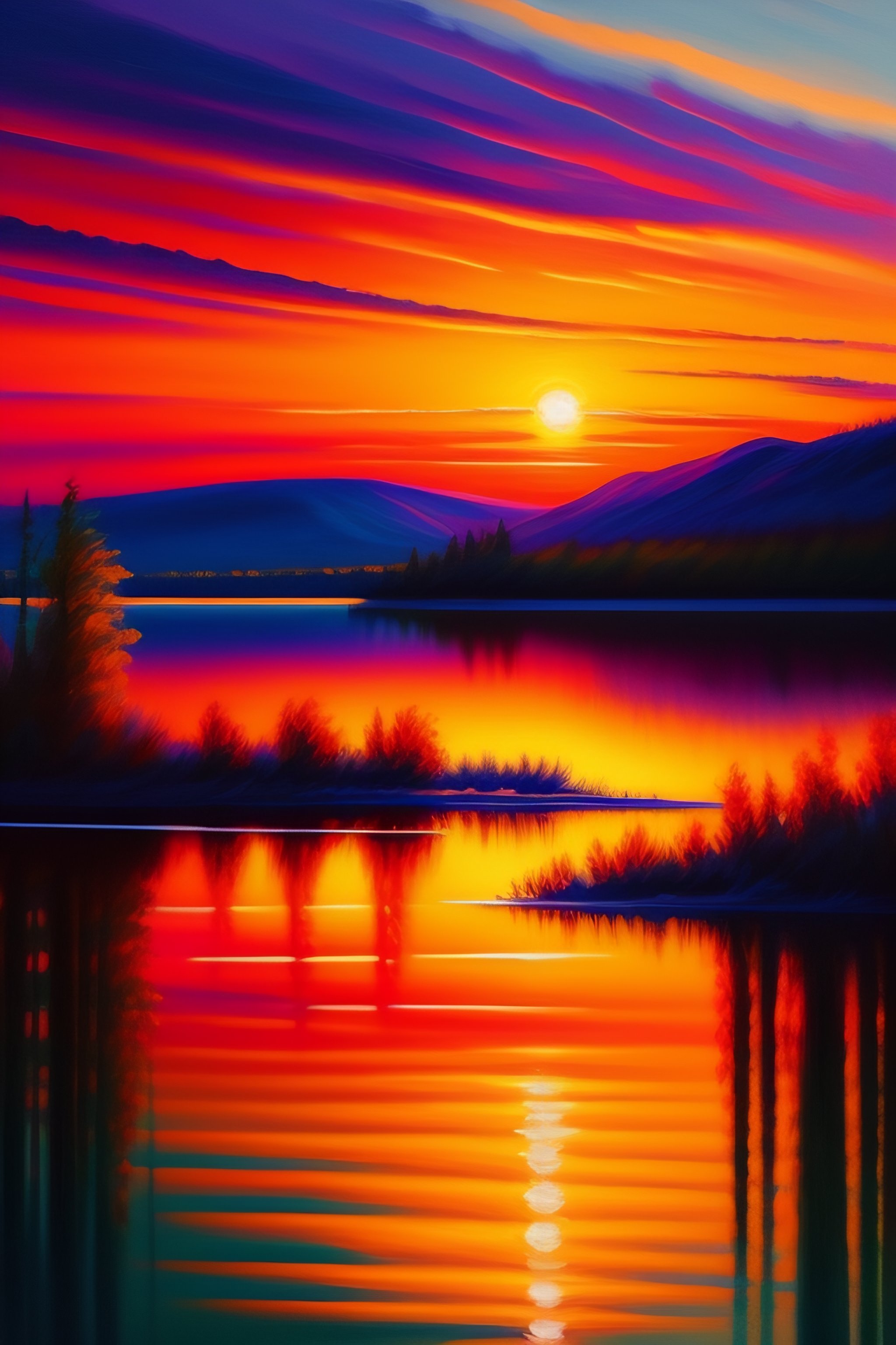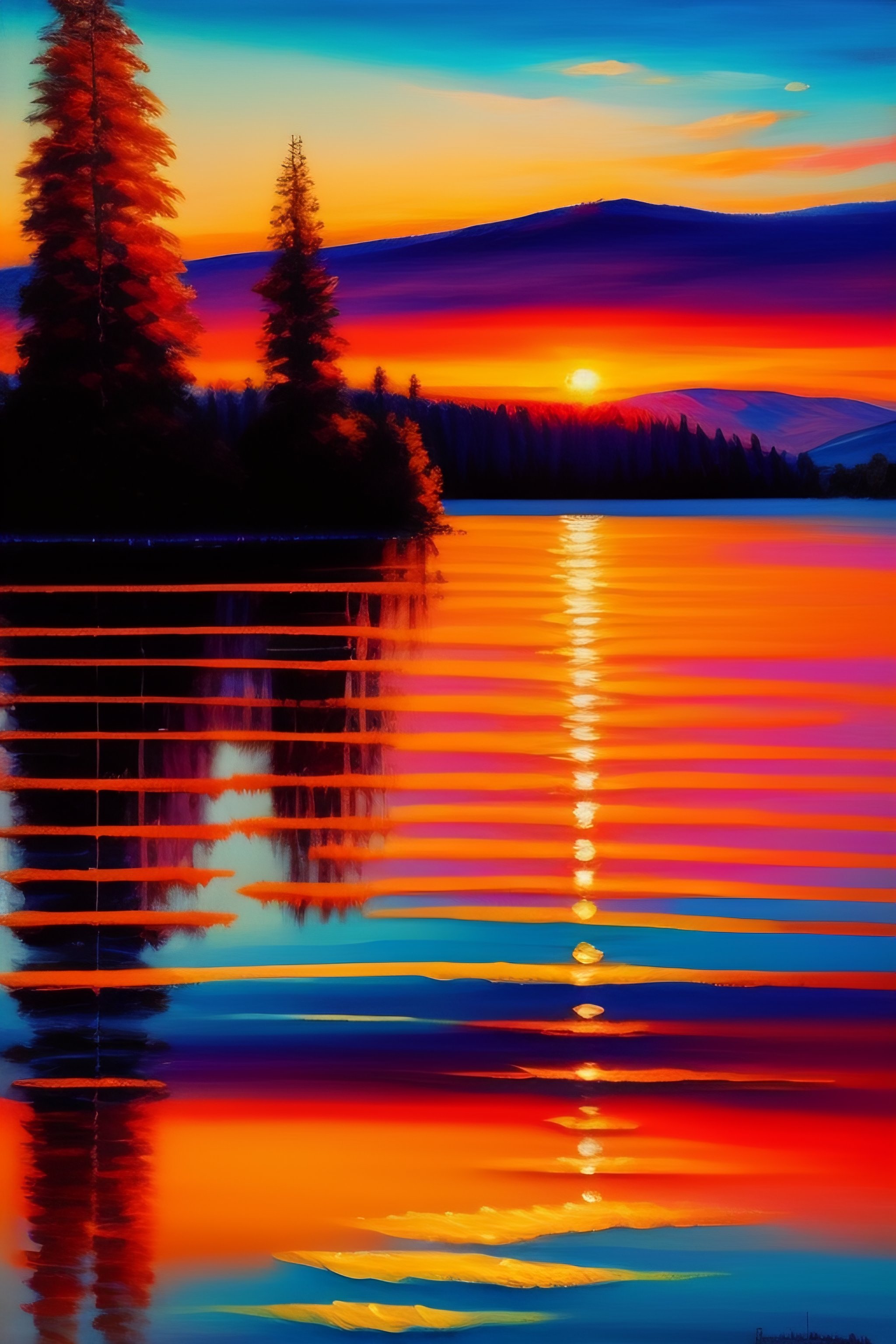 An impressionist painting landscape of a lake with an epic sunset, big brush strokes, epic, cinematic