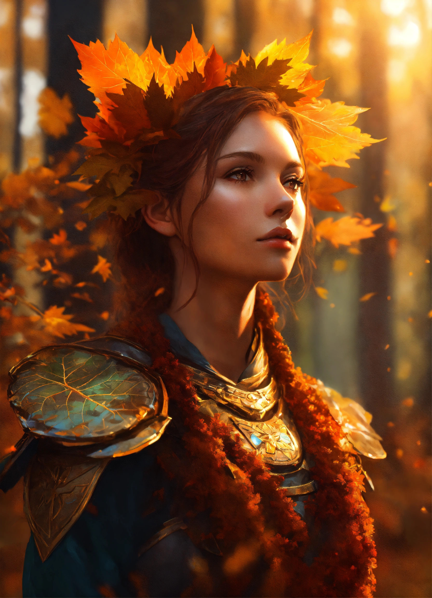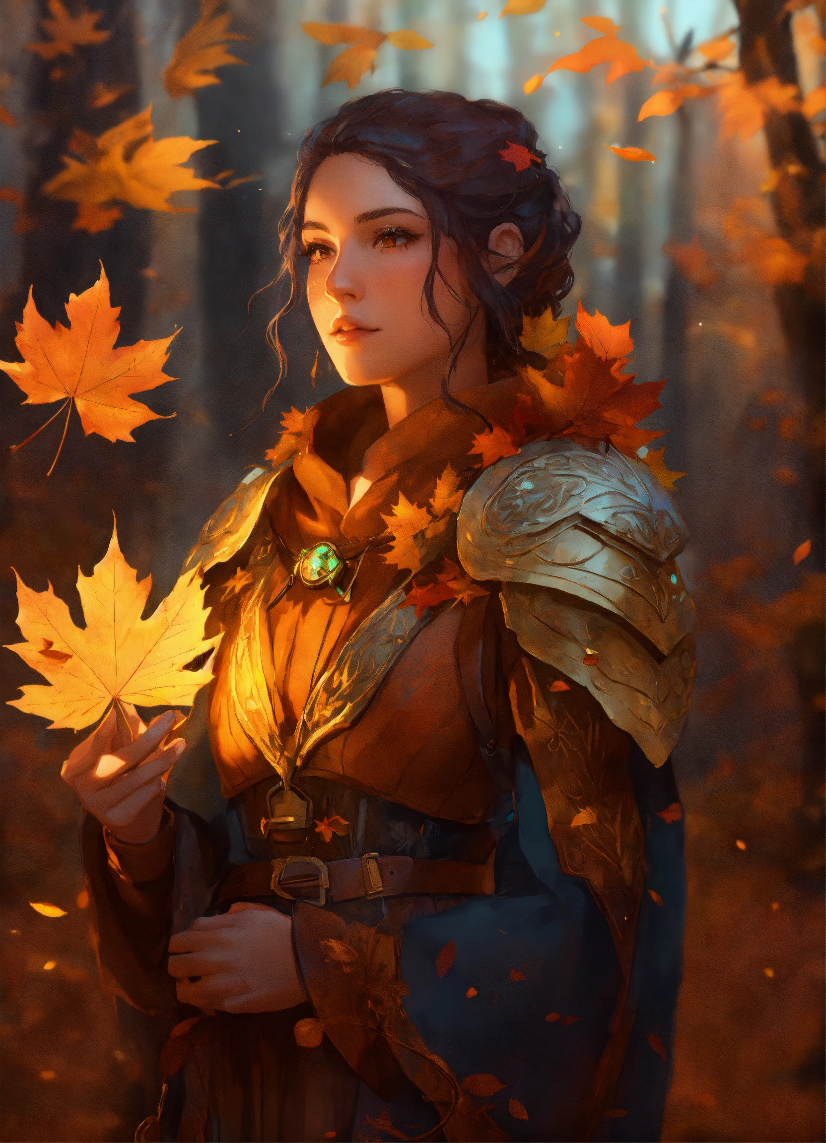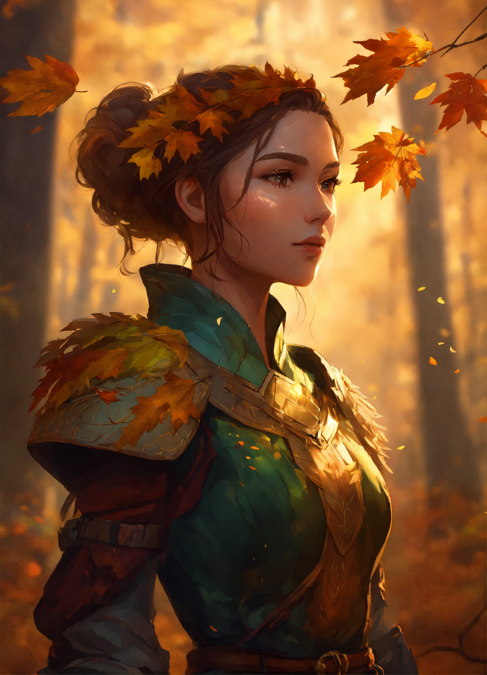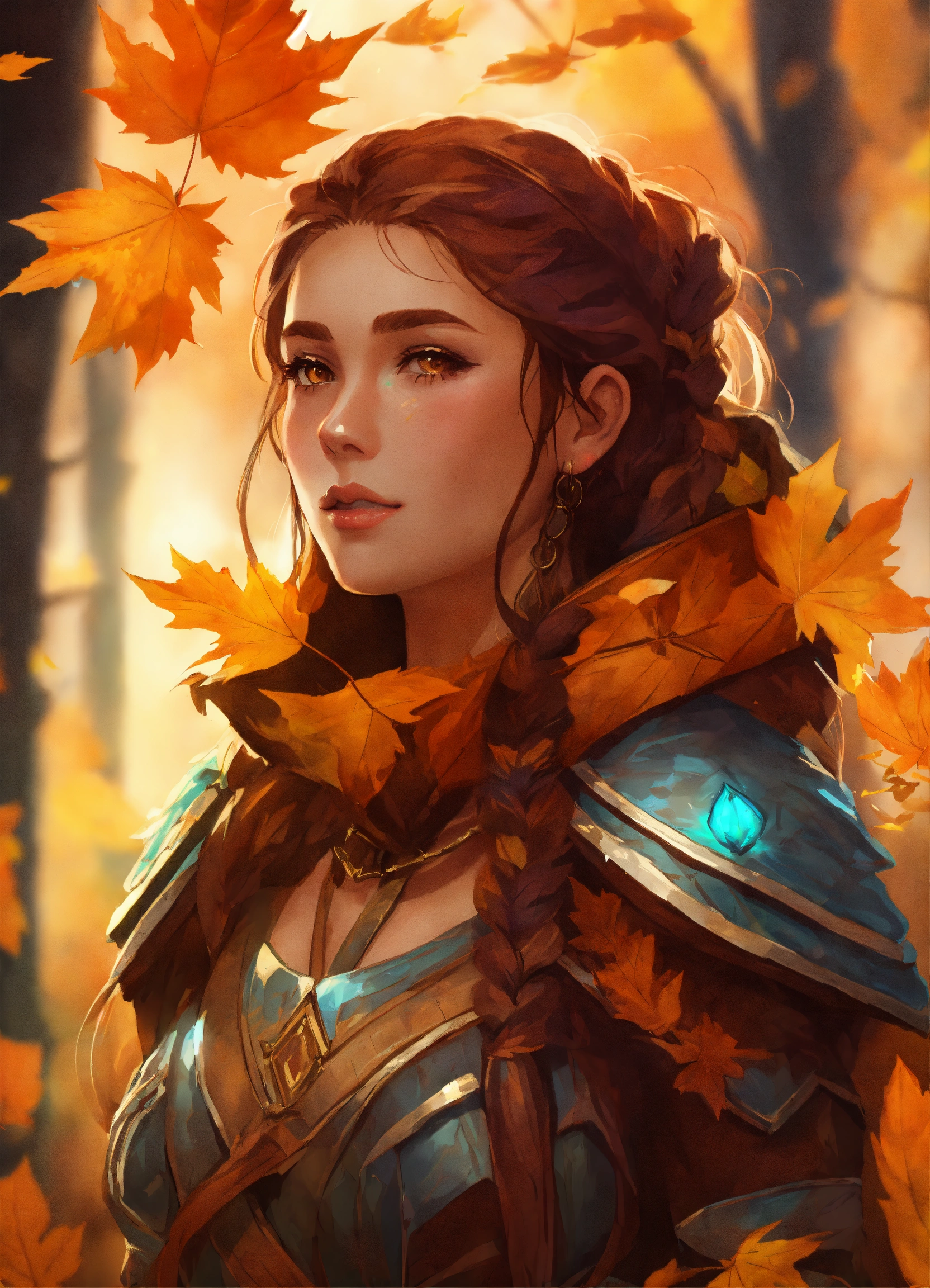 A girl with wooden shoulder pads and magical autumn glowing leaves on her shoulders, druid, concept art style
