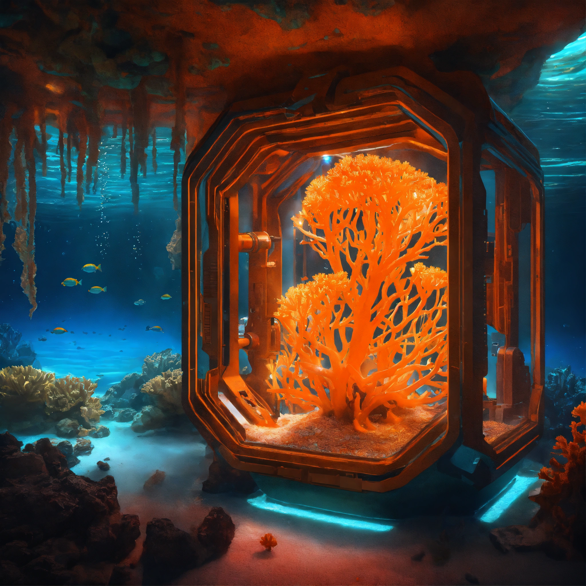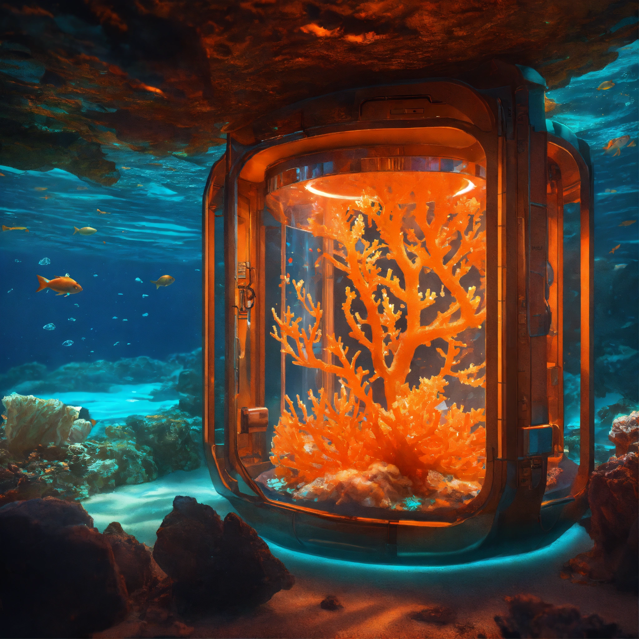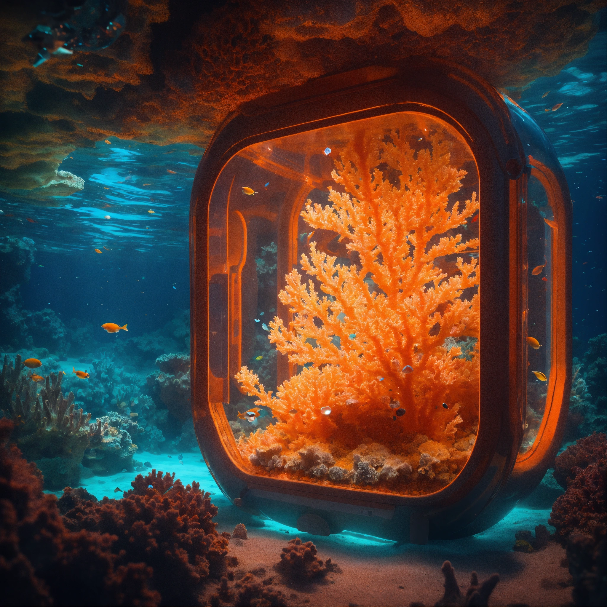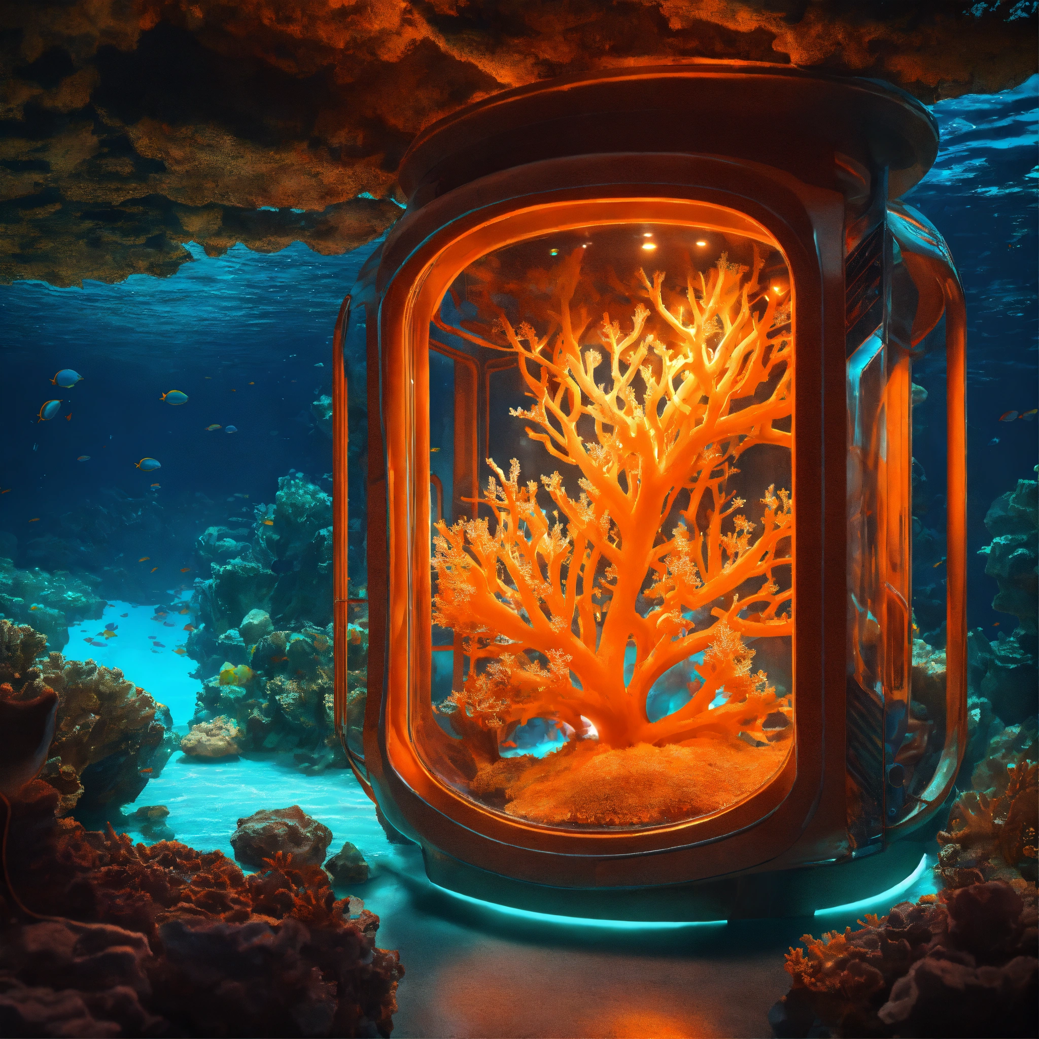 A glowing orange coral inside a sci-fi tube with clear blue ocean water