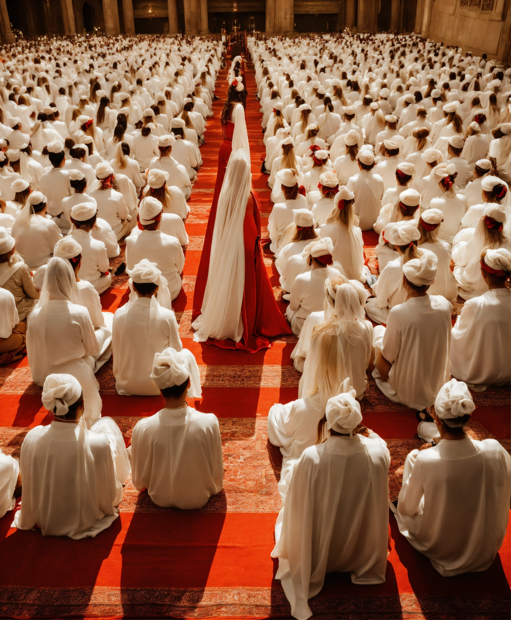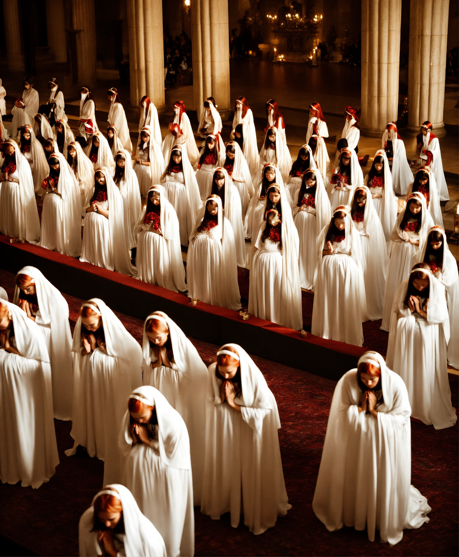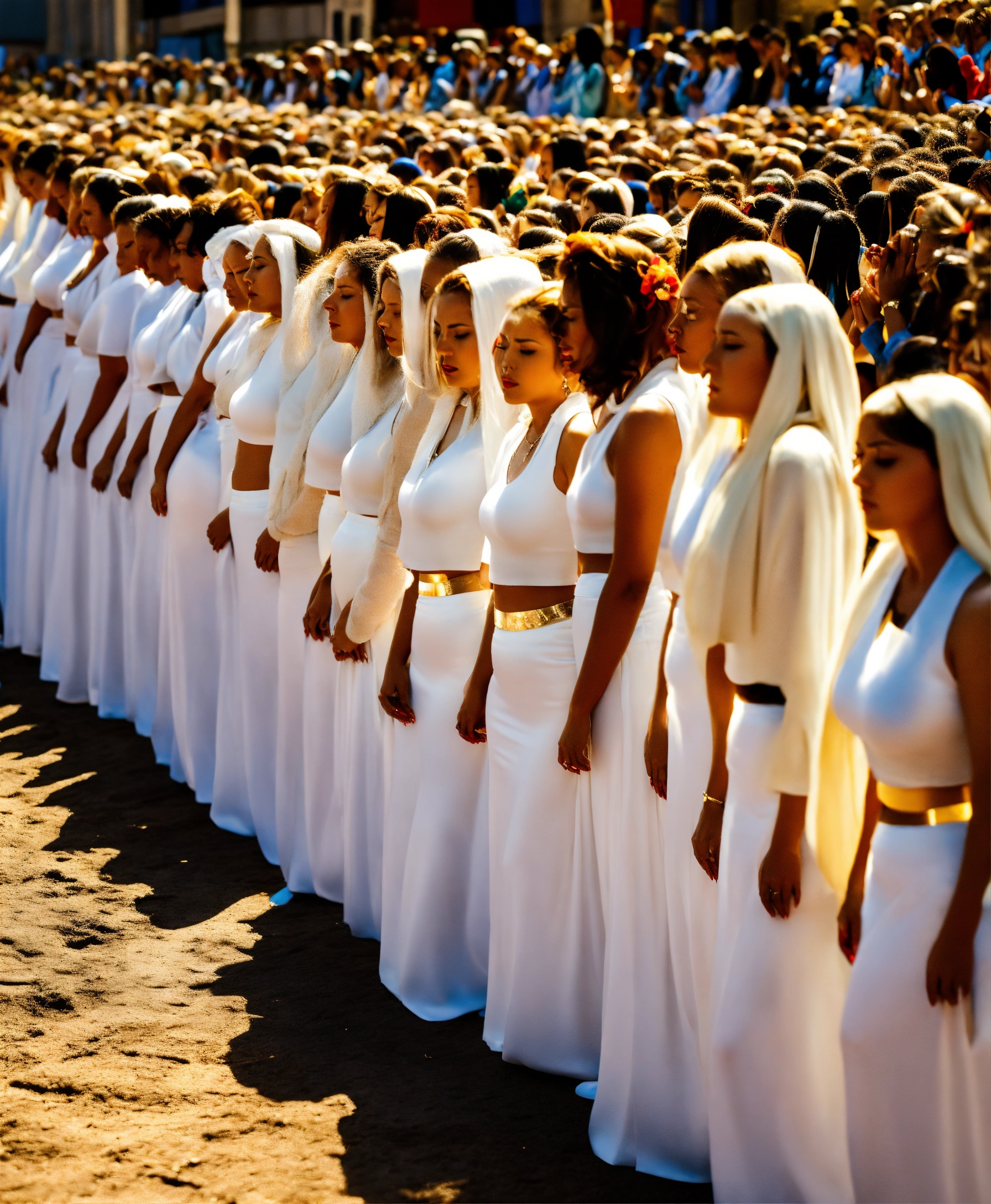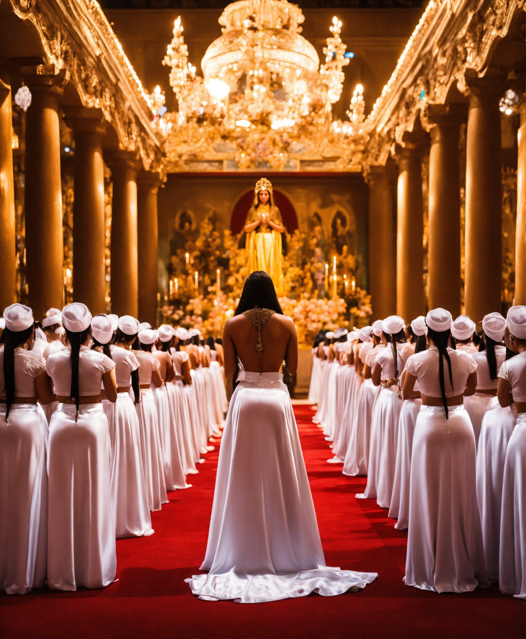 Rows of female worshippers knelt down on the ground praying to a goddess, goddess wearing figure-hugging white acetate satin maxi skirt, extremely tight skirt, louboutin heels
