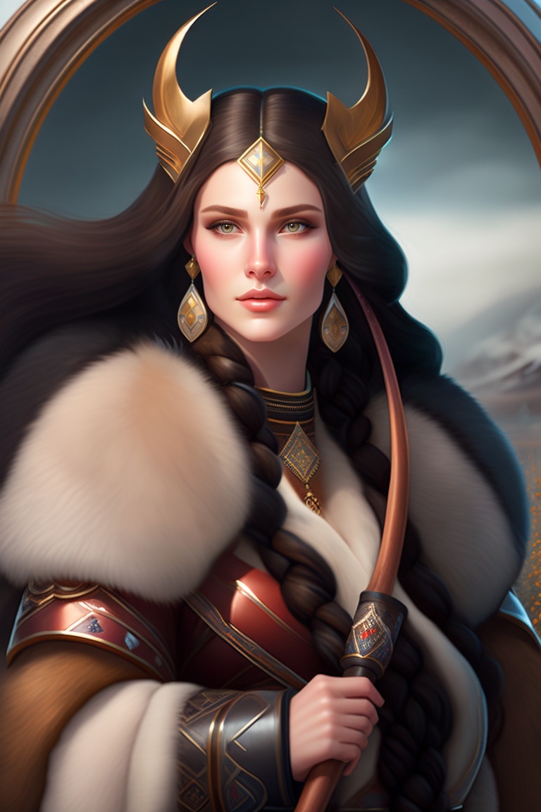 Slavic goddess devana, huntress, holding a stretched bow and arrows, aiming a bow, dressed in a marten fur coat, regal face, close-up, long dark hair