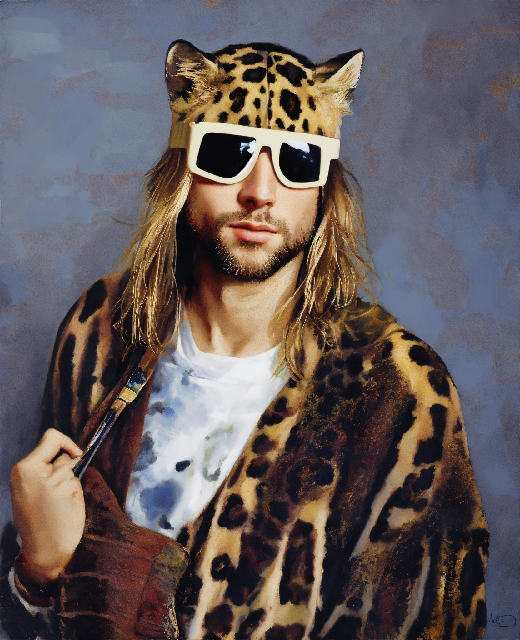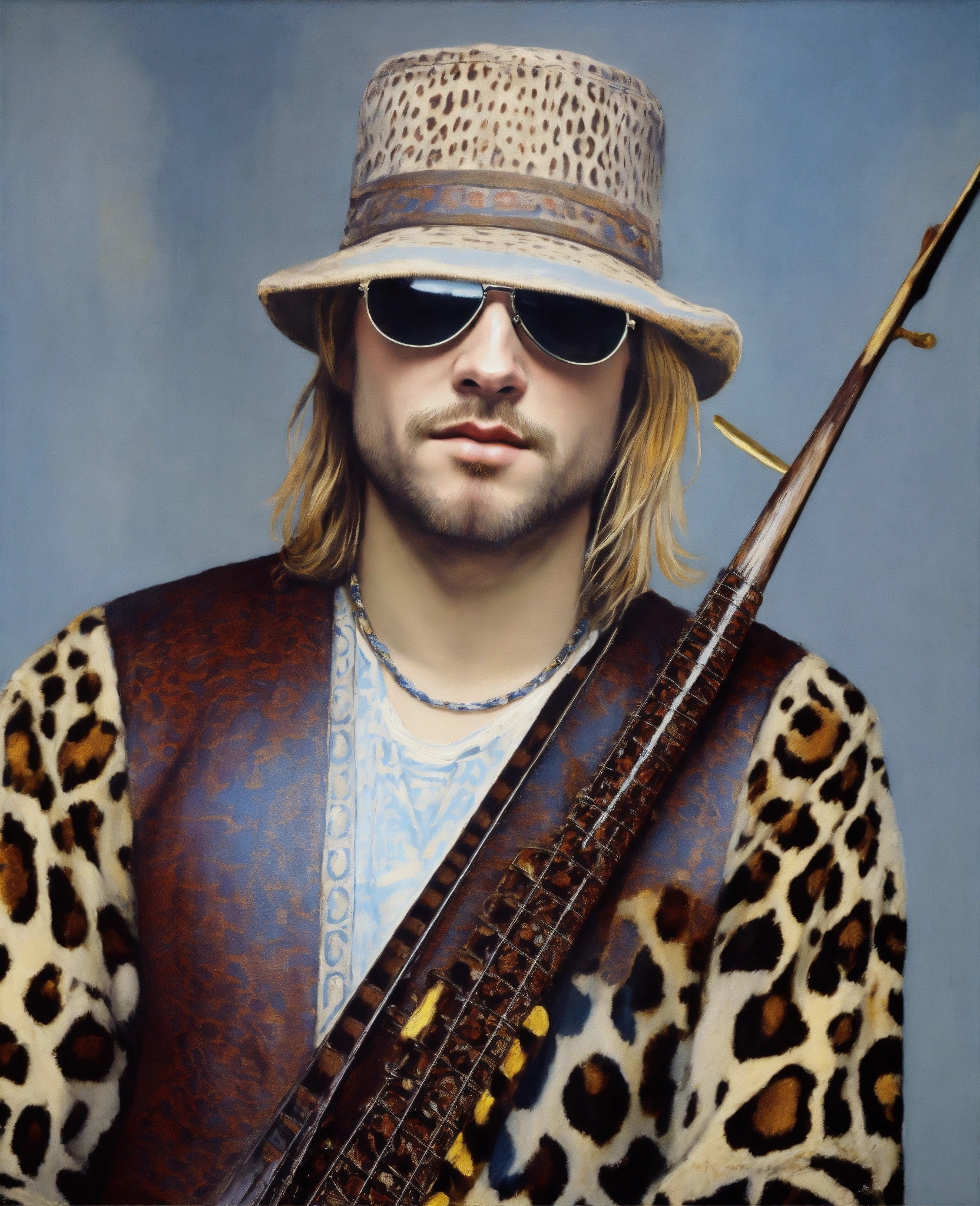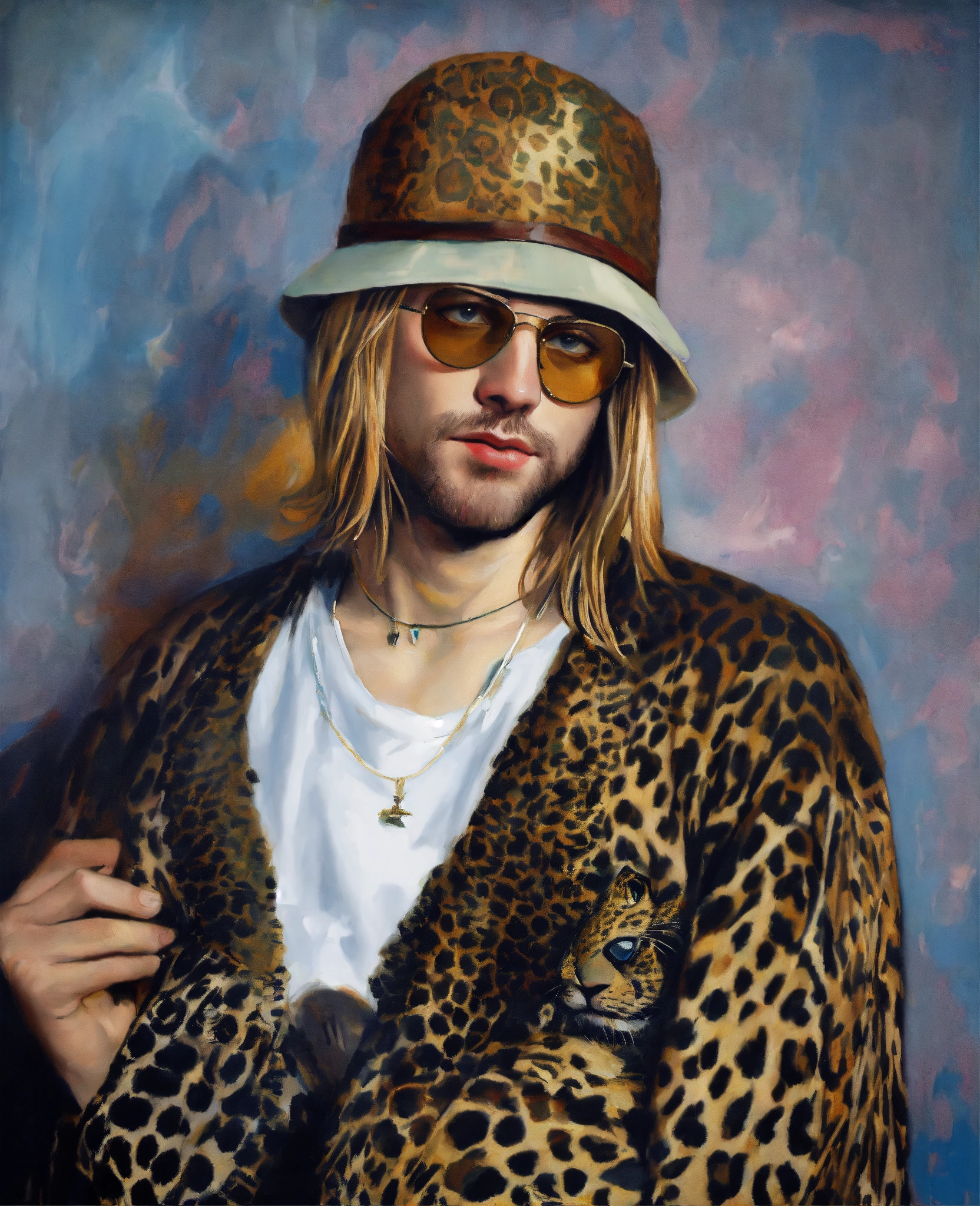 Paint kurt cobain in the painting style of leonardo da vinci. a similar style to the mona lisa. the picture should resemble a renaissance painting. kurt should be wearing a leopard print top, a hat and sunglasses (like picture attached).