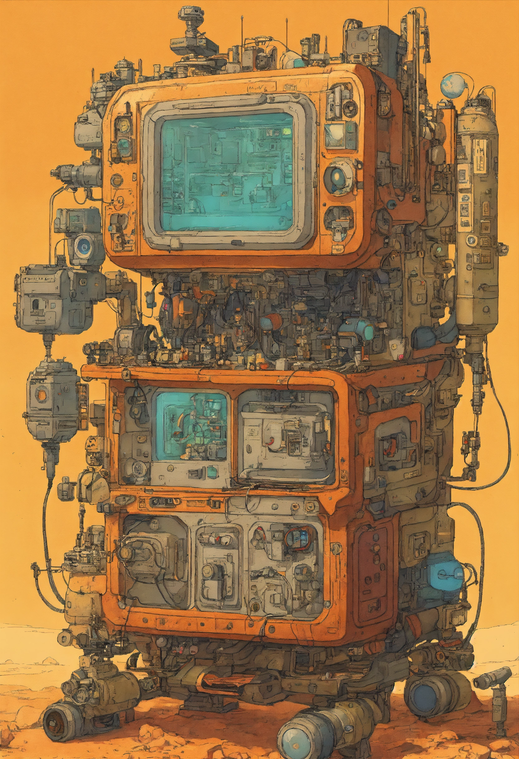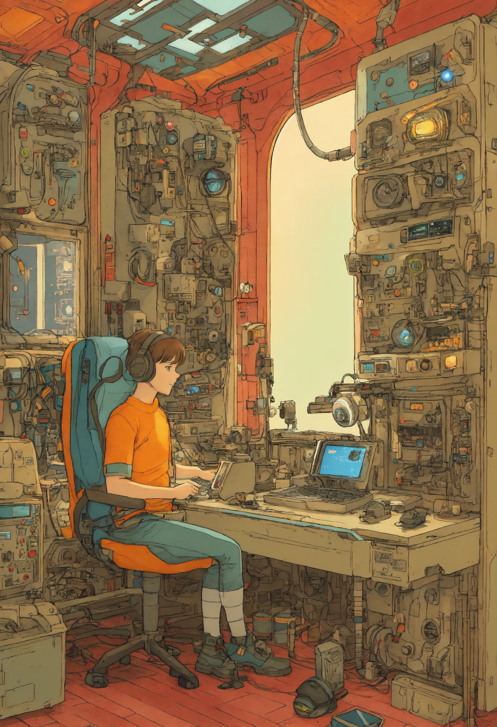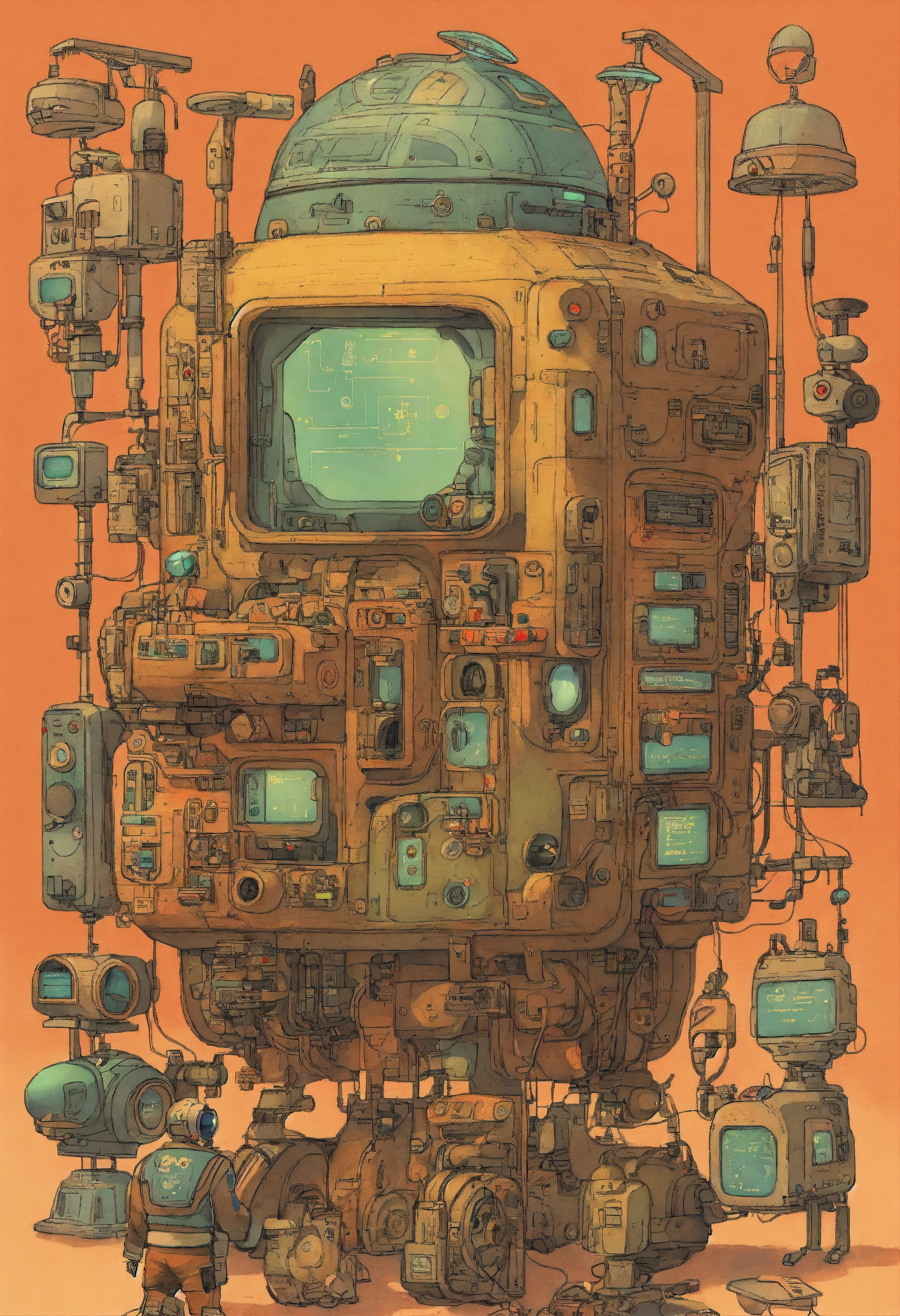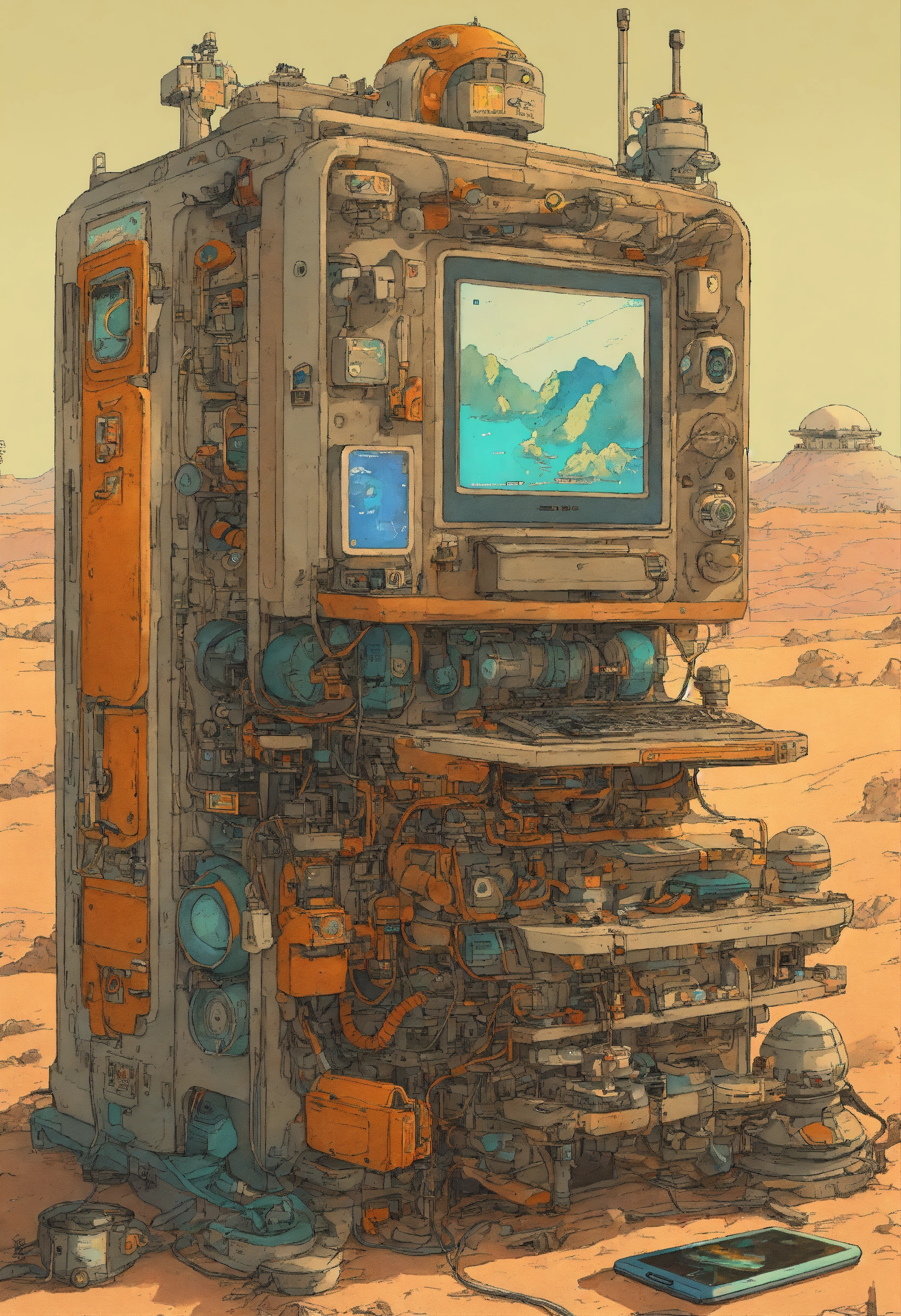 Illustrations of futuristic devices and gadgets that will change the way we interact with technology, the sci-fi ambiance should be filled with a colorful spectrum that creates an otherworldly feeling, the art style should be inspired by mattias adolfsson's work