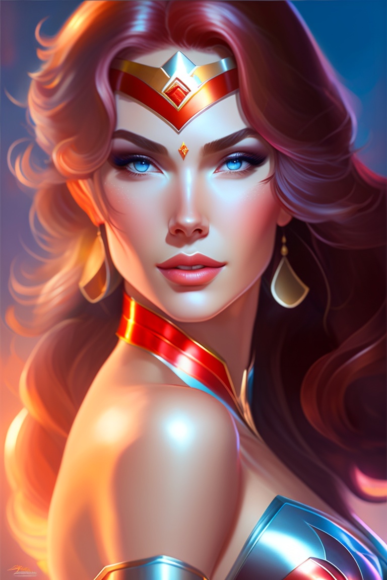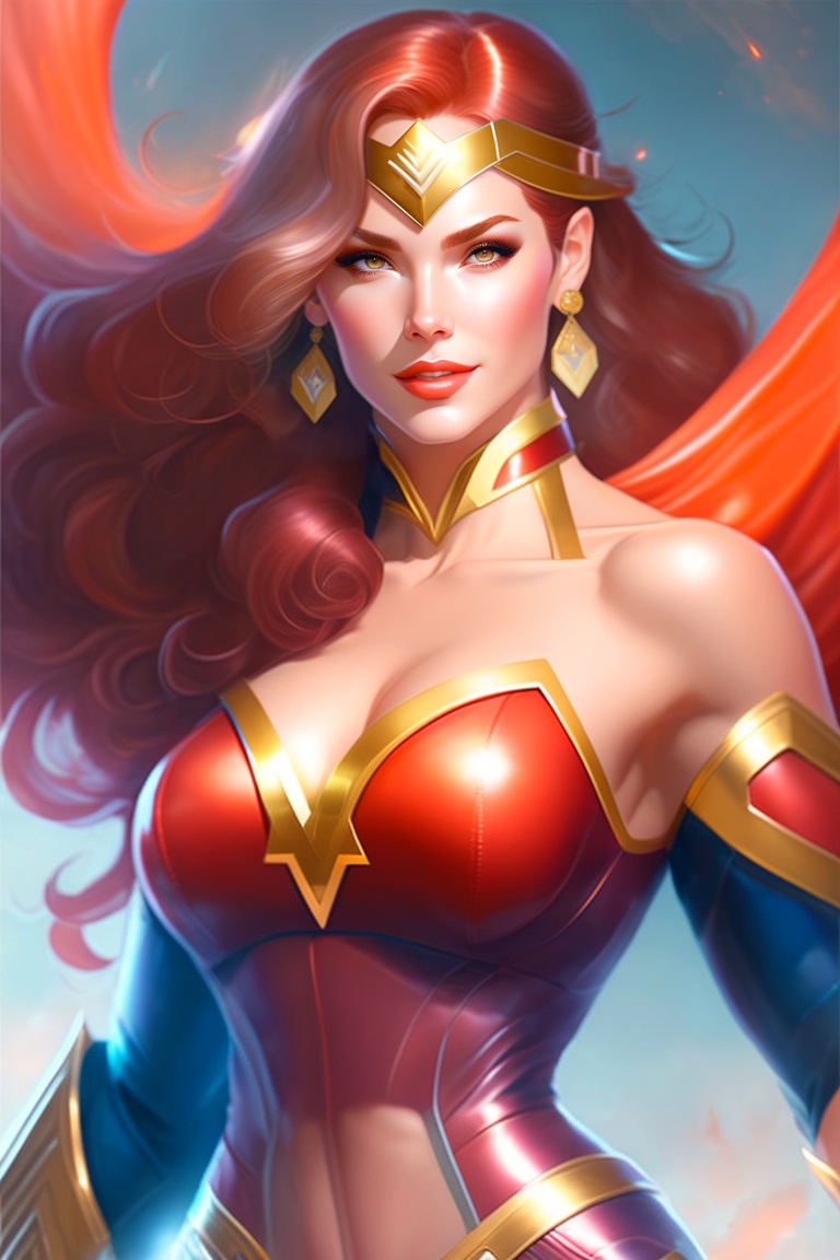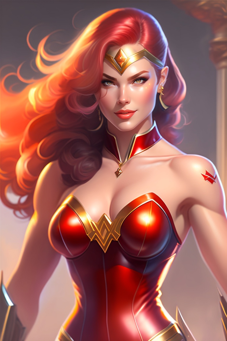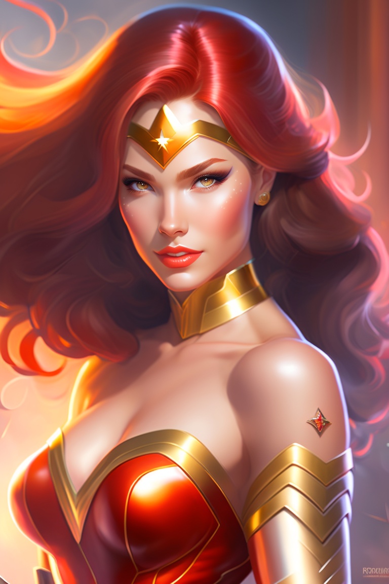 Female wonder woman, full curvy body, shimmering skin, without armor, red hair, doe eyes, fire in the background, elegant and highly detailed digital artwork by stanley artgerm lau, rossdraws, james jean, marc simonetti.