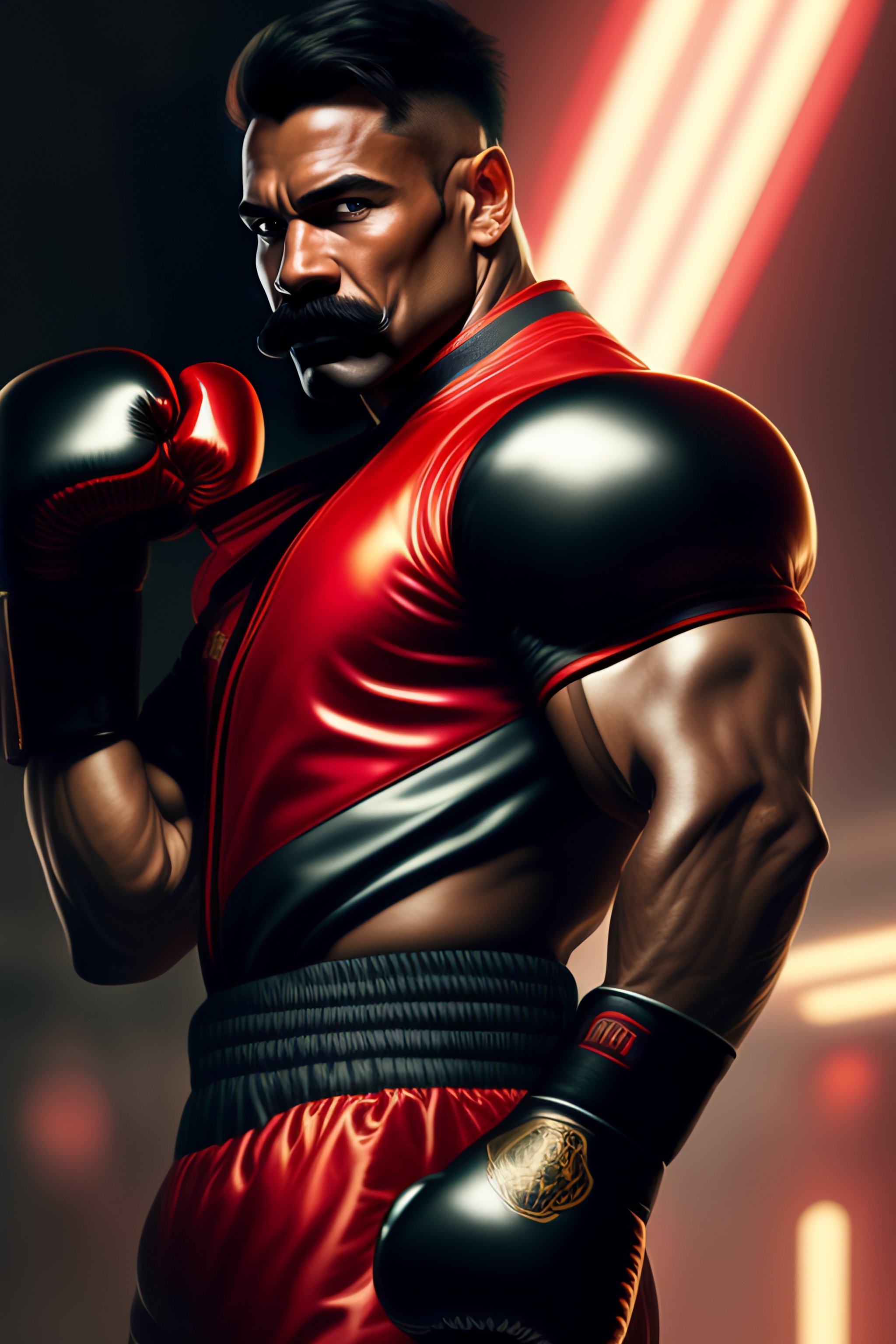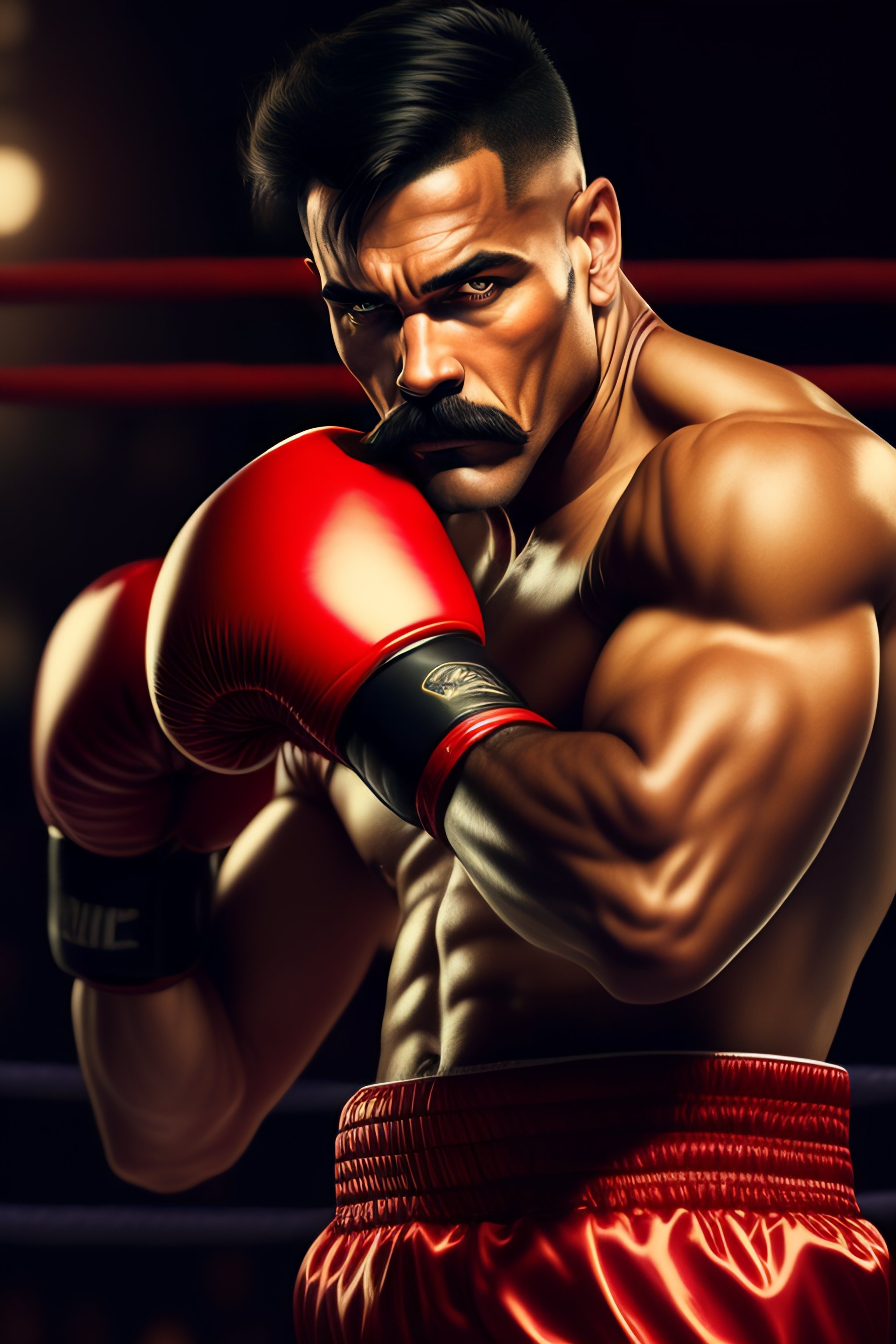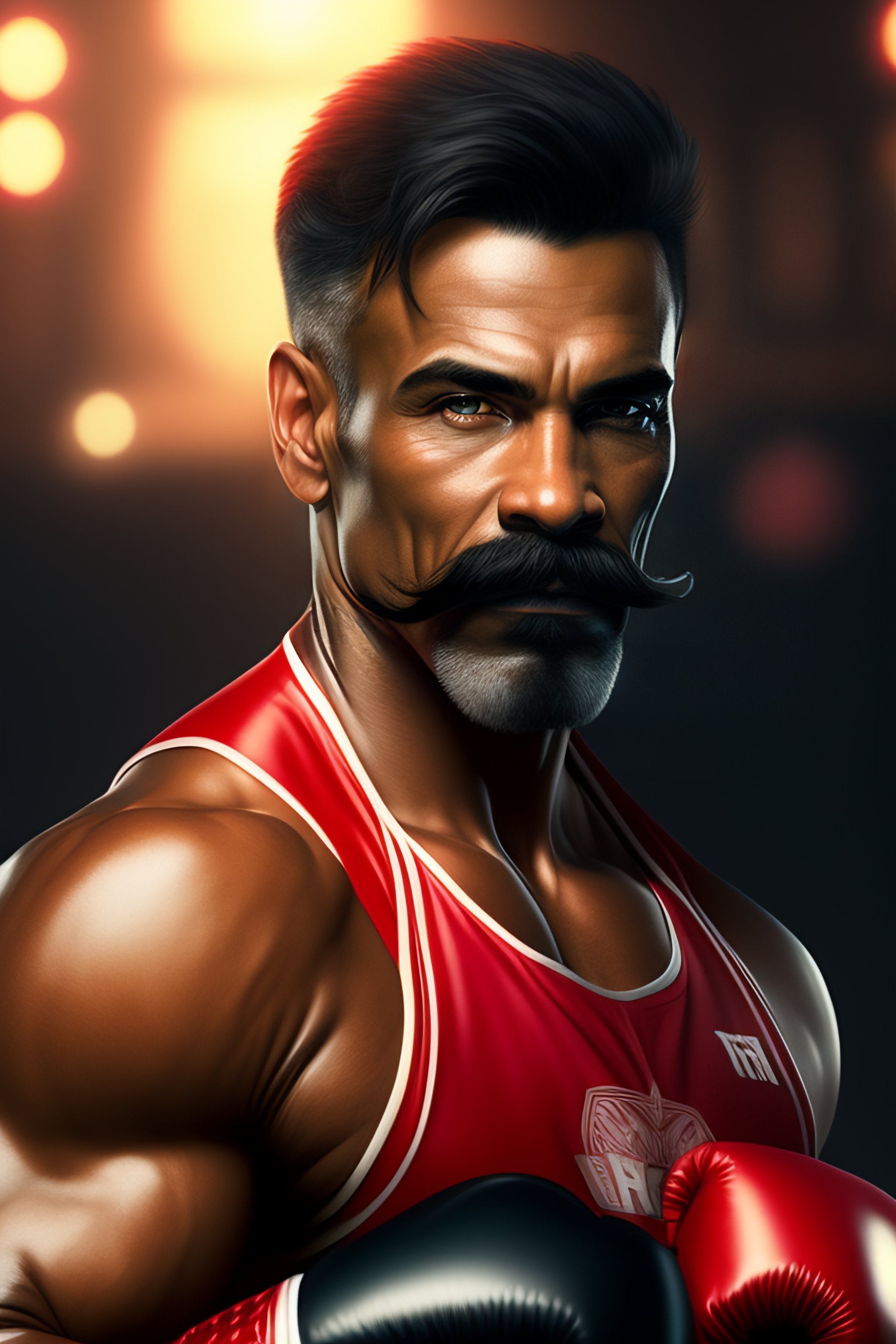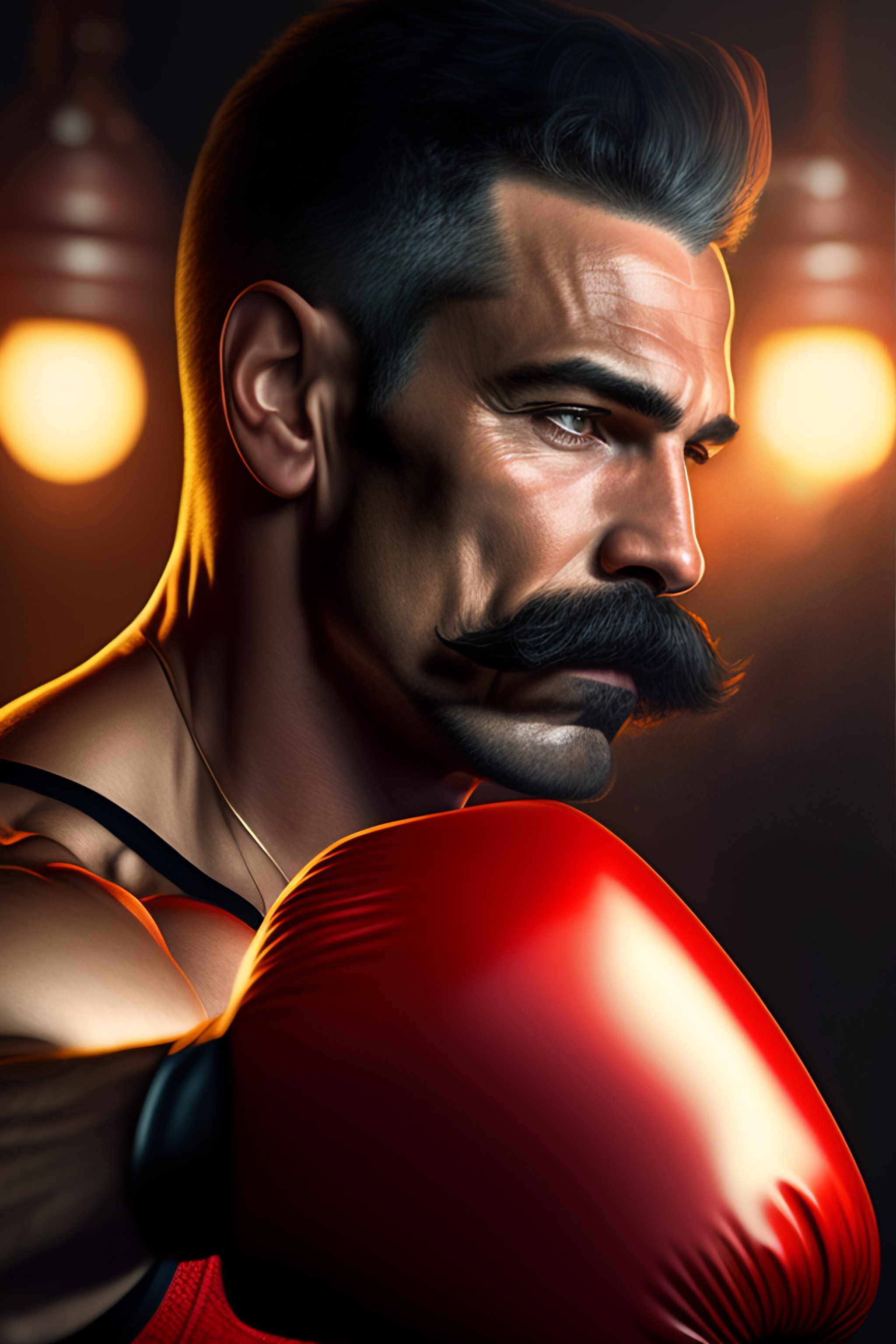 Middle-age man with mustache in a boxing pose, wearing a red vest and technological boxing gloves, black and gray pushed back haircut, detailed face, fantasy, highly detailed, cinematic lighting, digital art painting by greg rutkowski and alphonse mucha, darkest forest background