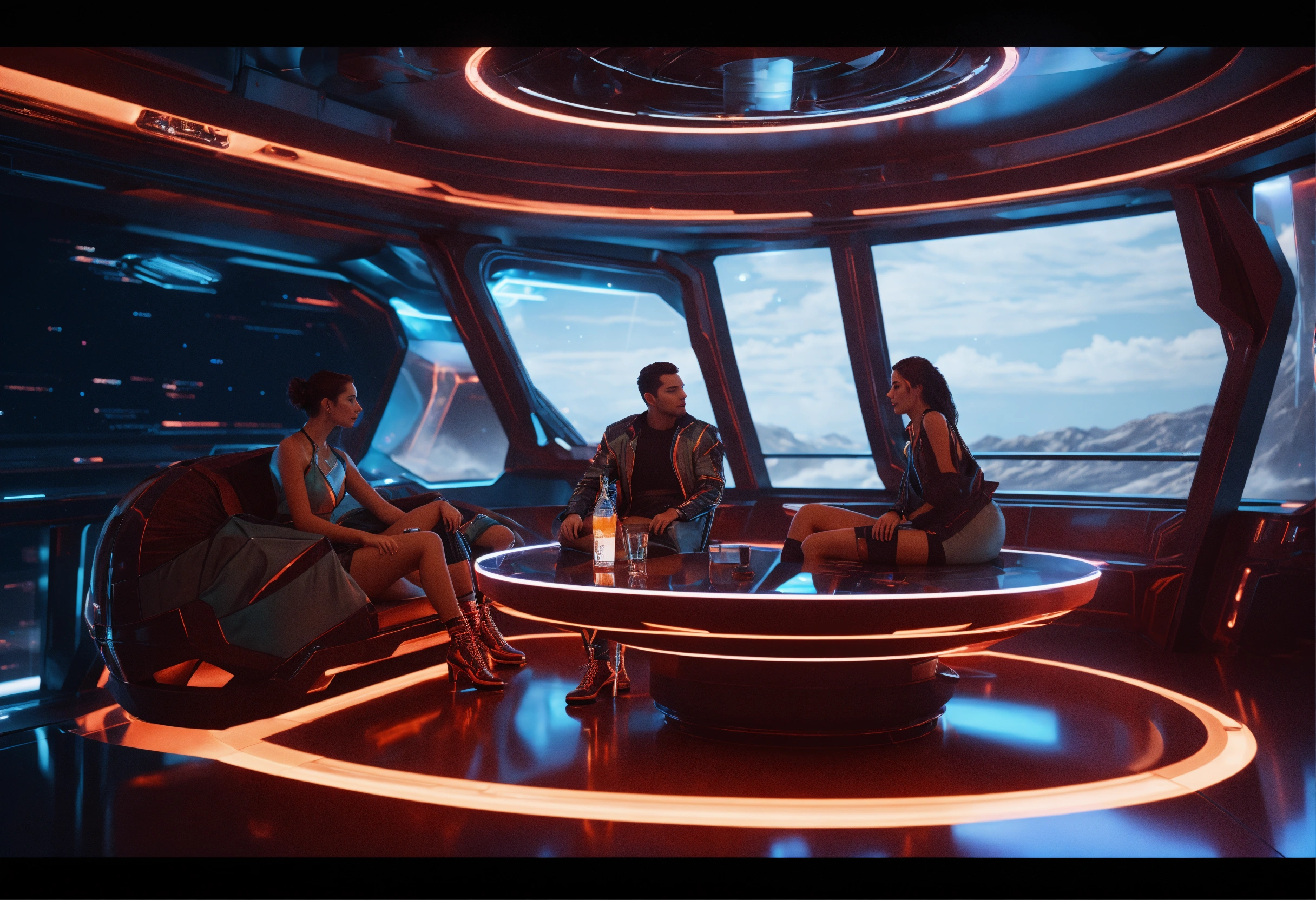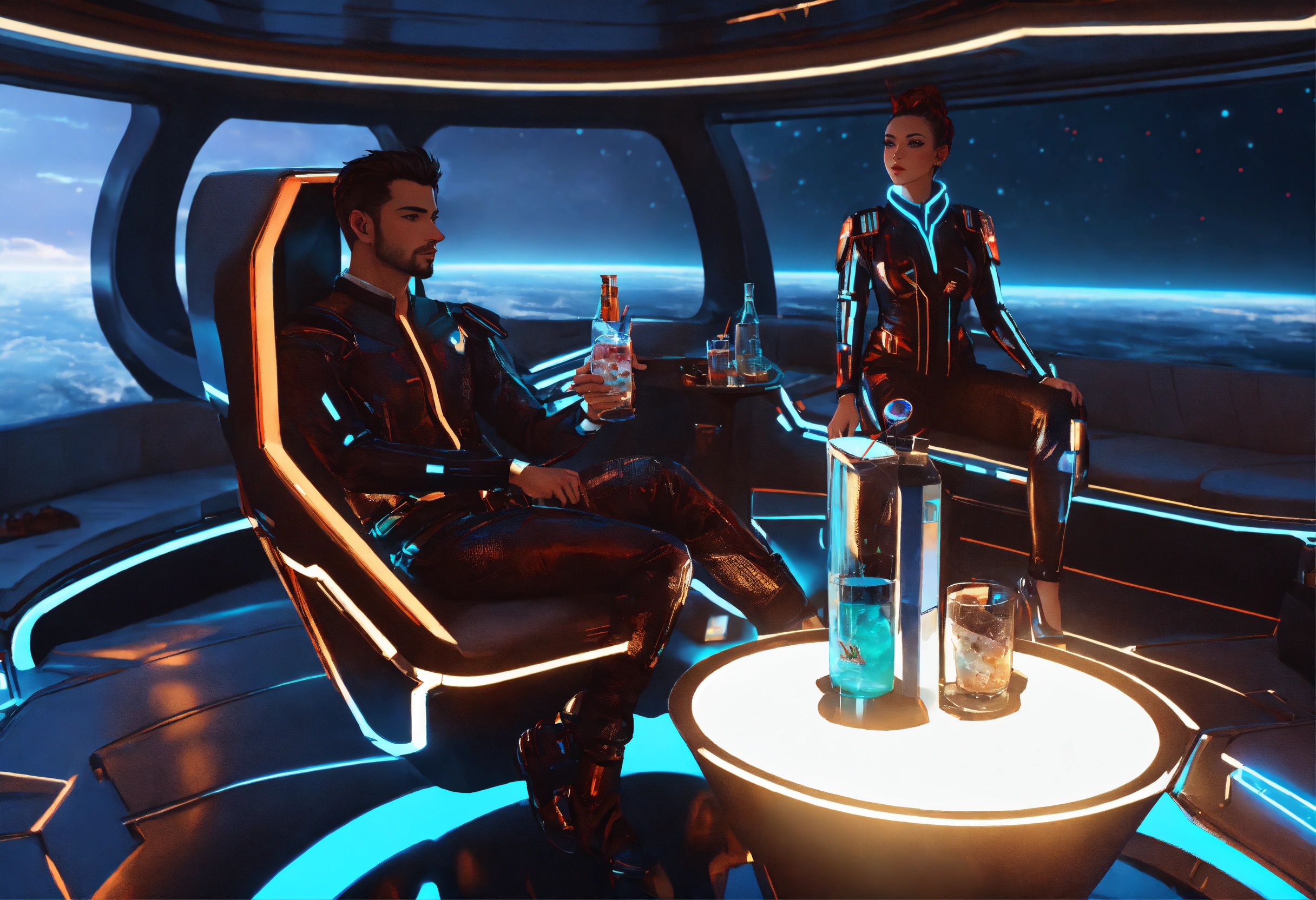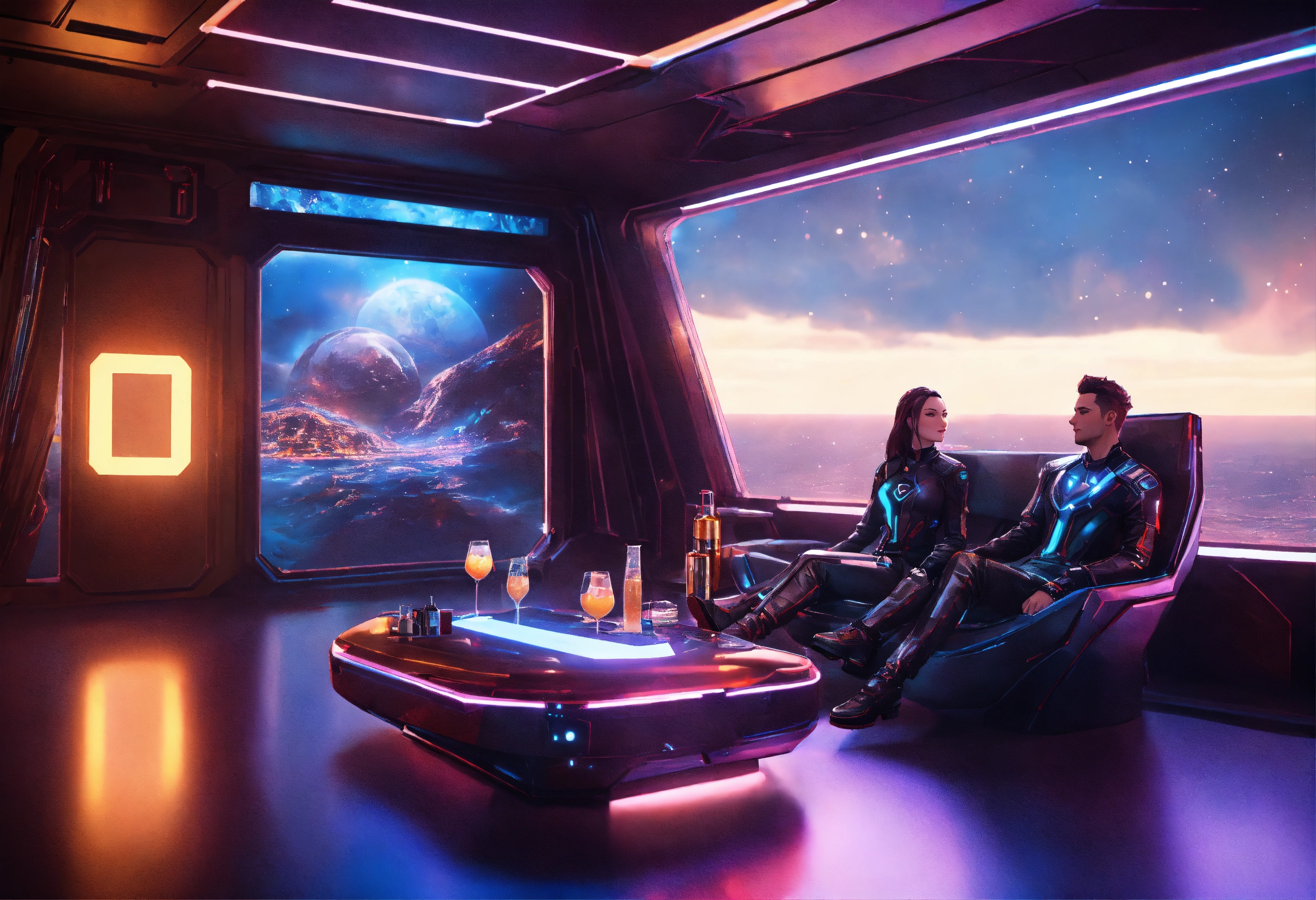 Zoom out full couple lounging with a drinks in futuristic clothing on a hi tech space yacht, nebula in windows, realistic, futuristic, sci-fi, 8k, tron, unreal engine