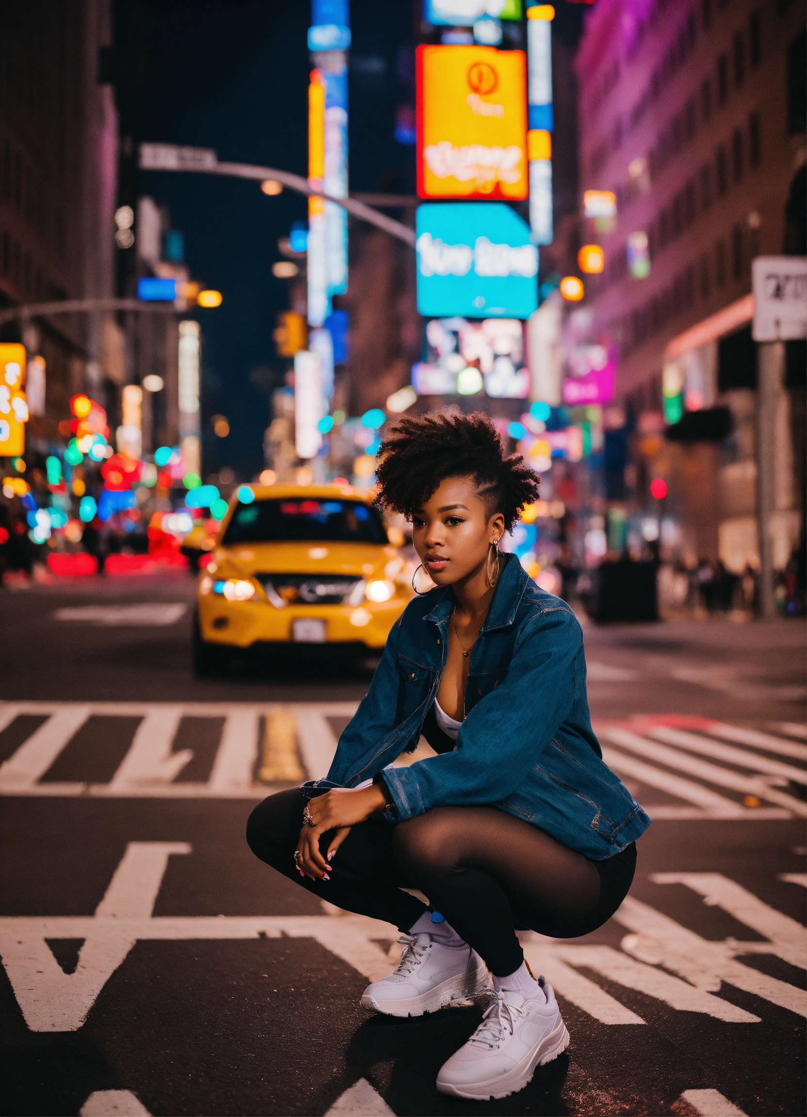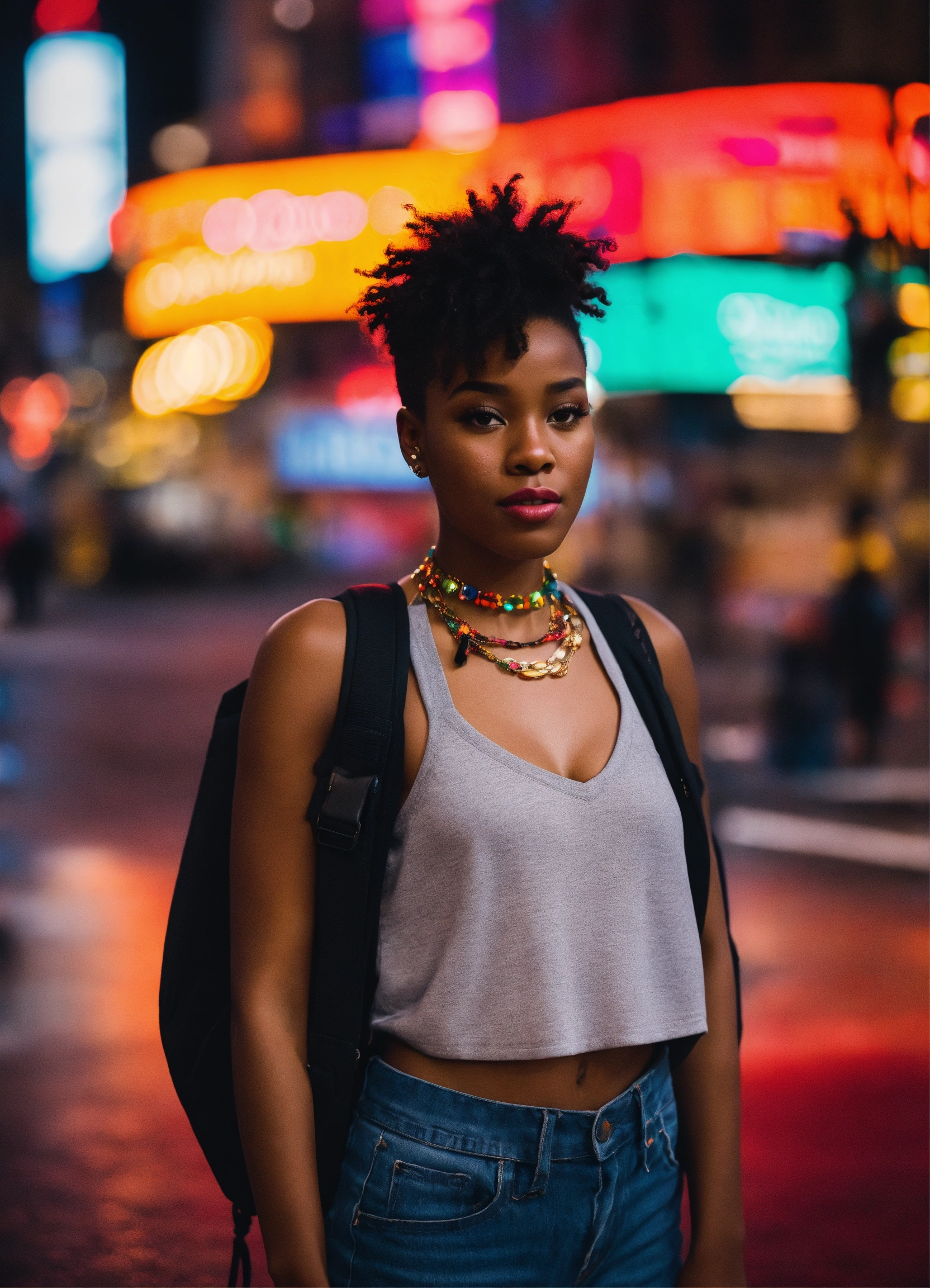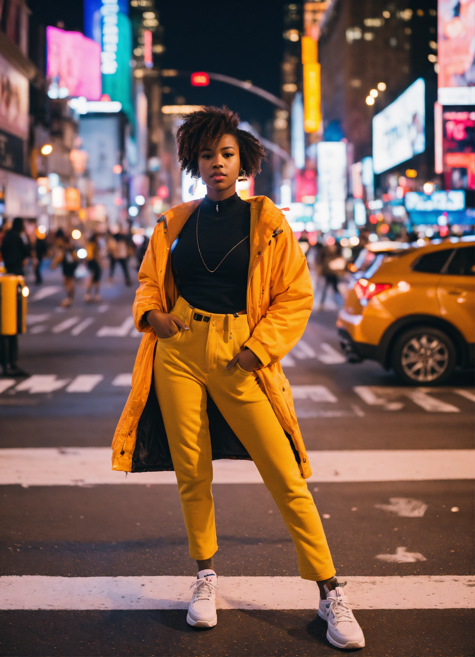 Photograph of a spring streetwear clothing of a black girl with short hair striking a pose in the middle of a bustling intersection in new york city, with the energy and movement of the city captured in the background, shot at night, with the vibrant lights of the city creating a colorful and dynamic atmosphere, using a nikon z7 ii and a 24-70mm f/2.8 lens