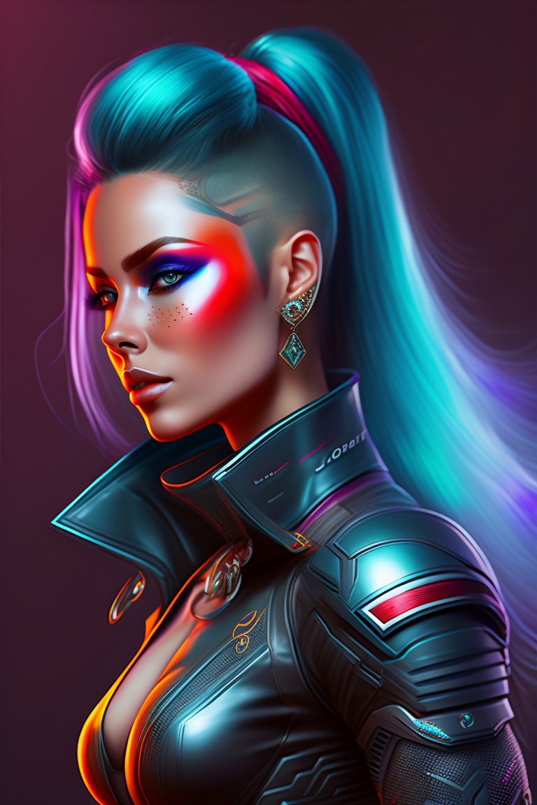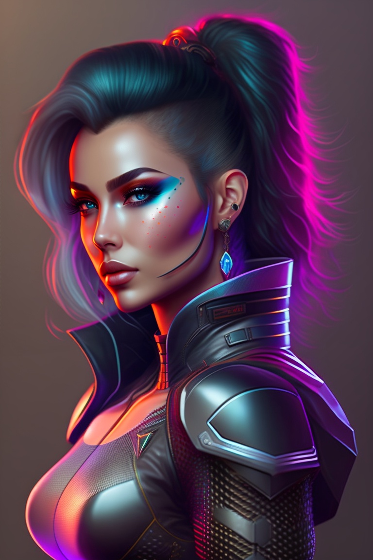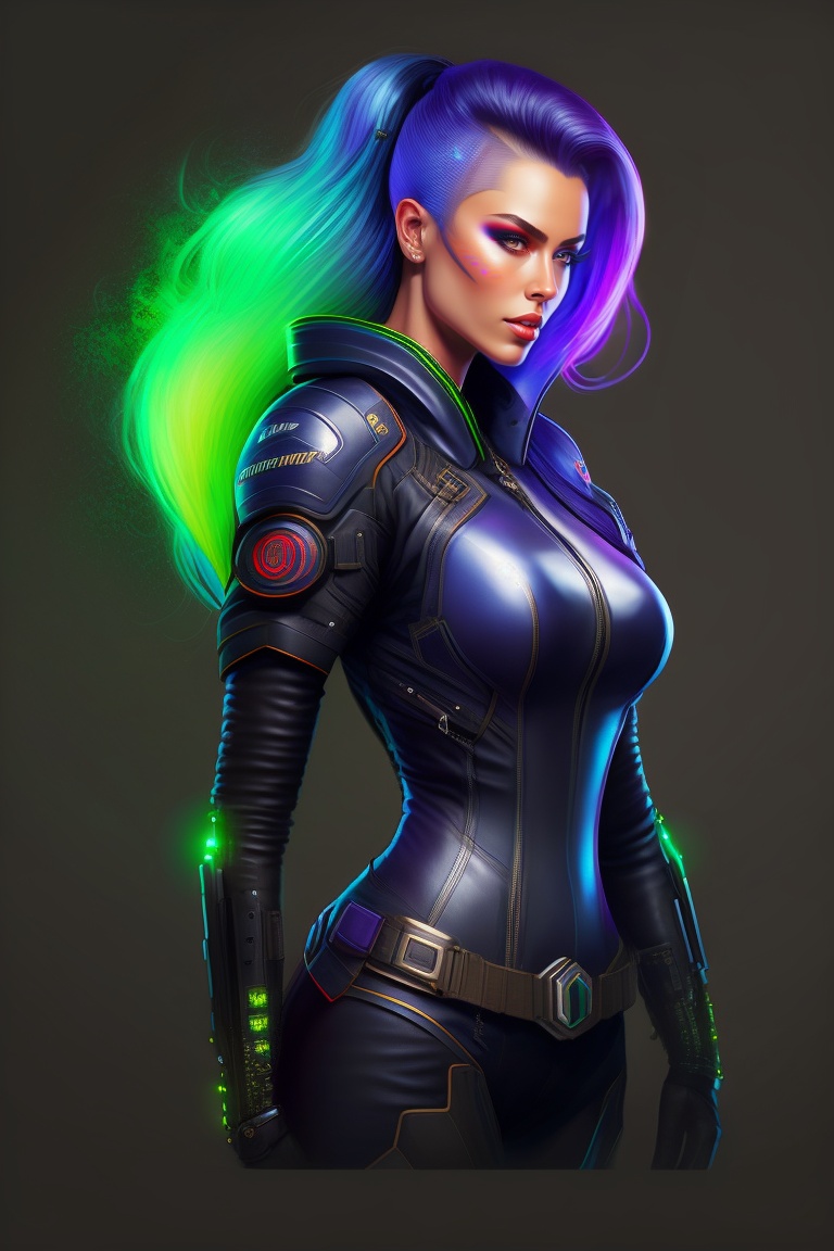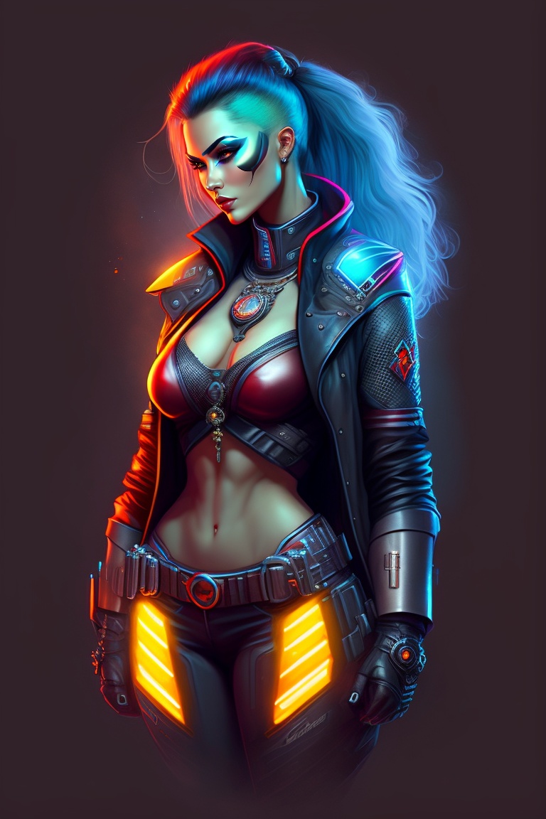 A beautiful female cyberpunk, strong body, very detailed designed for t-shirt and inscription: don't look any further