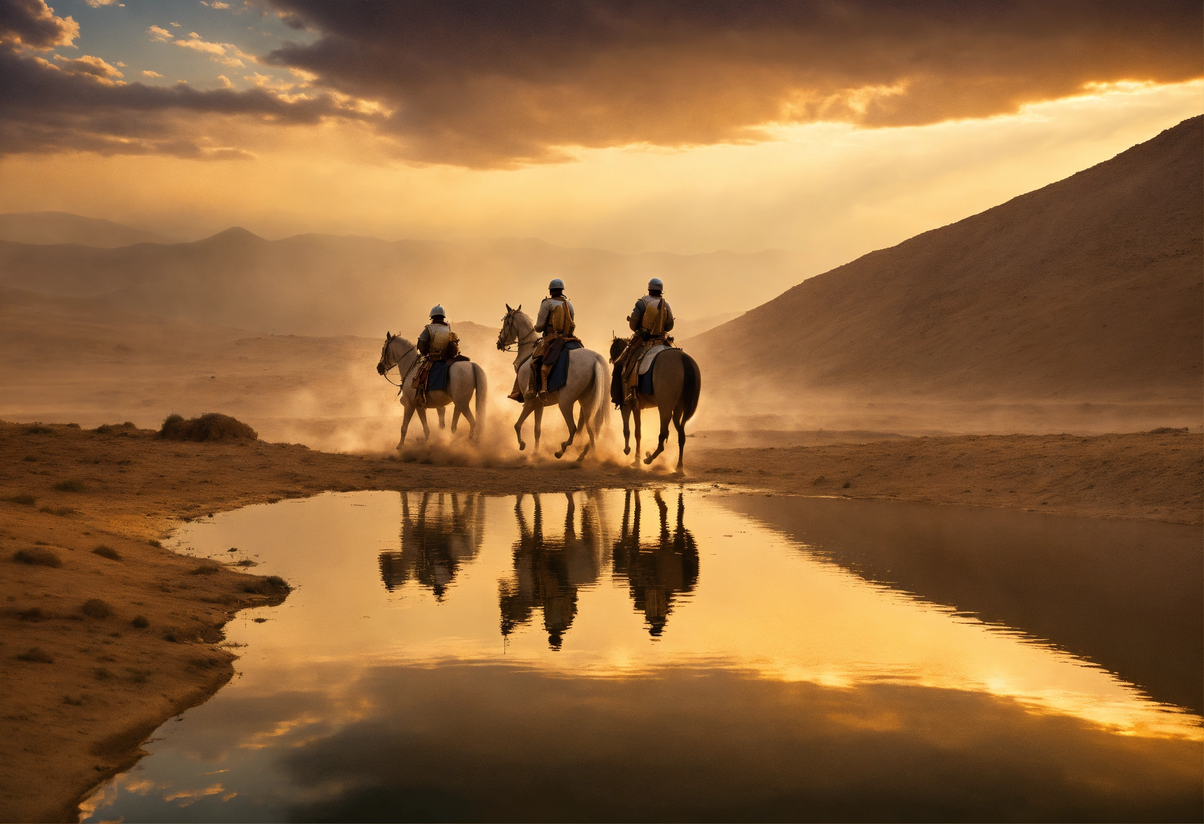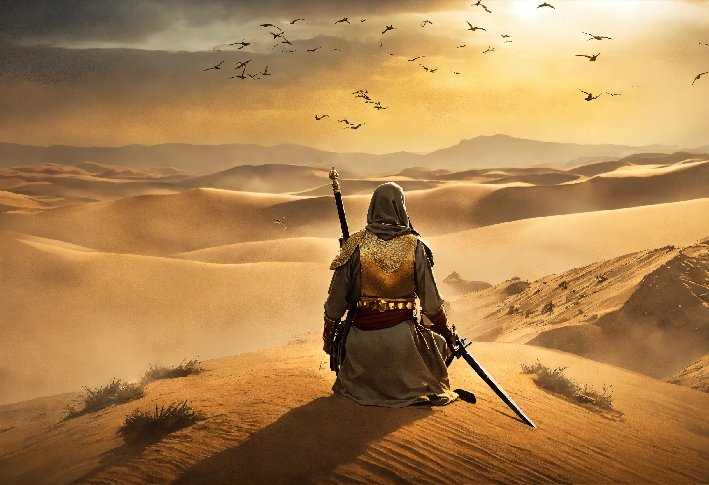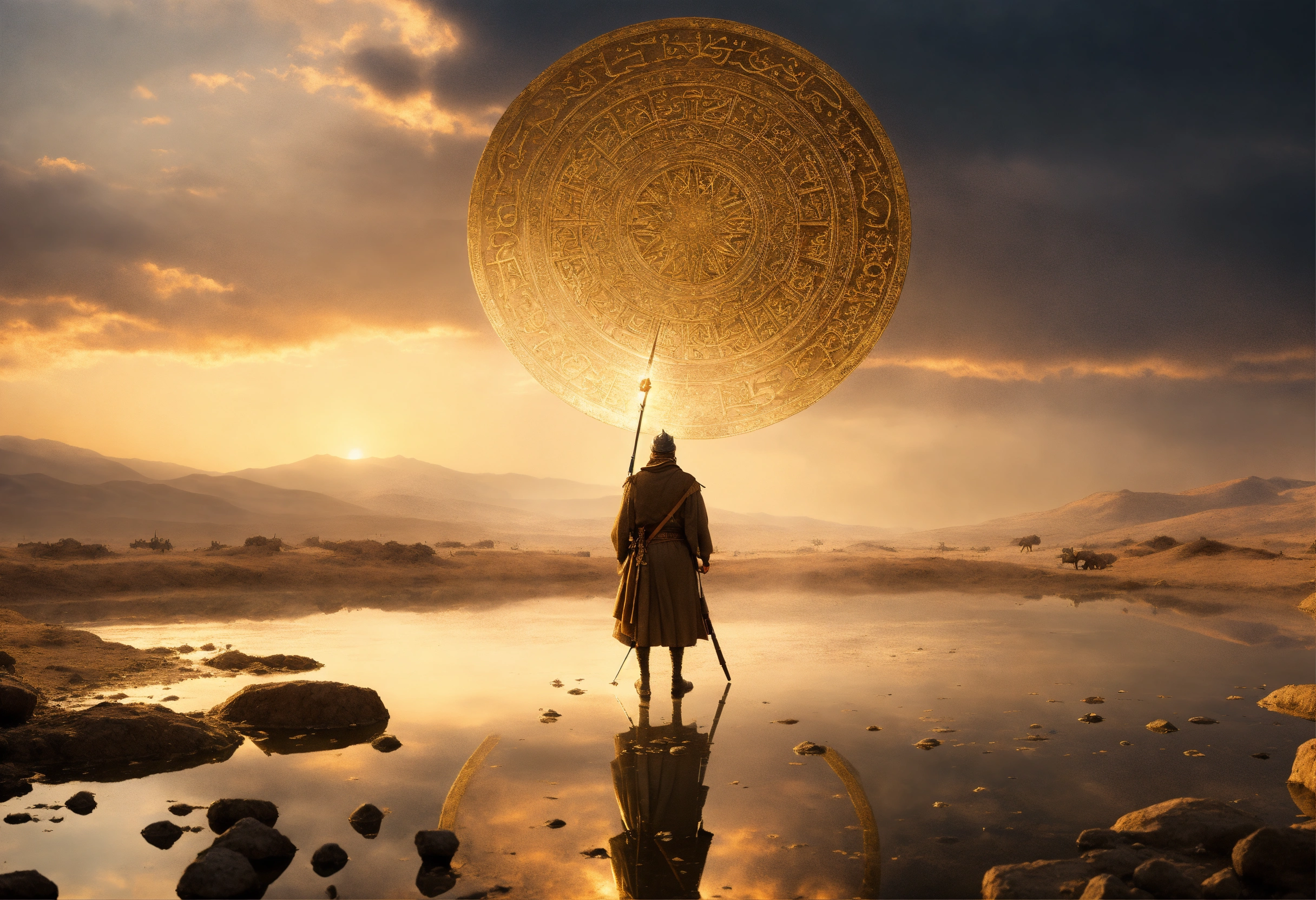 Show an image that represents reflection and contemplation on the significance of the battle of badr. include elements that symbolize courage, trust in god, and the historical legacy.