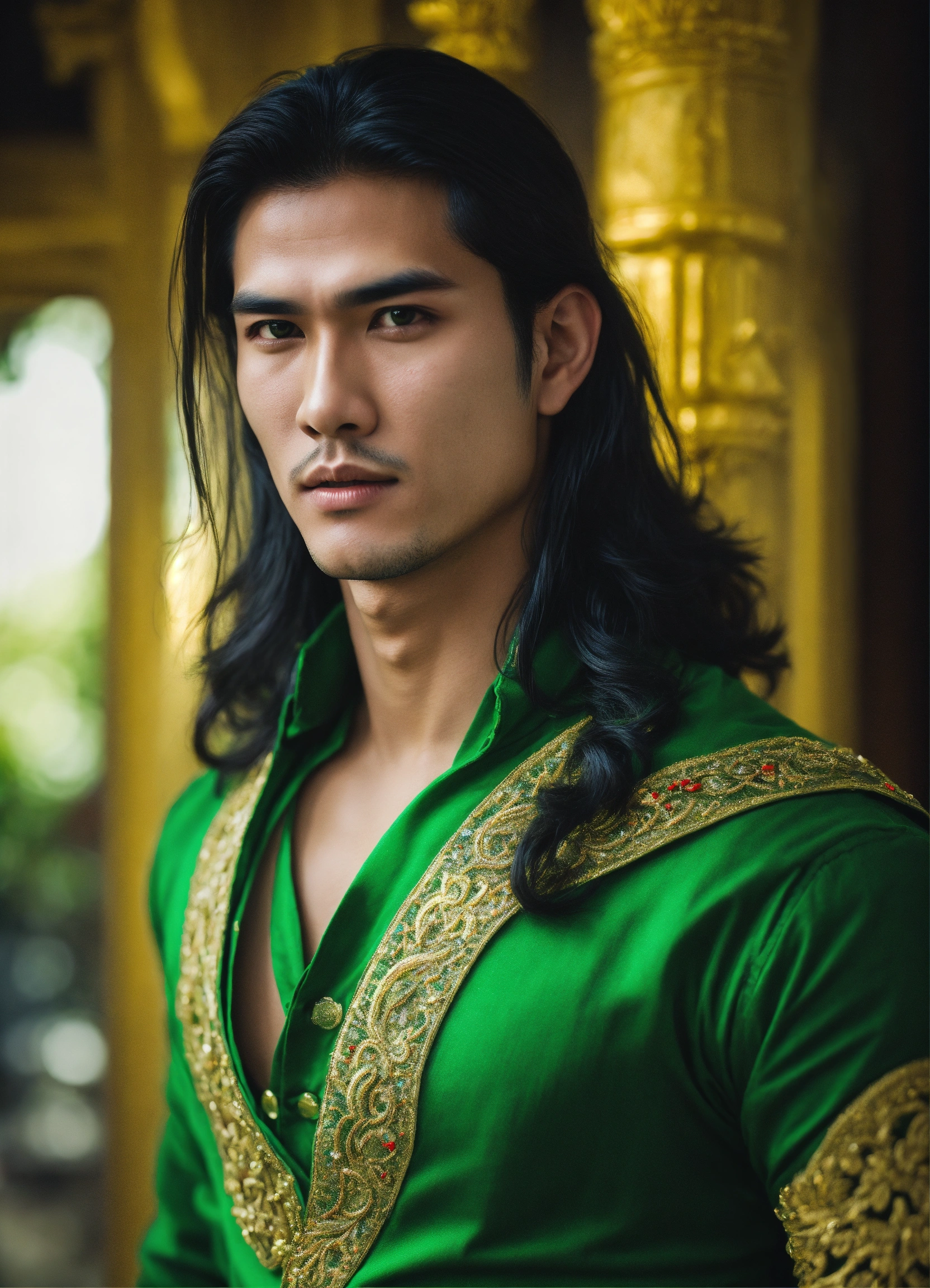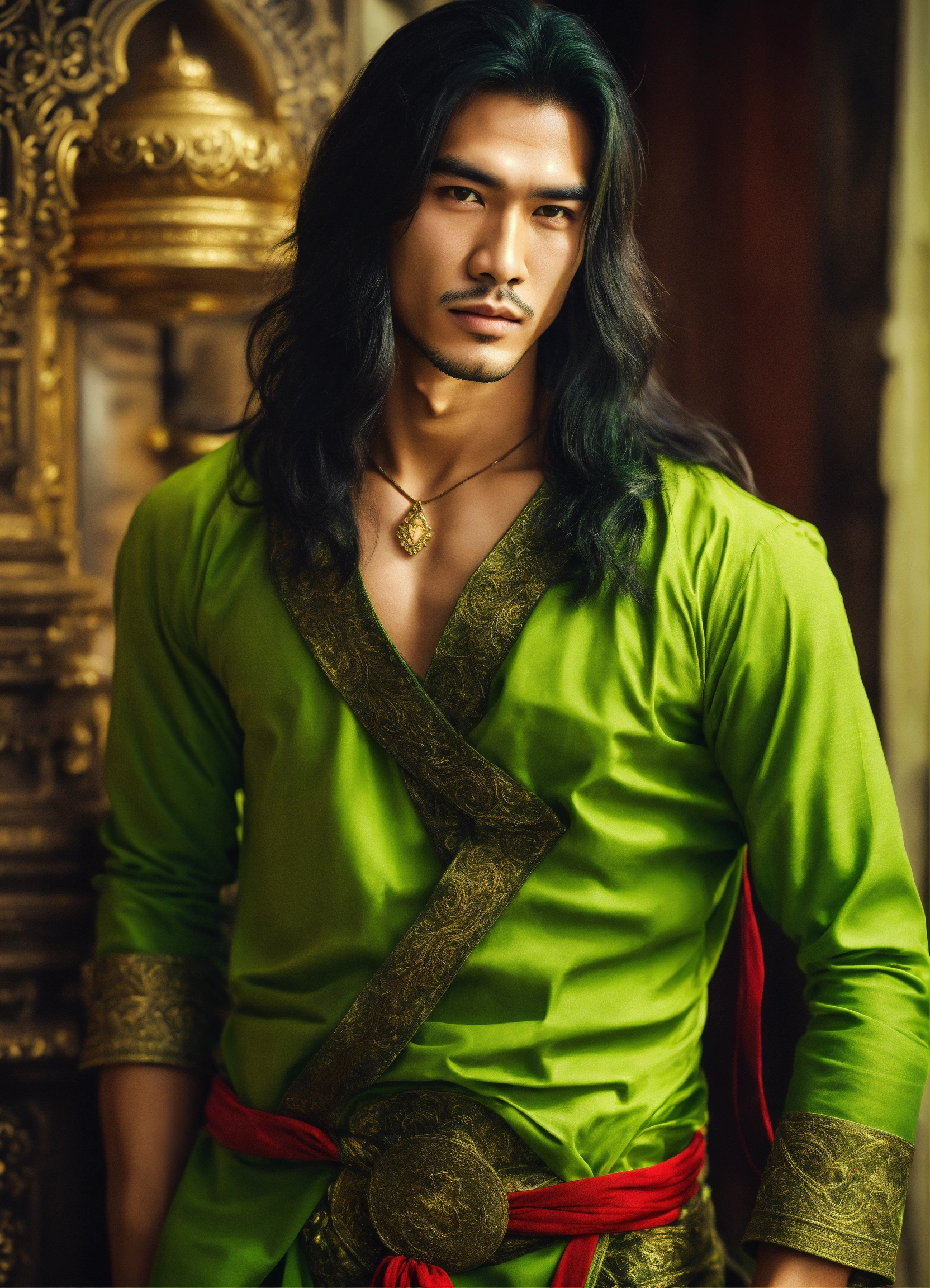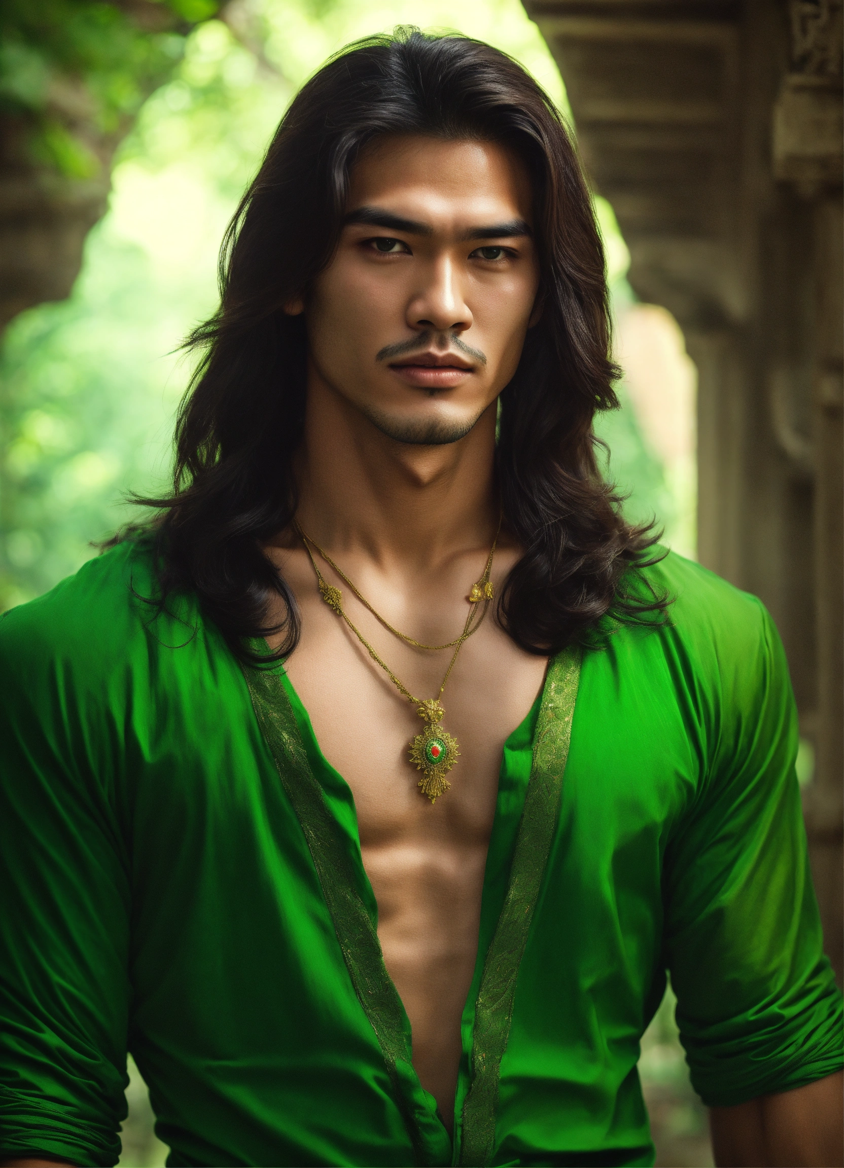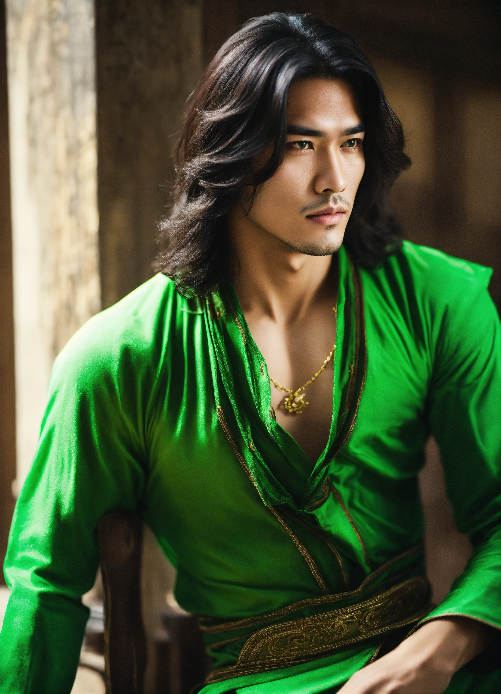 Thailand handsome severe clean shaven man with long hair green clothes magicain fantasy