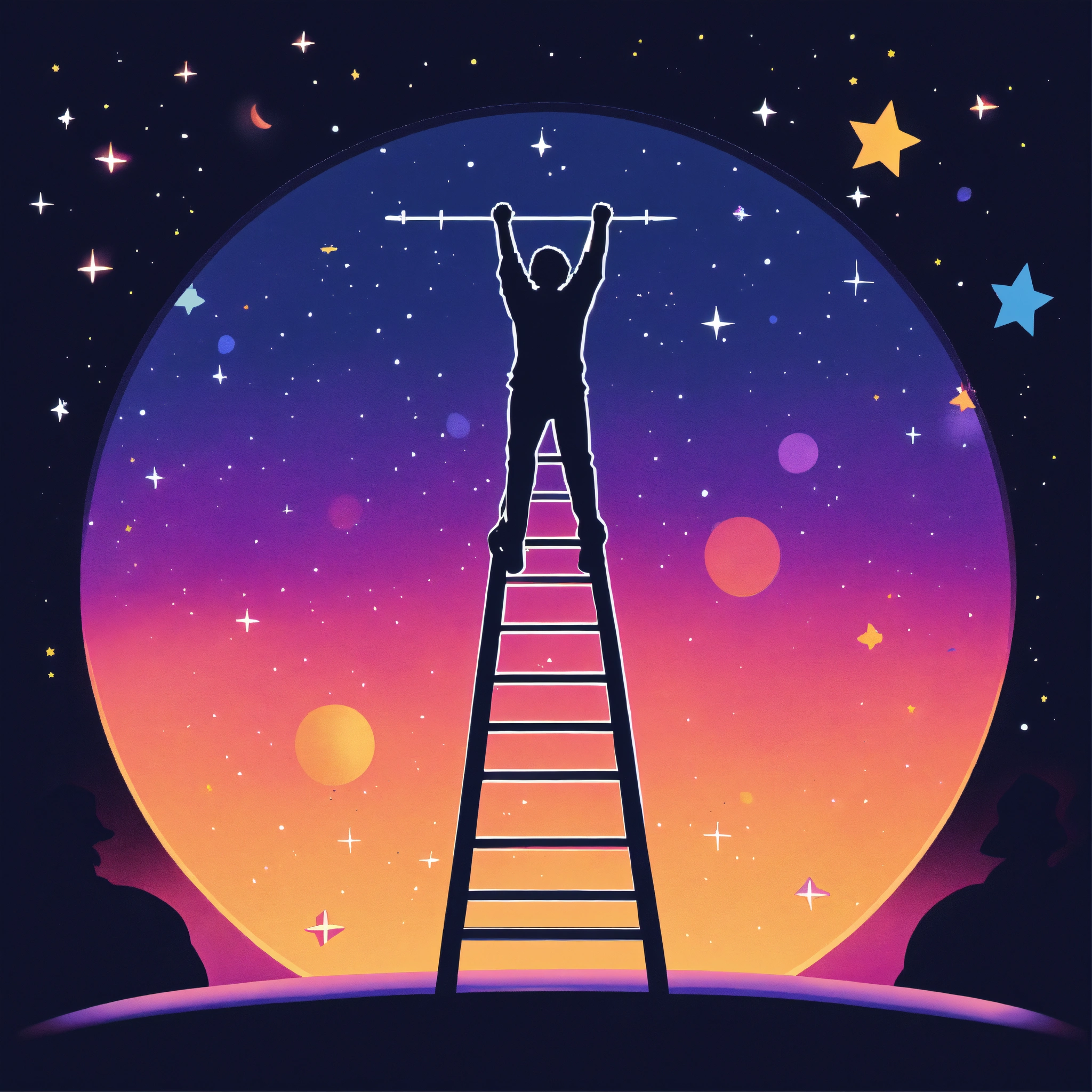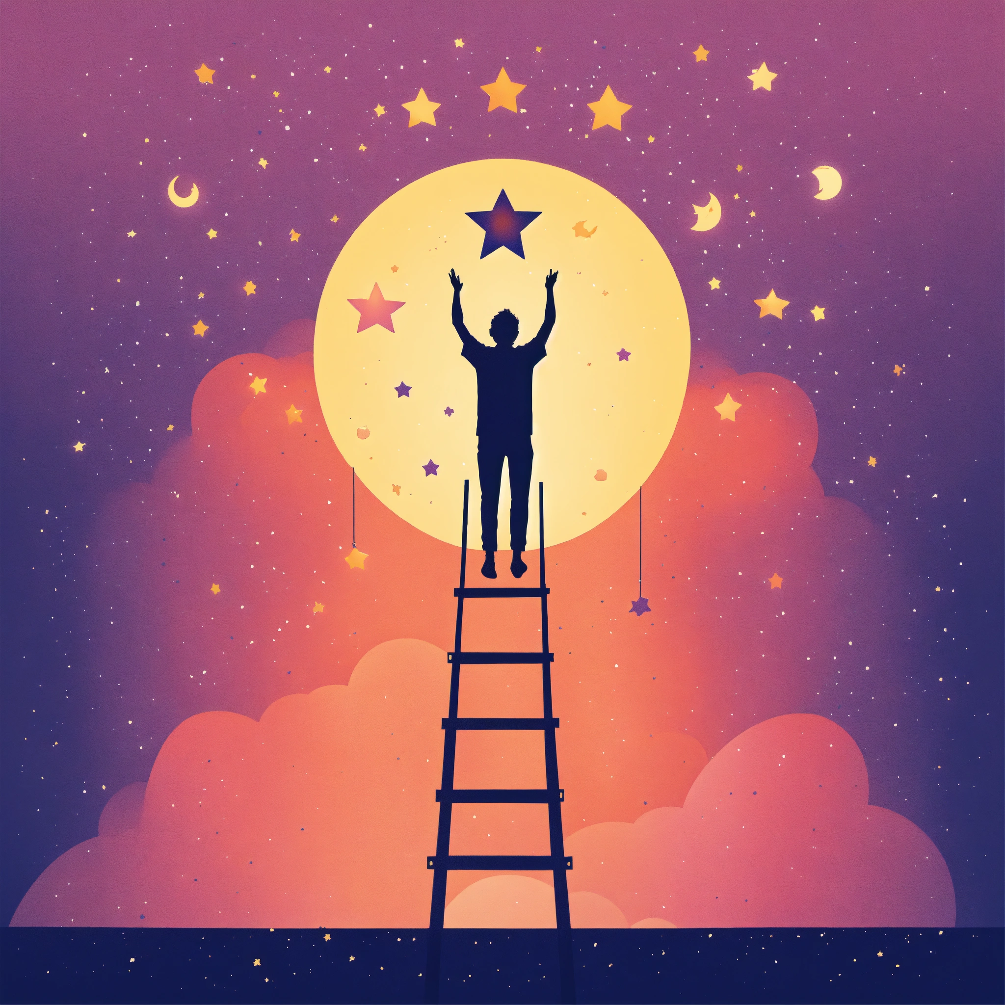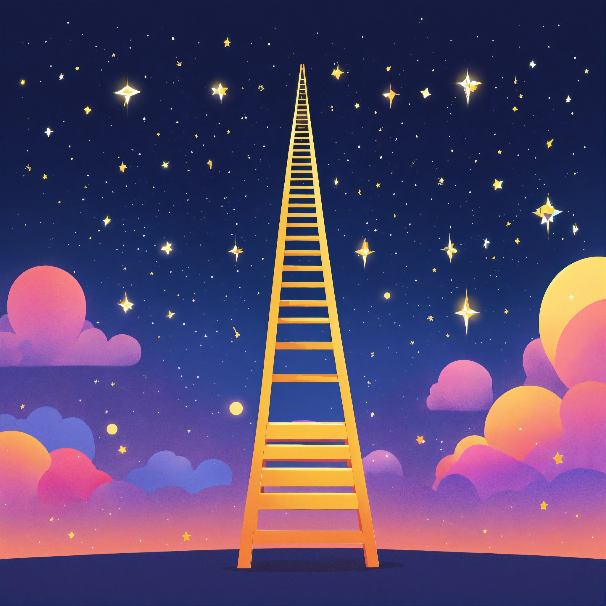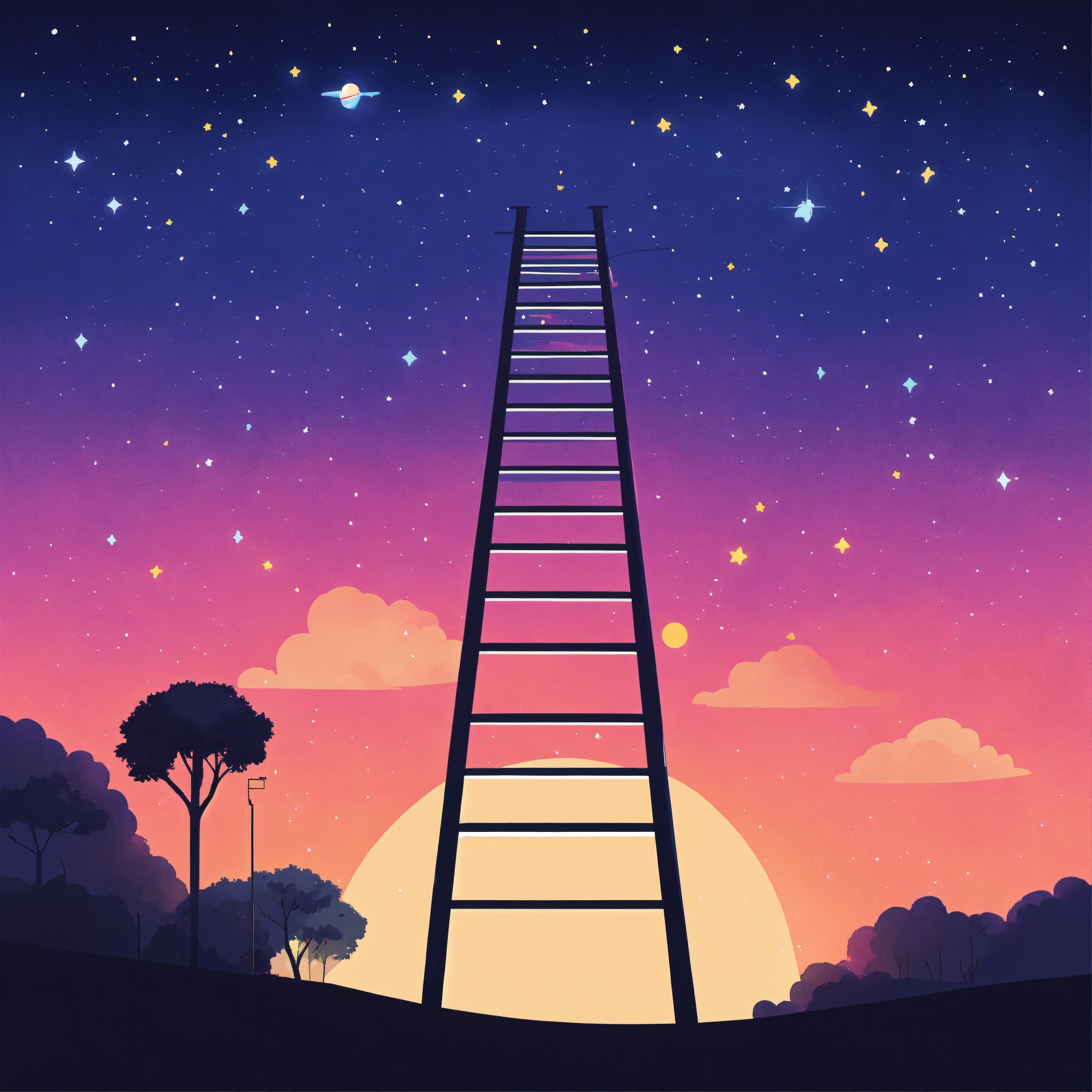 T-shirt vector illustration, centered design of a playful ladder, reaching up to pluck stars from the sky, set against a twilight gradient, celebrating aspirations. simplistic, centered vector illustration, solid background color.