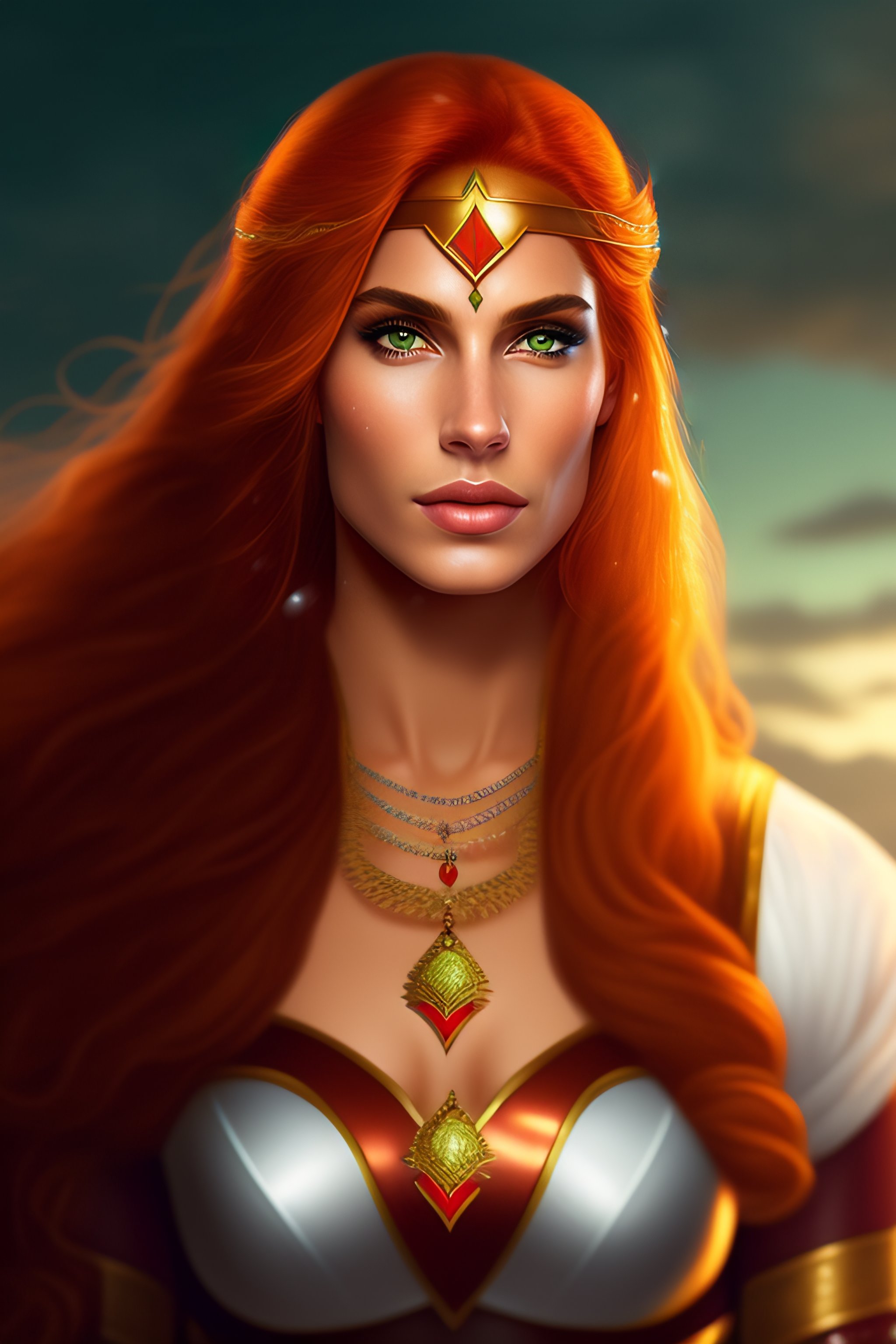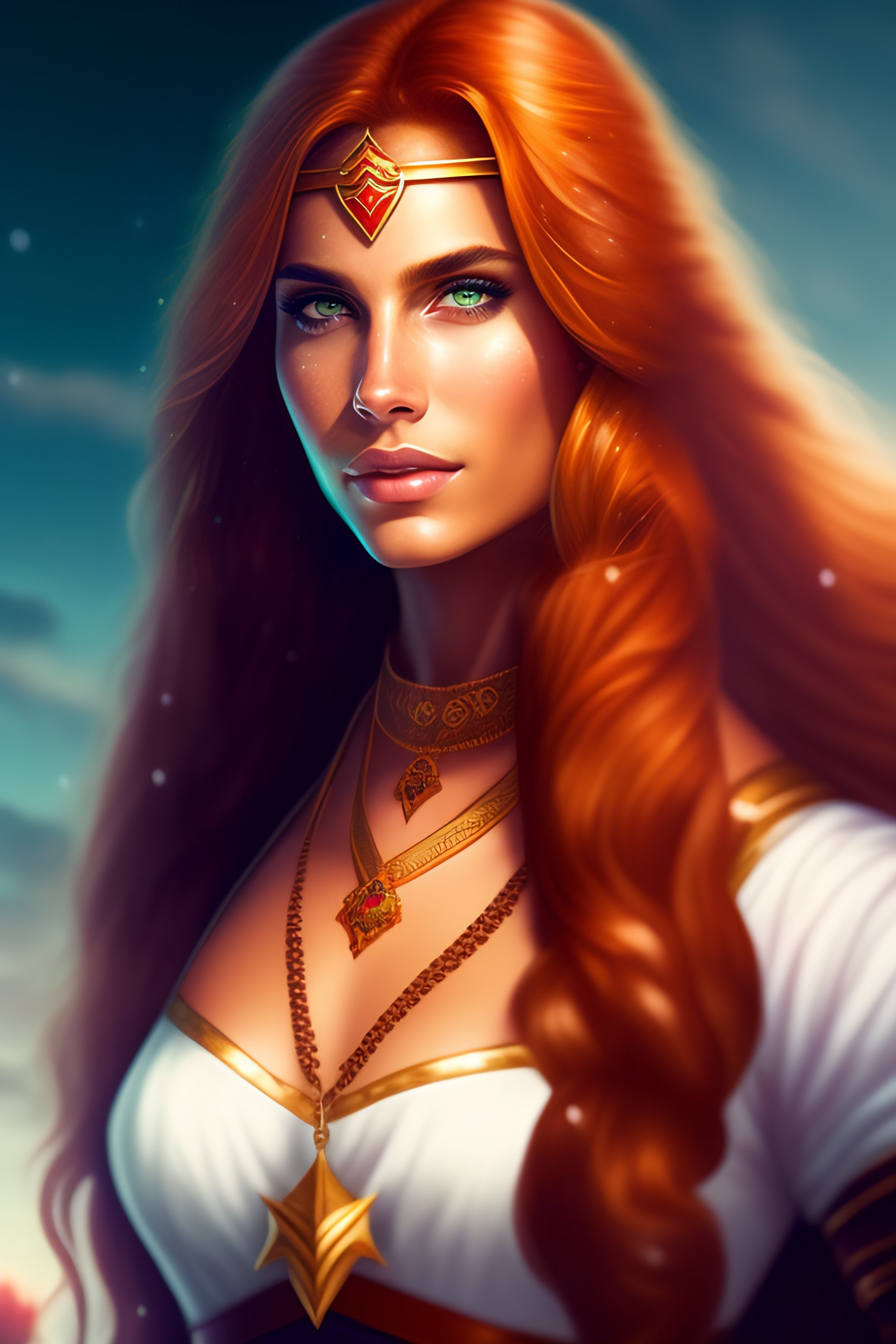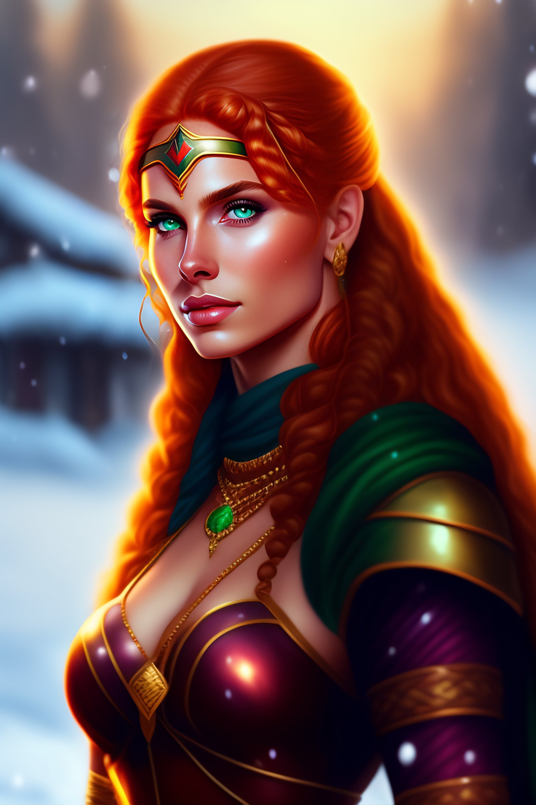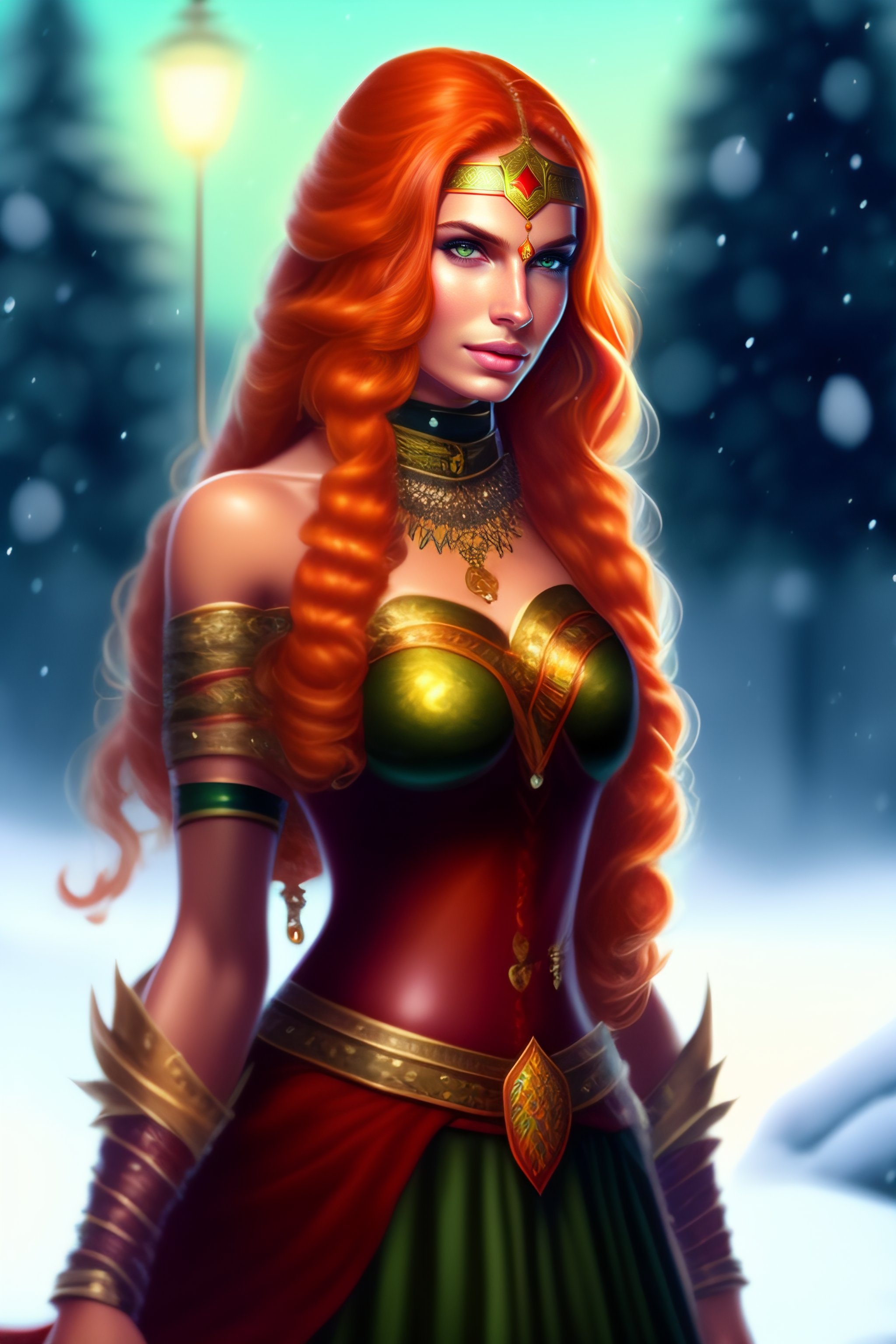 Long ginger hair, indian tanned man in wonder woman medieval outfit, green eyes, fang necklace, hair tied in a ponytail, soft lighting, night scene, anime style. 1boy, solo. girly, androgynous, adult. ambiguous face. winter clothe. snow.