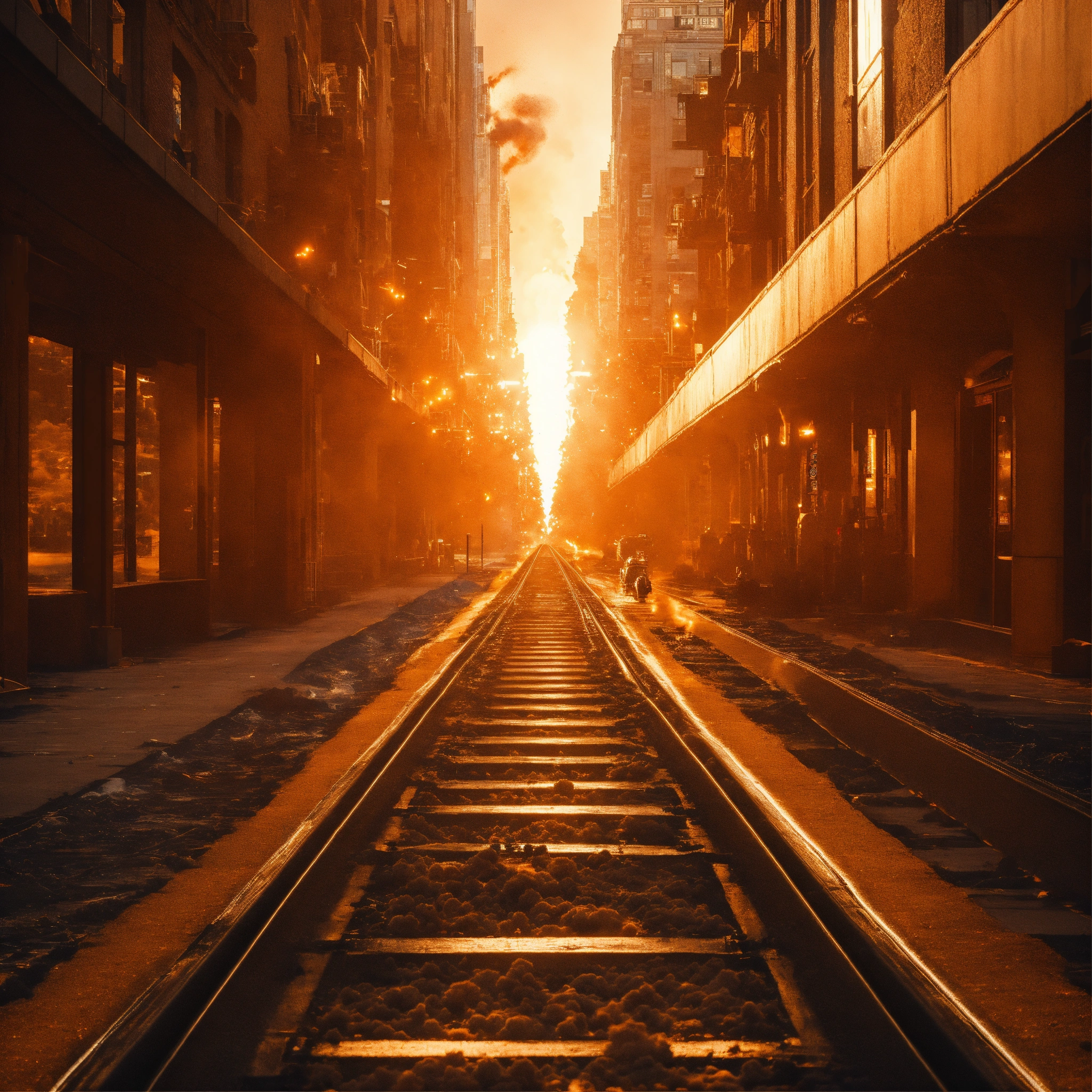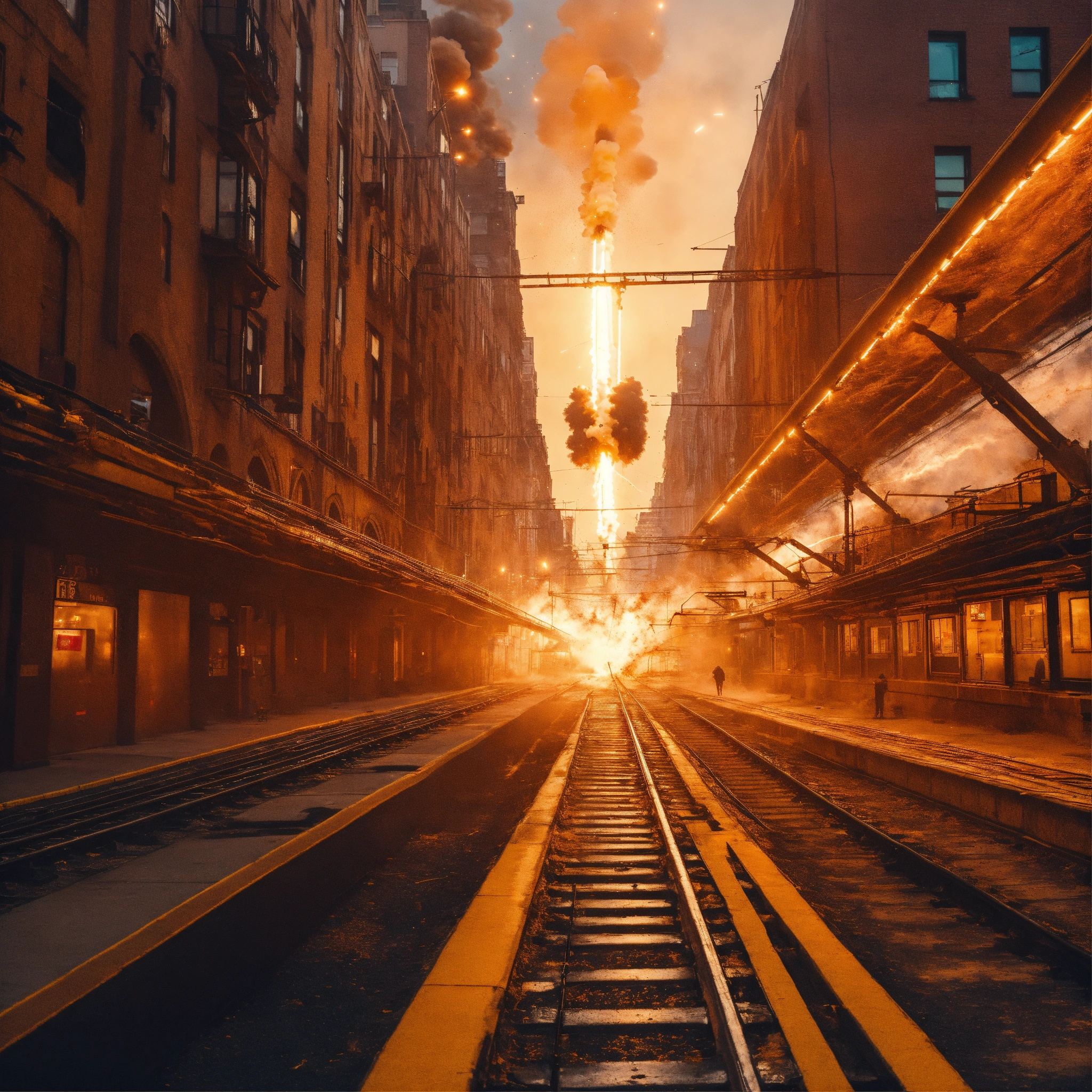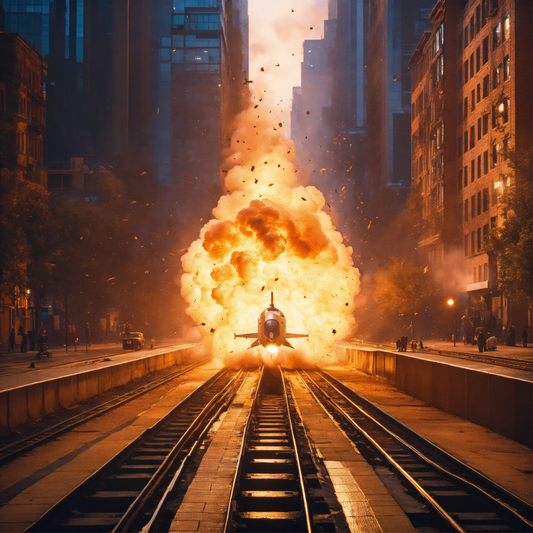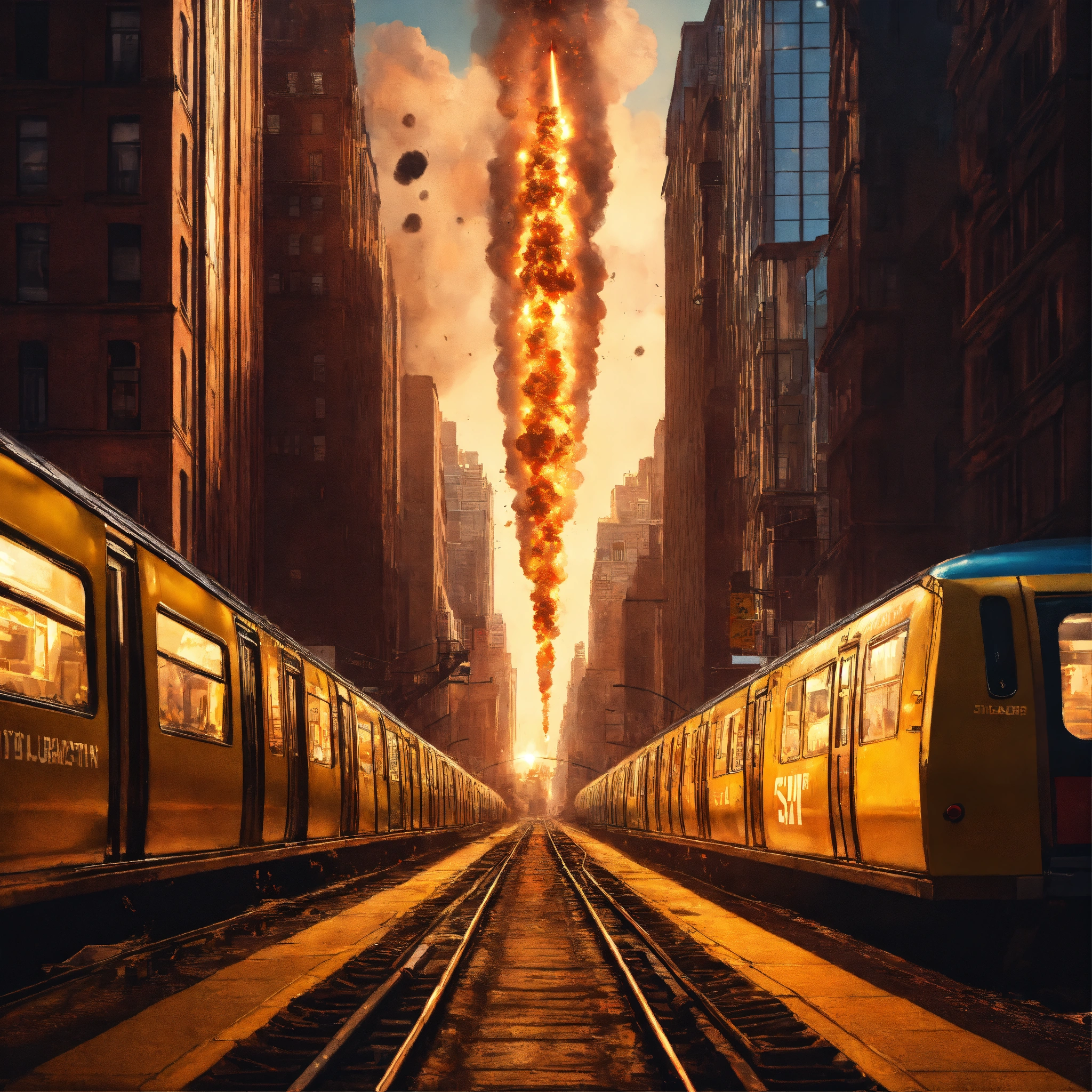 Subway taking off like a rocket, explosion, from the ground, in a city, goldem hour, strange, whimsical, 8k