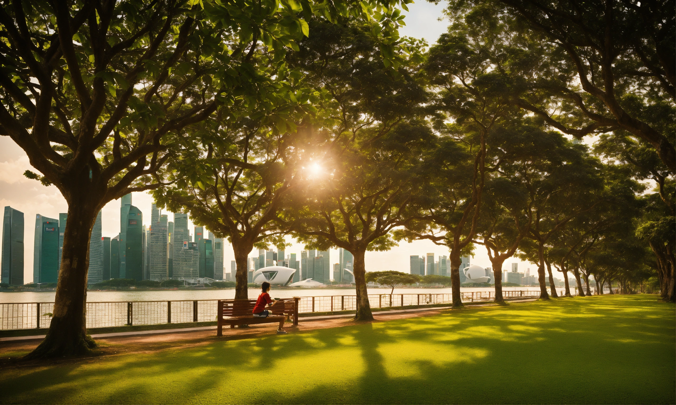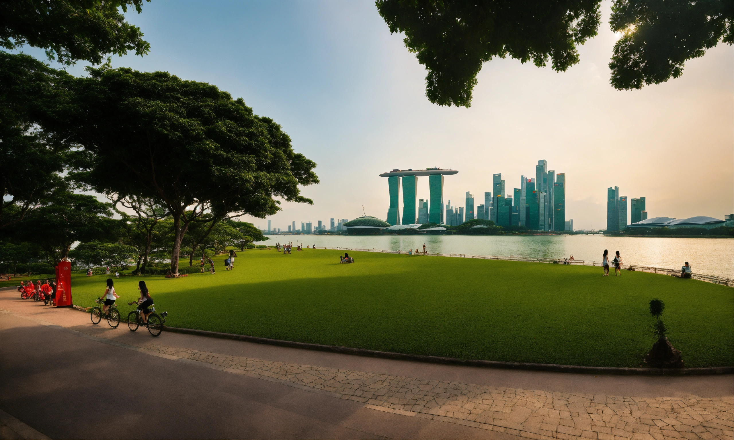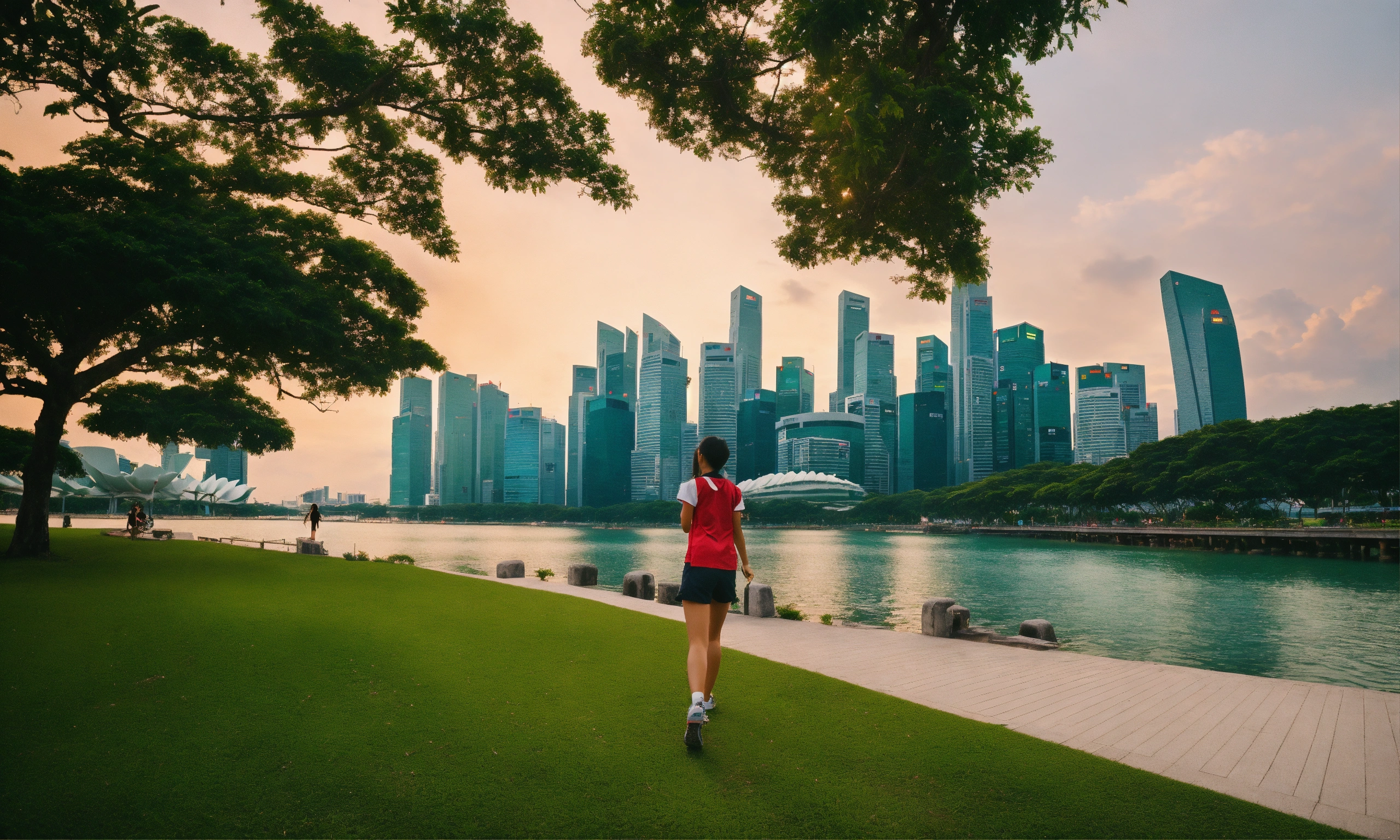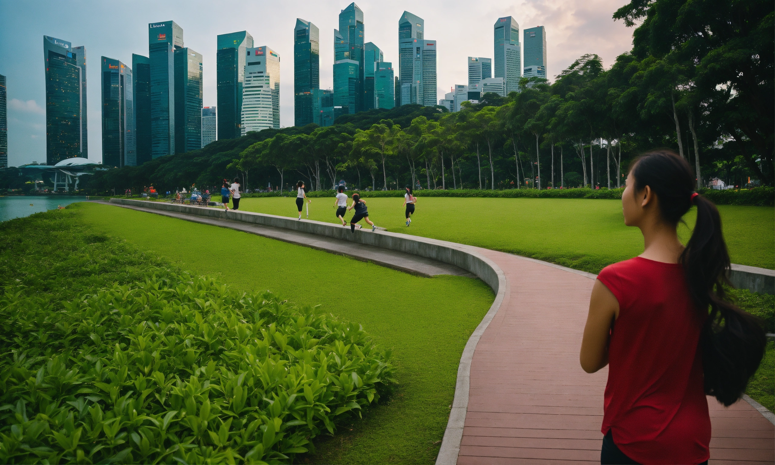 A full establishing shot of singapore's east coast park, a lush oasis of greenery, with towering trees, background is the iconic cityscape of singapore rises, with modern skyscrapers, with marina barrage, contrasting against the lush park, an athletic 18-year-old tan asian girl in motion in the centre of the frame, wearing a plain red athletic shirt, which pops against the green surroundings, determined, capture with leica summicron 35mm f2.0 lens, enhancing the vibrant colors of the park with the rich tones of kodak portra 400 film, adding a touch of film grain to give it a classic yet vivid cinematic quality, singapore