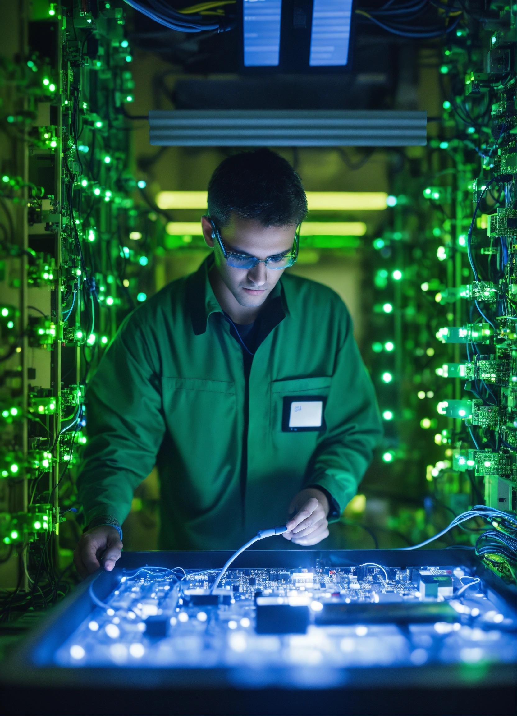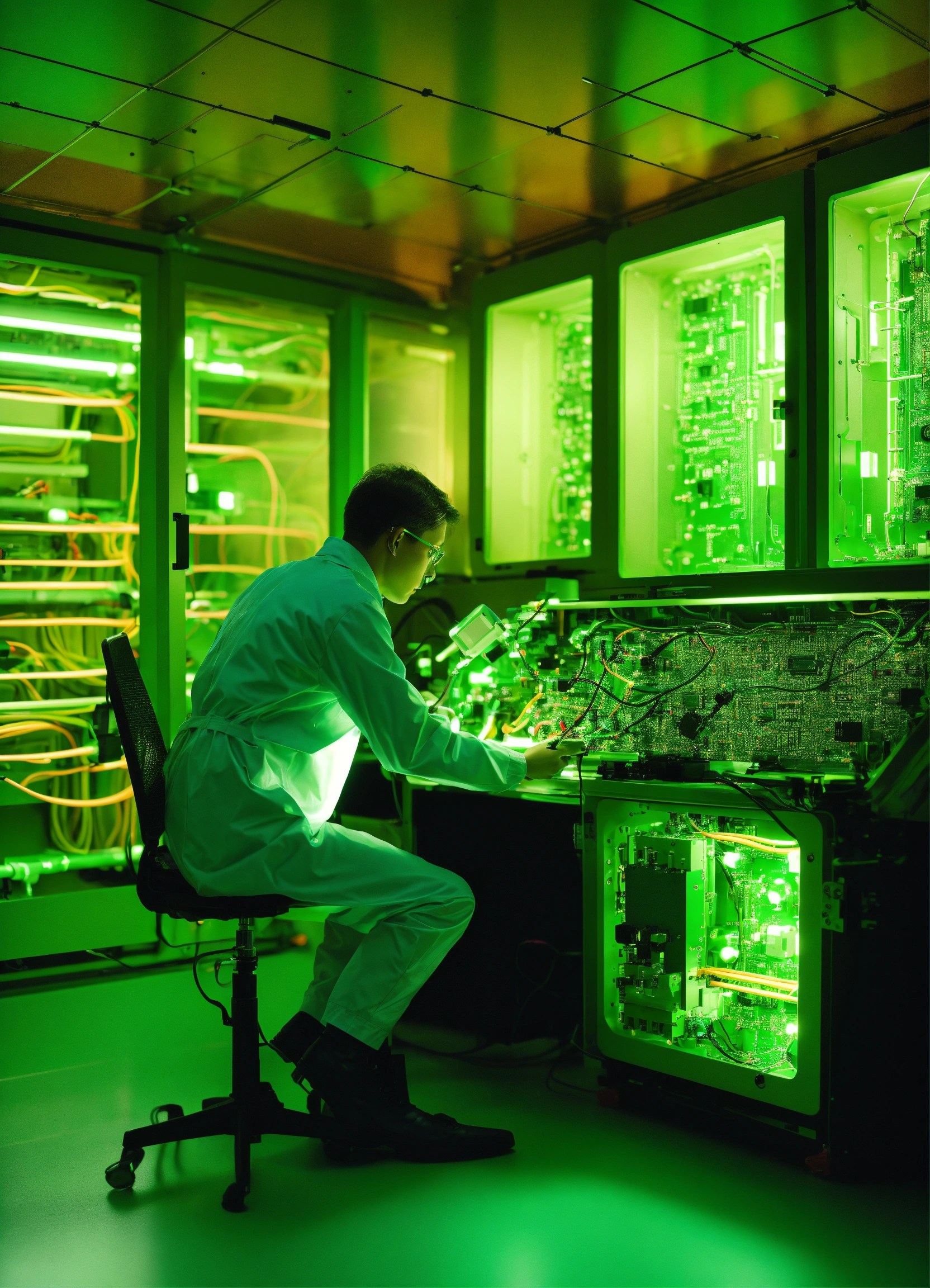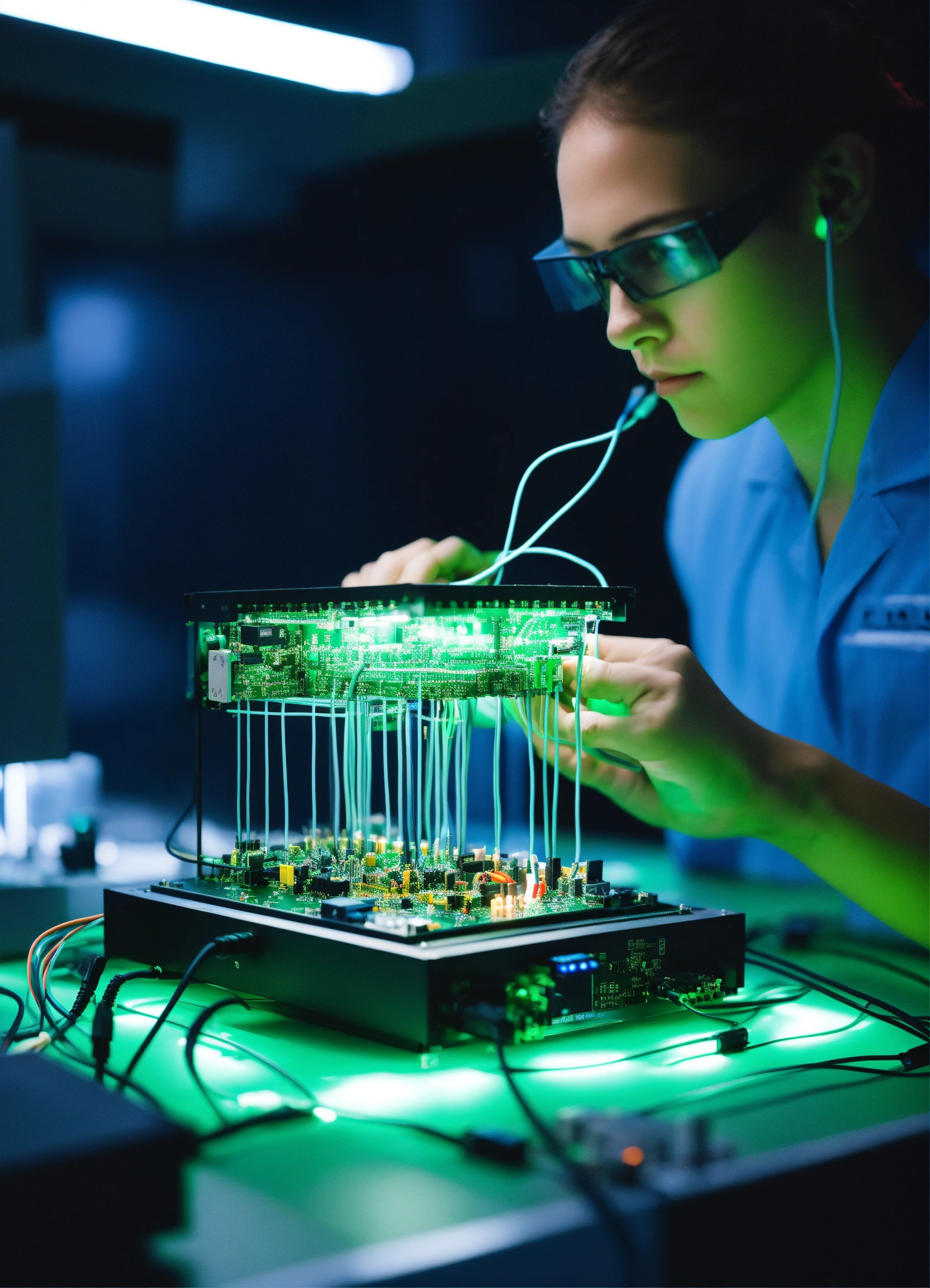 Human working in a lab with a quantum computer prototype with components and the systems include custom-built electronics, wiring, amplifiers, and a quantum processor. you can see the wiring chip where we route signals to and from qubits. they test the aerodynamic qualities. color green, blue, minimal. hiper realistic fashion technology. 35mm. award winning photography.