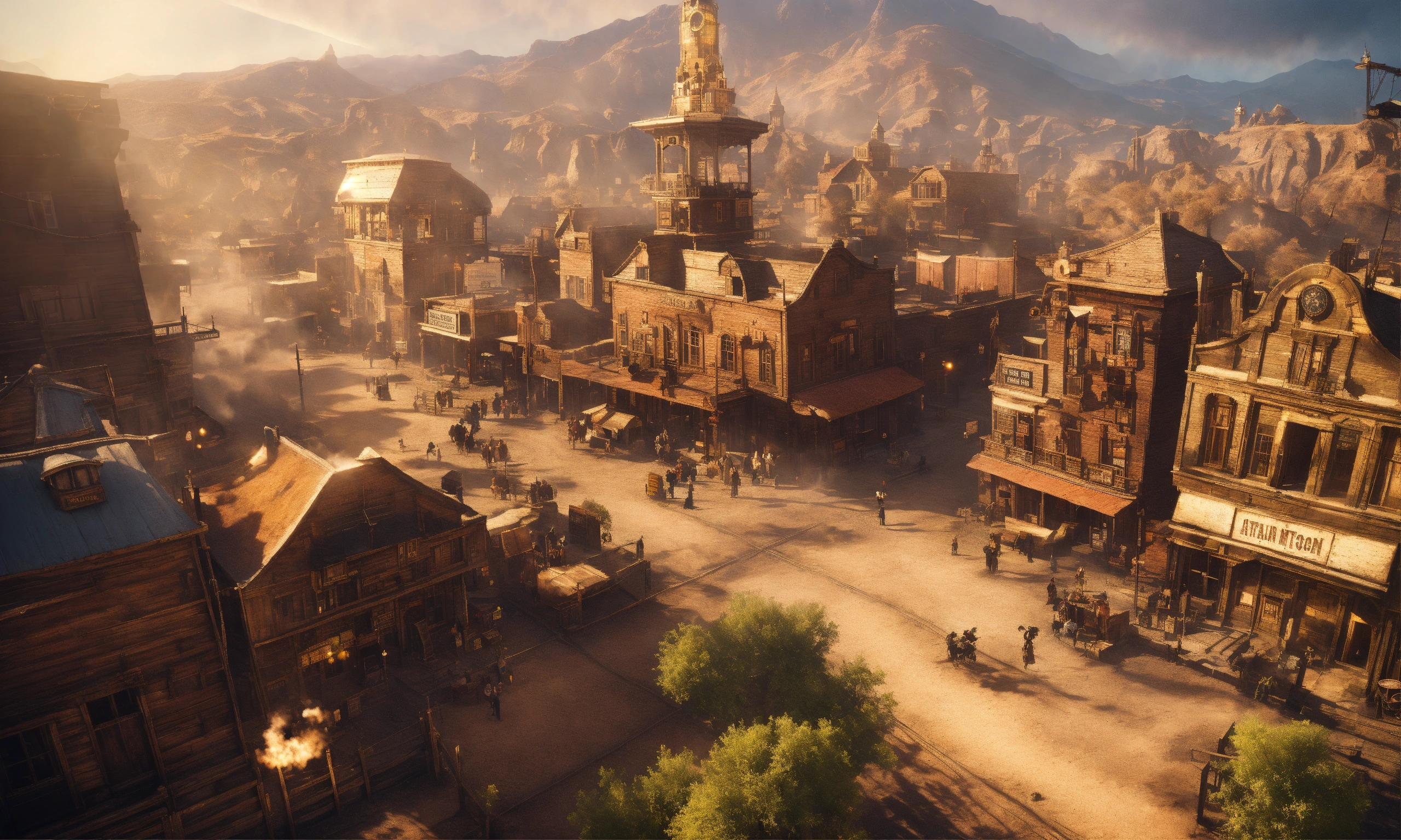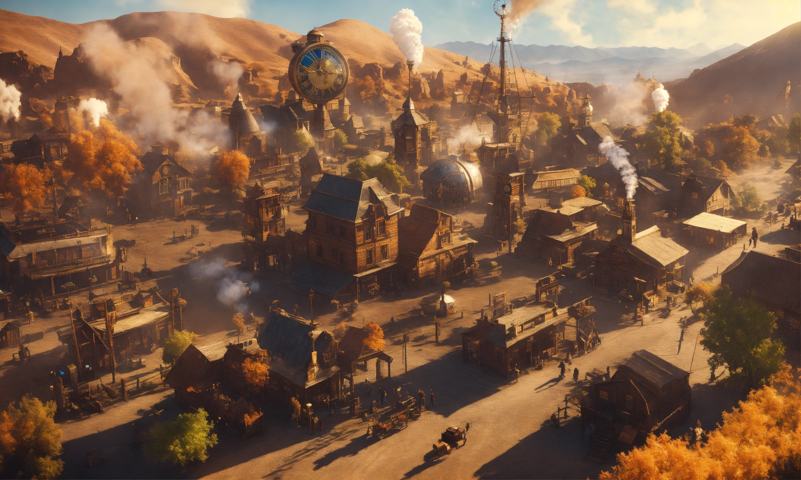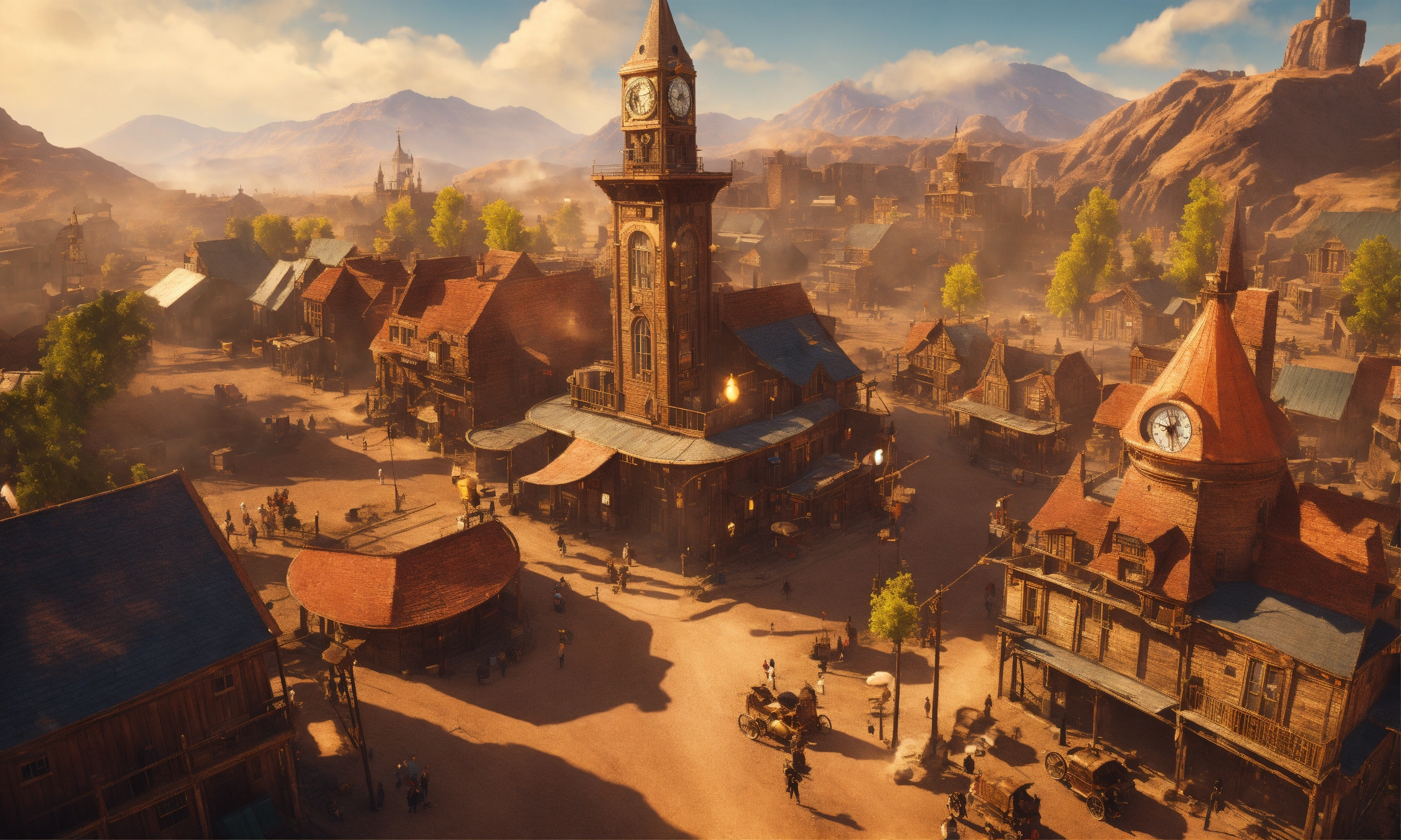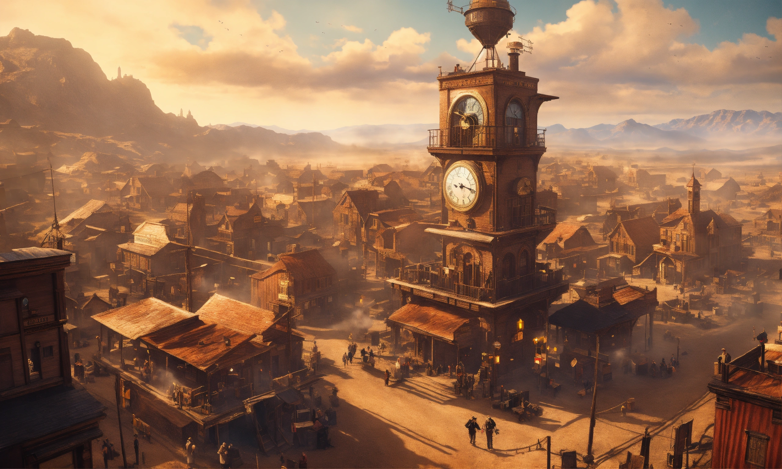 Wide shot from above of a steam punk town in a wild west universe with a clock tower in the center