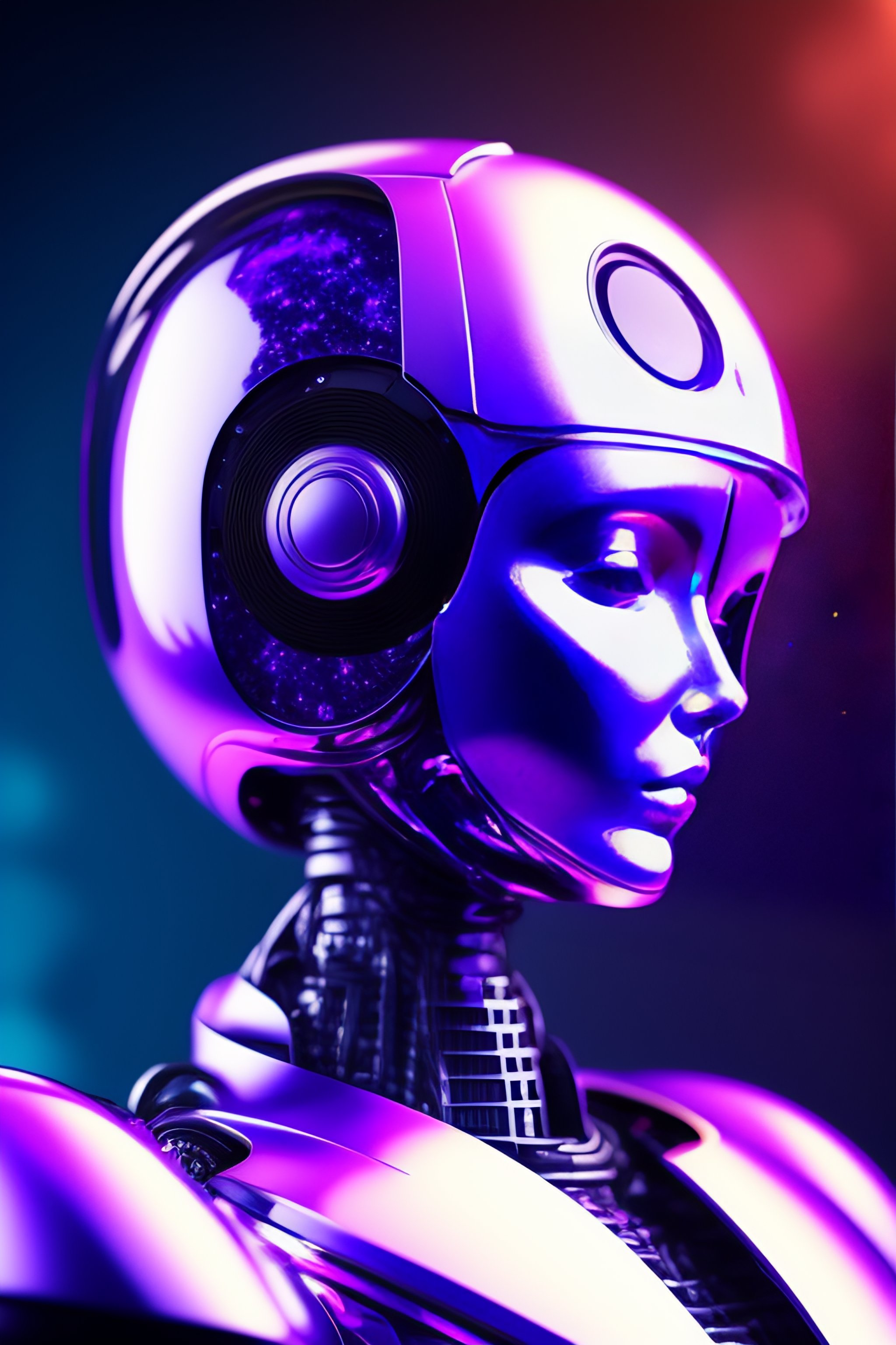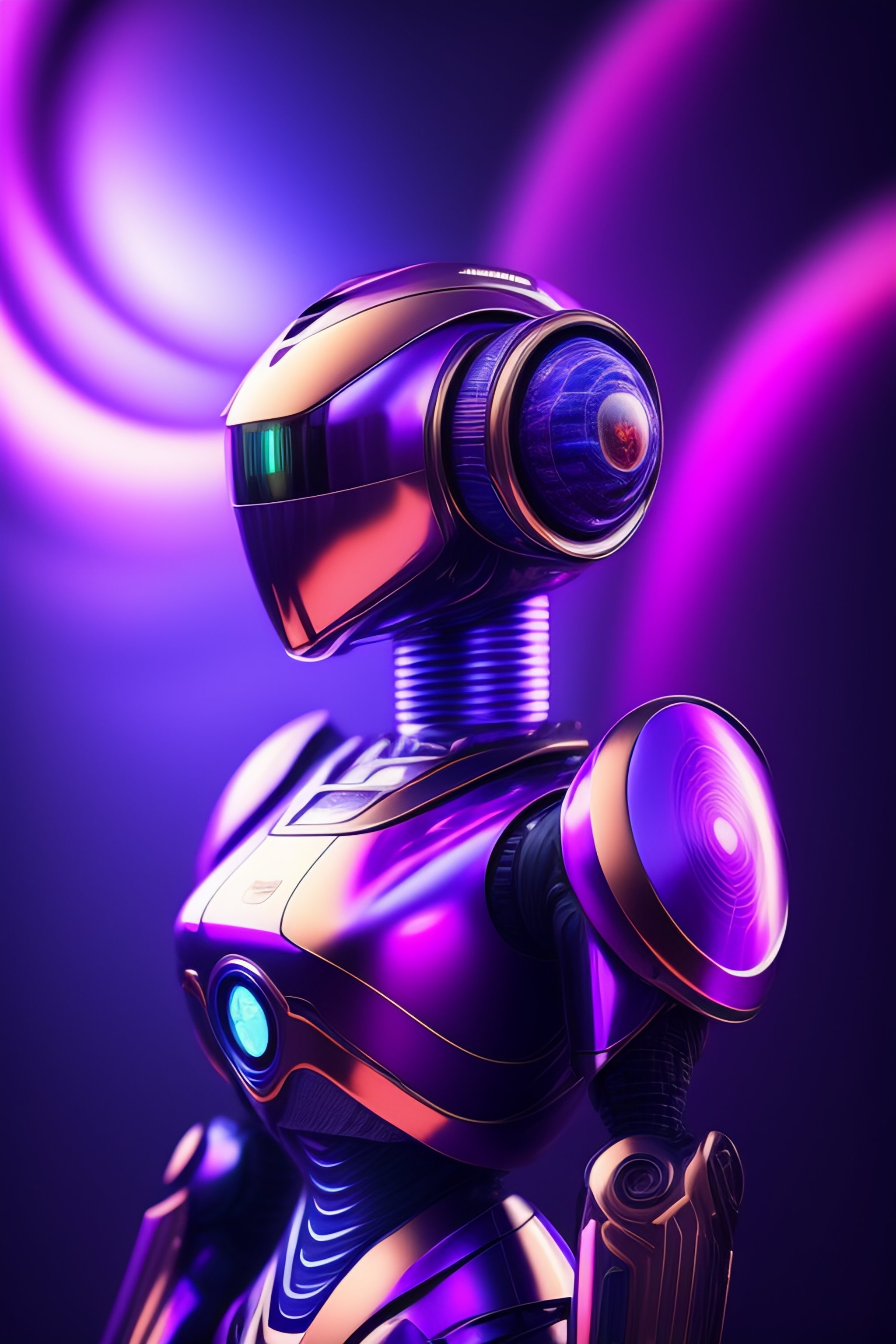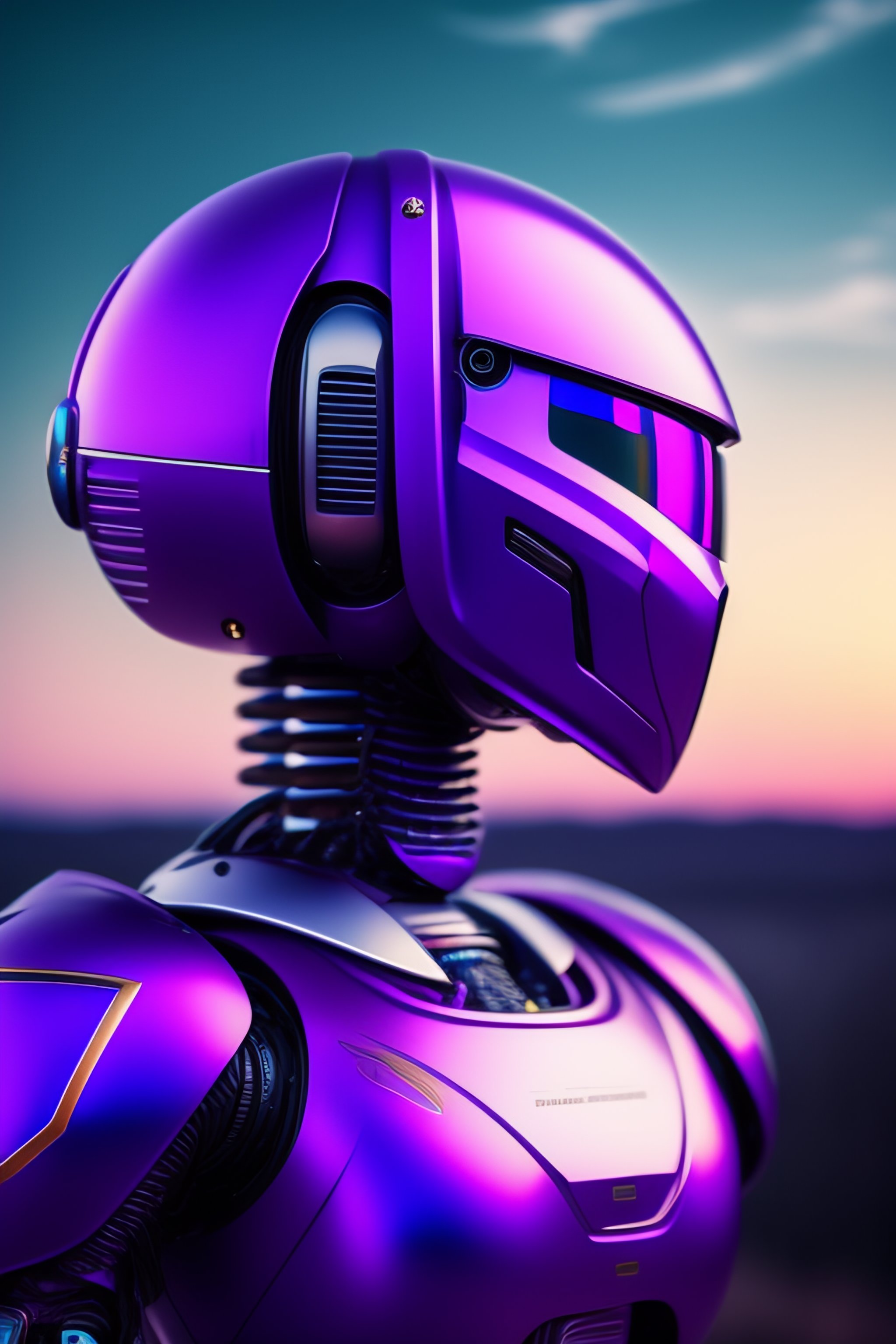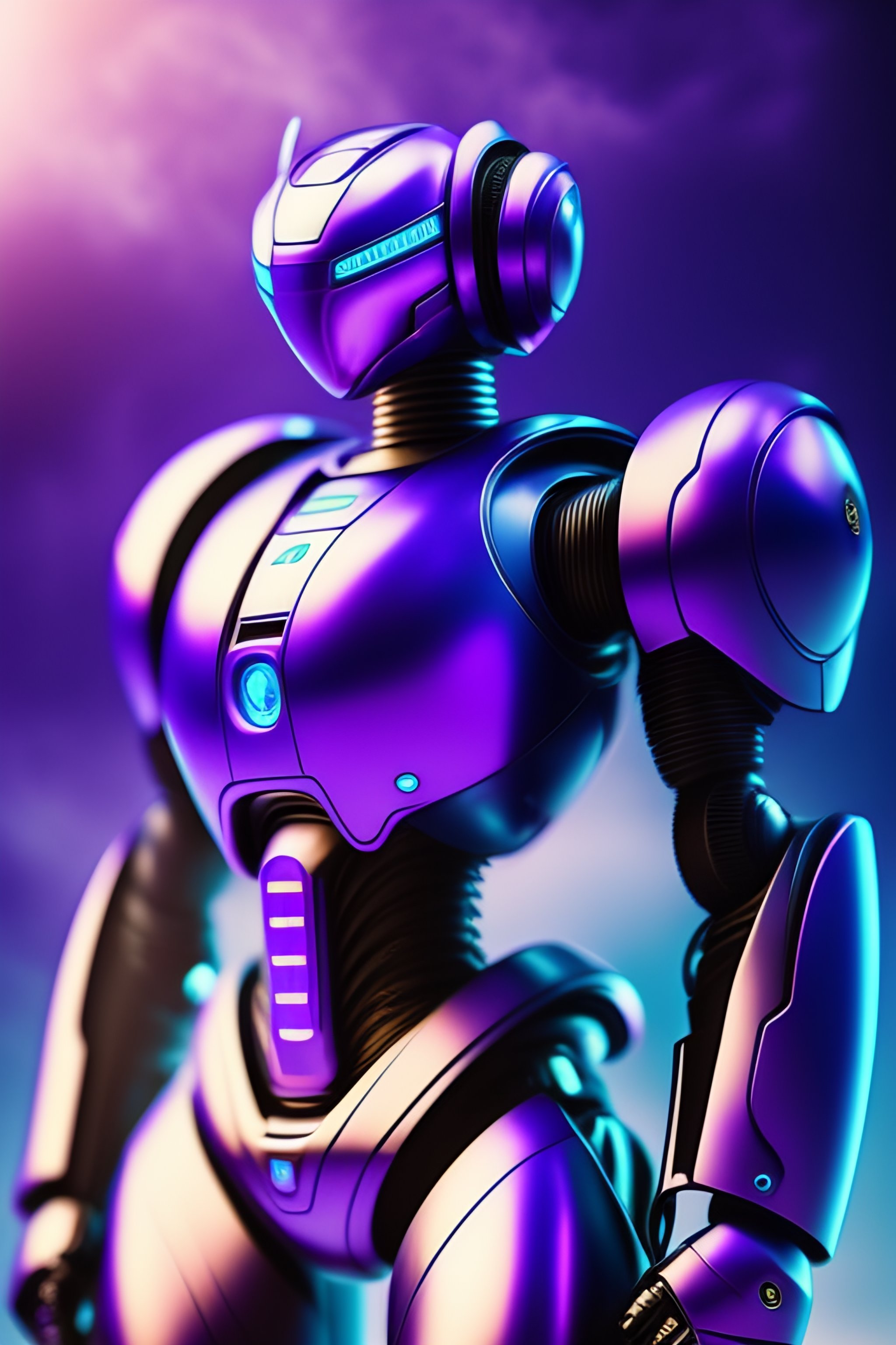 A organic robot portrait, bluish purple background, magnificent sky, spinning top logo on suit, looking at camera