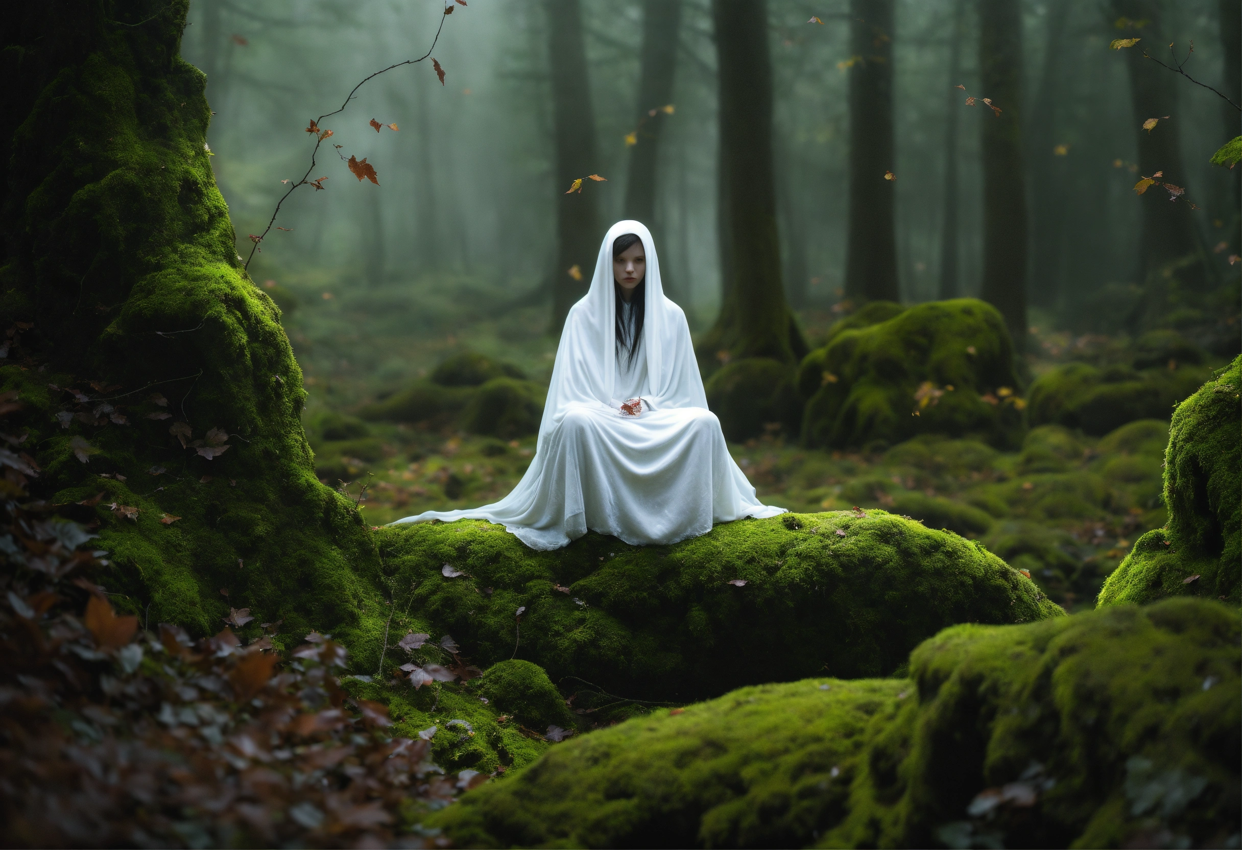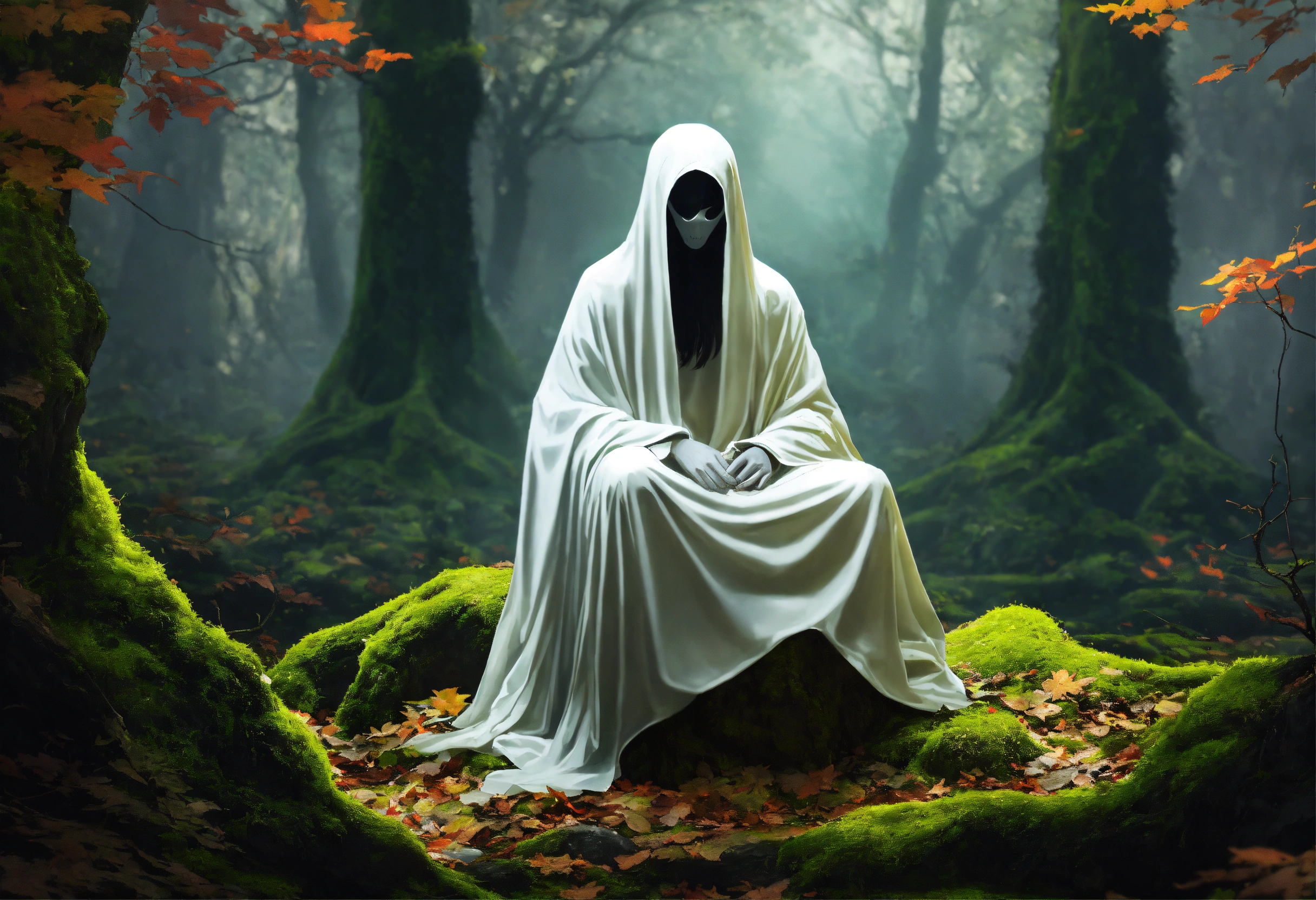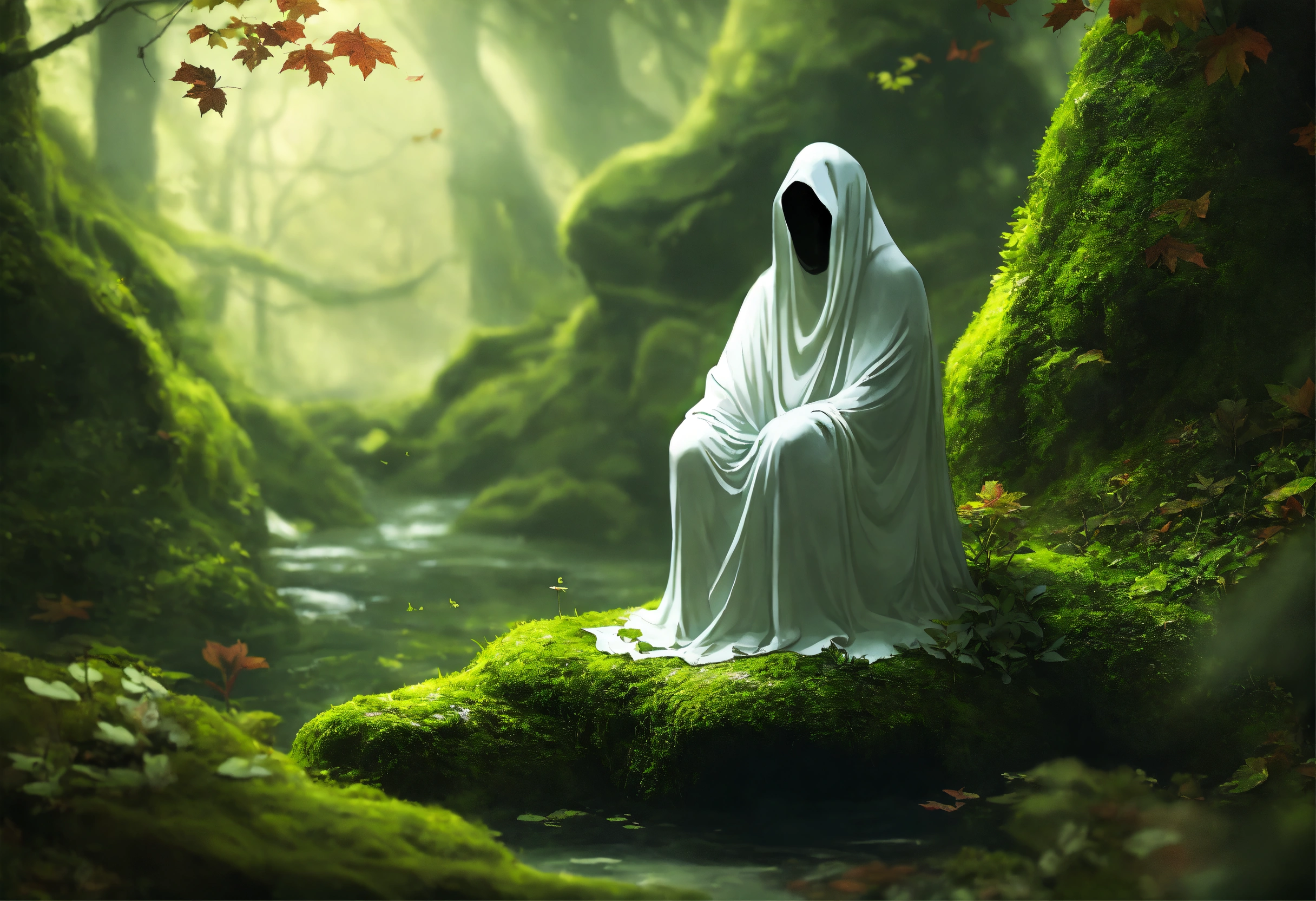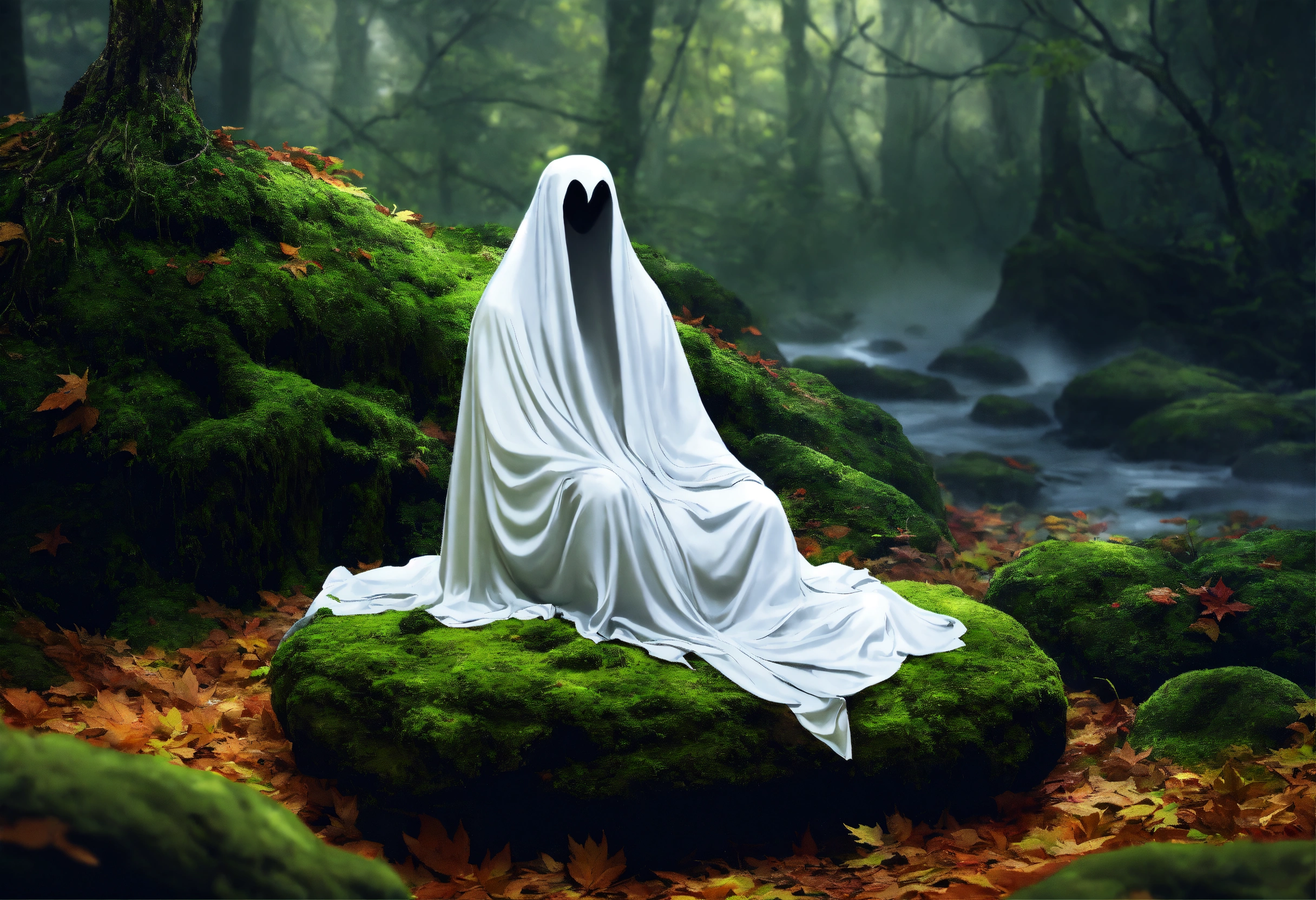 Create a digital art piece featuring a white ghost sitting on a moss-covered rock, surrounded by leaves. the ghost should be positioned in a way that it appears to be looking at the viewer. the scene should be set in a forest or wooded area, with trees in the background. the overall atmosphere should be eerie and mysterious, capturing the essence of a haunting or spooky environment.
