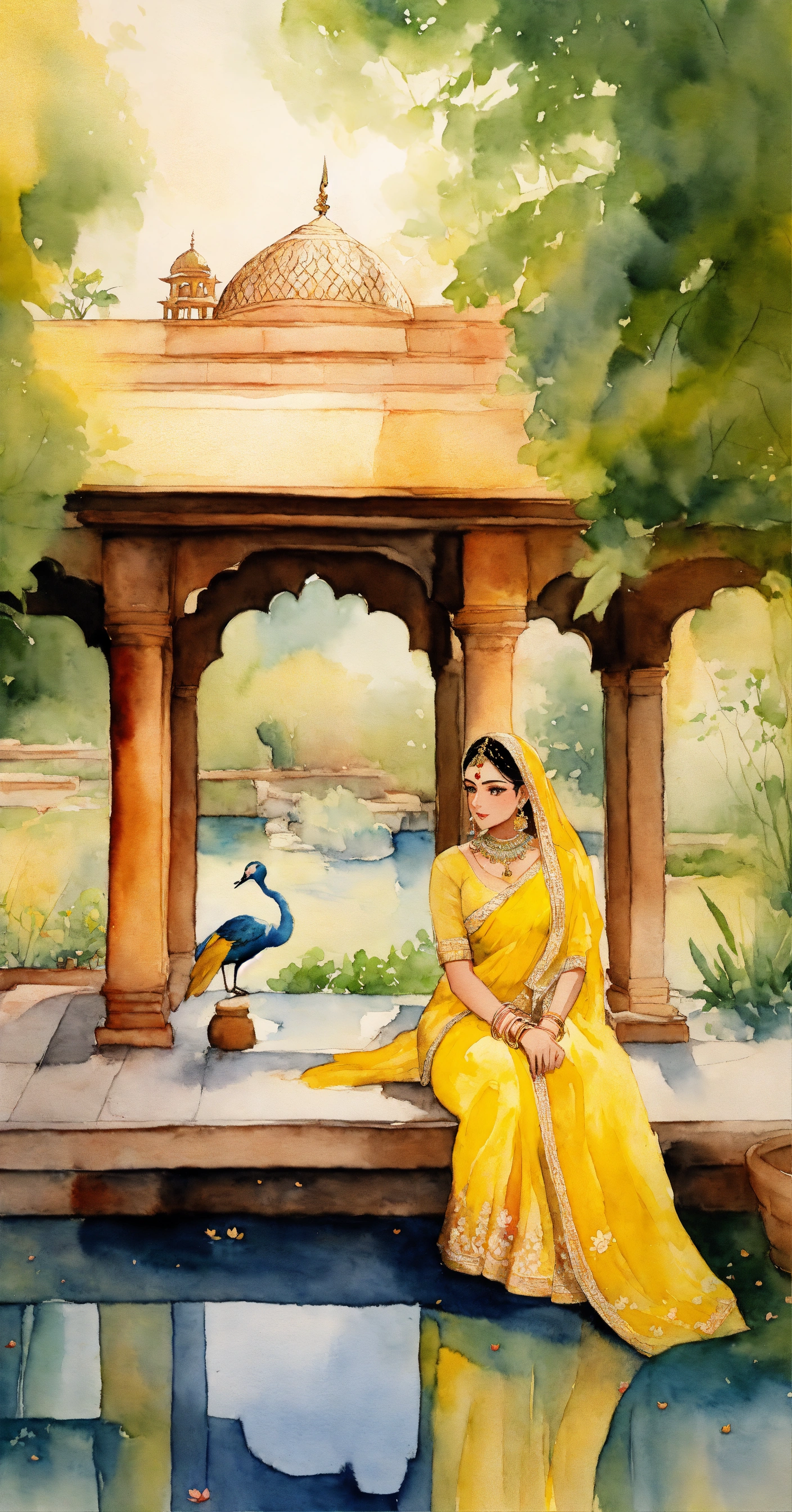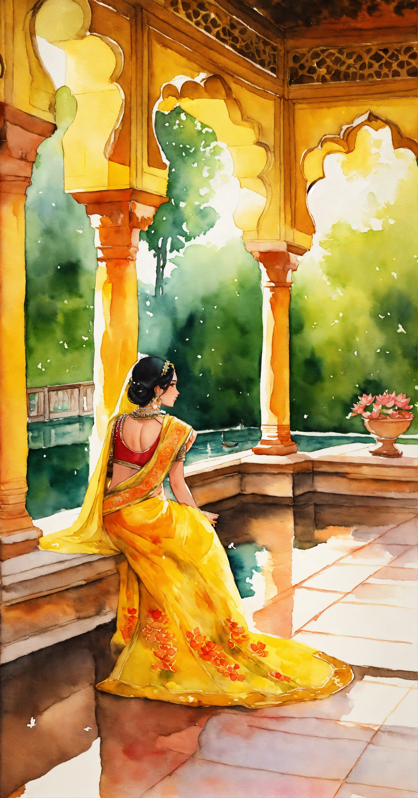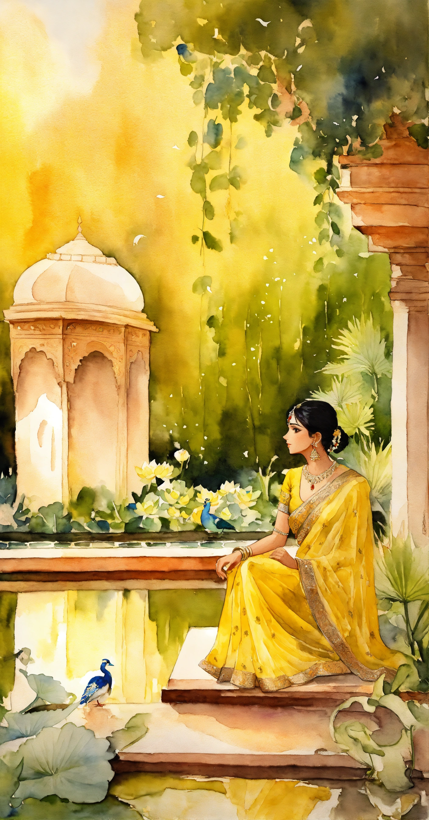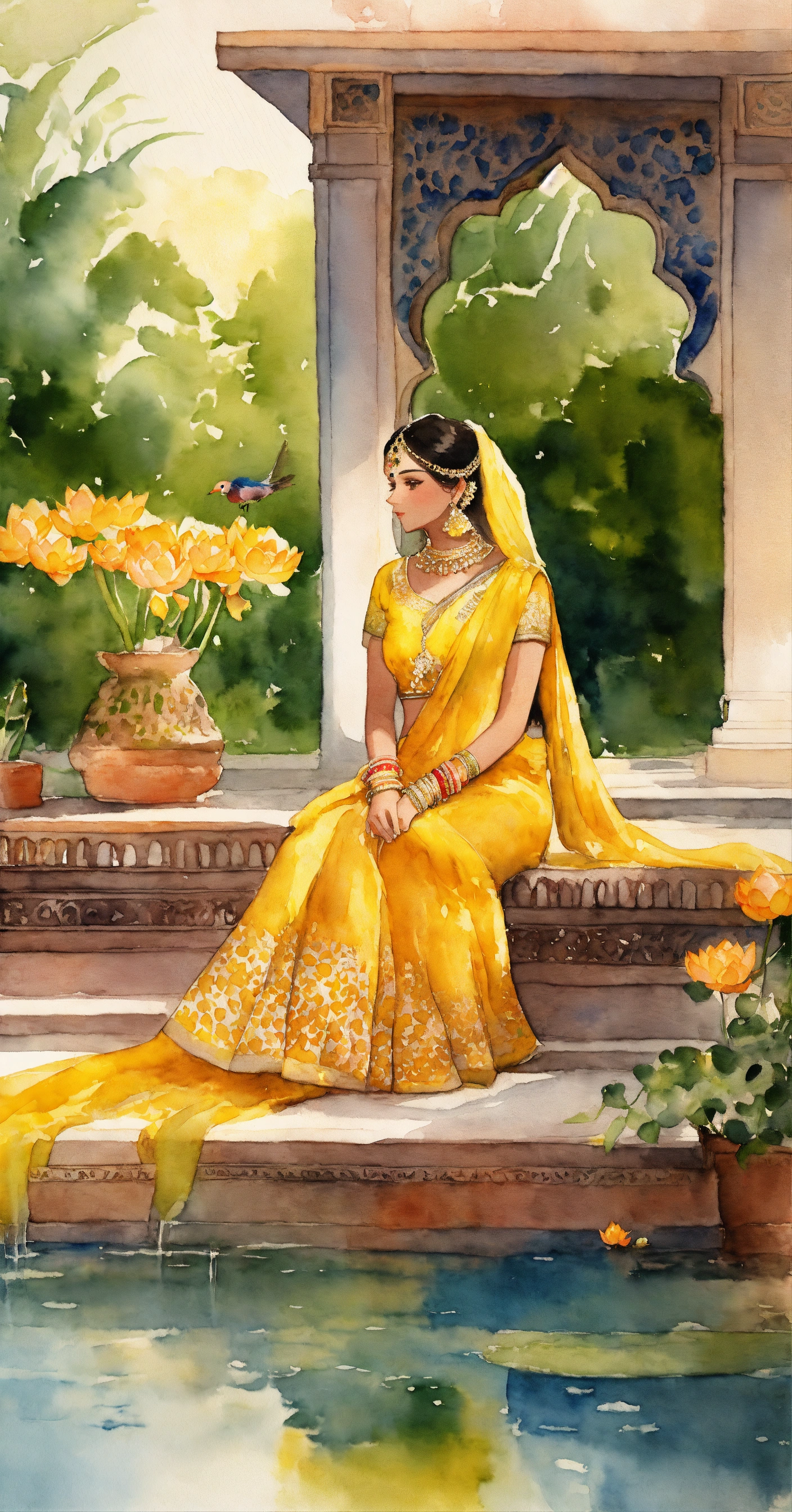 Side view, watercolour, indian bride, haldi function, sitting in distance, yellow saree, garden, pond, lotus, peacocks, trees, birds, yellow background, islamic arch, marble platform, veranda
