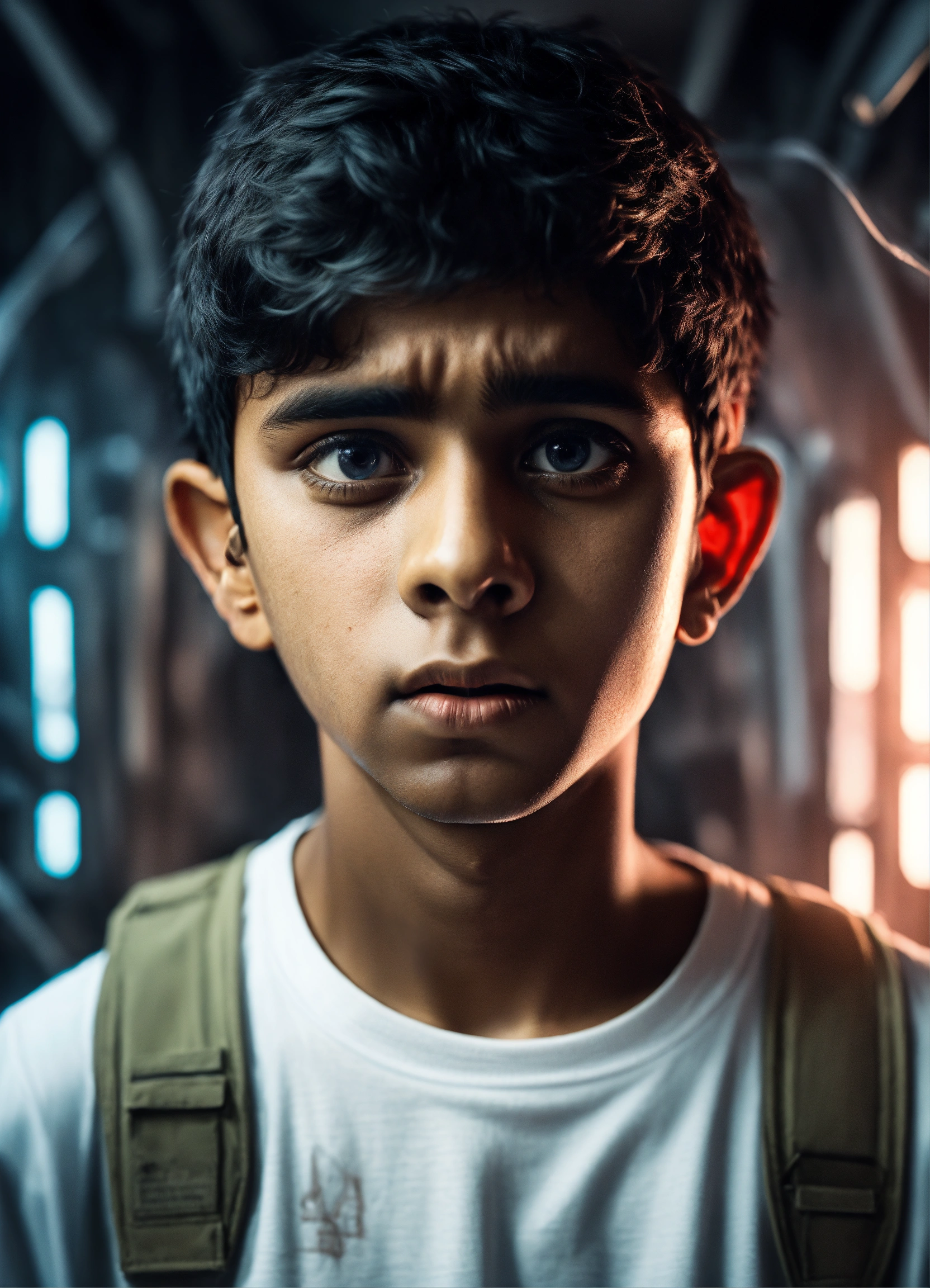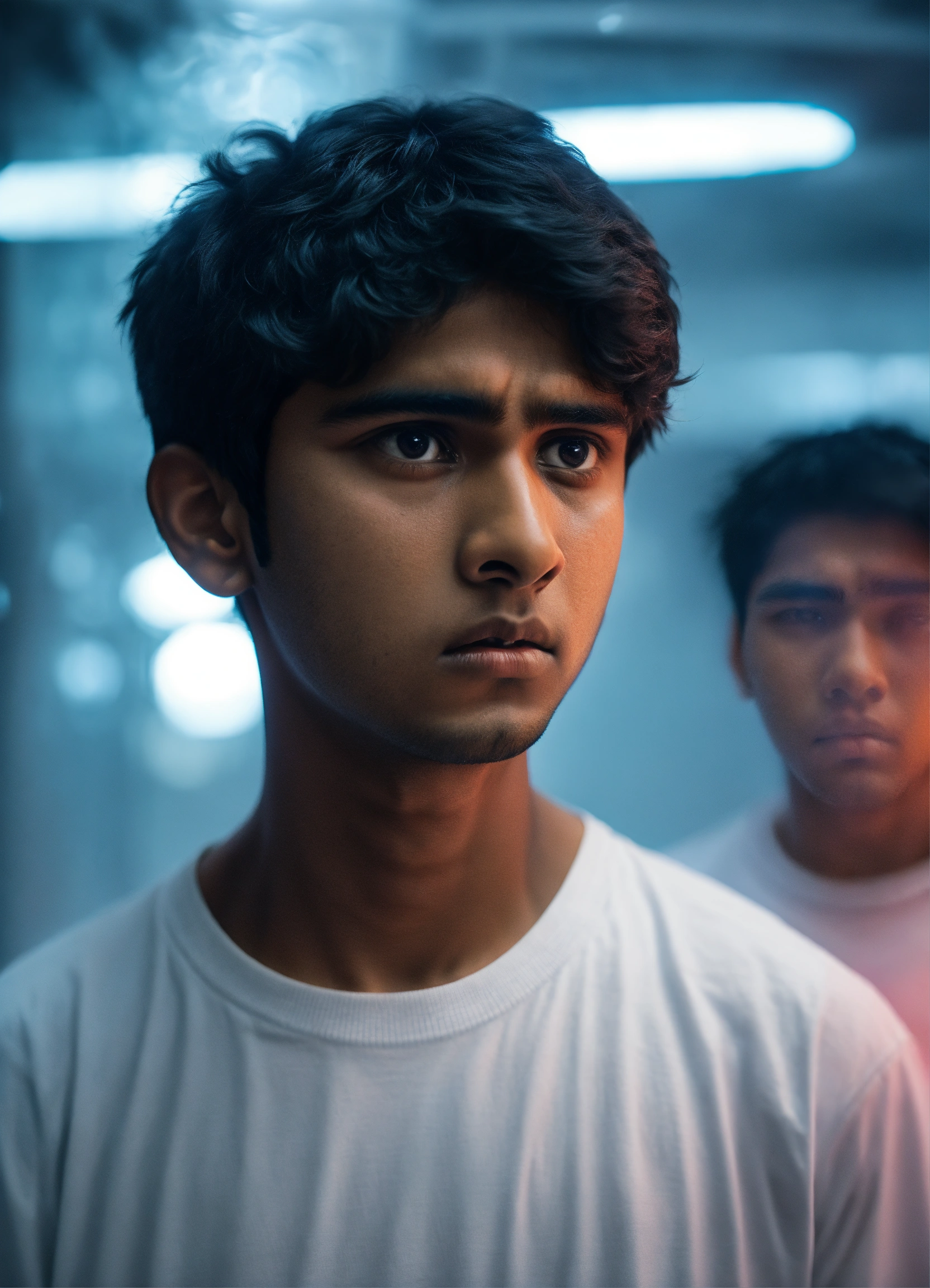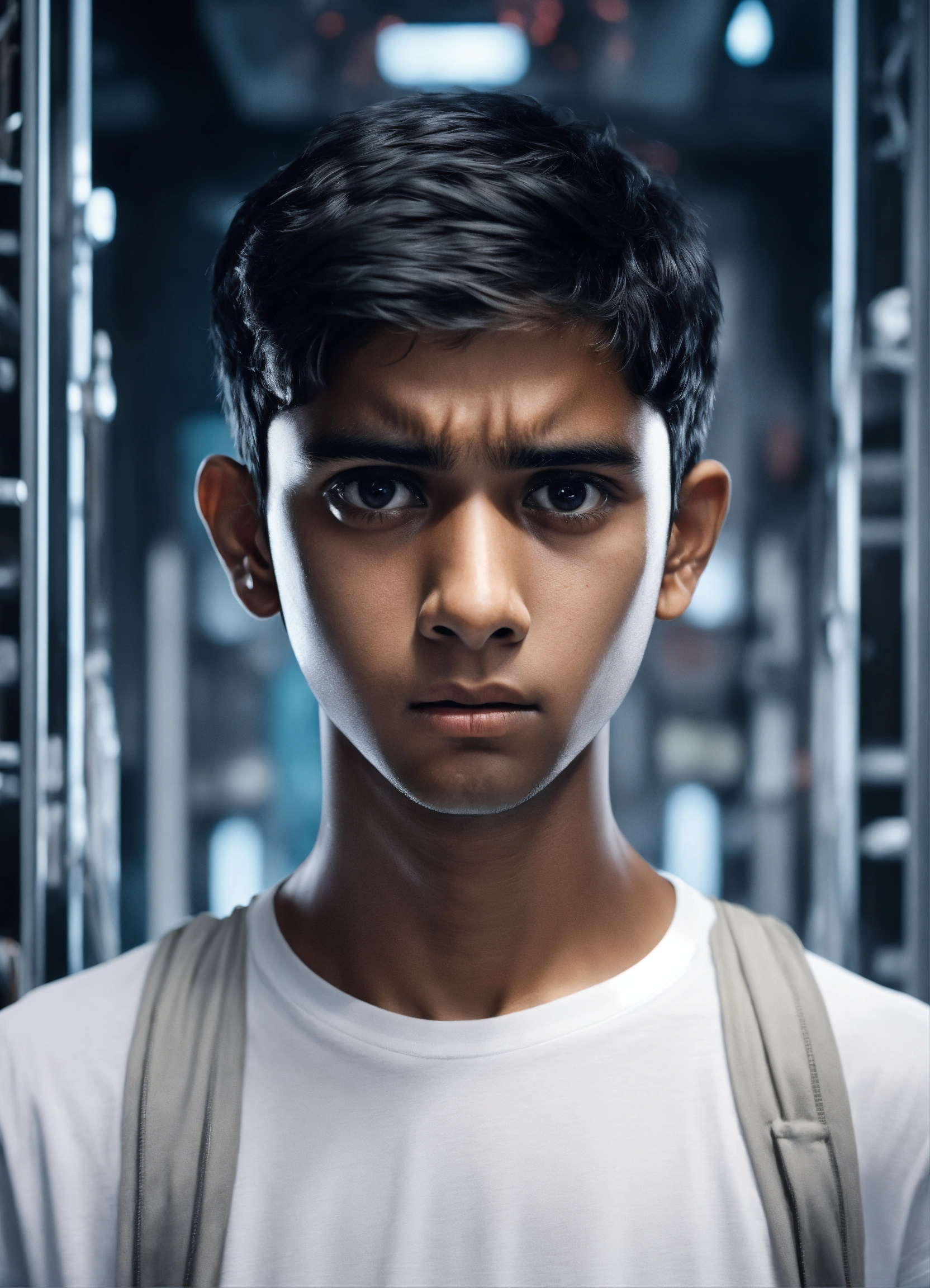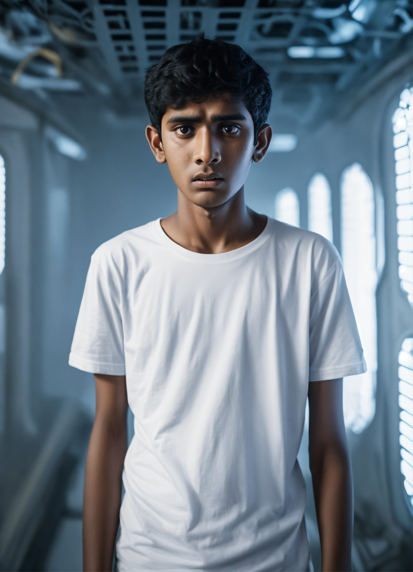 A portrait of a scared 15-years-old indian boy, tall, slim, big nose, very sad expression, terrified face, wearing a white sci-fi plastic t-shirt, in a white sci-fi background, hyperdetailed, hyperrealistic, 8k