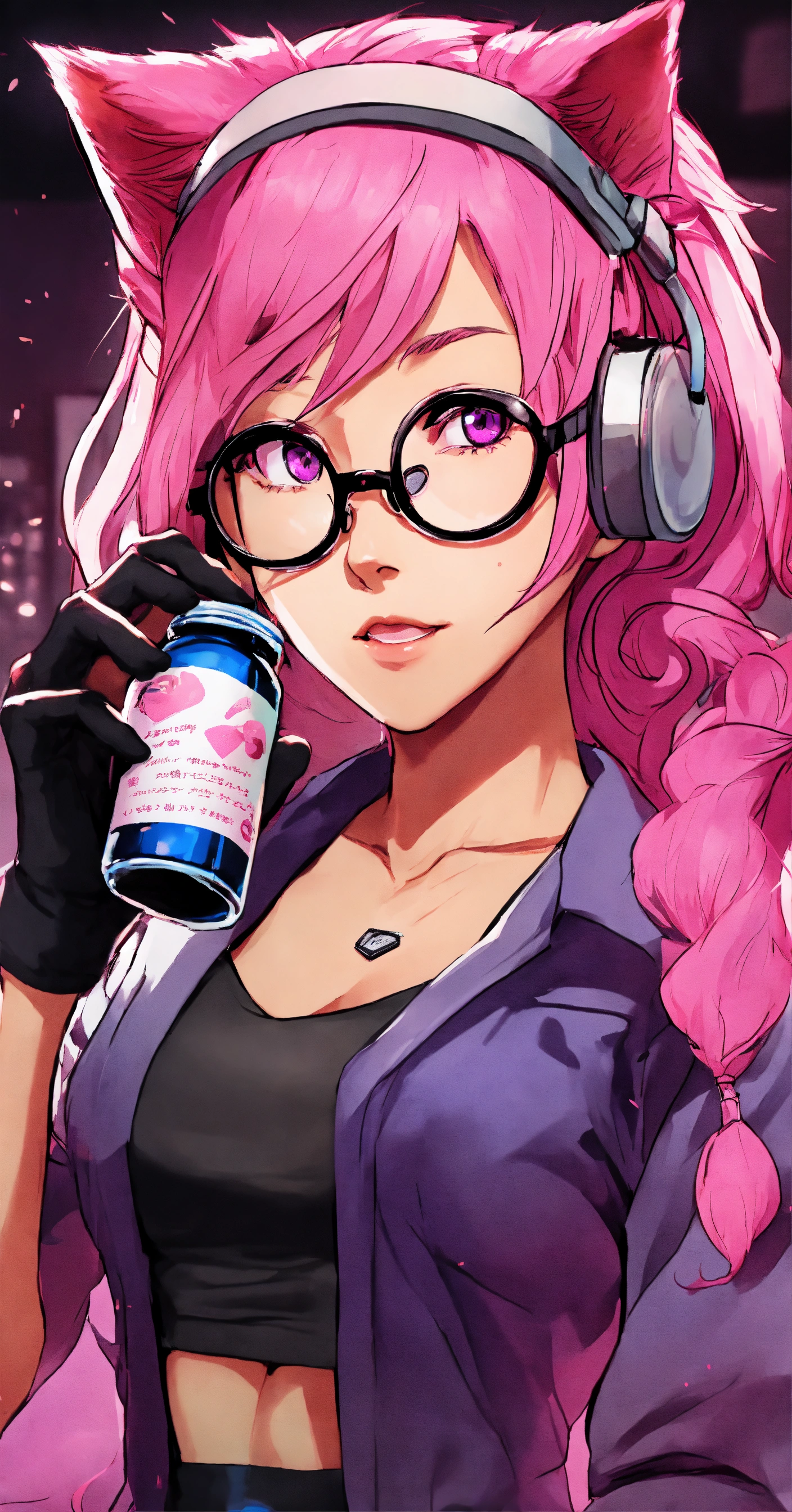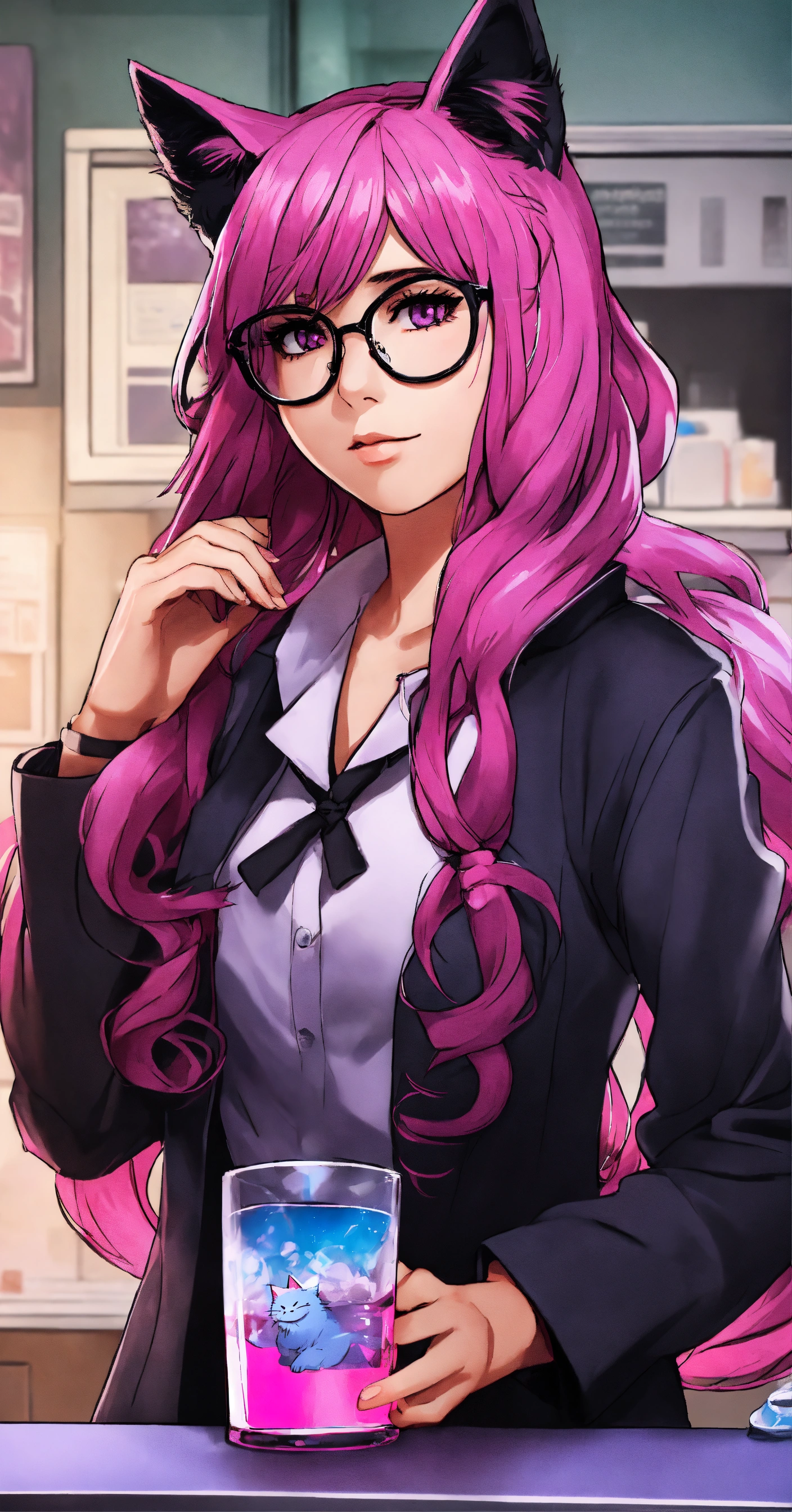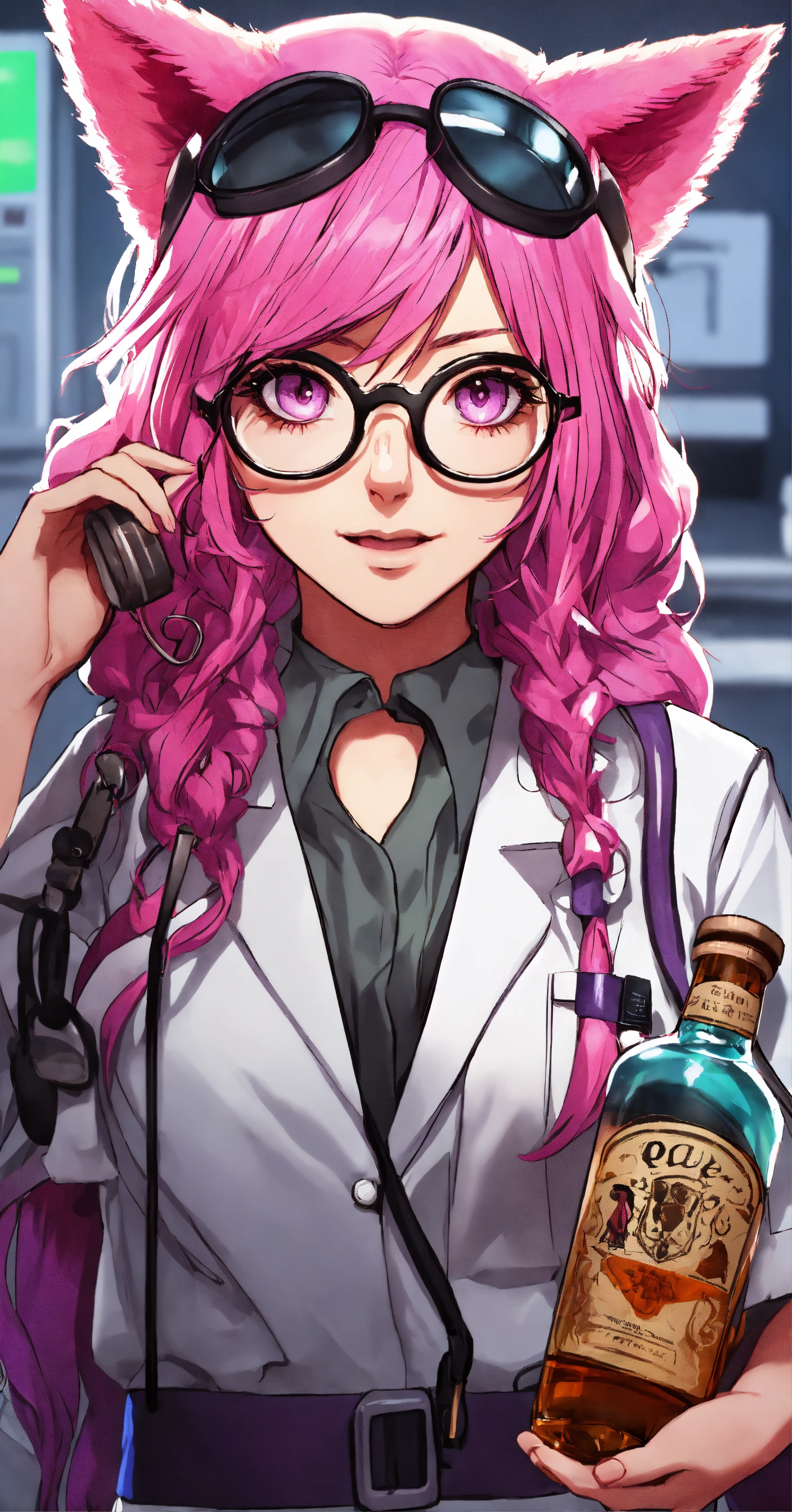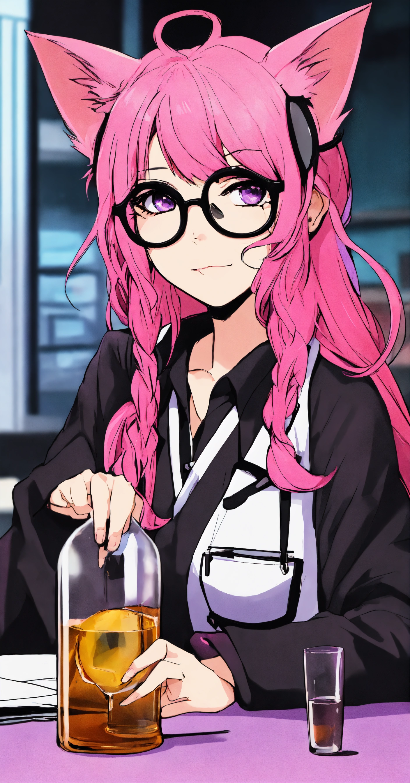 Female doctor, with long pink hair, with cat ears disguise color black on her head, glasses and purple-pink eyes in hospital, manga style and que drink whiskey bottle