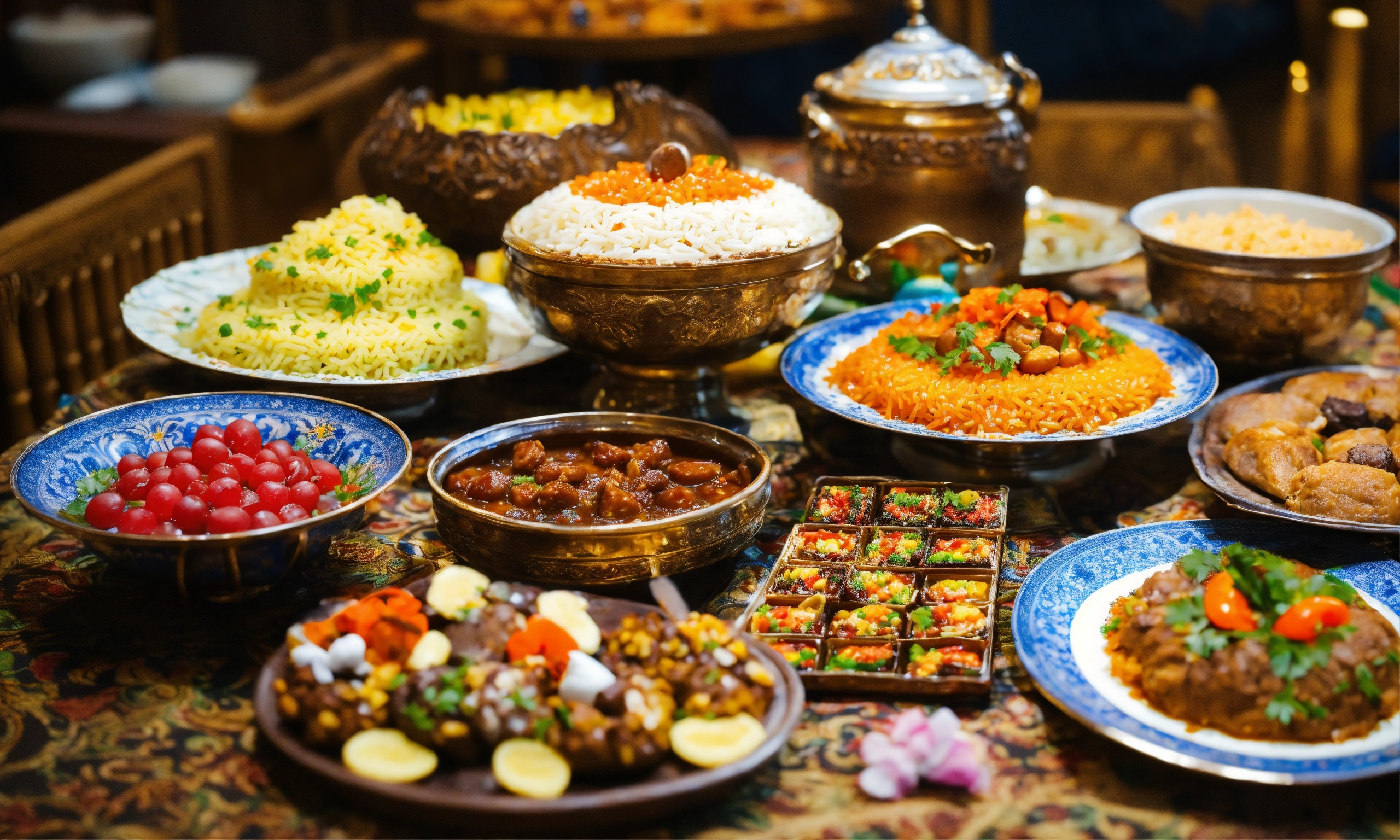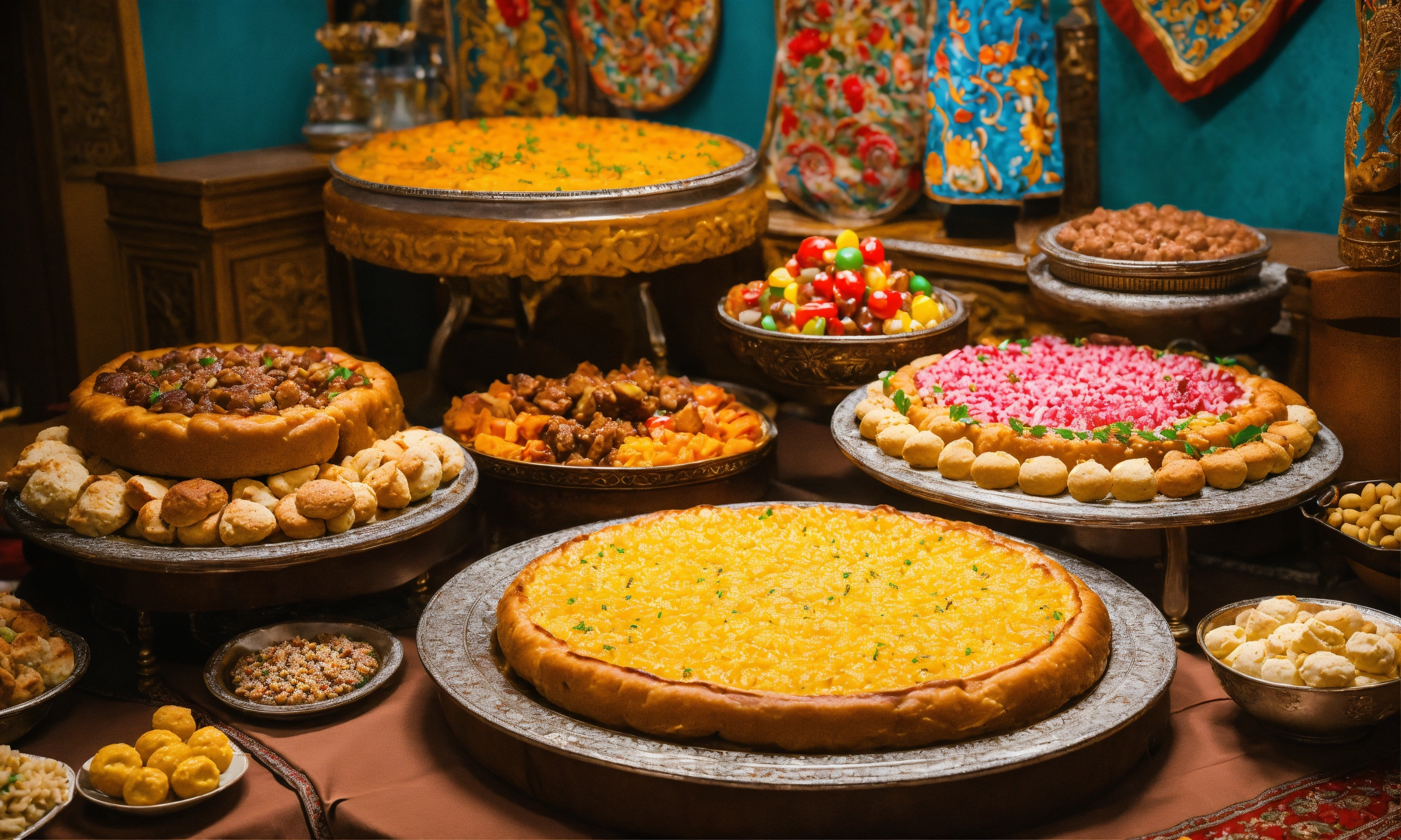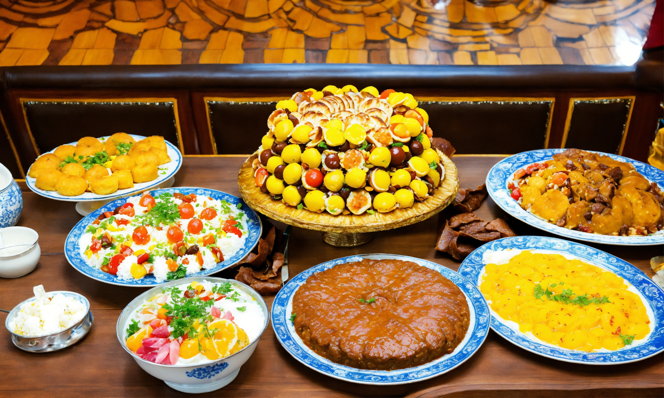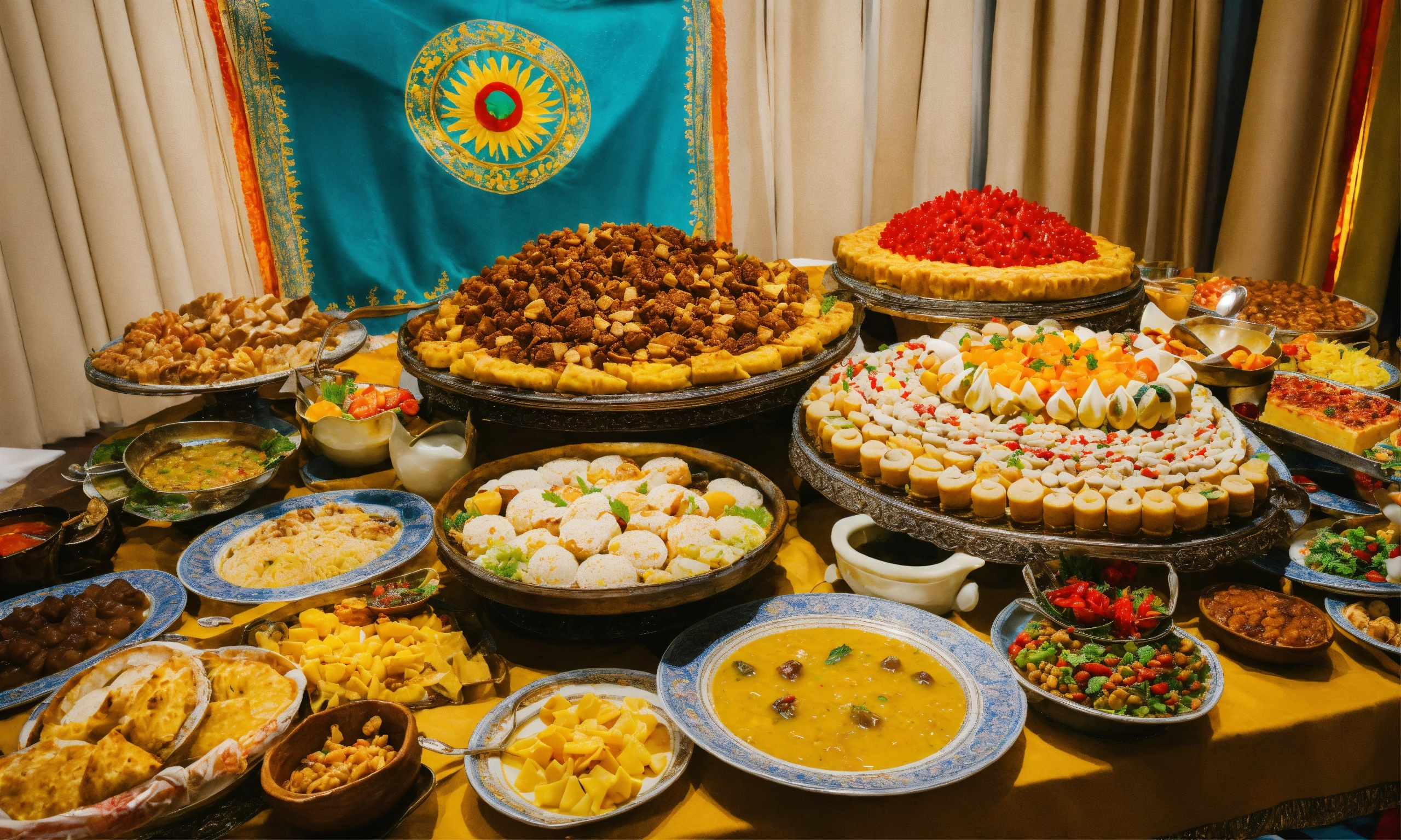 A large table with national kazakh food beshparmak and sweets zhent