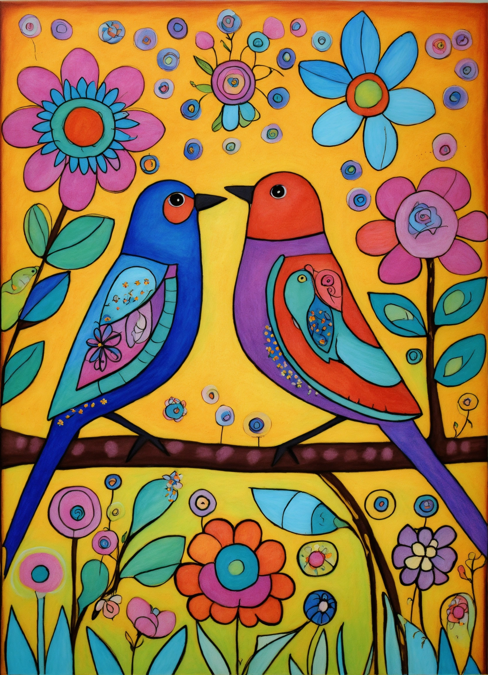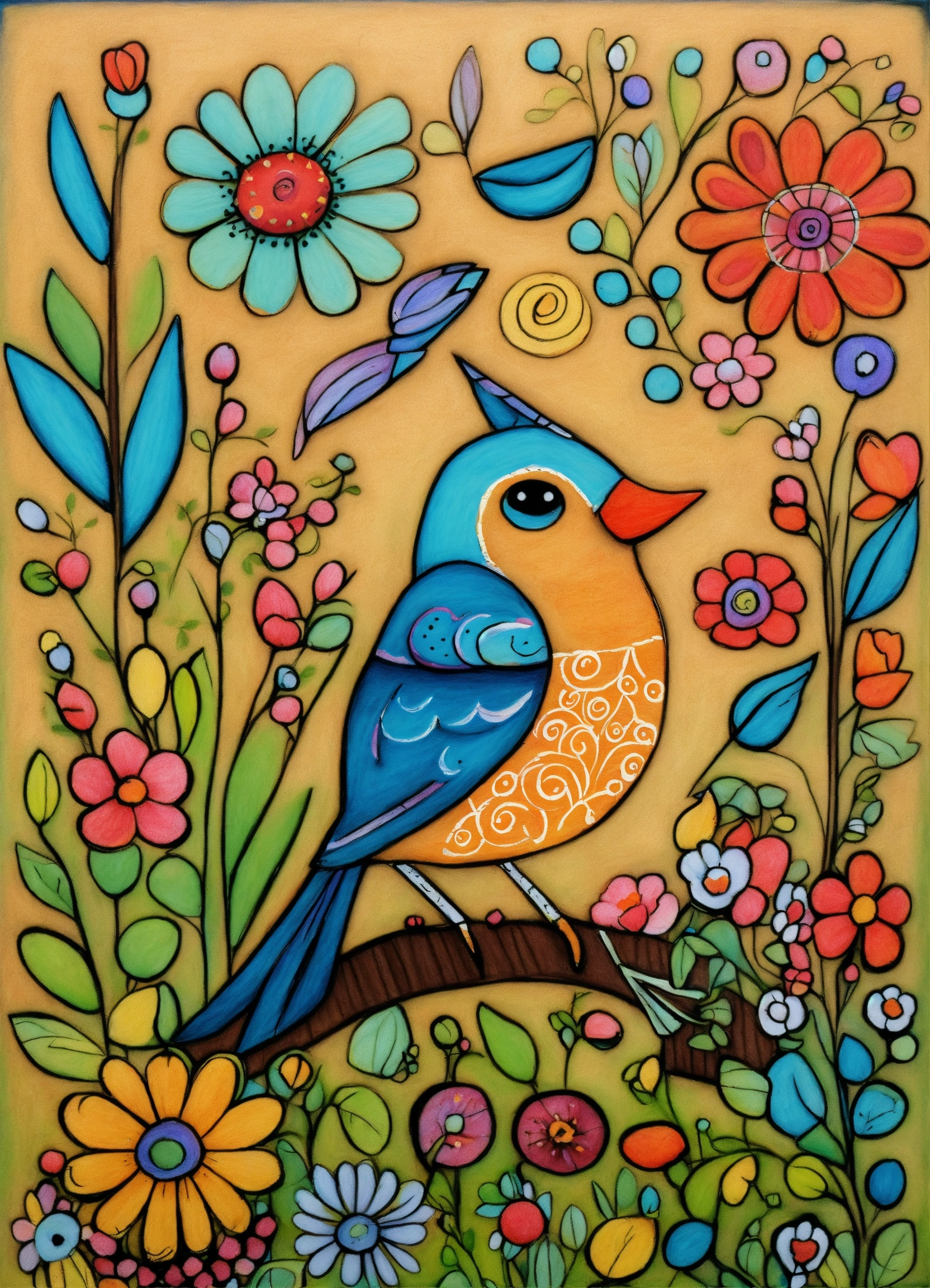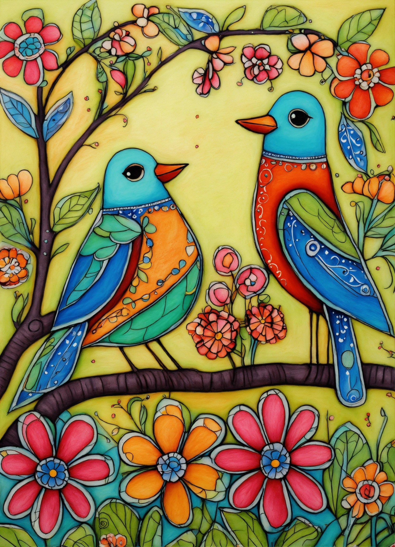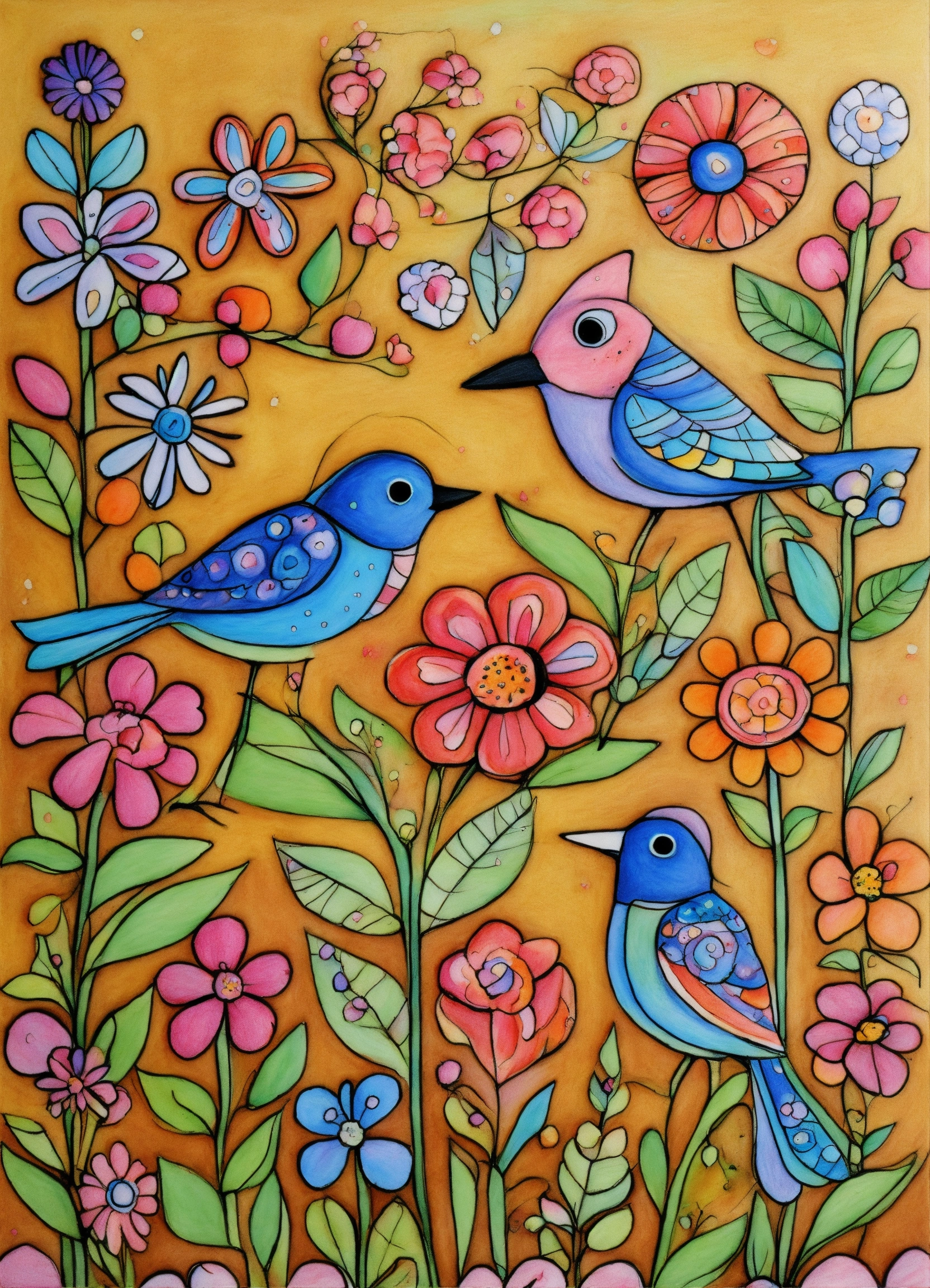 Art drawing birds and small flowers scene folk art style inspired by karla gerard