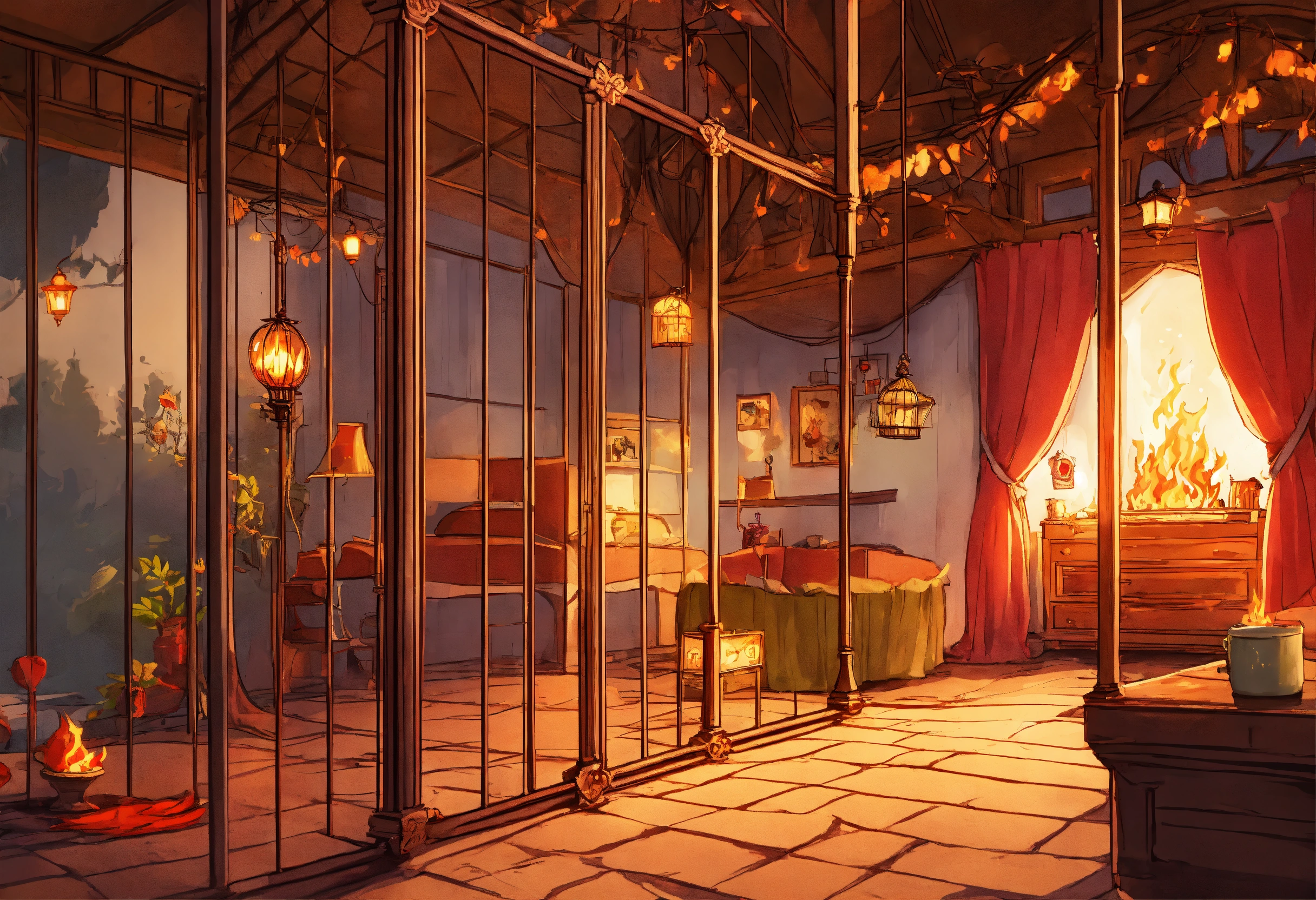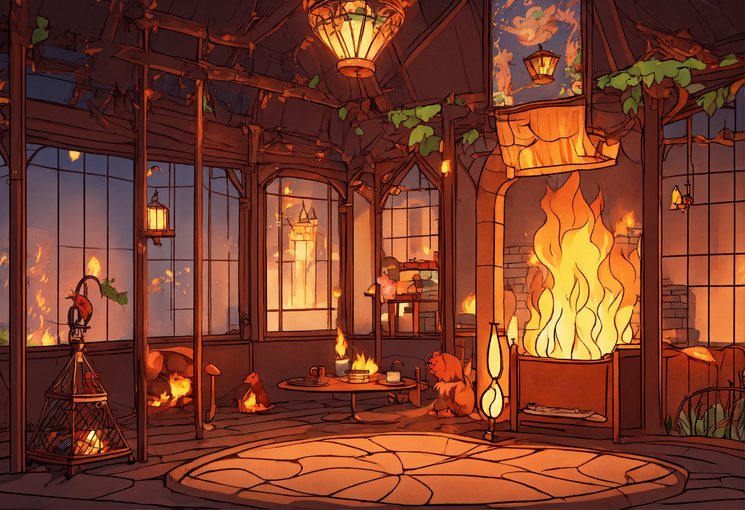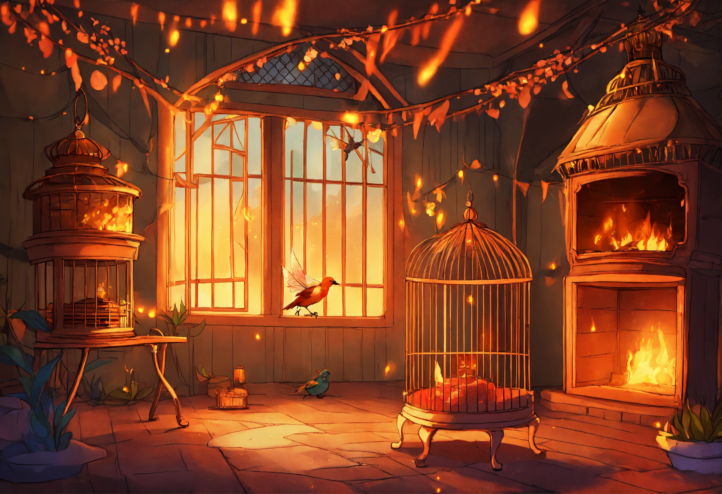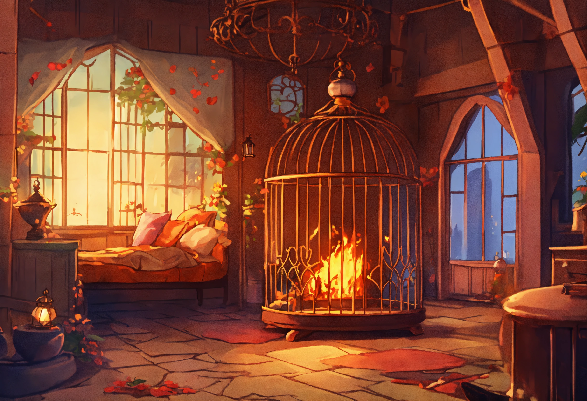 Cartoon fairy taie style image castle room fire ban in the bird cage
