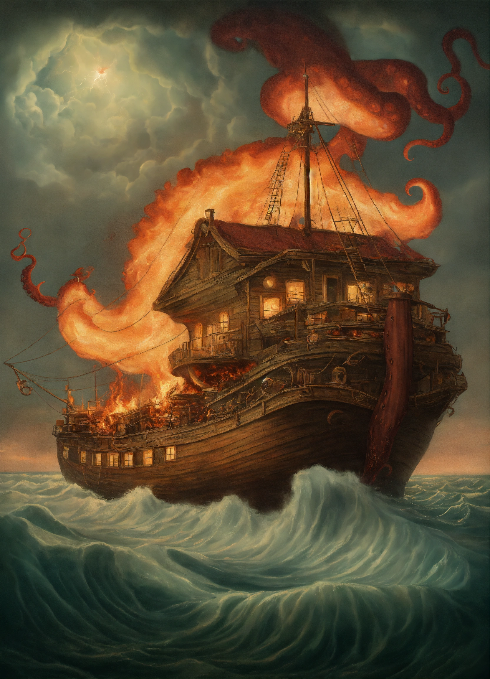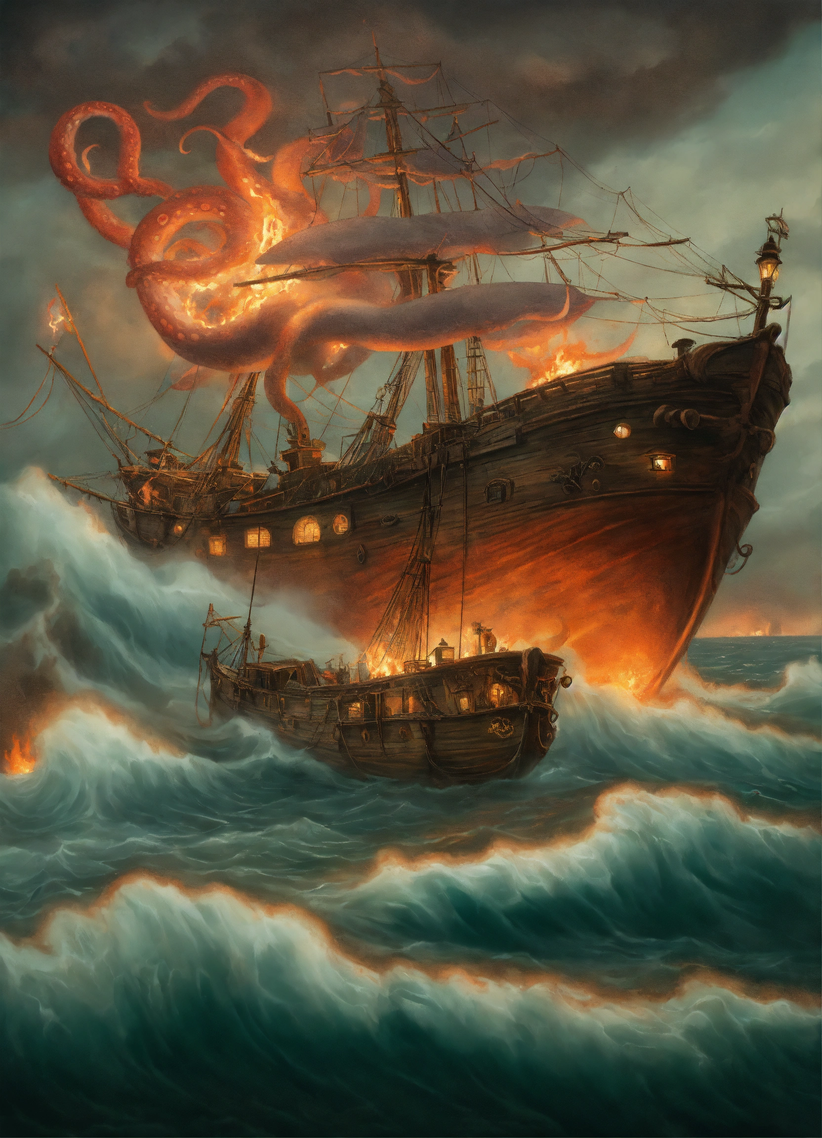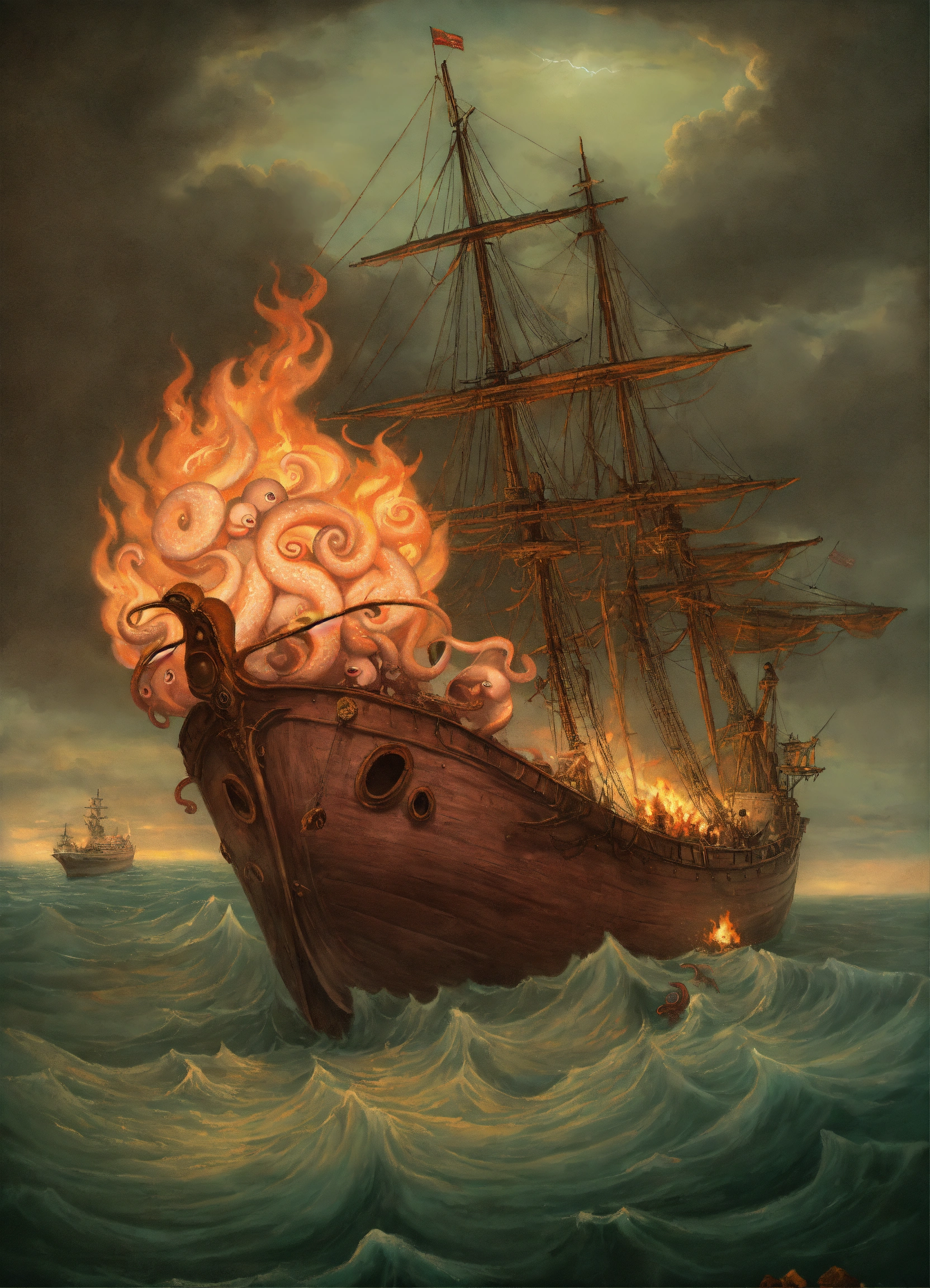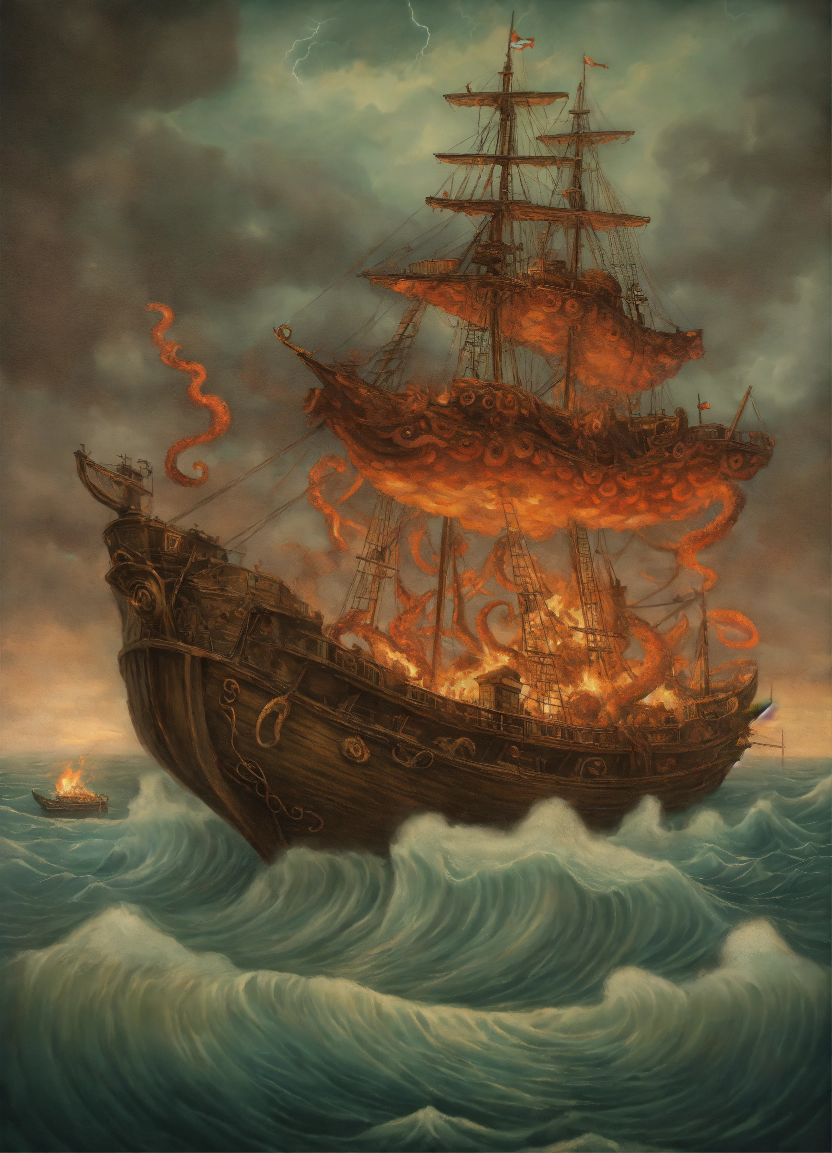 Giant creep octopus in a stormy and iced sea with tentacles wrapping a old wooden ship in flames and lightning in the sky by mark ryden