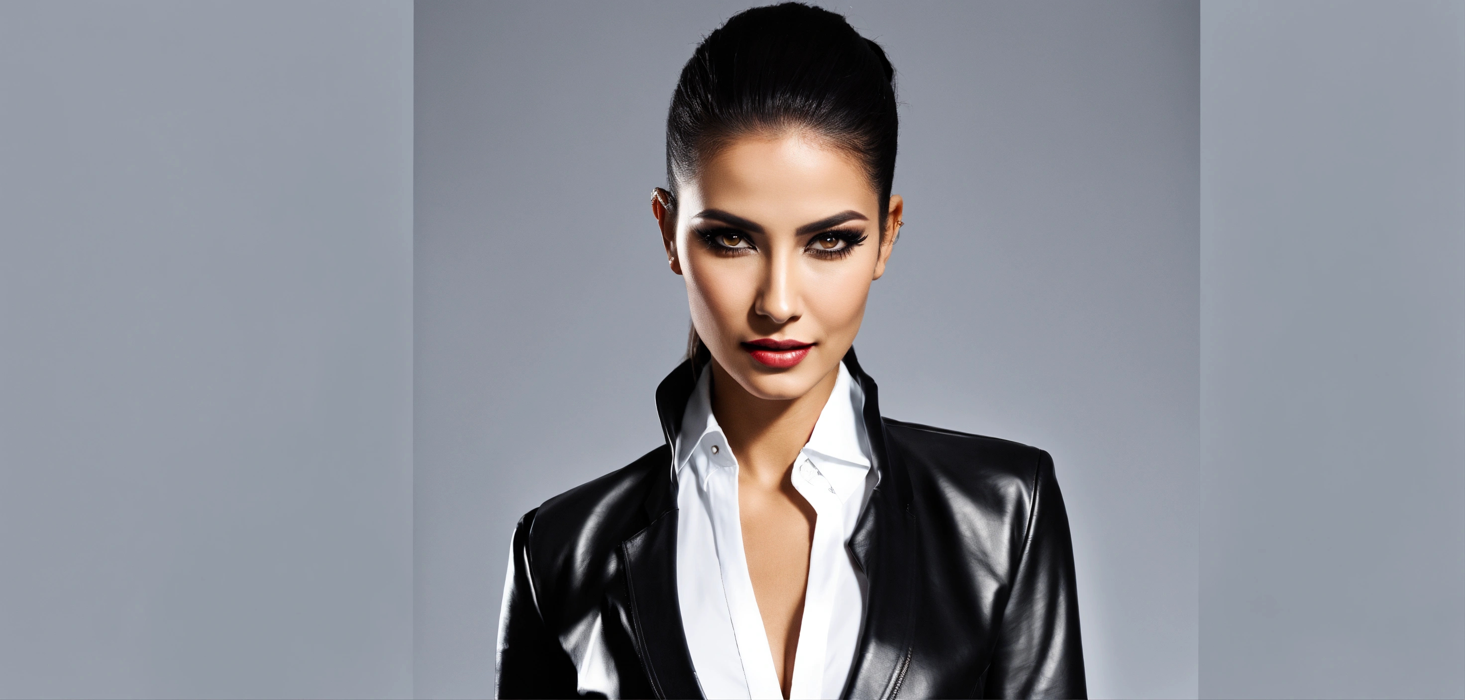 Cinematic look, stunning arab seductress woman business fashion model, arrogant evil smile from above, black straight hair very high ponytail, black leather business blazer jacket, white office shirt, eyeliner makeup, underworld vampire movie style, ultra-realistic; solid white background; no background