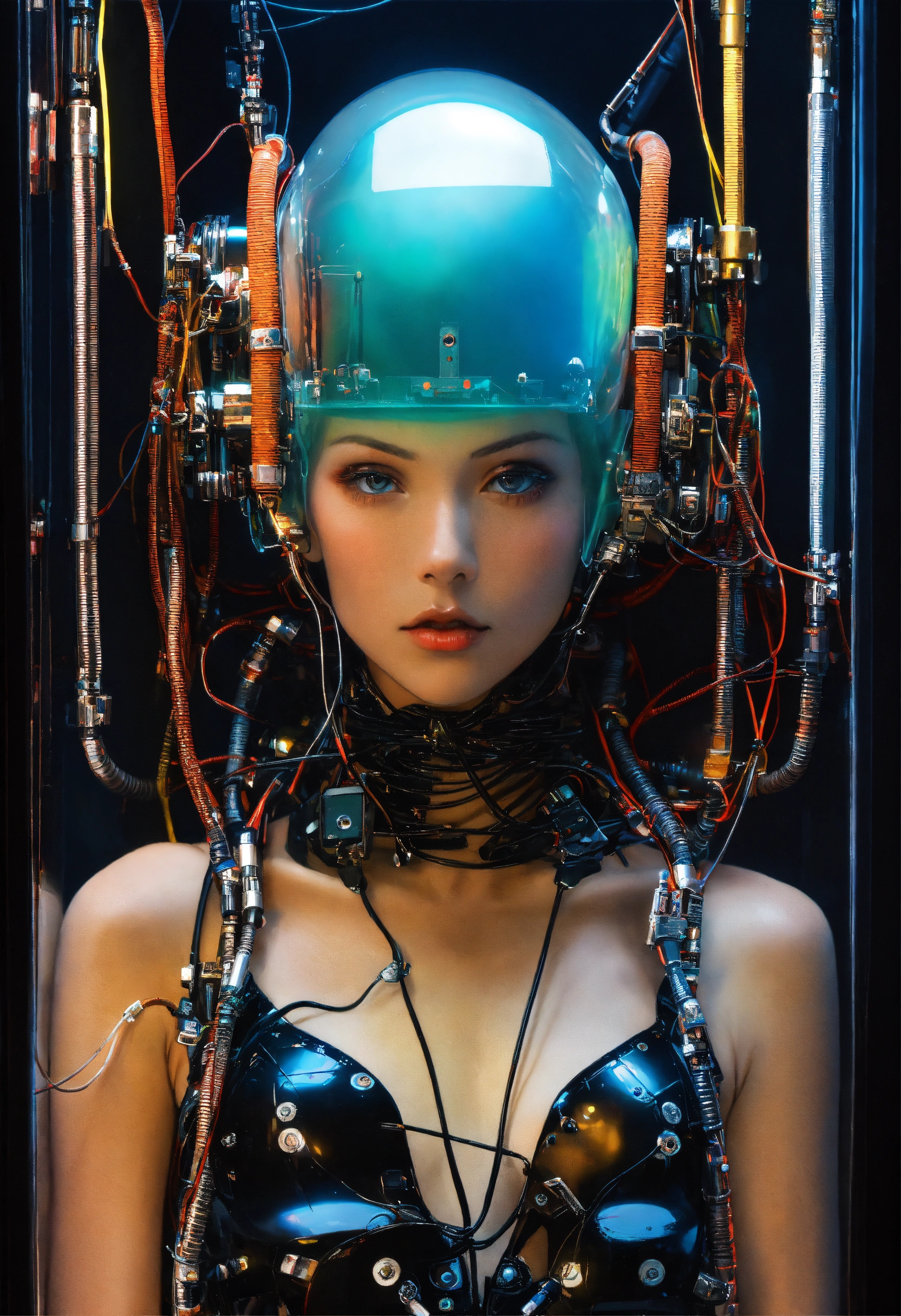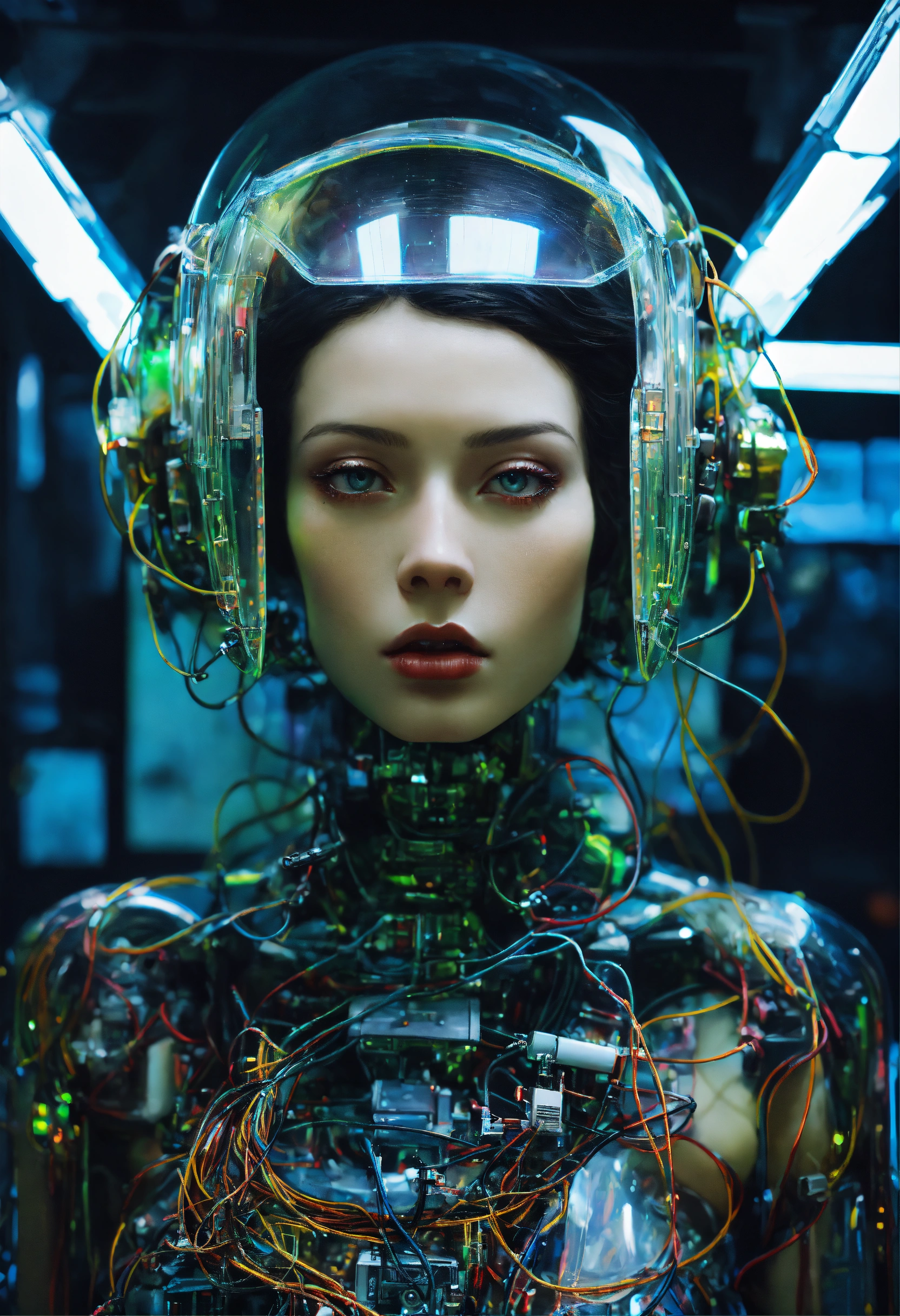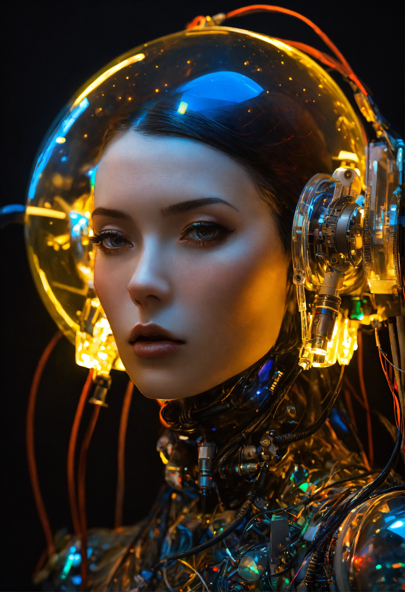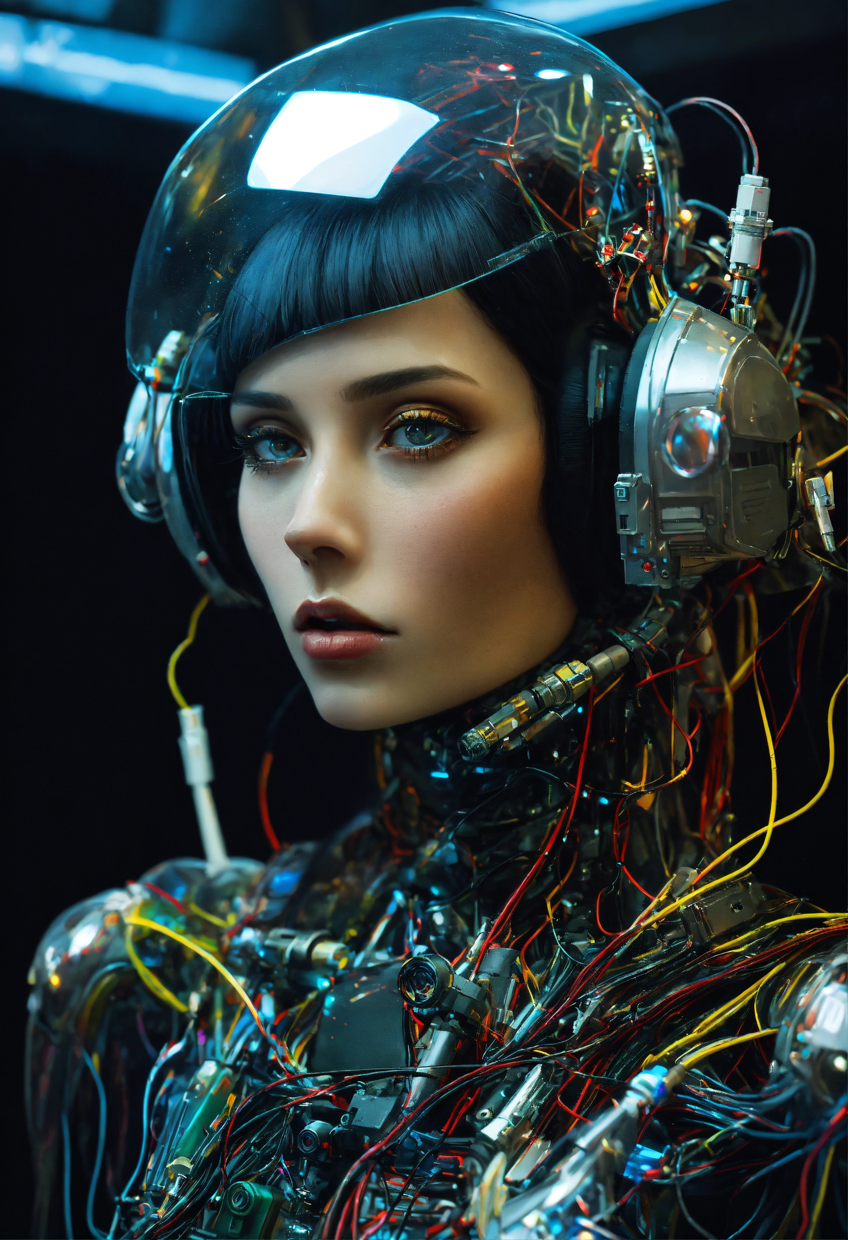 Portrait photography, in front of a black wall, a cyborg astronaut beautiful woman head without body, connected by cables and wires and led, an attractive transparent iridescent plexiglass body punk plc robots with plexiglass motor head, with ray guns, 80 degree view, art by sergio lopez, natalie shau, james jean and salvador dali