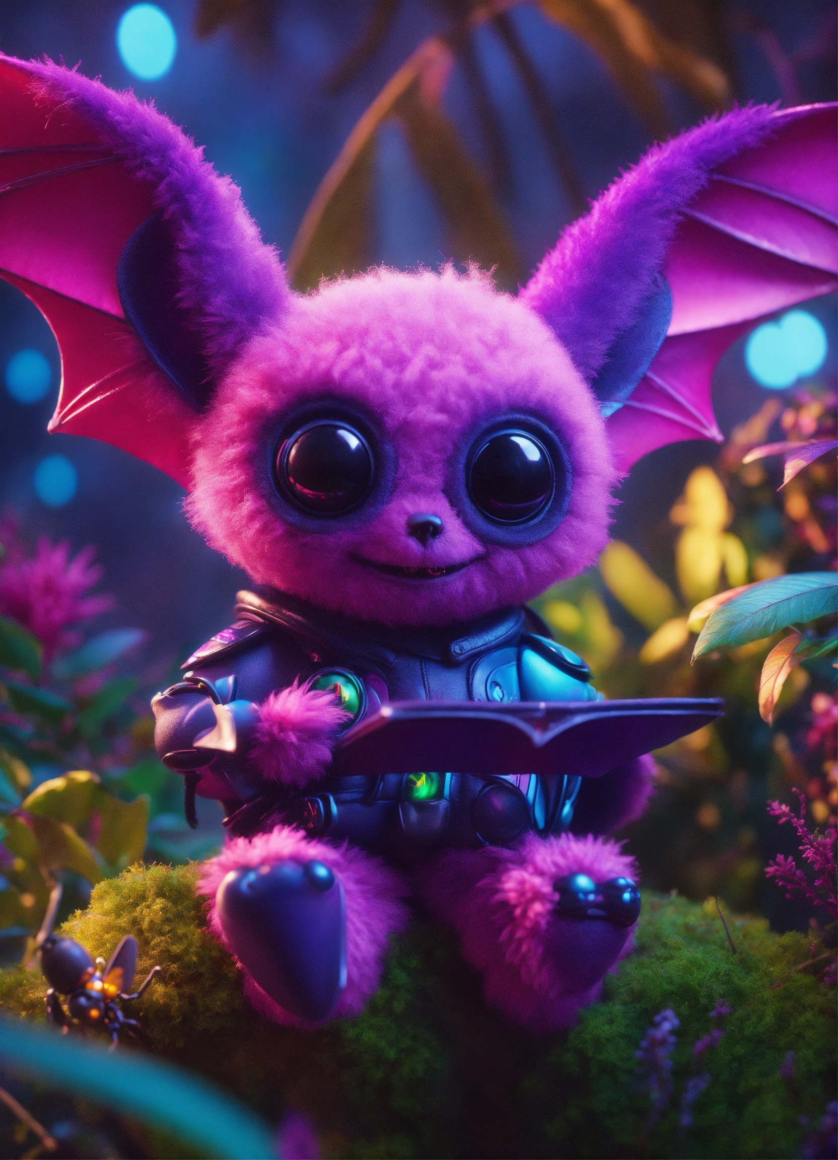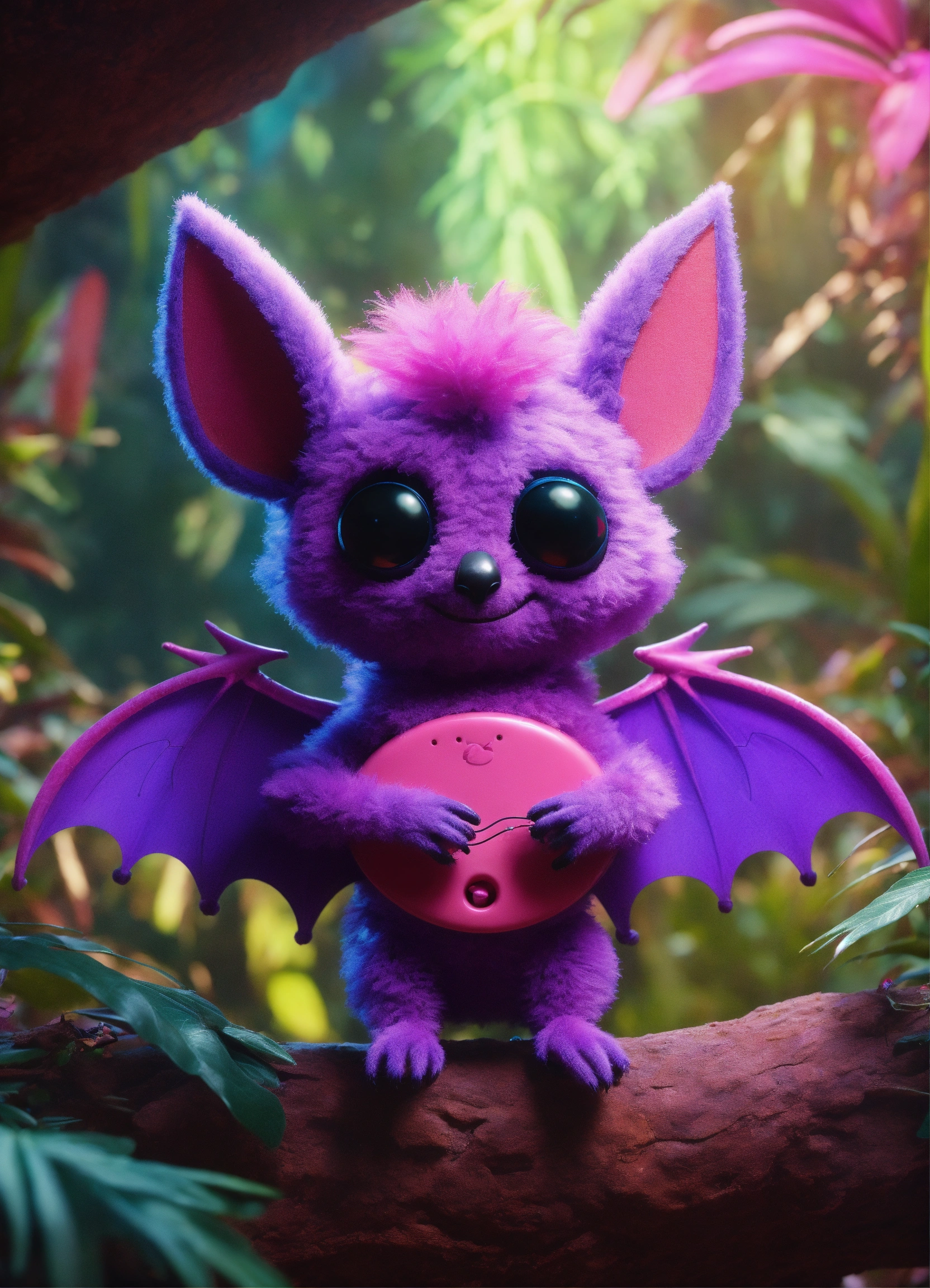 Cute fuzzy pink and purple alien fruitbat character with bug ears, bat wings, purple mohawk, in an exotic alien jungle playing a toy synthesizer, psychedelic, cosmic, disney, pixar, realistic, 8k